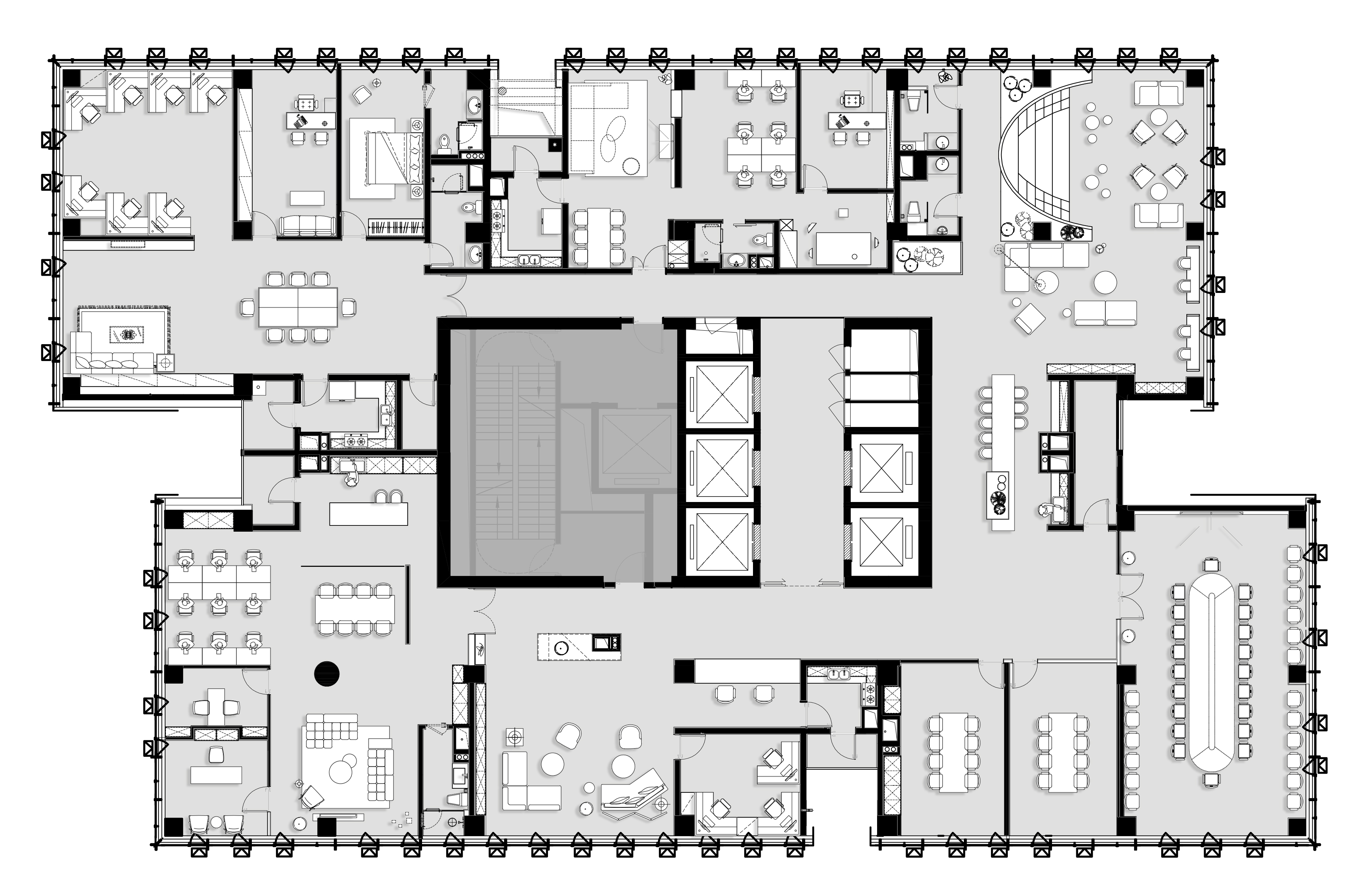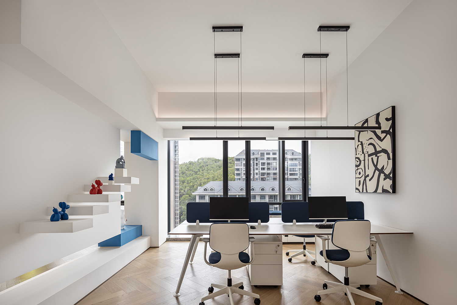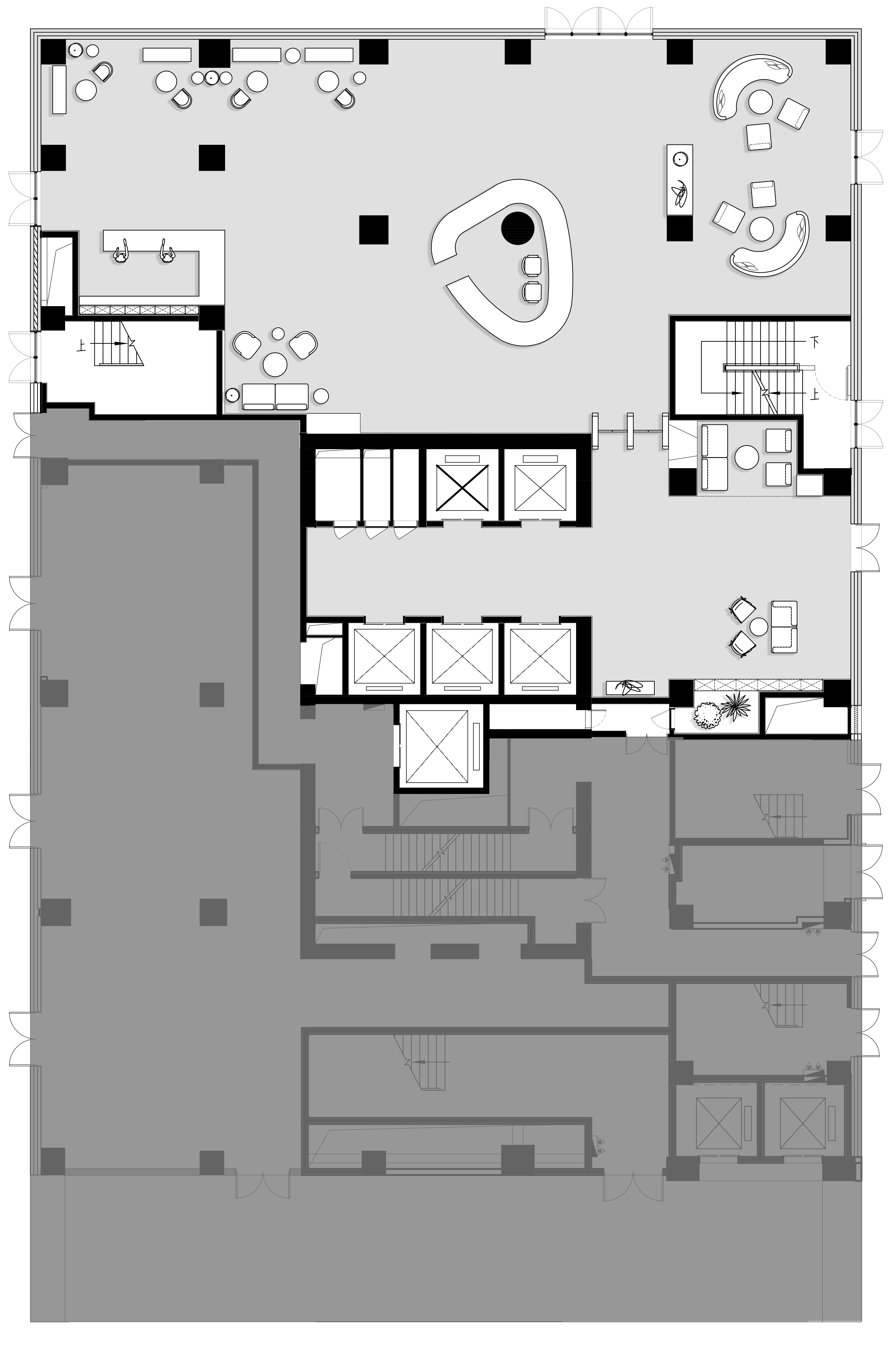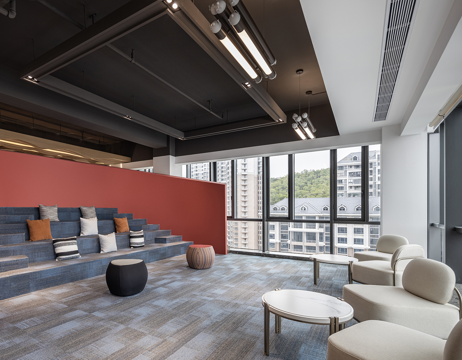 十层设置了商务中心,城市客厅、大中型会议室、阶梯教室、水吧、图书区...等公共属性的商务接待功能应有尽有,为将来入驻的中小型初创企业提供了便利;公共景观最好的西北角设置了半围合的阶梯教室,将会是未来提供给年轻的创业者做公开的论坛分享和商业路演的区域,形态上形似撑帆后扬起前行乘风破浪的船头,船头的甲板上时常能聚集青年孜孜不倦的创业热情,透过面向转角处的两面落地幕墙窗外能远眺汕尾城边的赤岭水库和层叠的群山。