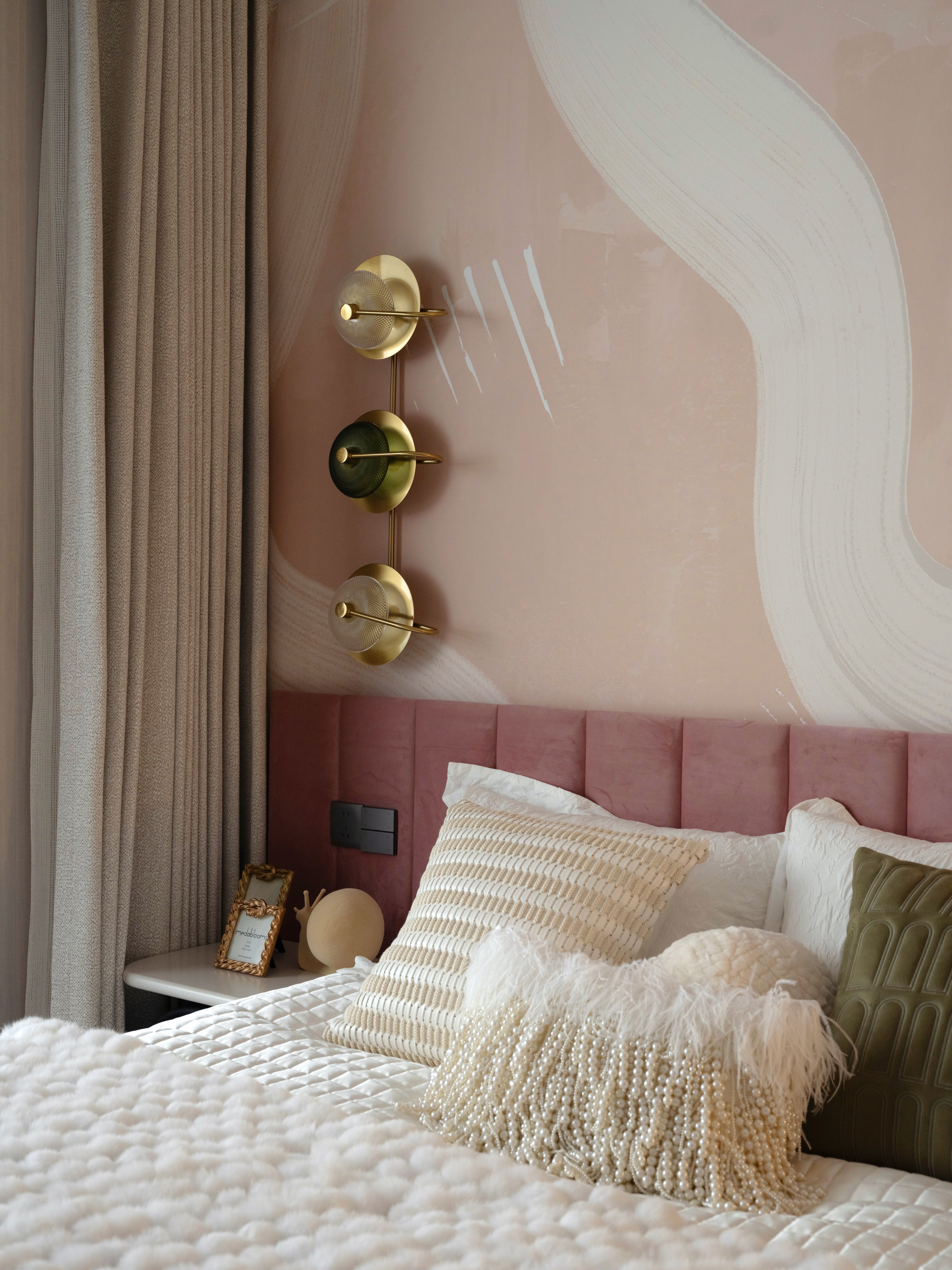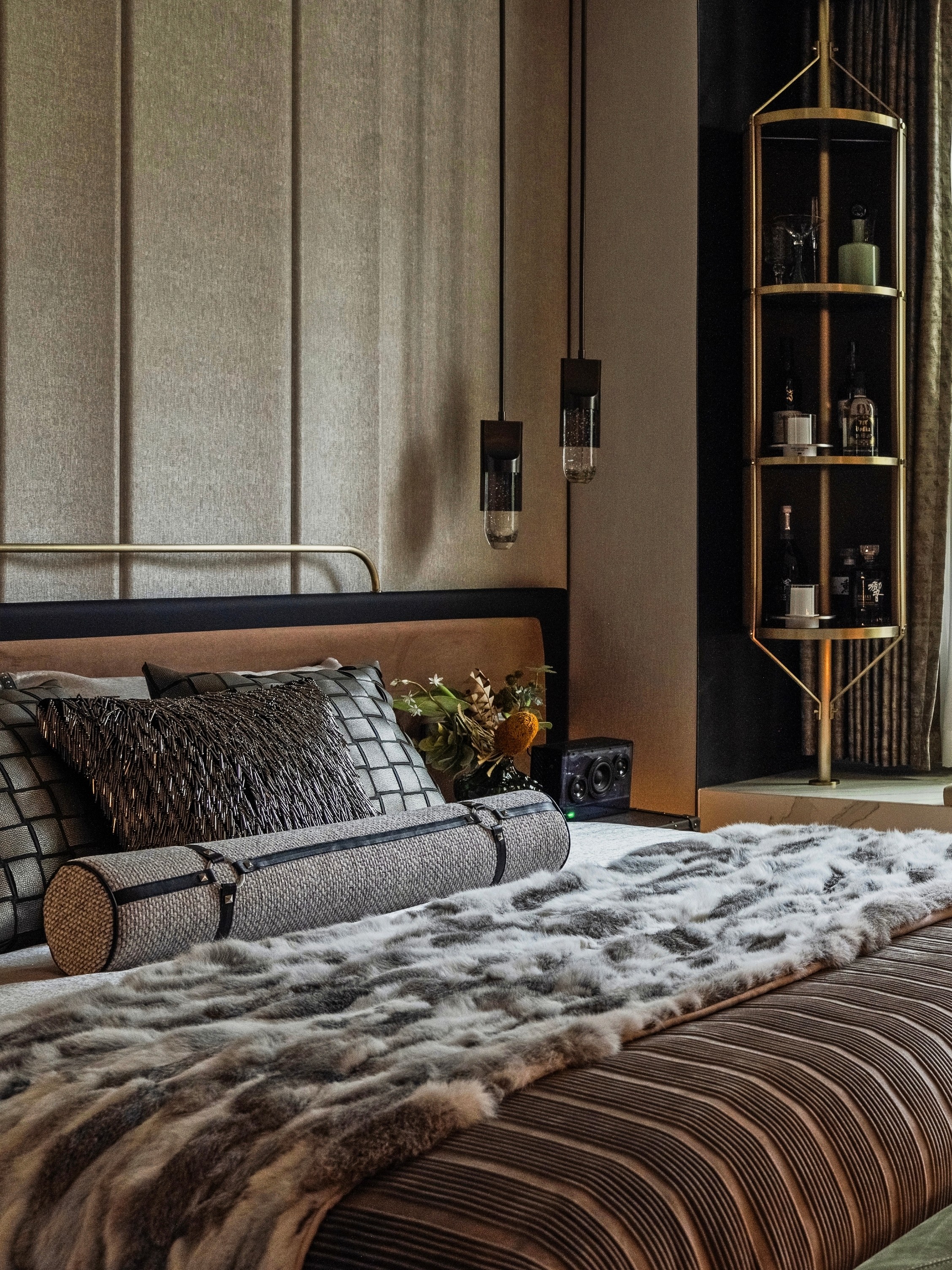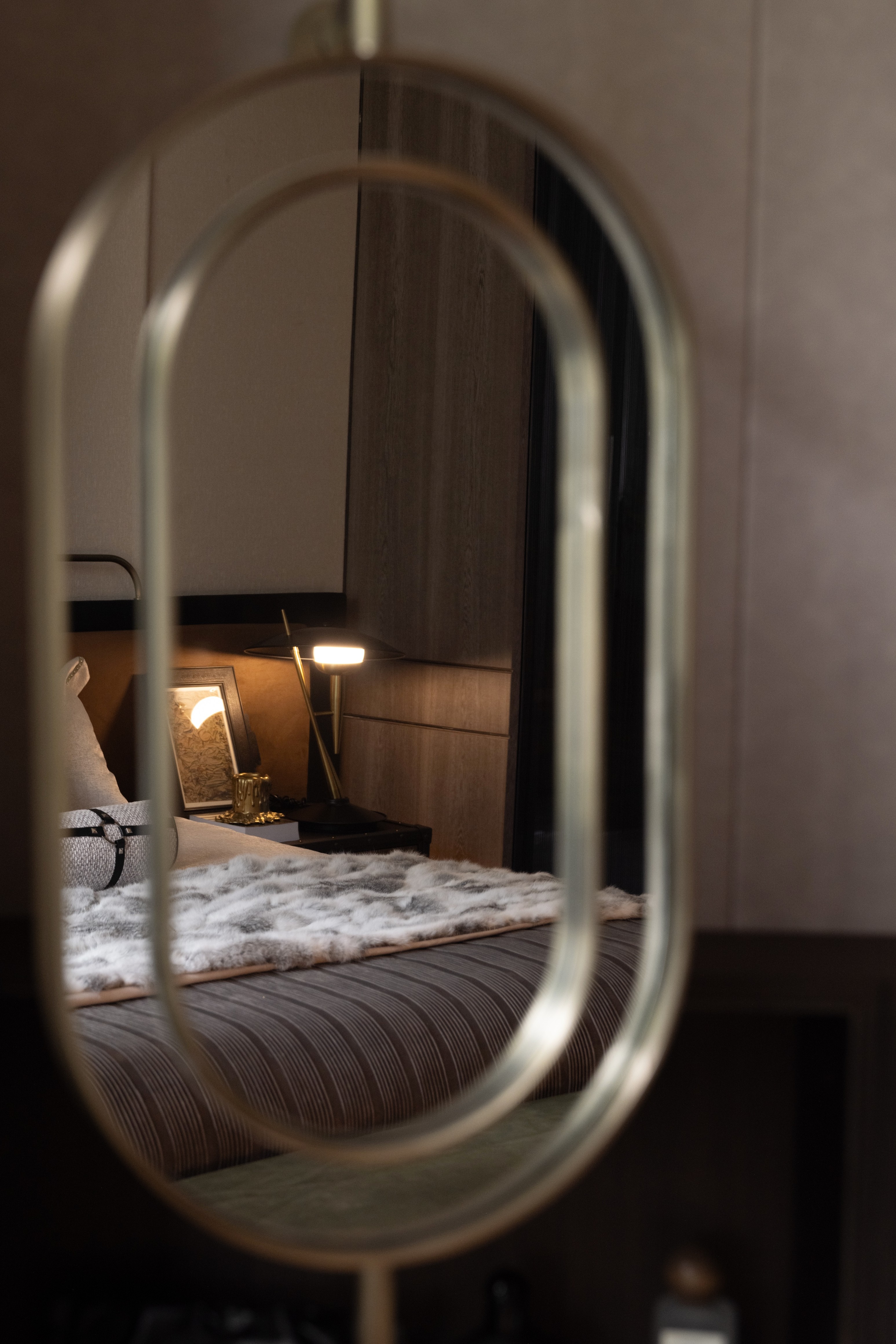 客厅与餐厅相连,通过弧线型家具、流线吊灯与高光材质营造音乐般的流畅感。地毯上的抽象纹样如旋律般起伏,墙面点缀金属乐器装饰,赋予空间动人节奏与层次美感。整体色调以低饱和灰调为主,点缀金属与木质元素,彰显时尚与温暖并存的氛围。老人房以摄影为主题,采用沉稳的暖灰调,搭配复古相框墙与摄影灯饰品,展现岁月的艺术沉淀。家具设计注重舒适性,同时通过细腻软装细节提升空间质感,满足长辈需求的同时融入摄影的文化气息。女孩房则以绘画为灵感,运用柔和的粉色与白色为主调,墙面悬挂艺术画作,搭配画架、调色盘等饰品,激发孩子的创作灵感,营造童趣与艺术共融的空间。主人房则以摩登感为设计主线,金属框架床、丝绒软饰与几何线条墙饰勾勒出现代都市精英的独特气质,同时采用光影装饰打造奢雅氛围,展现主人对品质生活的追求。整套设计将音乐、艺术与摩登气质完美结合,创造出一个充满艺术魅力的家居空间。