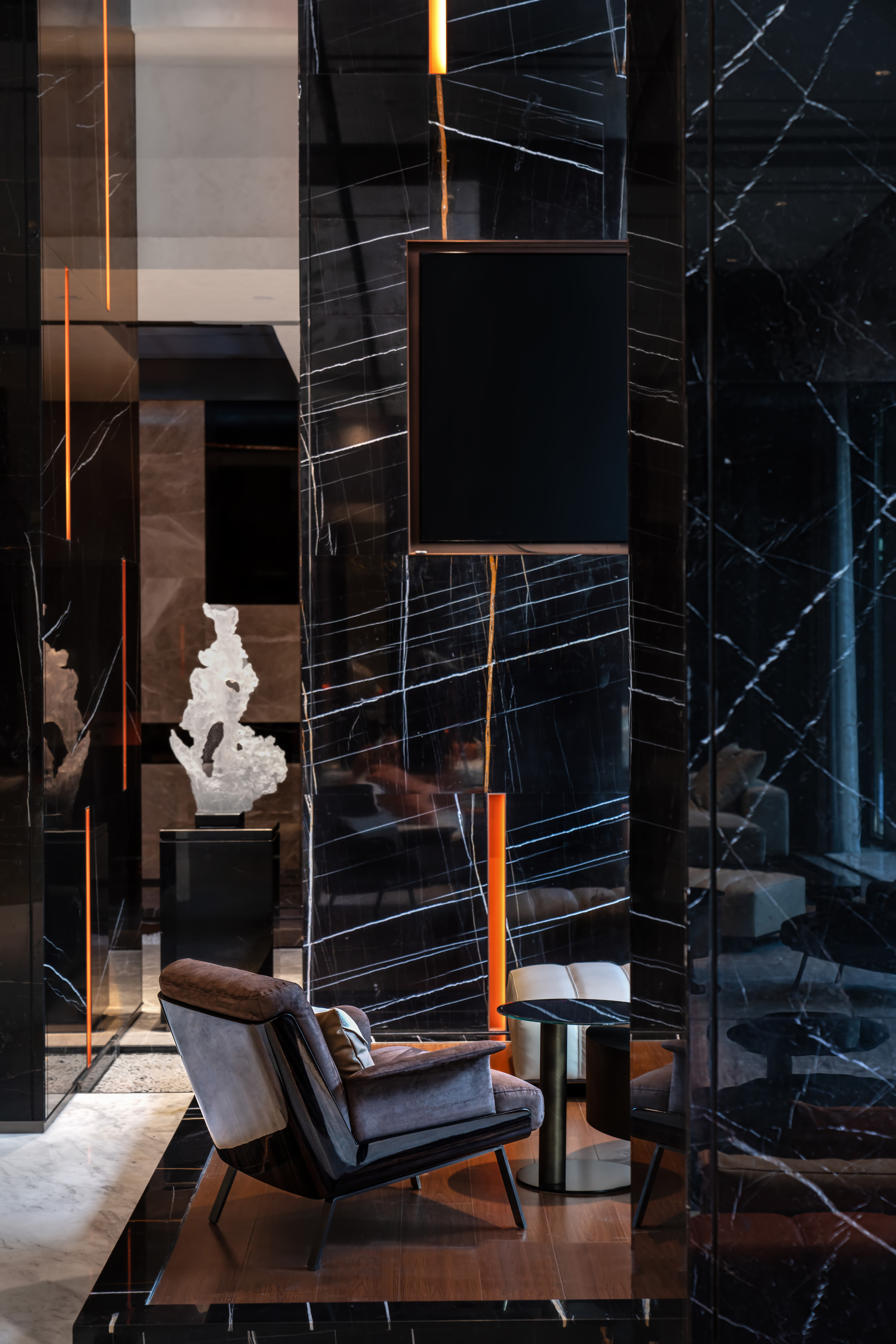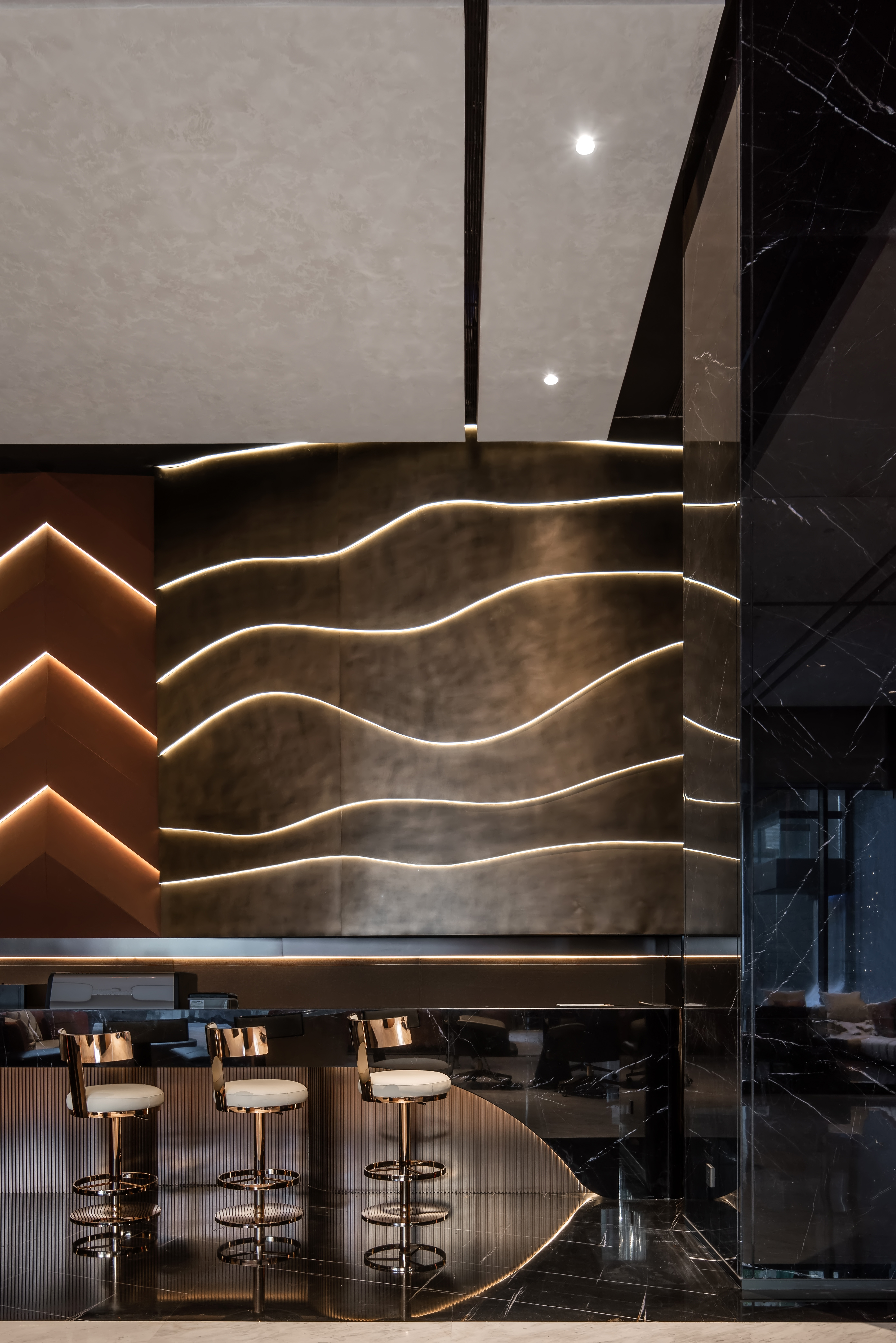 设计选材:选材上,设计师用到劳伦黑金大理石、仿铜不锈钢、鸿蒙黑大理石、雅柏灰大理石、云多拉灰大理石、艺术漆、艺术玻璃等,为未来第二社区的使用提供更多可能性,同时材质的环保及实用性方面,考虑到性价比,施工和整体质感方面,运用到可再生材料,不仅满足当下使用需求,还保证观赏和再次改造需求。