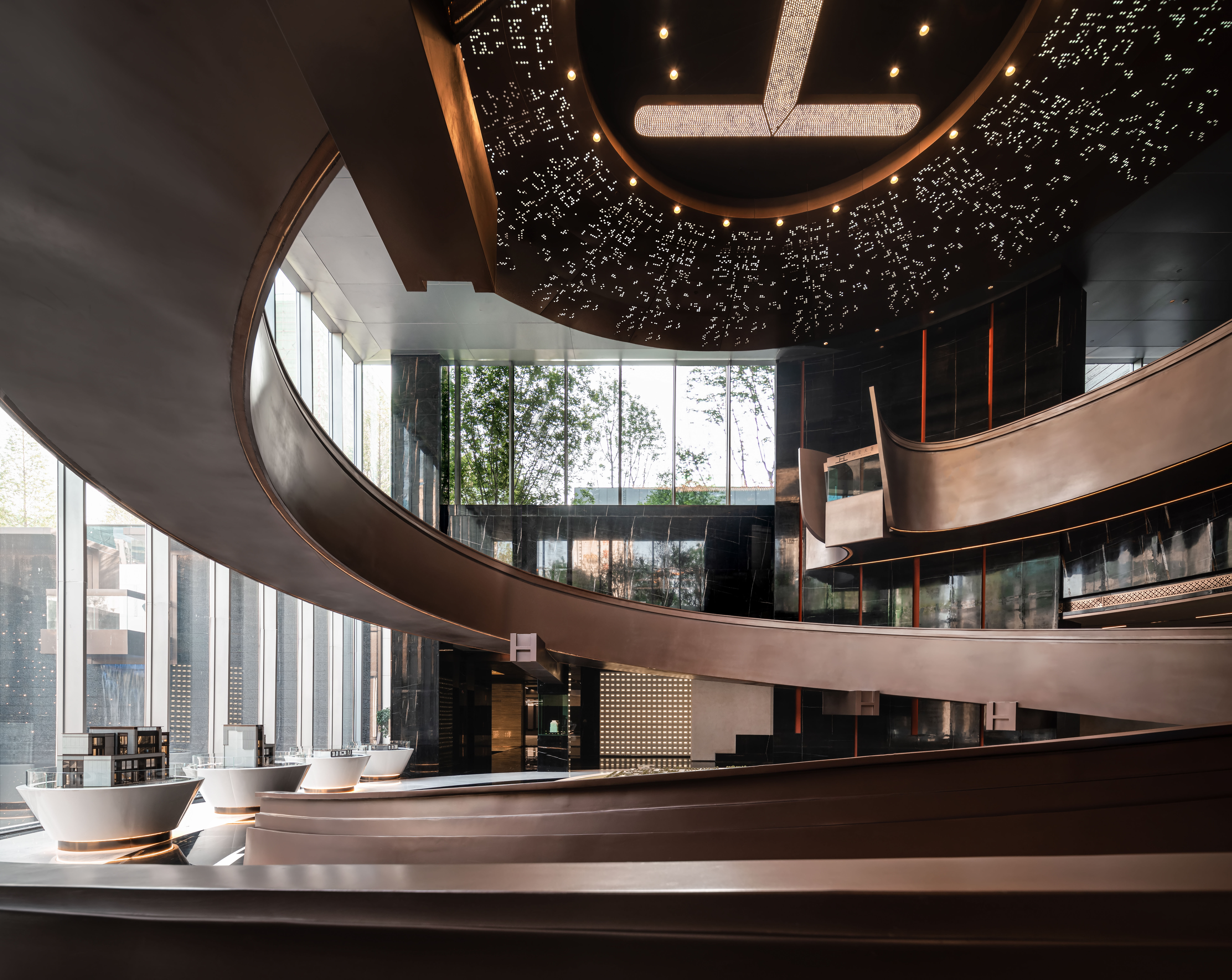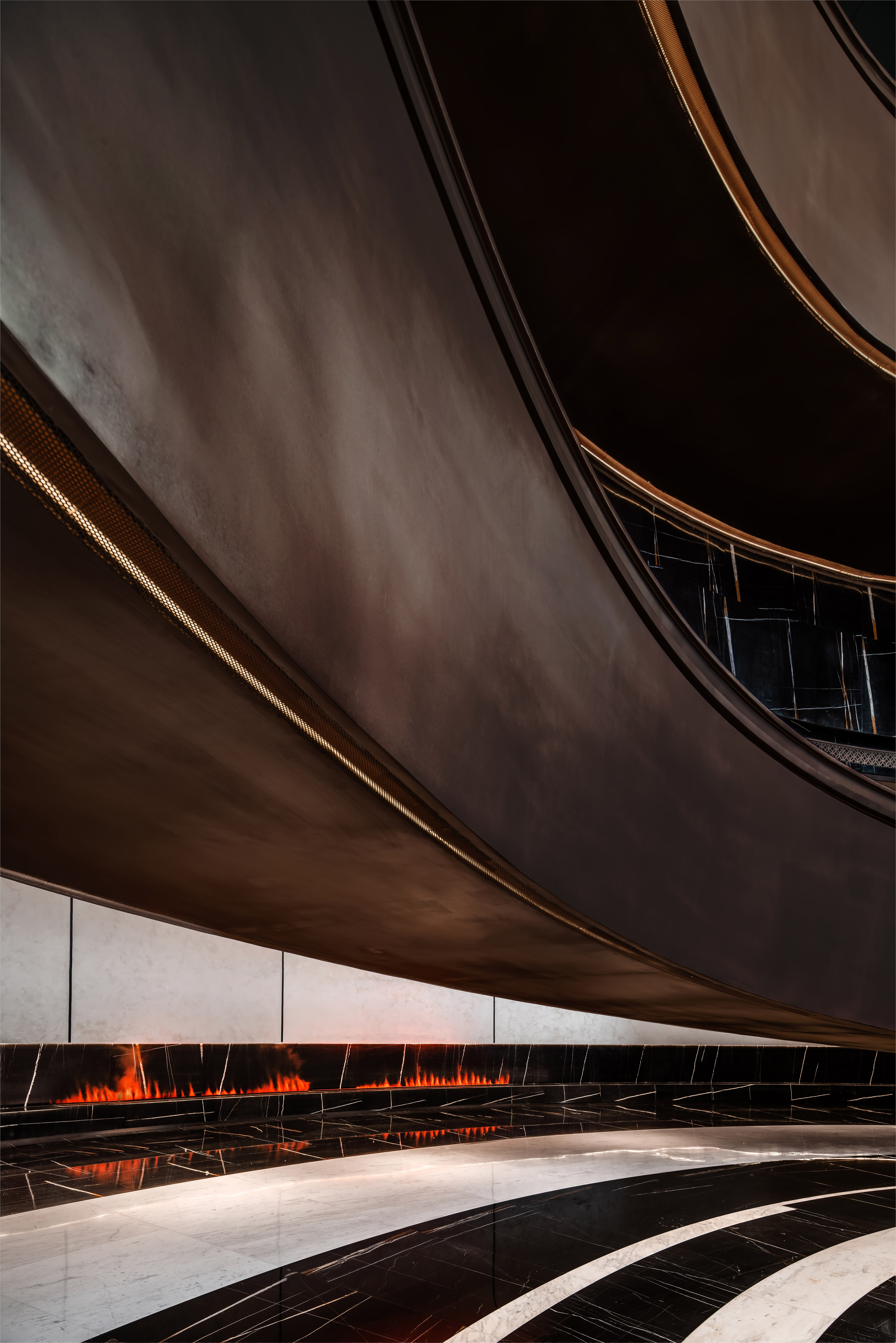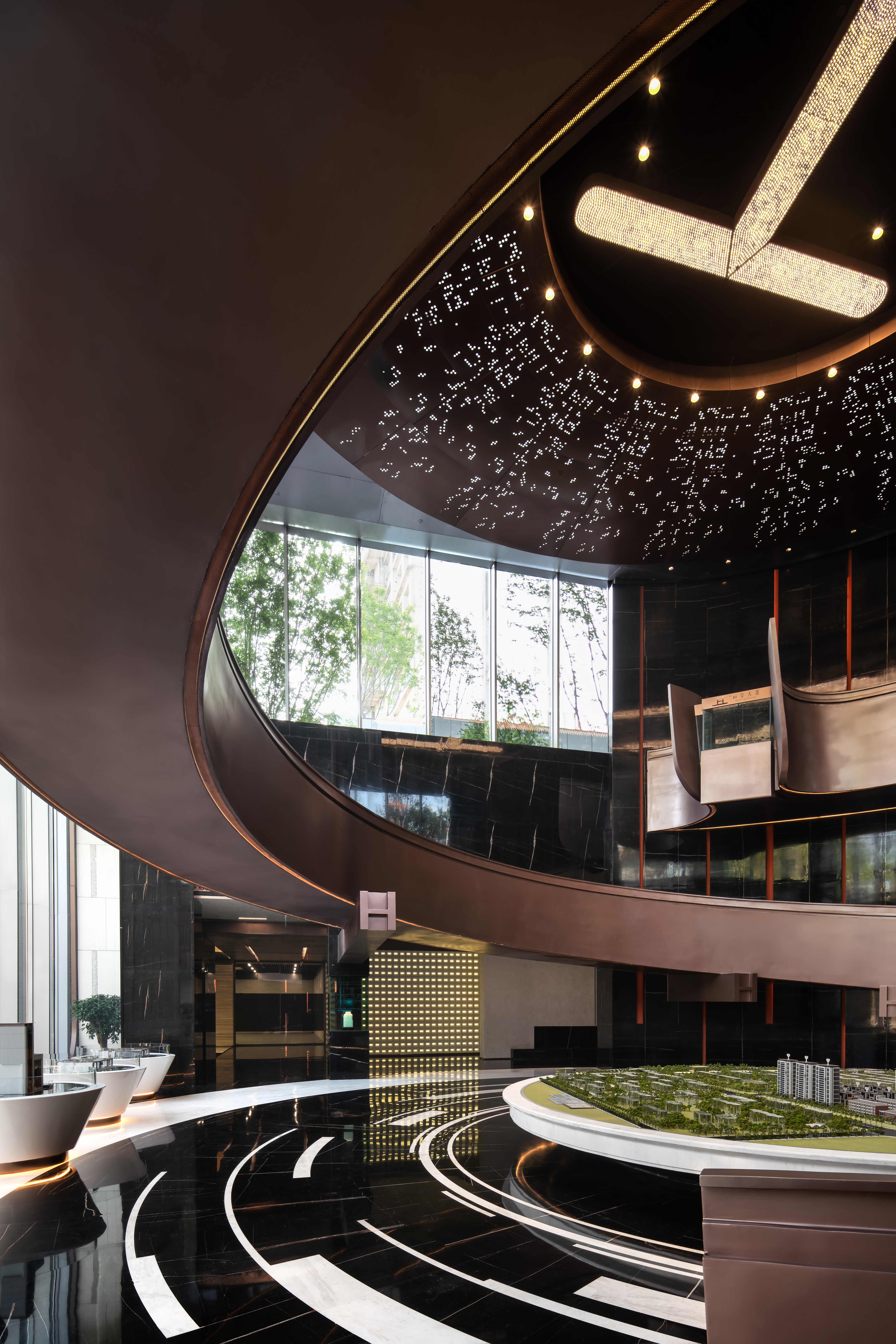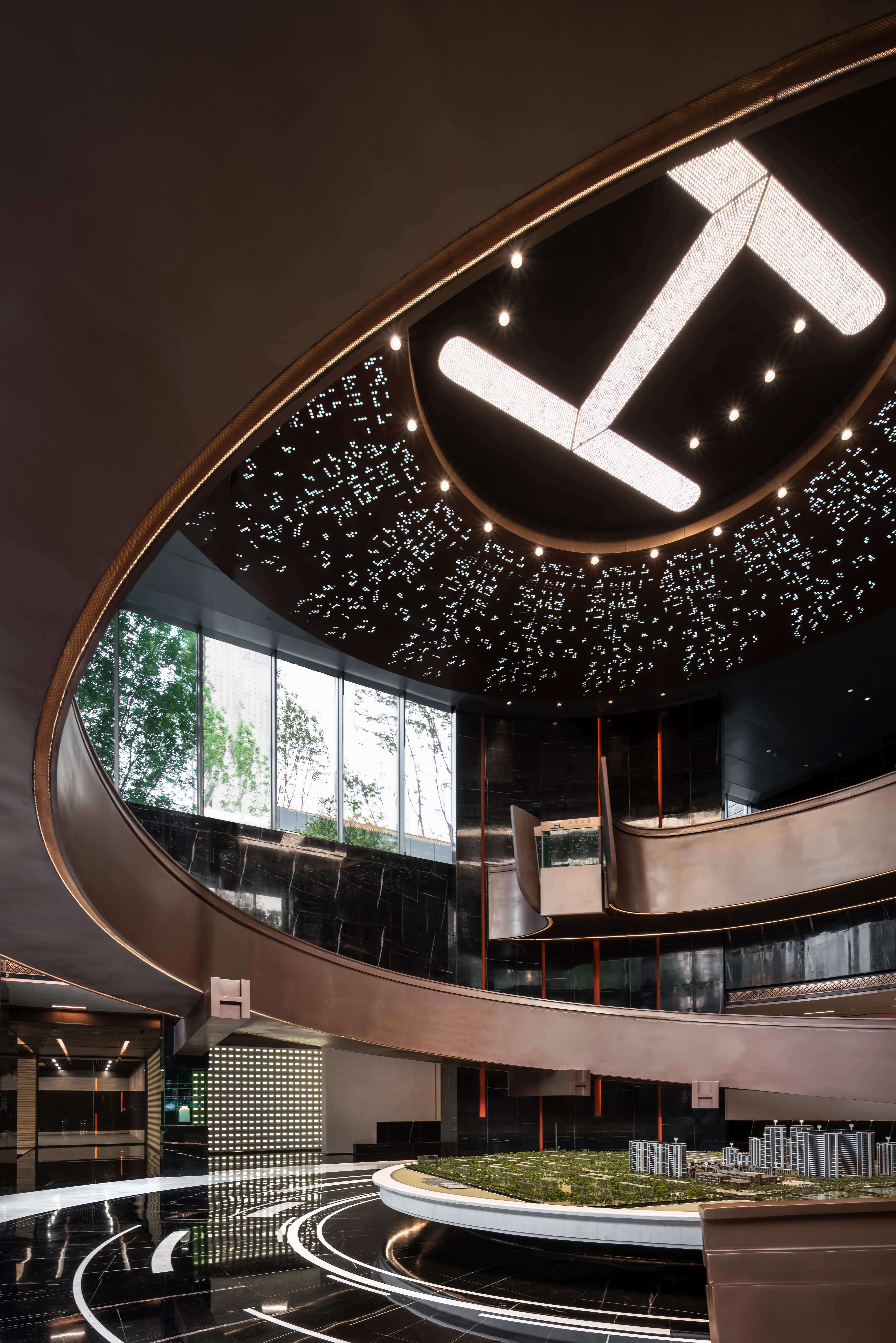 空间意境:以现代奢华的暗黑色调为主,沙盘上方的66米时空之轮,震撼整体视觉,顶部9000多汉字艺术装置,将“山水、行文、时空”链入空间中,联合创造出一个互动感的引力剧场,让人在游走驻足时,倾听风华过往、一代传奇,仿若卷入宏大的史诗长河中,当人们走入其中,便会沉浸其中,构筑一种无垠的探索感,让参观摆脱纯粹的功能主义动线,转而成为一个充满奇想灵感的空间语境。