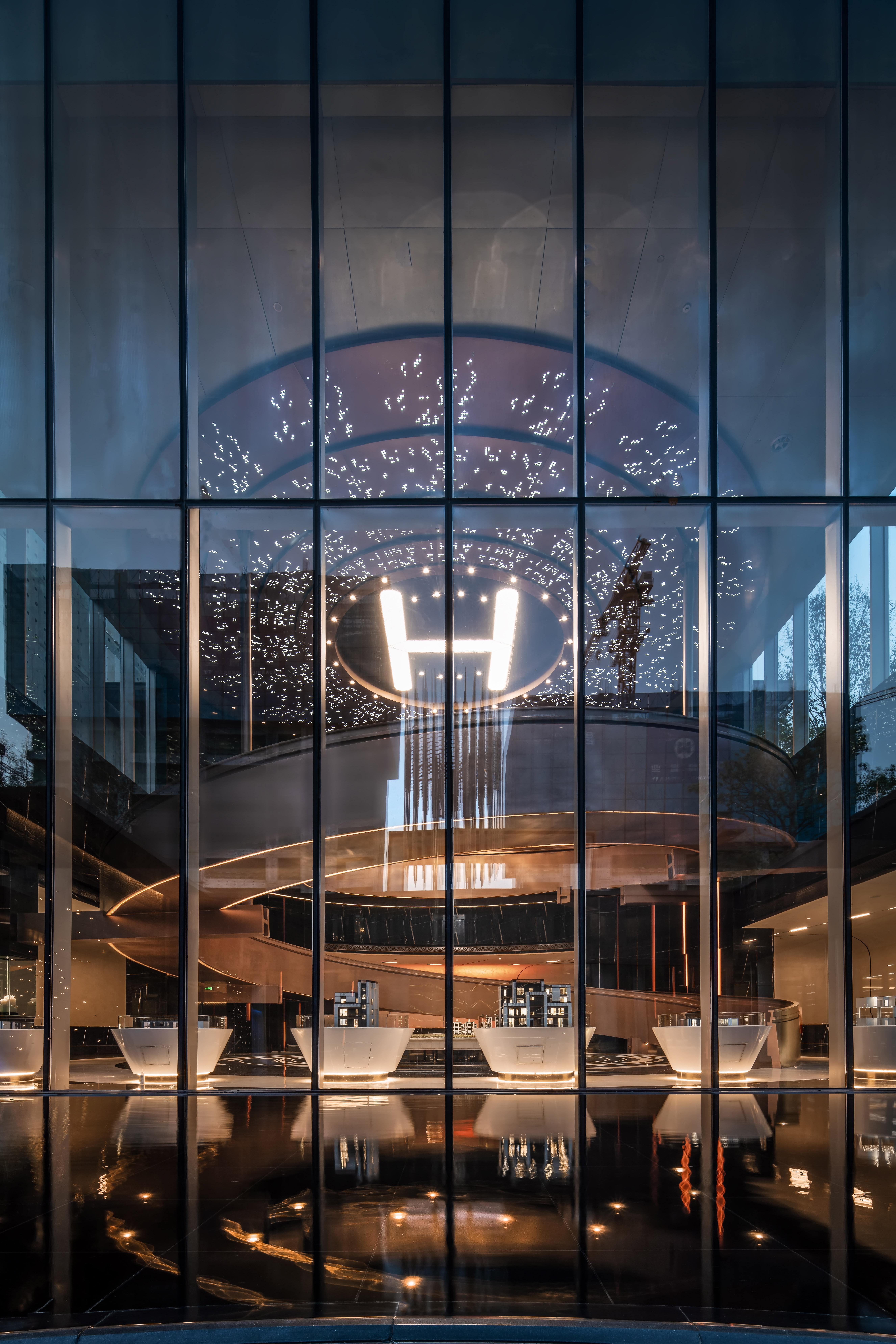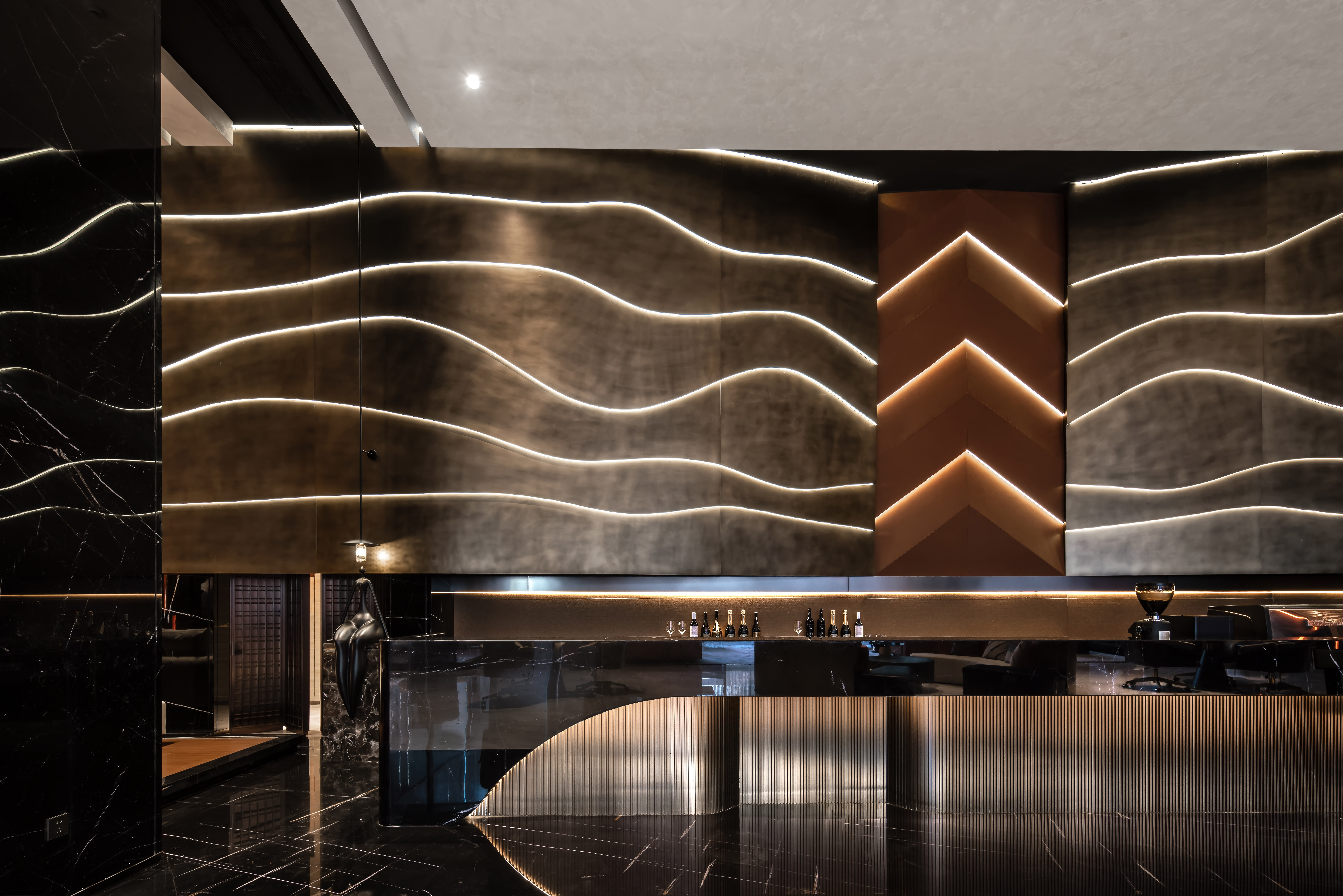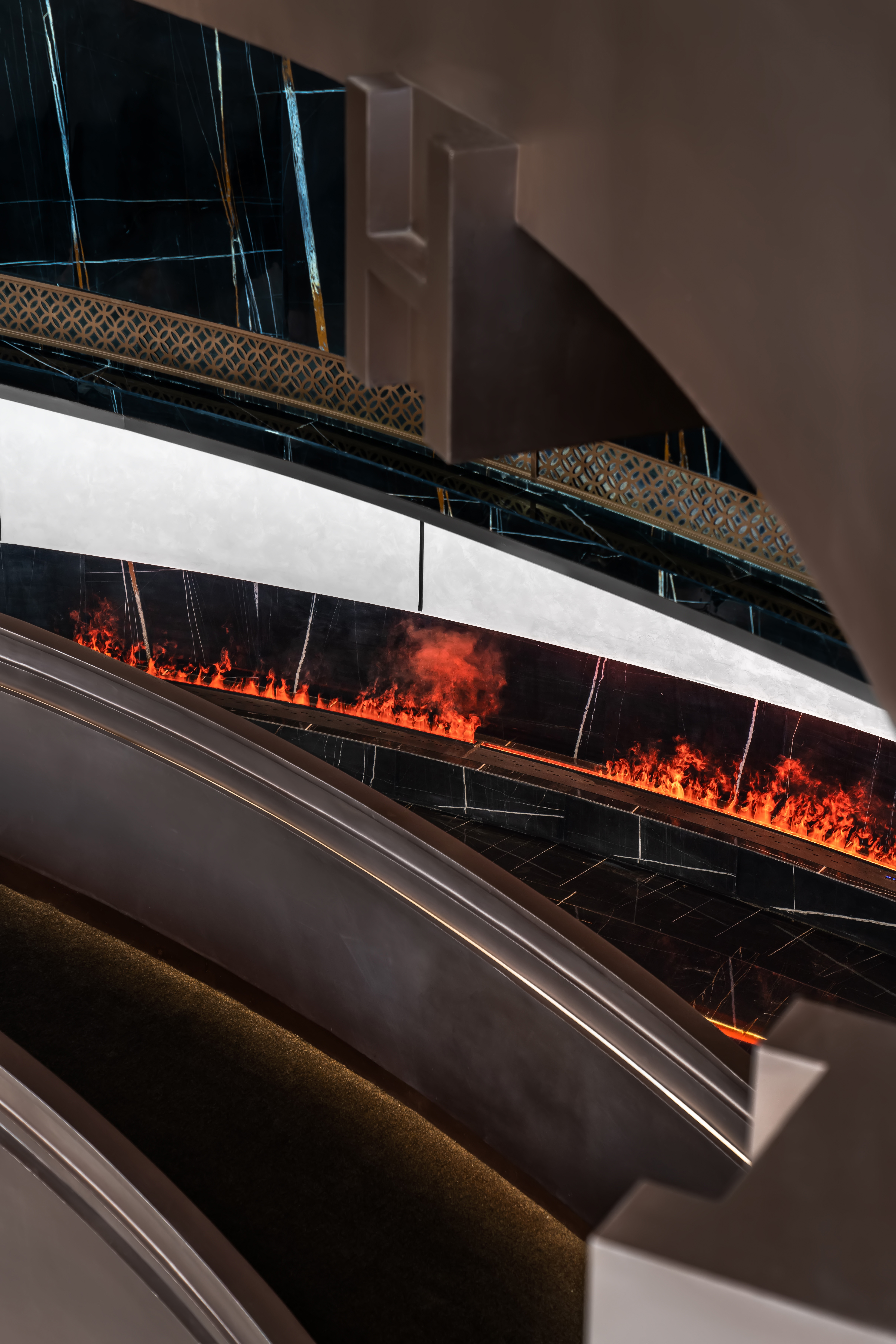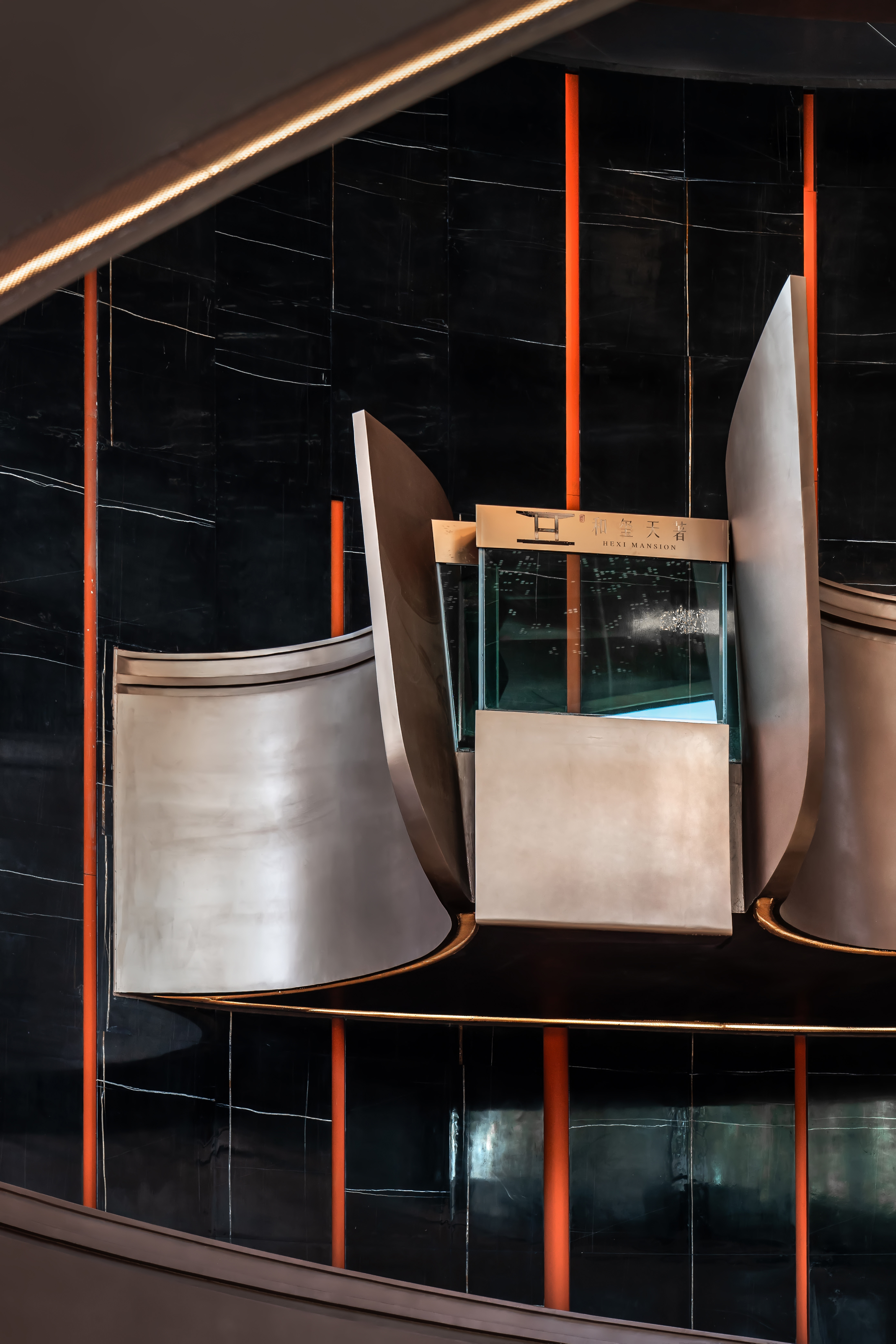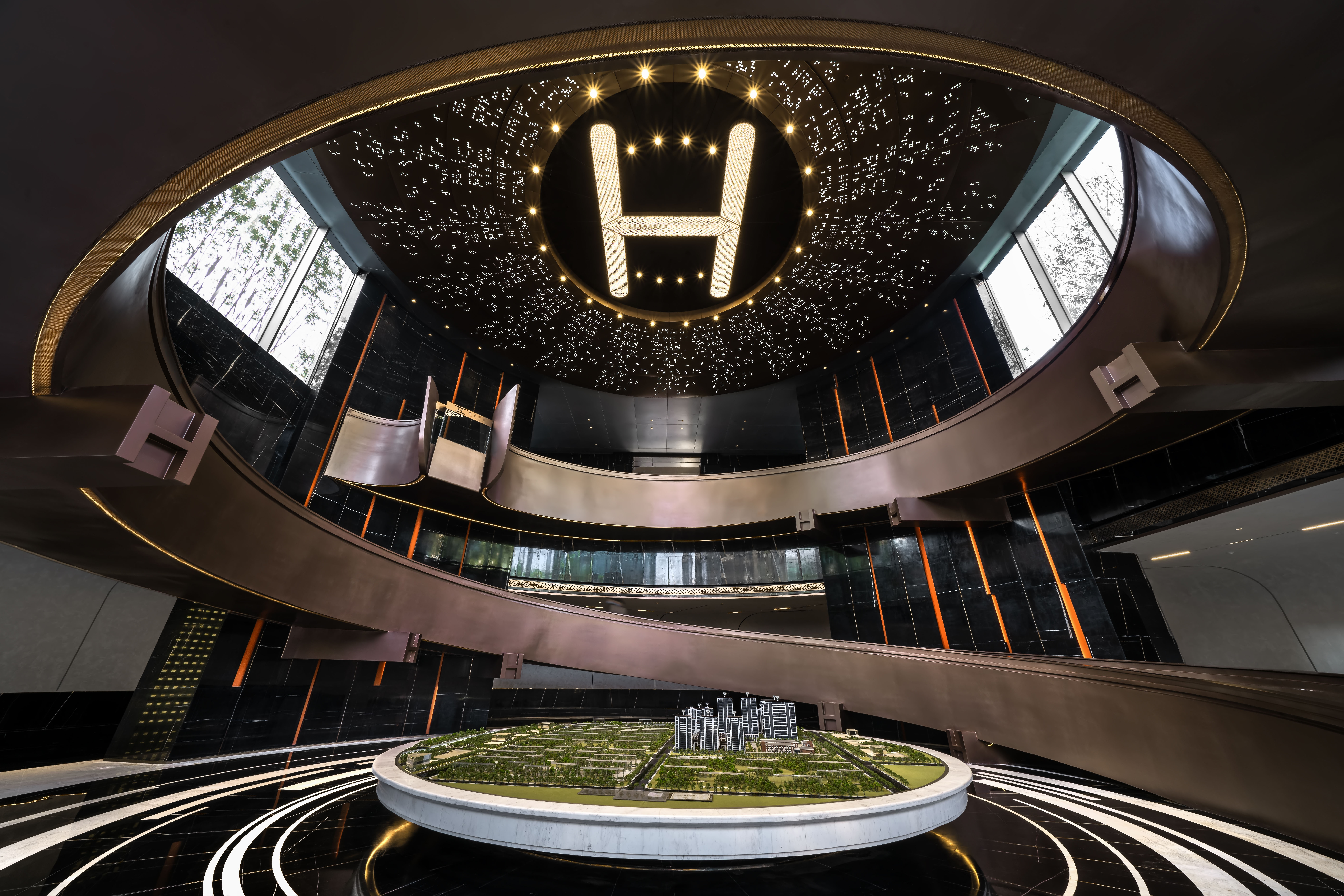 空间意境:以现代奢华的暗黑色调为主,沙盘上方的66米时空之轮,震撼整体视觉,顶部9000多汉字艺术装置,将“山水、行文、时空”链入空间中,联合创造出一个互动感的引力剧场,让人在游走驻足时,倾听风华过往、一代传奇,仿若卷入宏大的史诗长河中,当人们走入其中,便会沉浸其中,构筑一种无垠的探索感,让参观摆脱纯粹的功能主义动线,转而成为一个充满奇想灵感的空间语境。
