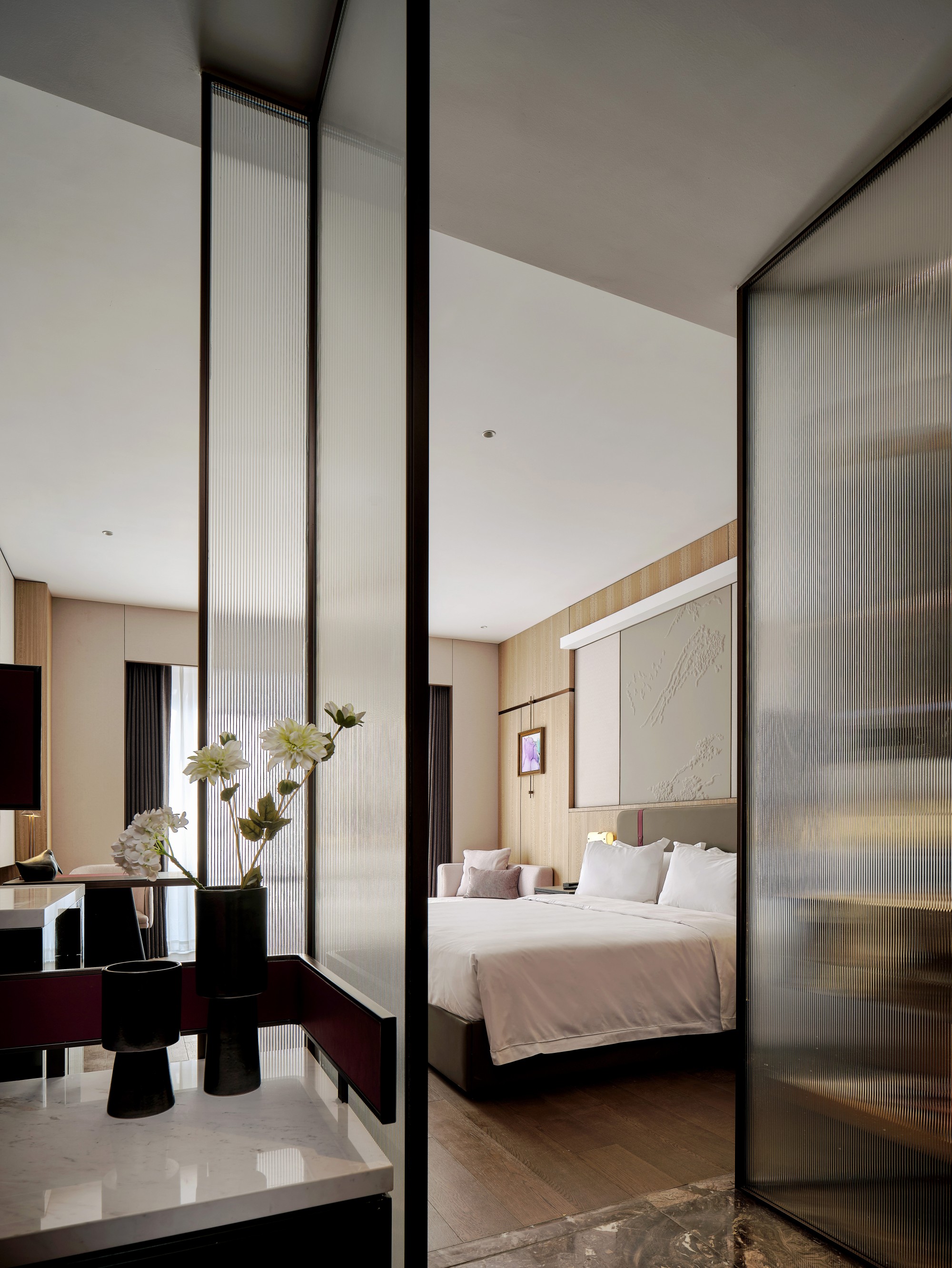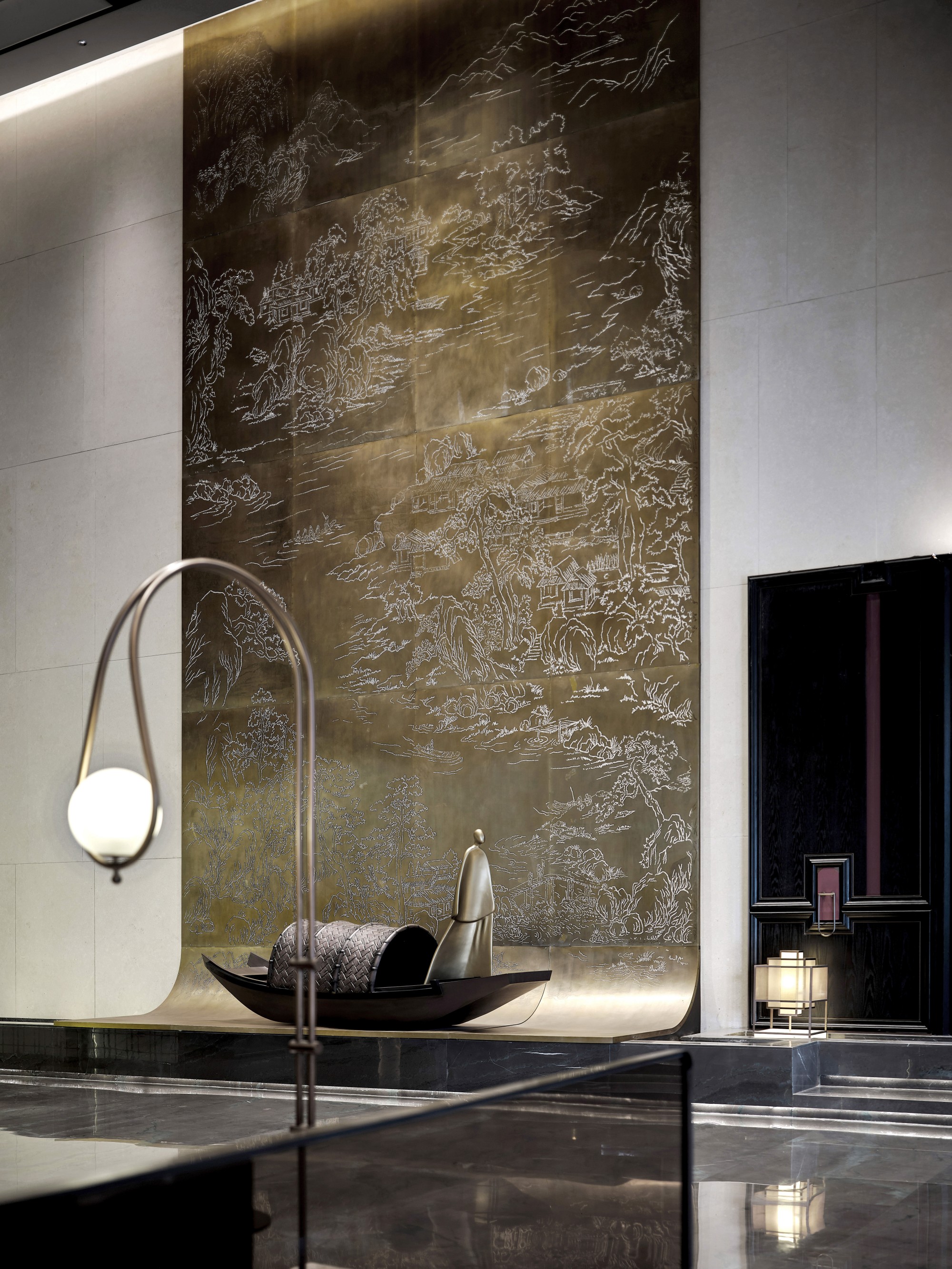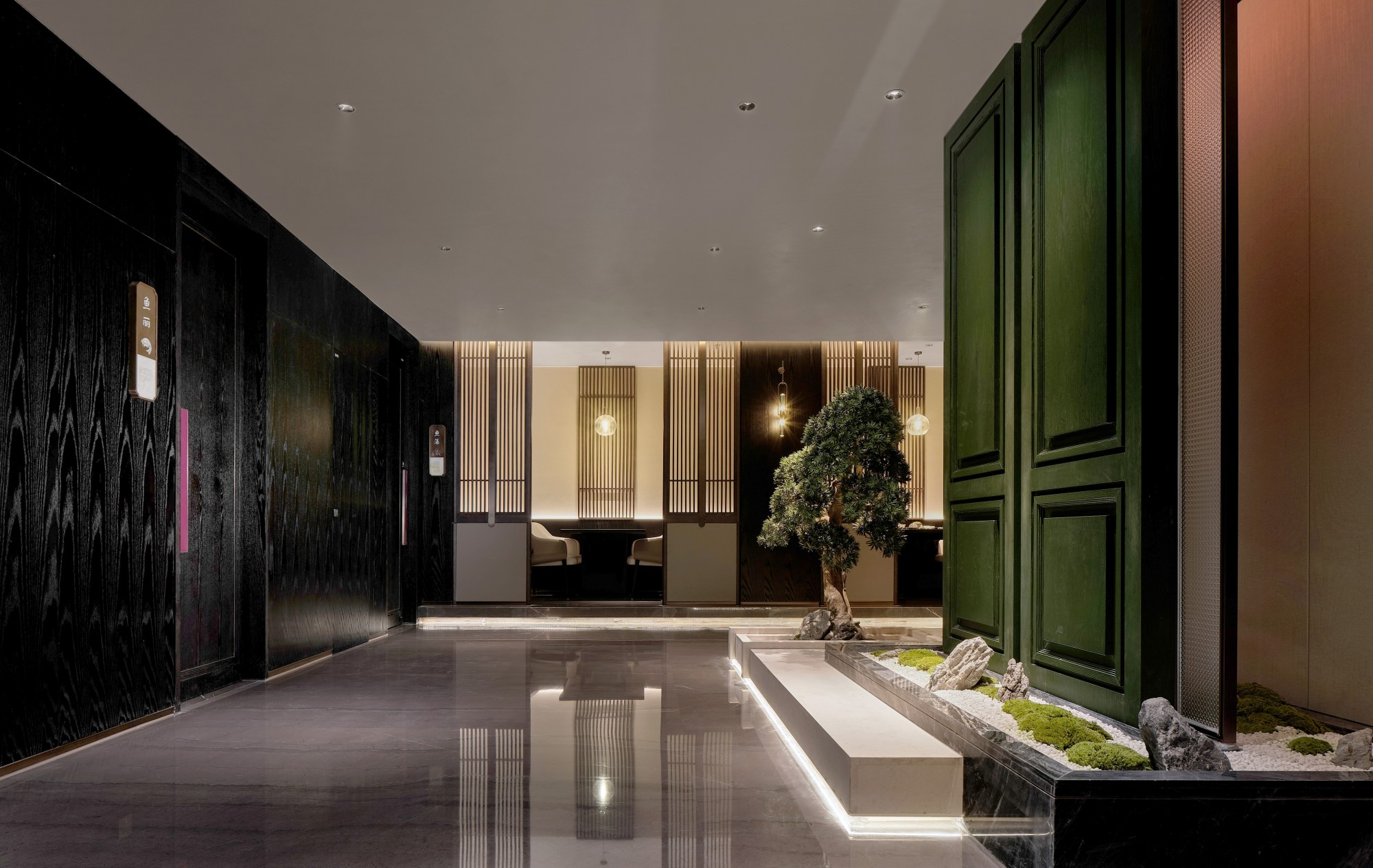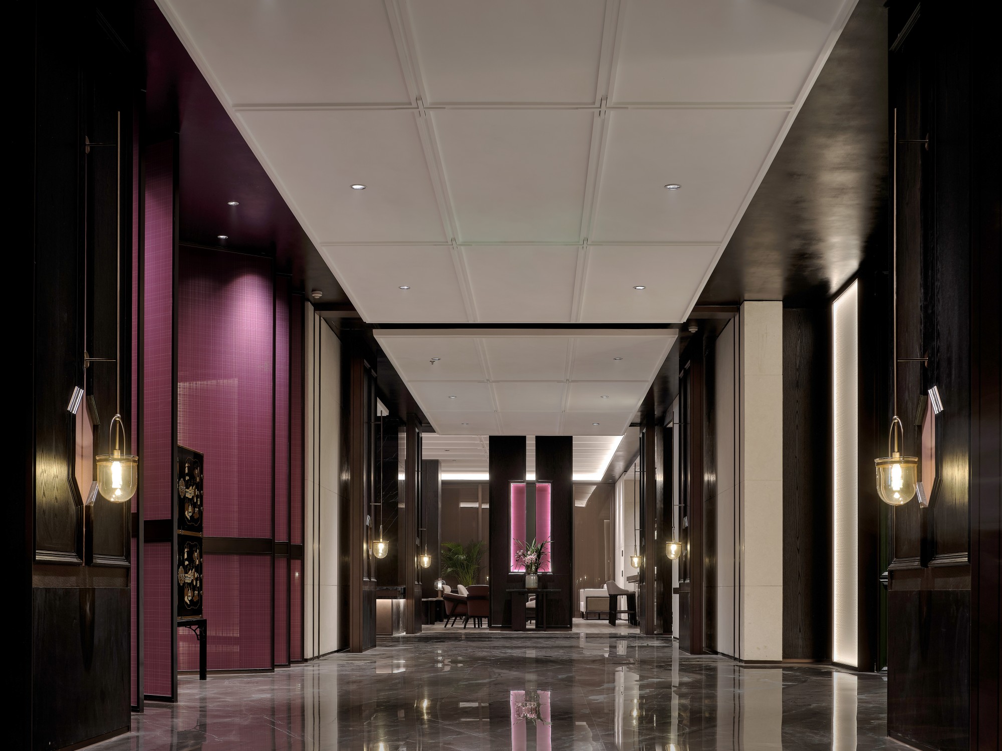 【大堂】大厅背景的巨幅艺术品,是“秦岭沣水园林“的写意描绘,以铜板蚀刻孔印技术,再现“南山当户牖,沣水映园林”风貌,以礼为源,祥迎八方宾客。阵列又充满仪式的走廊,是礼仪尊贵的待客之道,亦是大厅、大堂吧及过厅的贯穿轴。庄重大气的门扇立于两侧,是文化之都的礼敬尊重,黑色门扇点缀品牌色彩紫红色及金属线条,以现代的创新手法重现文化符号。