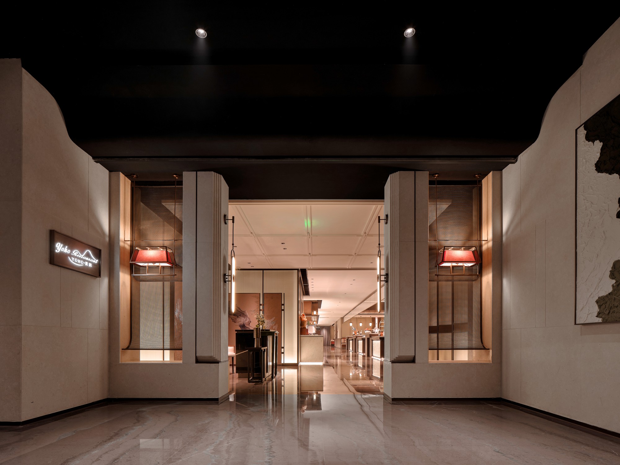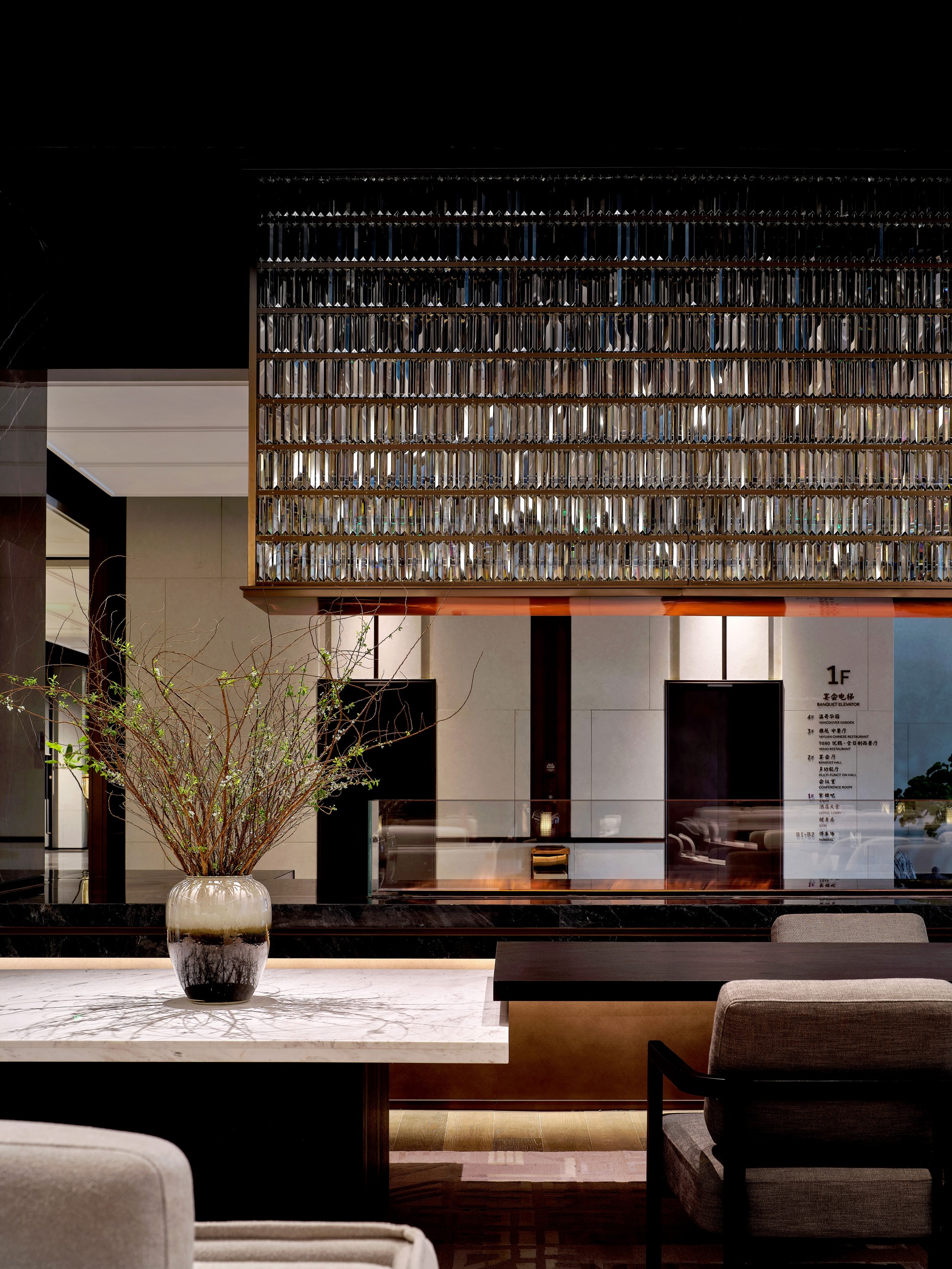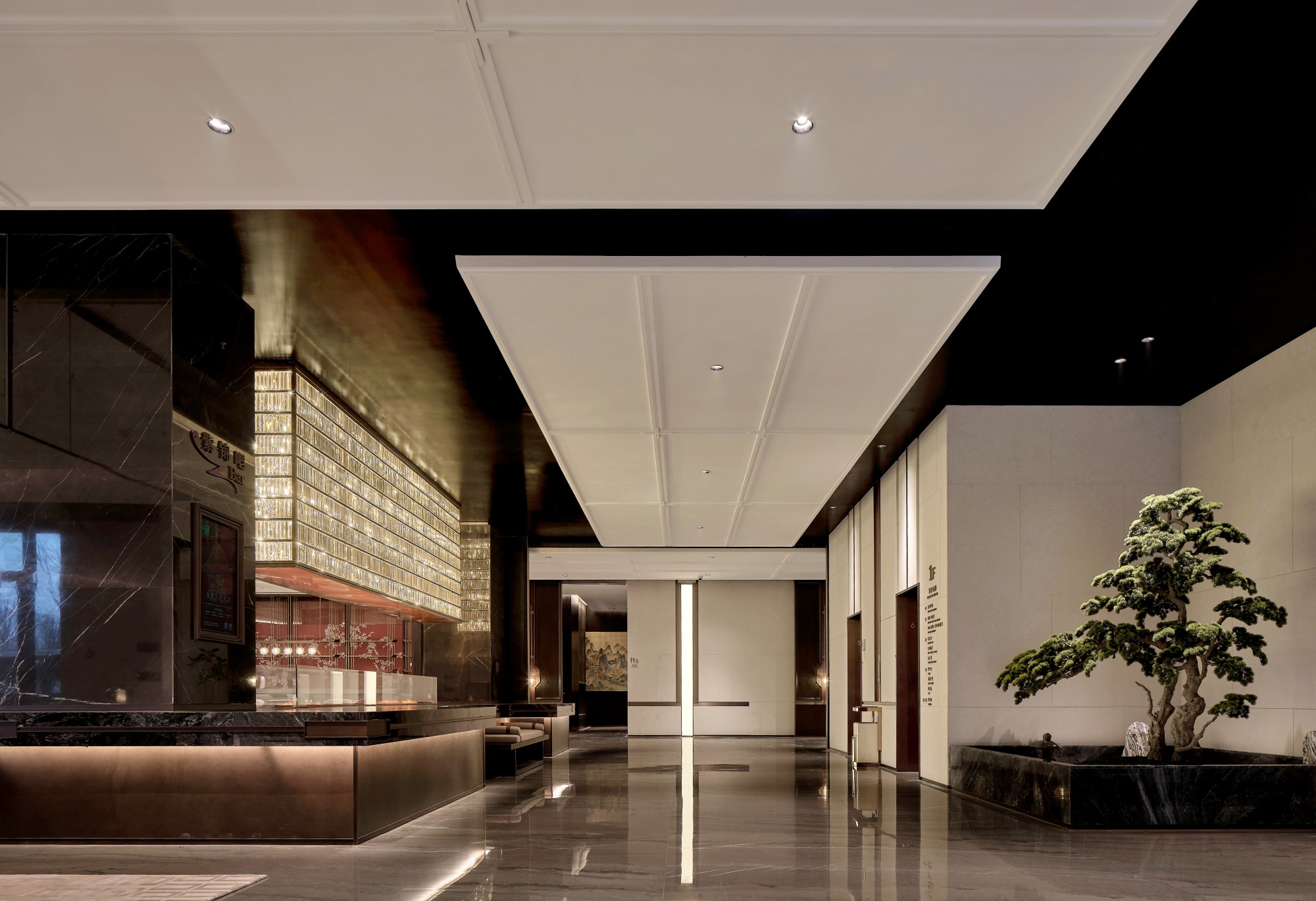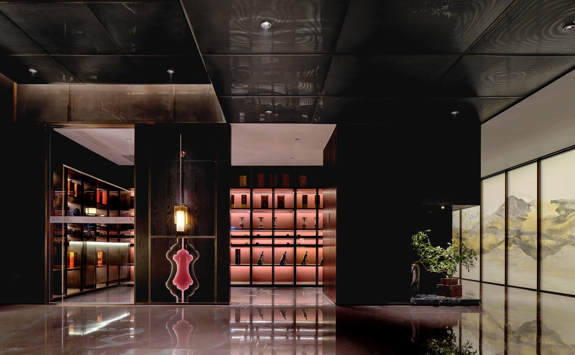 【大堂】大厅背景的巨幅艺术品,是“秦岭沣水园林“的写意描绘,以铜板蚀刻孔印技术,再现“南山当户牖,沣水映园林”风貌,以礼为源,祥迎八方宾客。阵列又充满仪式的走廊,是礼仪尊贵的待客之道,亦是大厅、大堂吧及过厅的贯穿轴。庄重大气的门扇立于两侧,是文化之都的礼敬尊重,黑色门扇点缀品牌色彩紫红色及金属线条,以现代的创新手法重现文化符号。