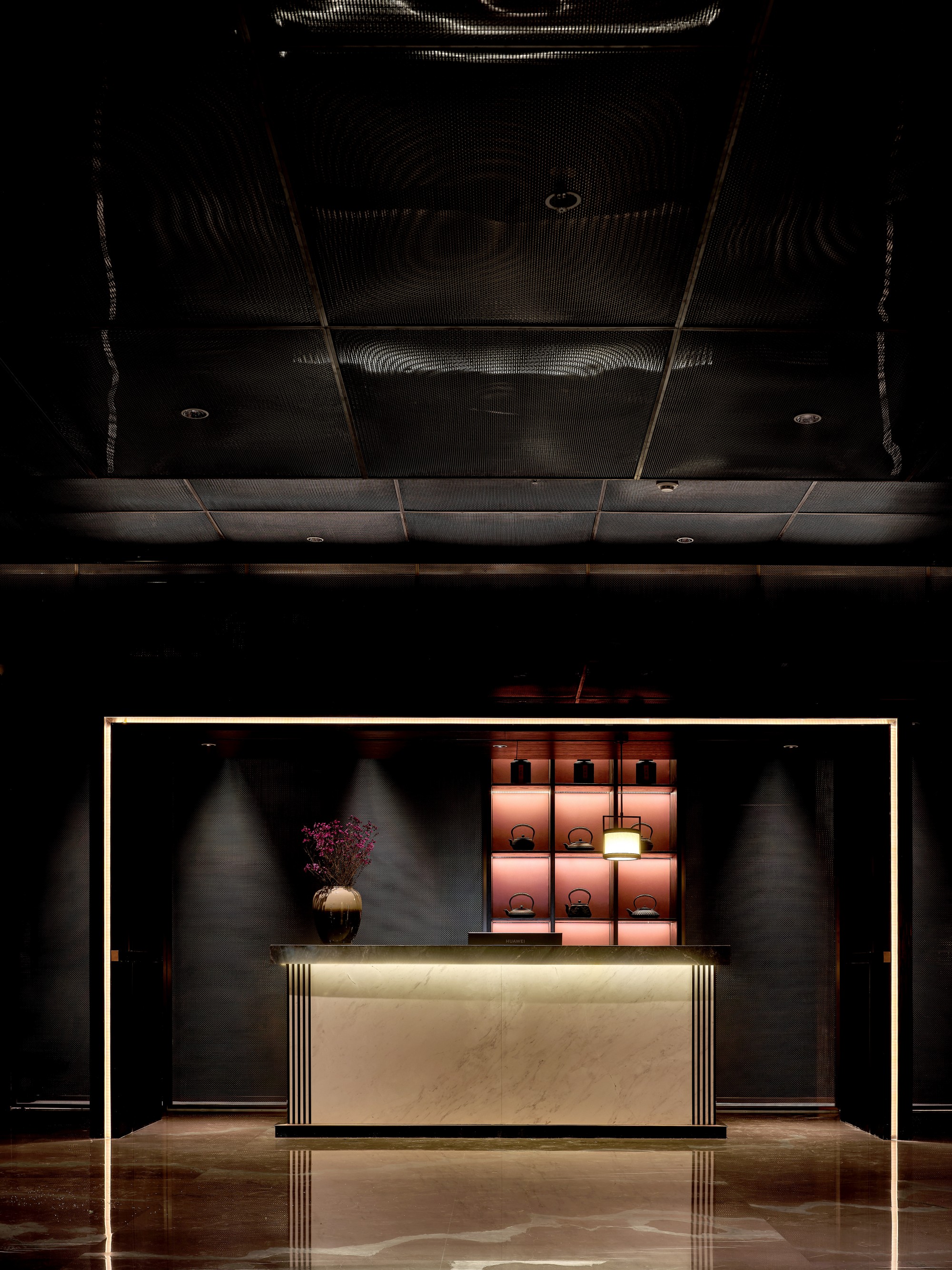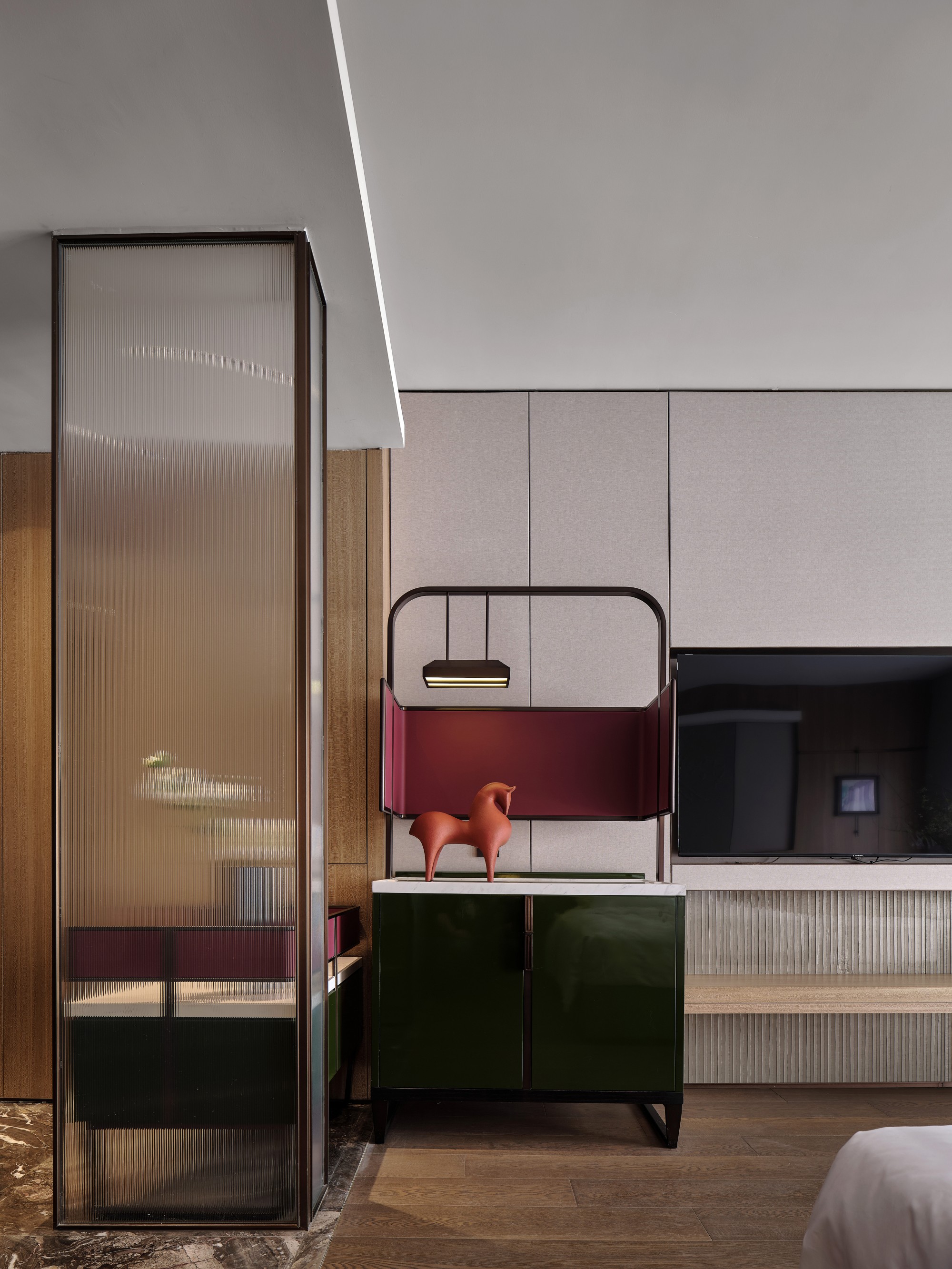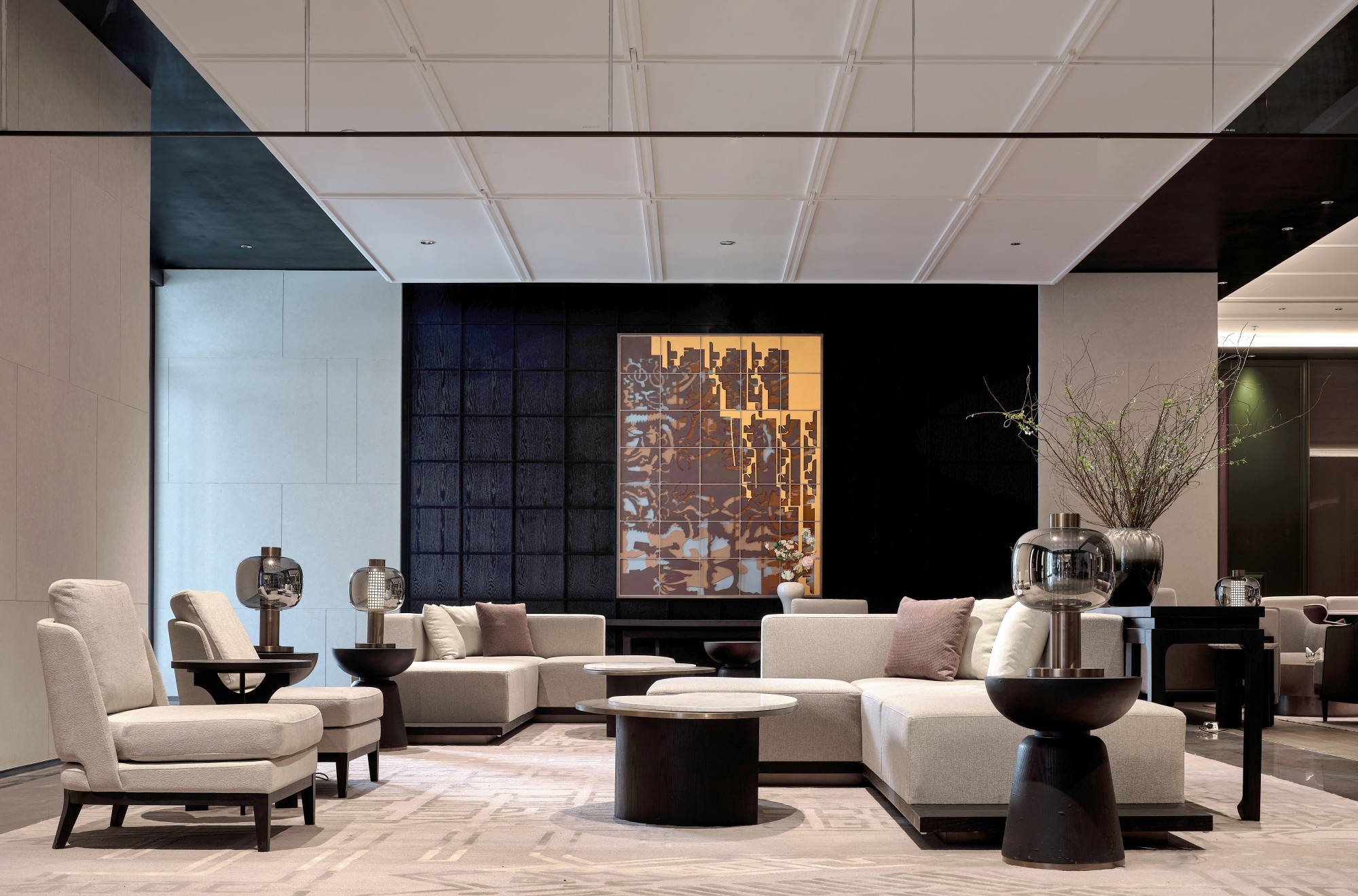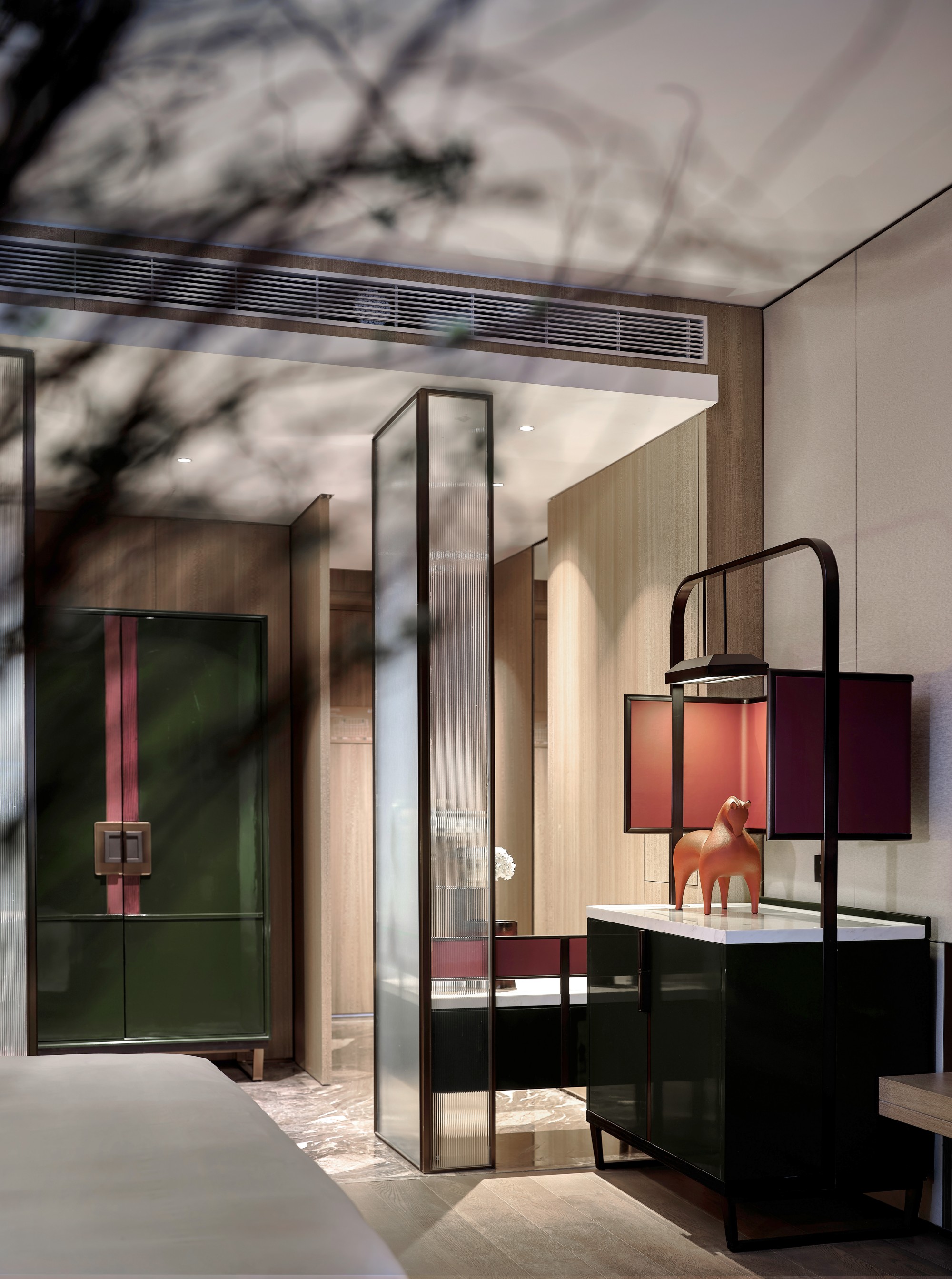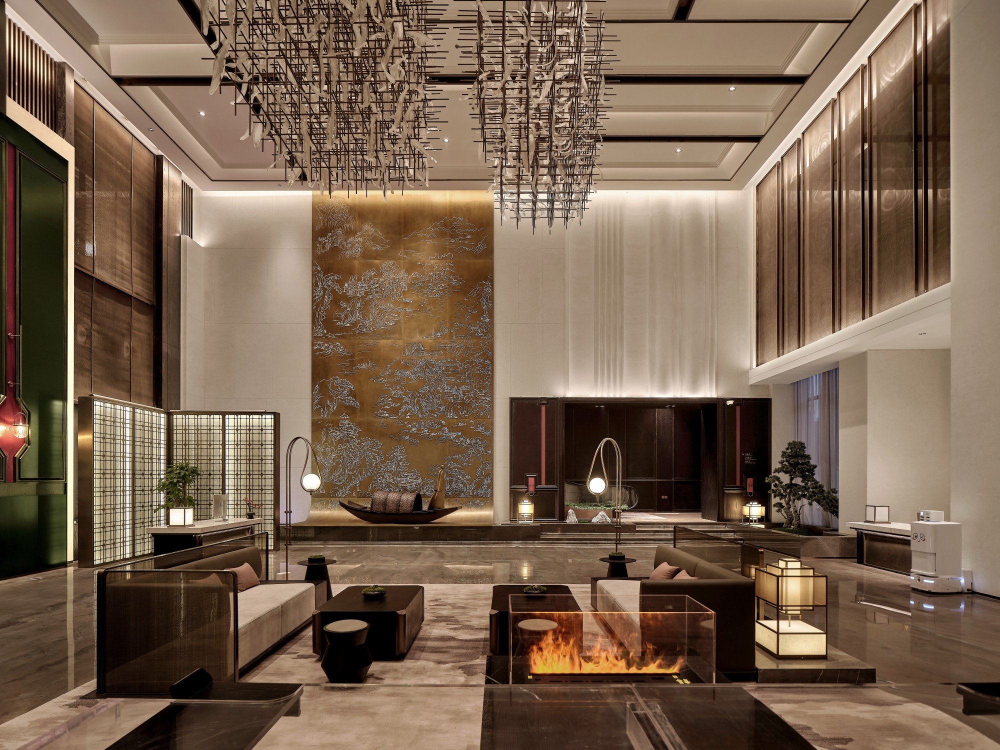 【大堂】大厅背景的巨幅艺术品,是“秦岭沣水园林“的写意描绘,以铜板蚀刻孔印技术,再现“南山当户牖,沣水映园林”风貌,以礼为源,祥迎八方宾客。阵列又充满仪式的走廊,是礼仪尊贵的待客之道,亦是大厅、大堂吧及过厅的贯穿轴。庄重大气的门扇立于两侧,是文化之都的礼敬尊重,黑色门扇点缀品牌色彩紫红色及金属线条,以现代的创新手法重现文化符号。