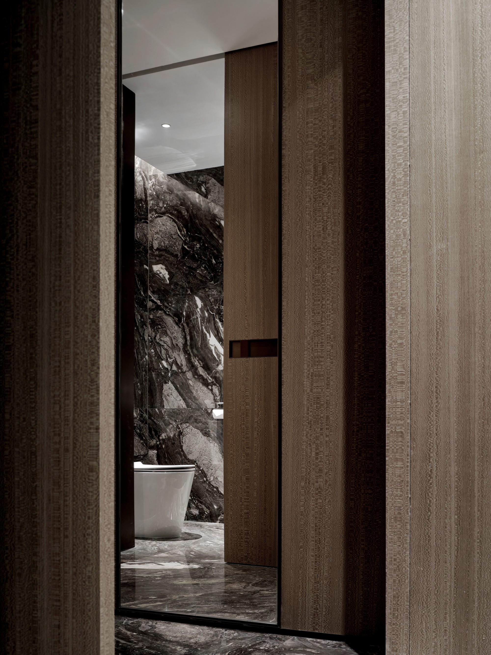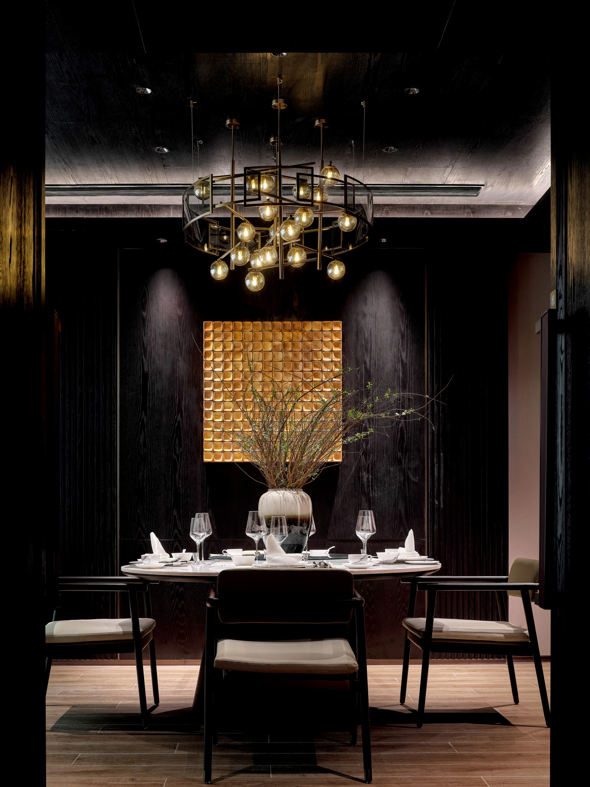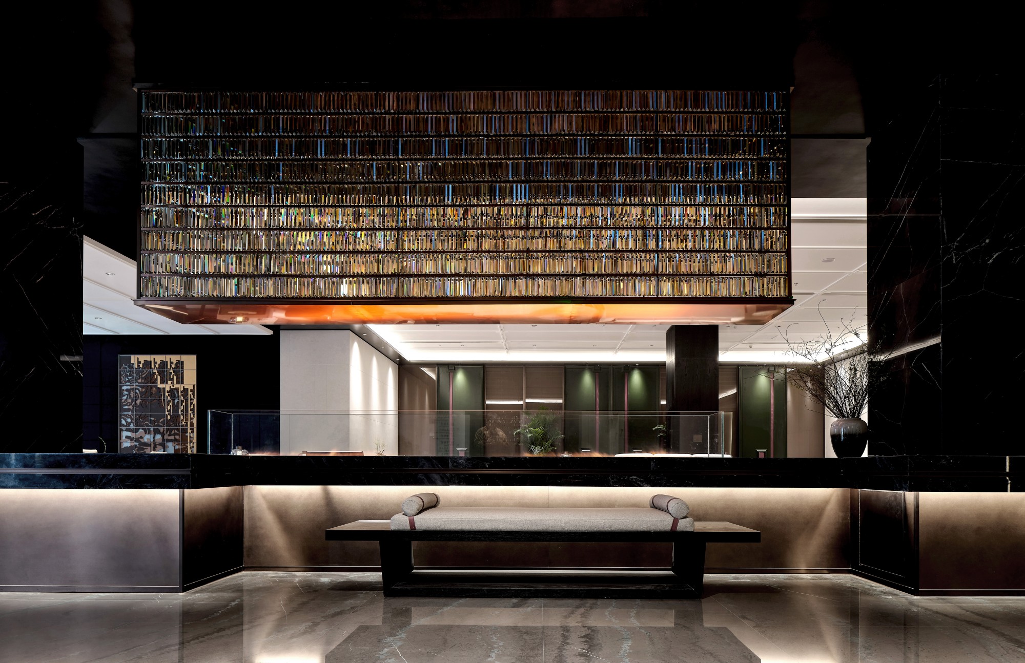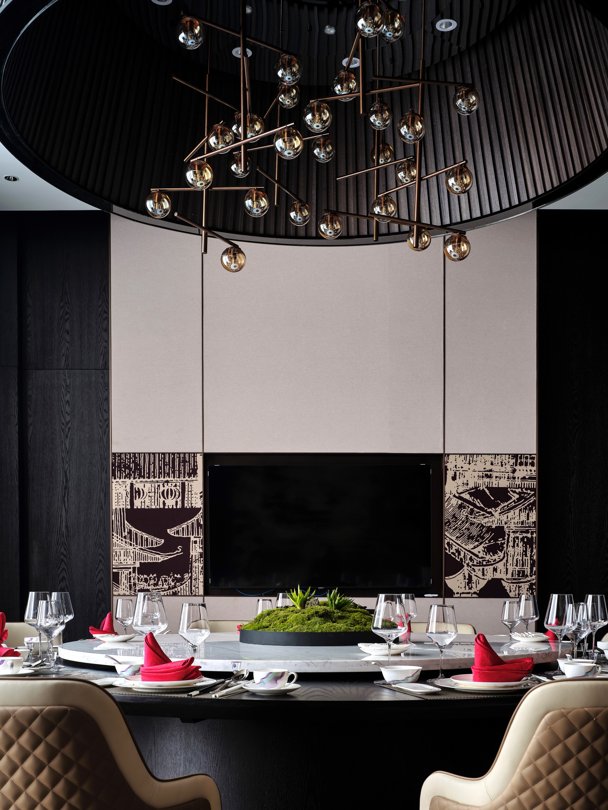 【大堂】大厅背景的巨幅艺术品,是“秦岭沣水园林“的写意描绘,以铜板蚀刻孔印技术,再现“南山当户牖,沣水映园林”风貌,以礼为源,祥迎八方宾客。阵列又充满仪式的走廊,是礼仪尊贵的待客之道,亦是大厅、大堂吧及过厅的贯穿轴。庄重大气的门扇立于两侧,是文化之都的礼敬尊重,黑色门扇点缀品牌色彩紫红色及金属线条,以现代的创新手法重现文化符号。