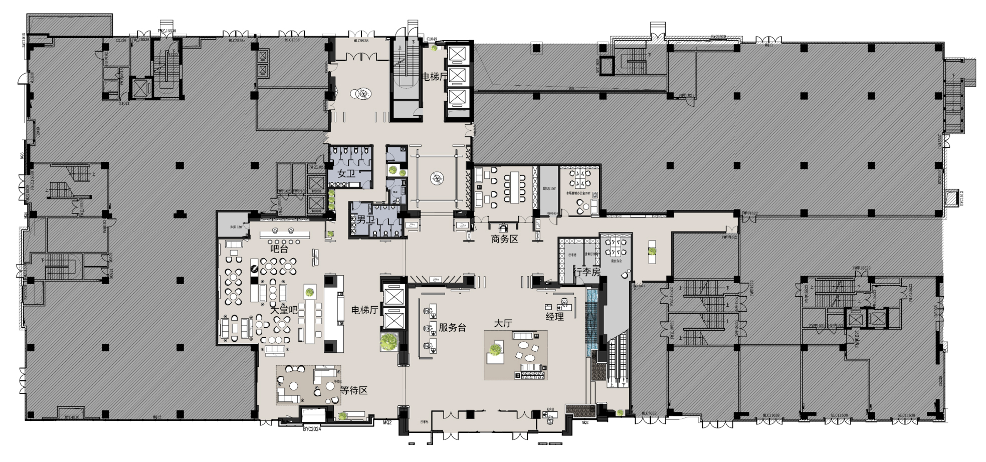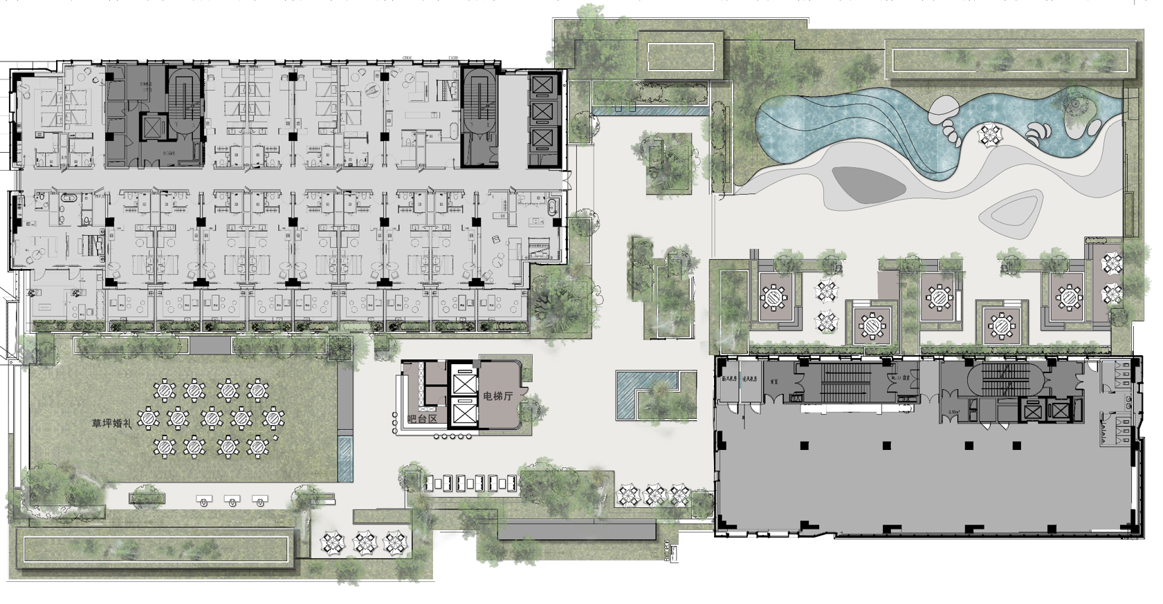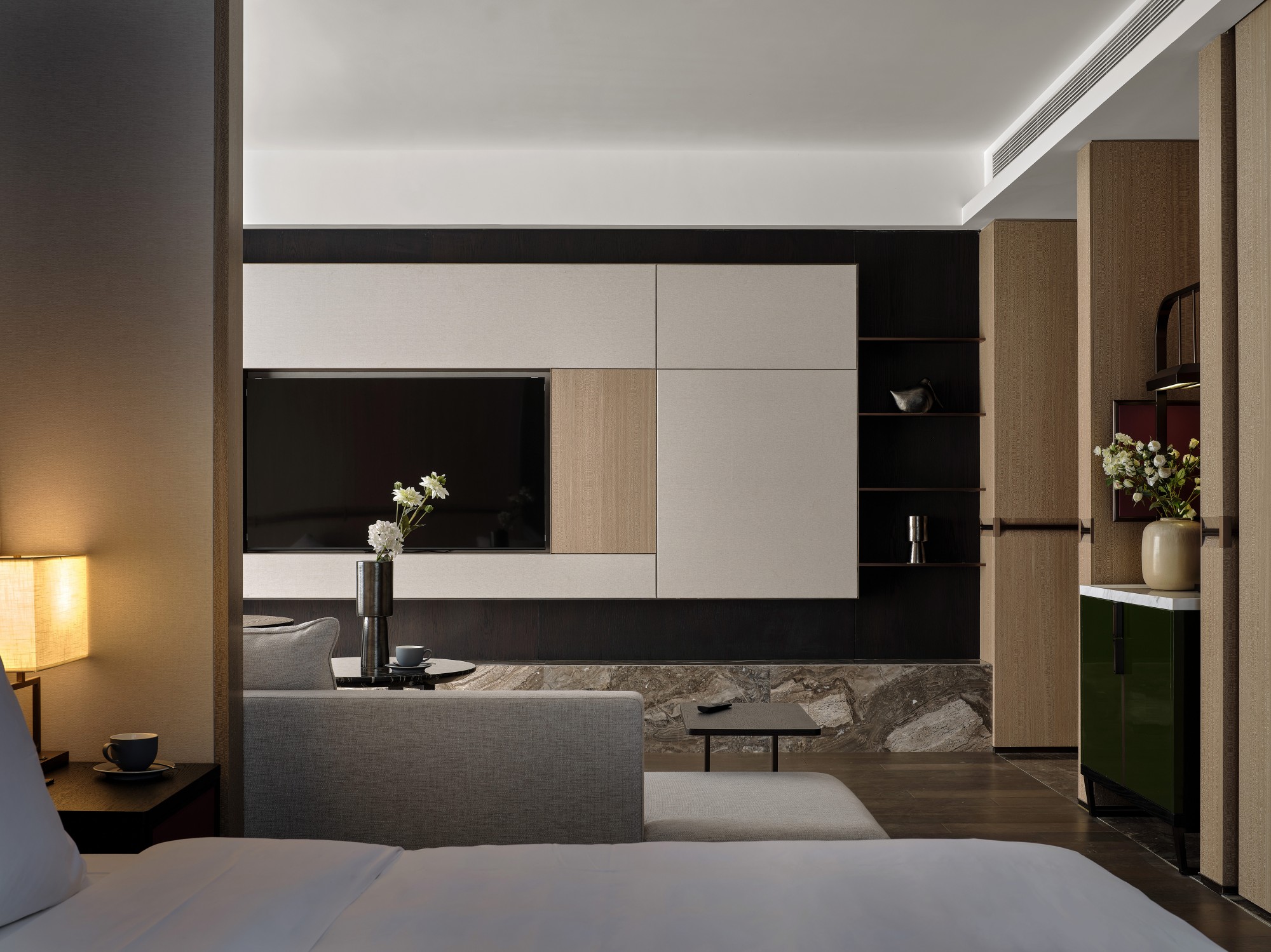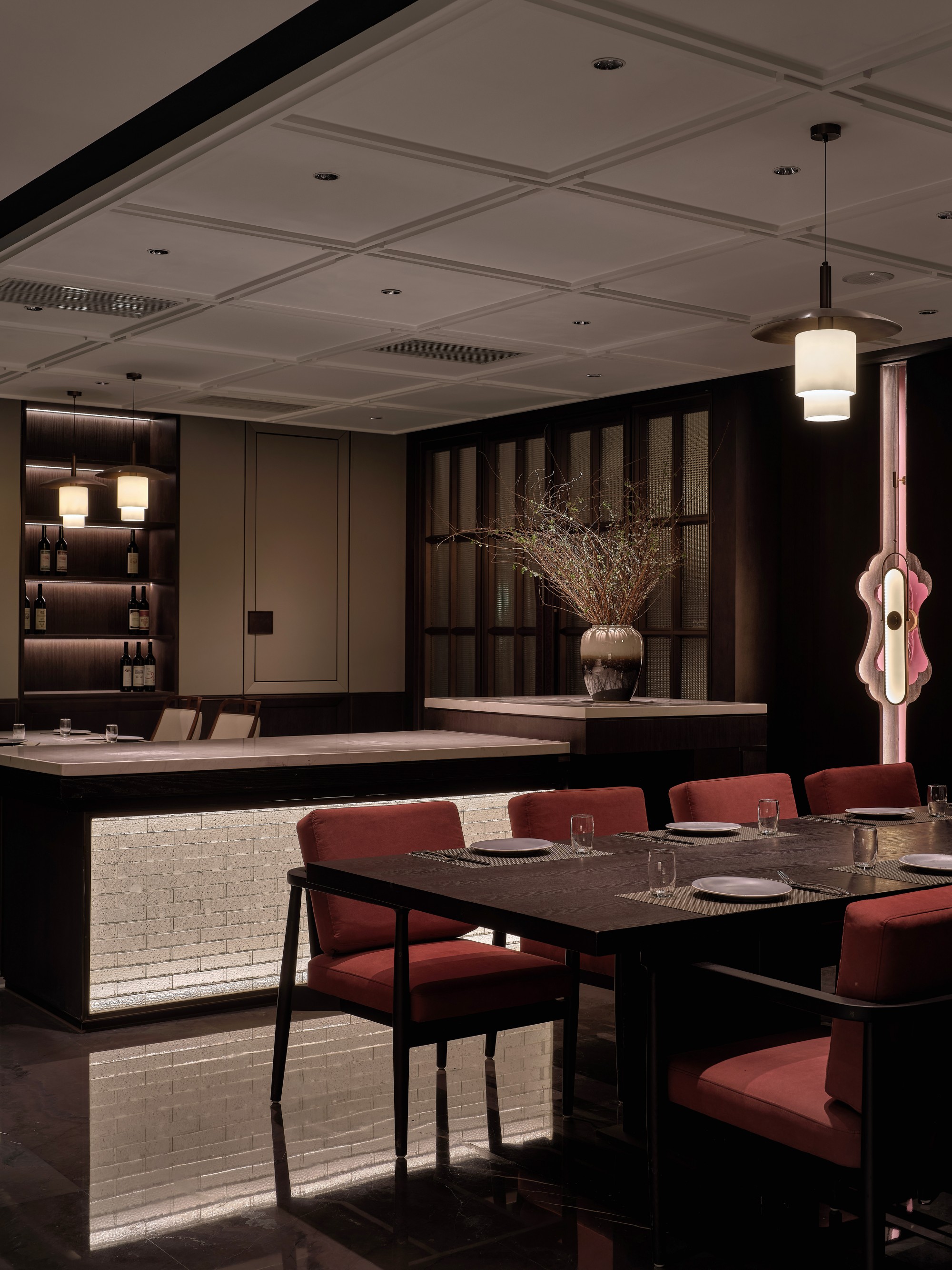 【大堂】大厅背景的巨幅艺术品,是“秦岭沣水园林“的写意描绘,以铜板蚀刻孔印技术,再现“南山当户牖,沣水映园林”风貌,以礼为源,祥迎八方宾客。阵列又充满仪式的走廊,是礼仪尊贵的待客之道,亦是大厅、大堂吧及过厅的贯穿轴。庄重大气的门扇立于两侧,是文化之都的礼敬尊重,黑色门扇点缀品牌色彩紫红色及金属线条,以现代的创新手法重现文化符号。
