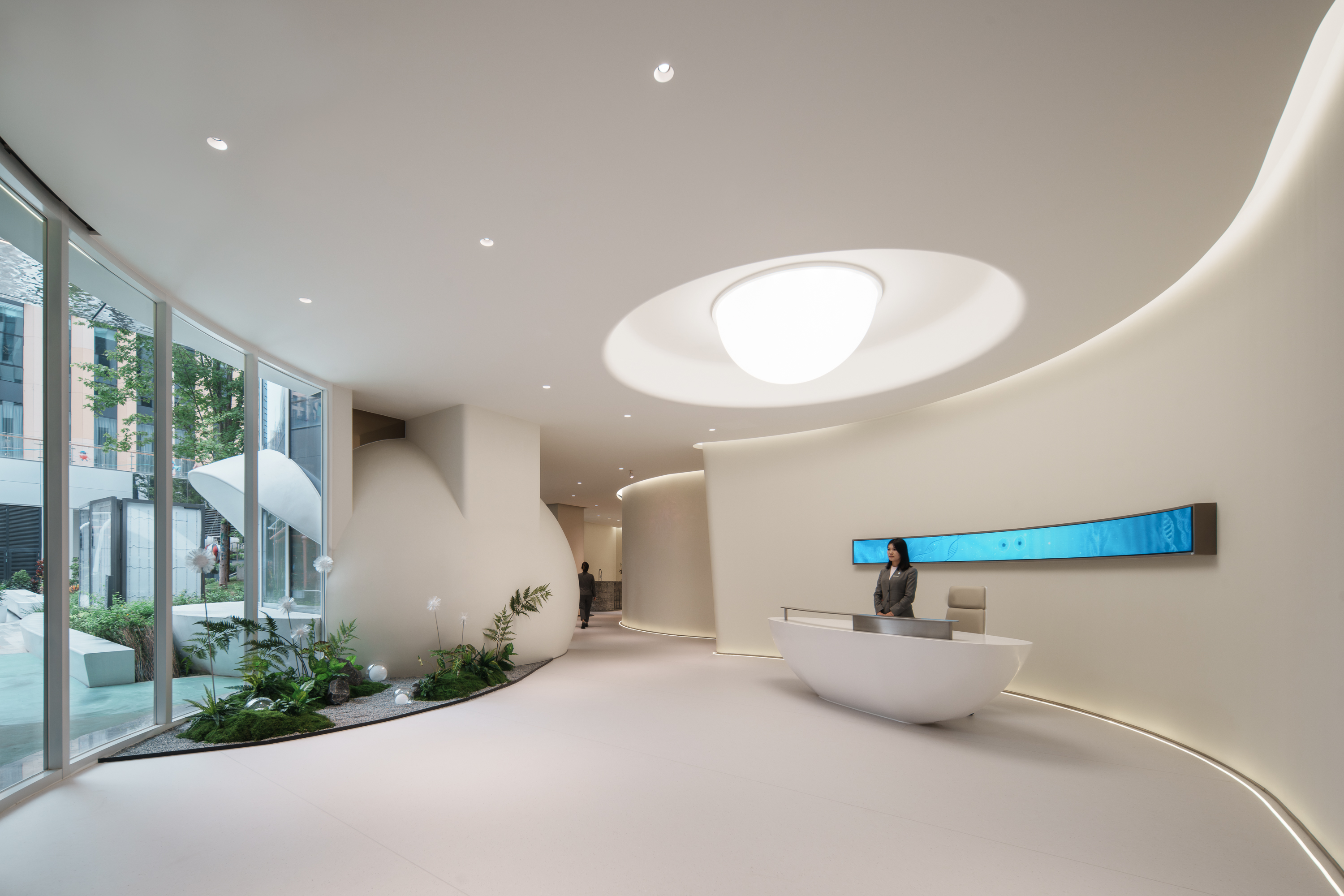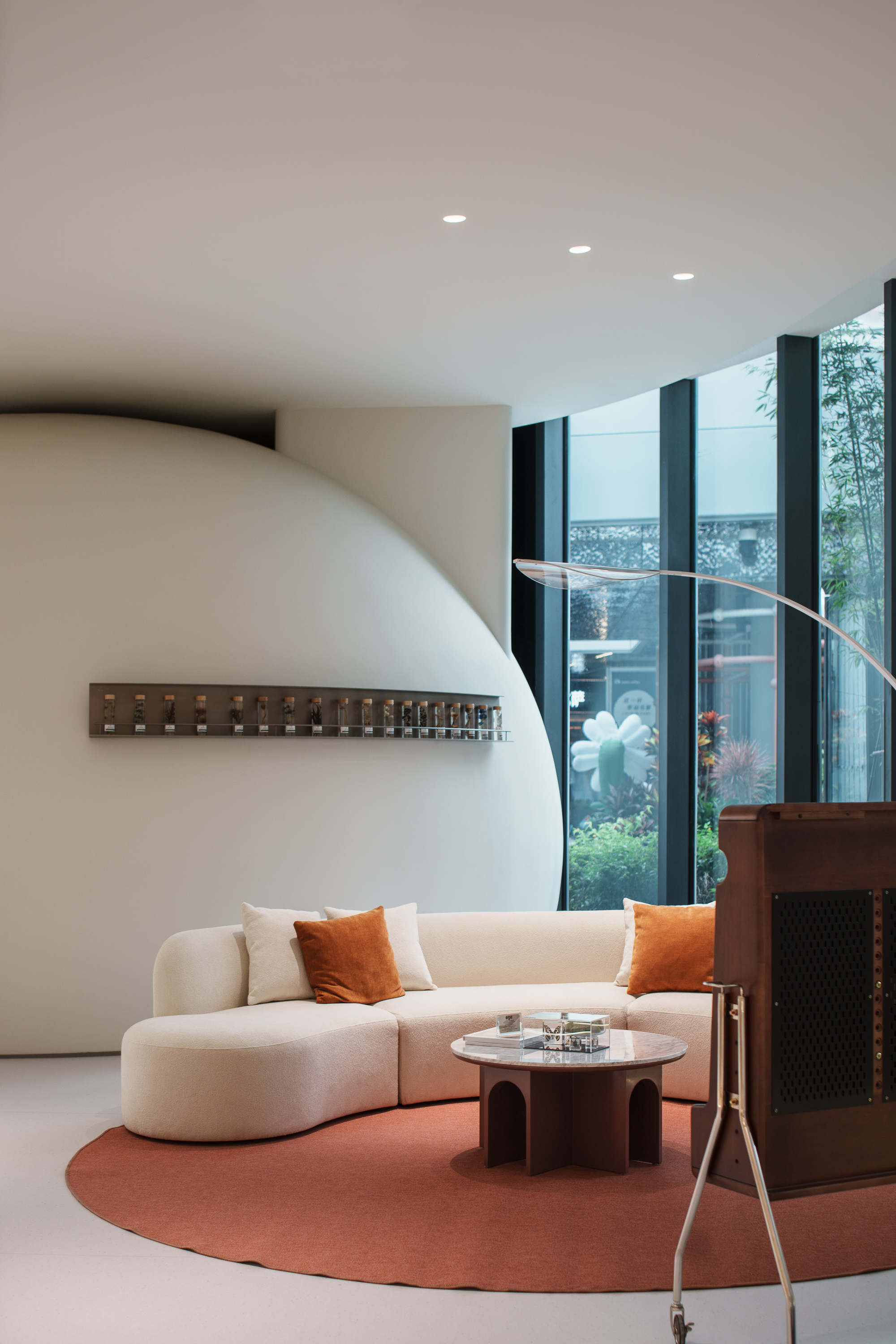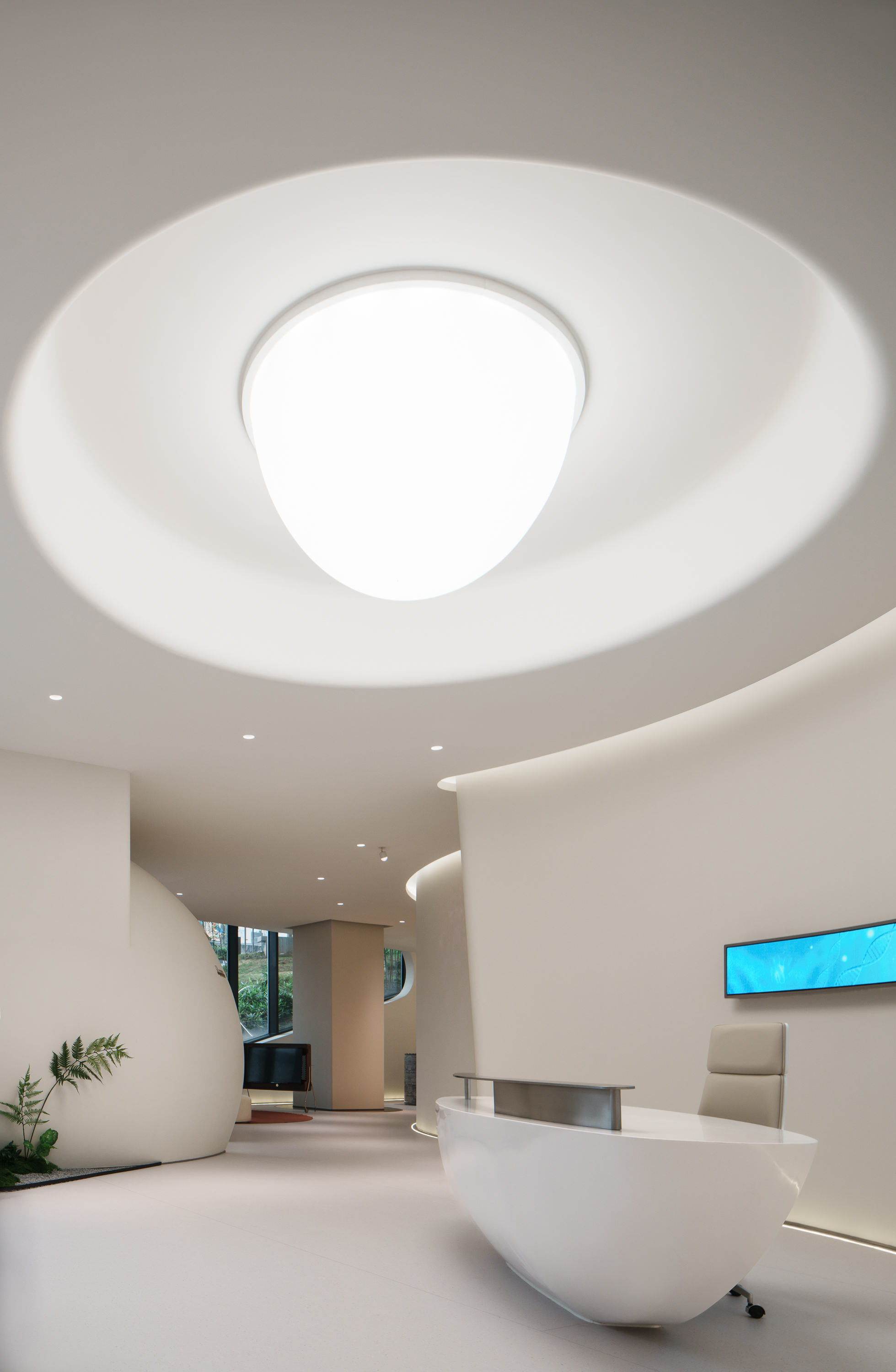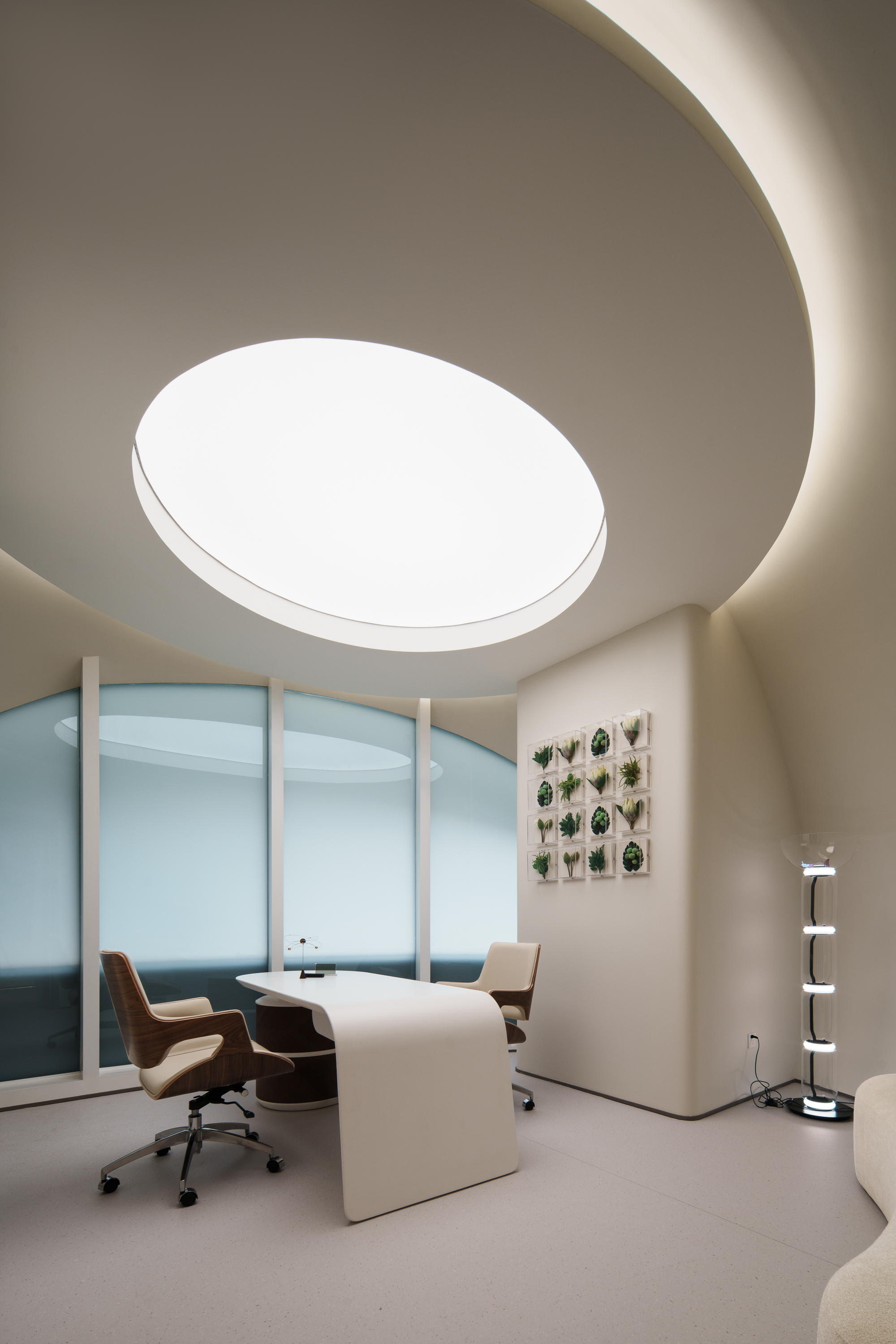 空间意境:步入 CDMO 旗舰店,首先映入眼帘的是其令人惊叹的空间设计。天花板上那独特的圆形天窗,如同天空之眼,洒下柔和而自然的光线,为整个空间营造出一种空灵且通透的氛围。大面积的白色调为主旋律,搭配简洁流畅的线条,无论是弧形的墙壁还是波浪般的隔断,都展现出一种现代艺术的美感。这种设计不仅是视觉上的享受,更在功能上实现了空间的合理划分。