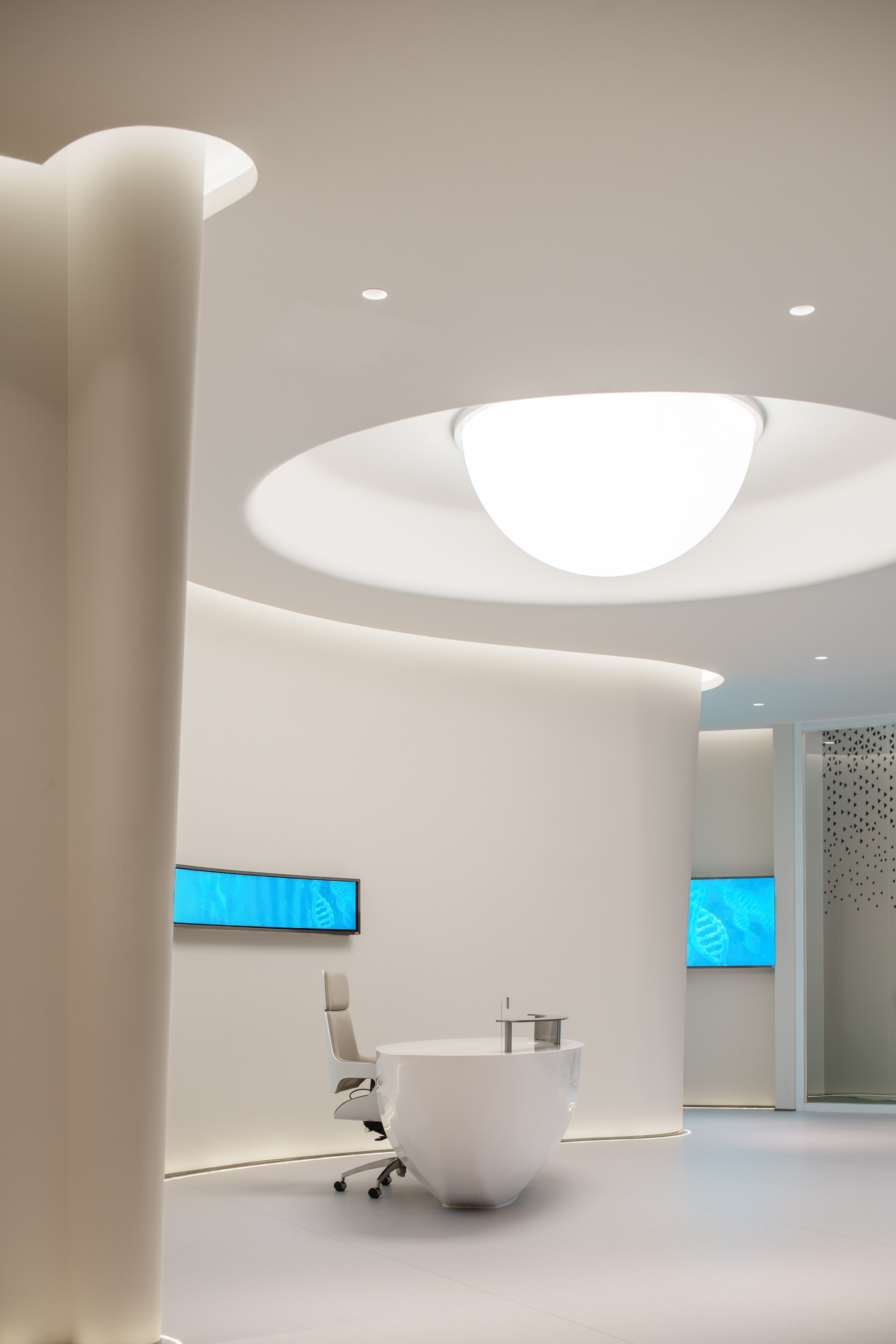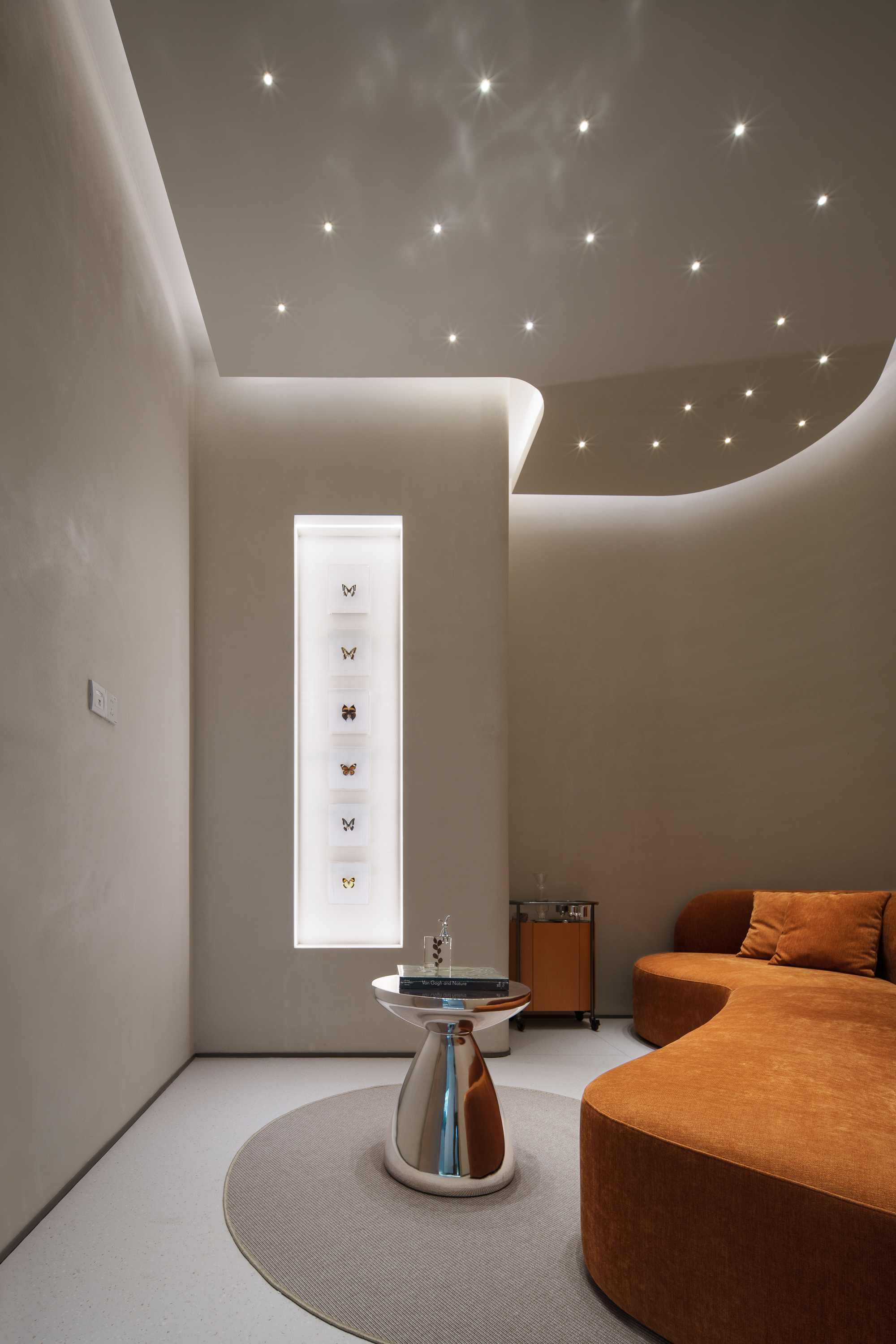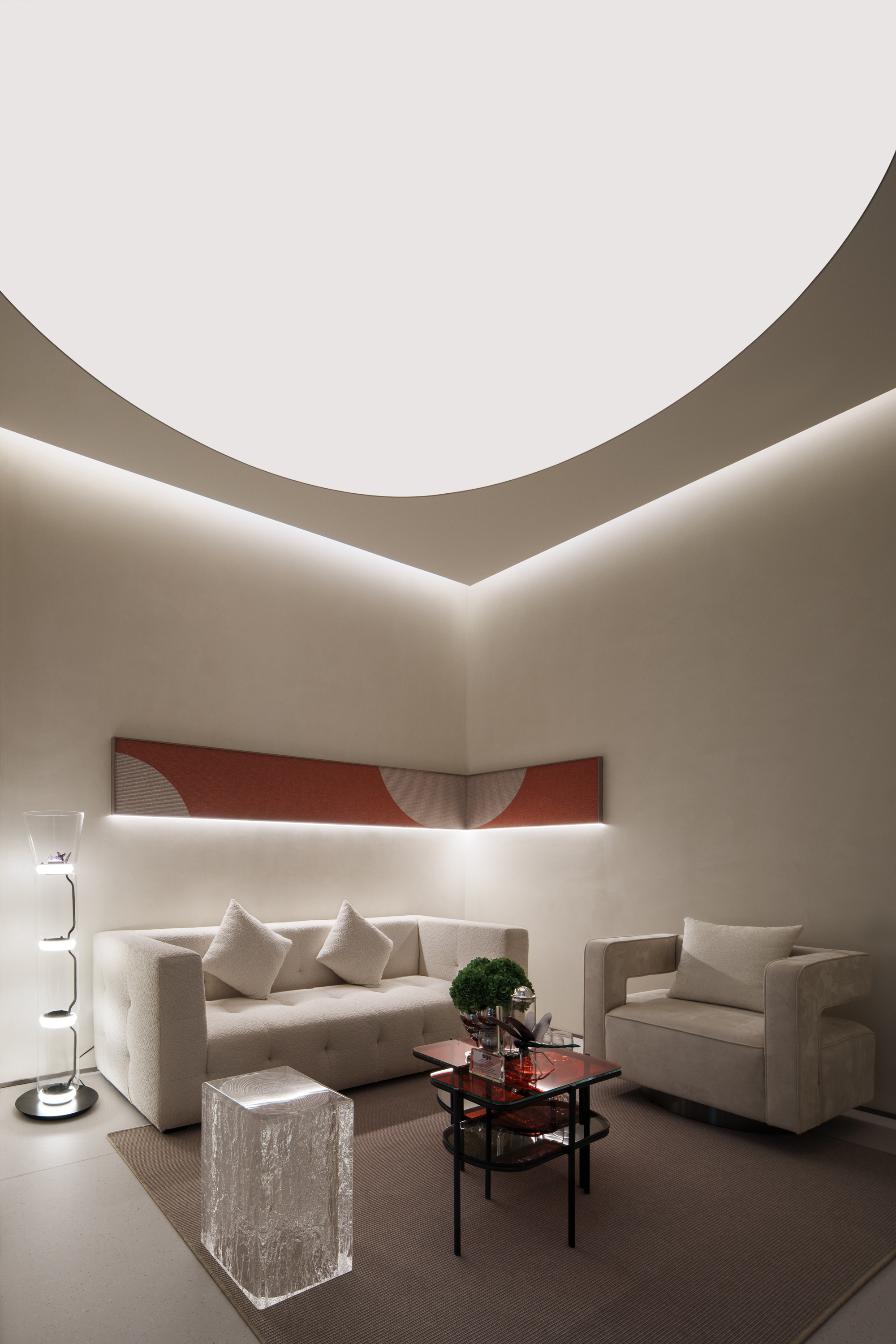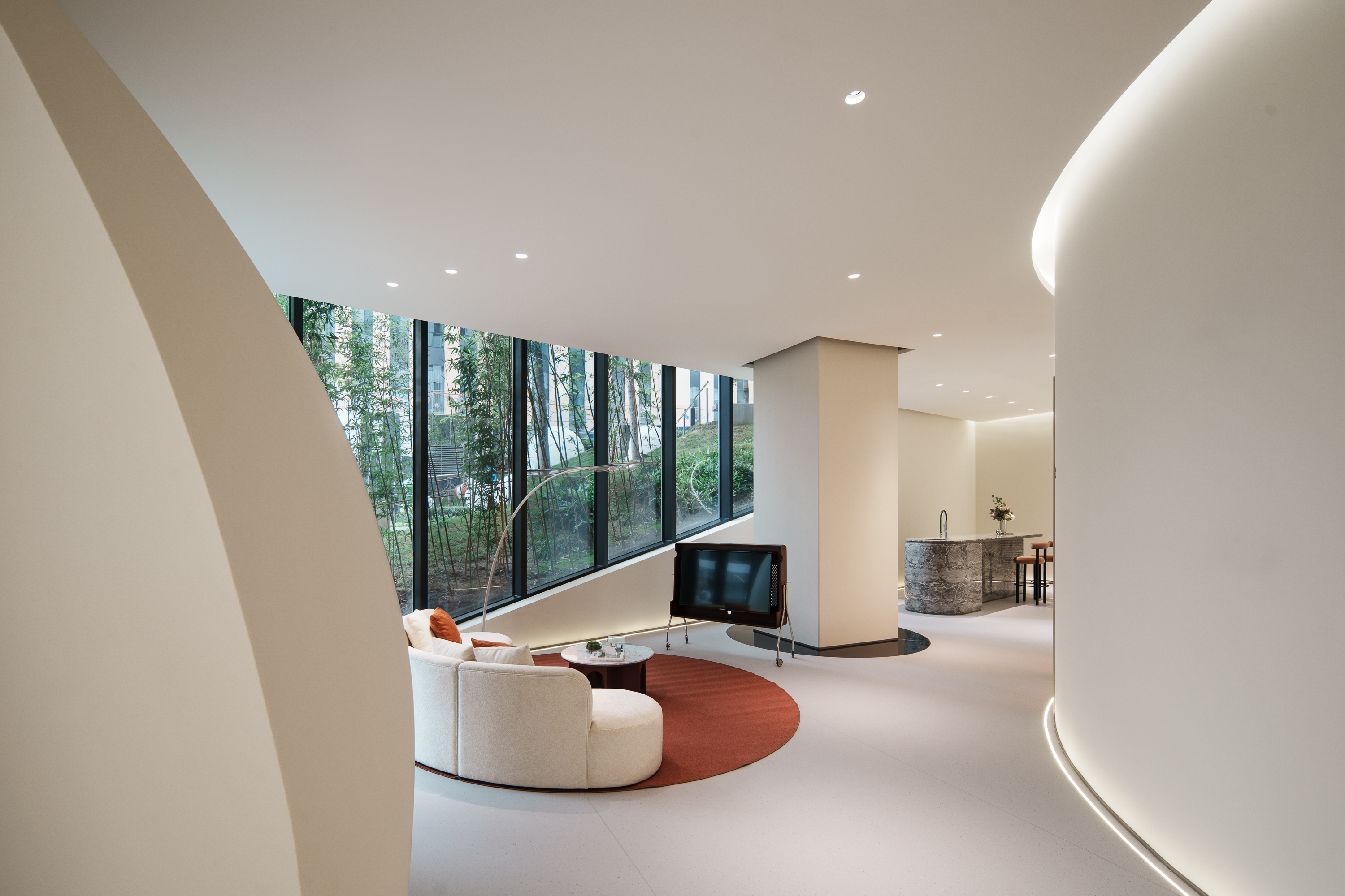 空间意境:步入 CDMO 旗舰店,首先映入眼帘的是其令人惊叹的空间设计。天花板上那独特的圆形天窗,如同天空之眼,洒下柔和而自然的光线,为整个空间营造出一种空灵且通透的氛围。大面积的白色调为主旋律,搭配简洁流畅的线条,无论是弧形的墙壁还是波浪般的隔断,都展现出一种现代艺术的美感。这种设计不仅是视觉上的享受,更在功能上实现了空间的合理划分。