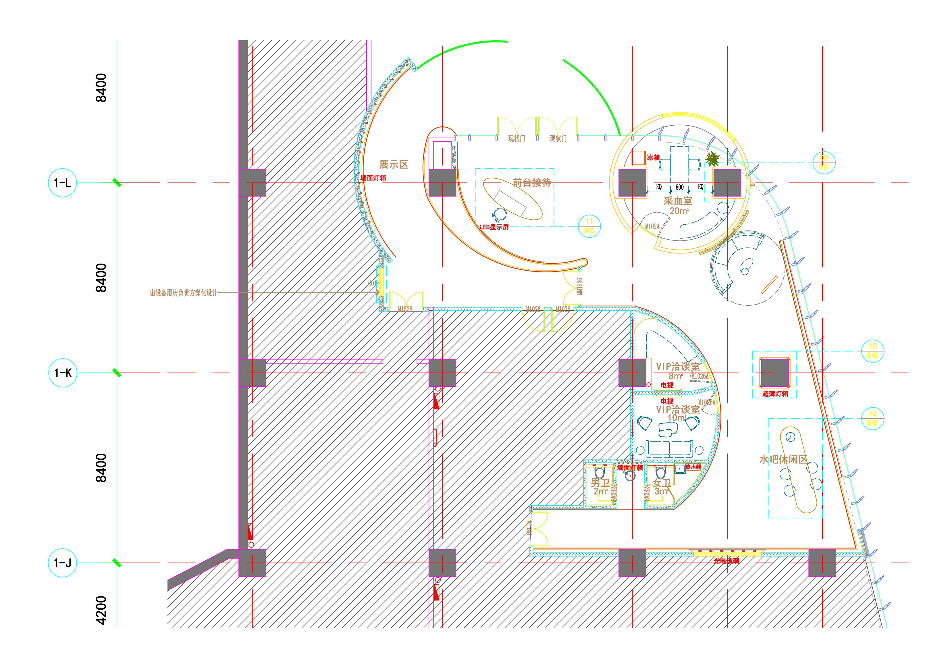 创新描述:天花板采用了独特的圆形天窗设计,将自然光线引入市内减少了对人工照明的依赖降低能耗,使得店内的光线更加柔和、均匀,提升了顾客的视觉舒适度。同时,圆形天窗本身也成为了空间中的一个视觉焦点,增加了空间的层次感。