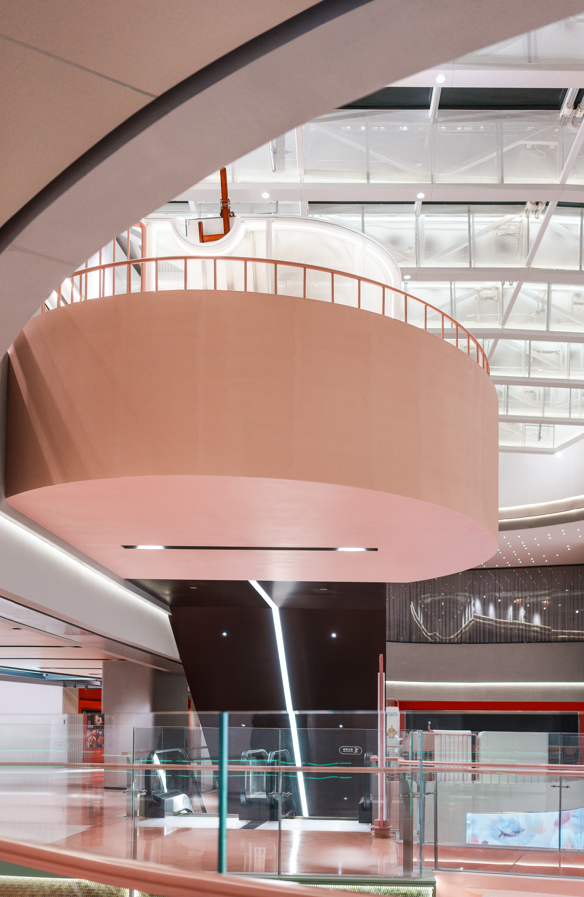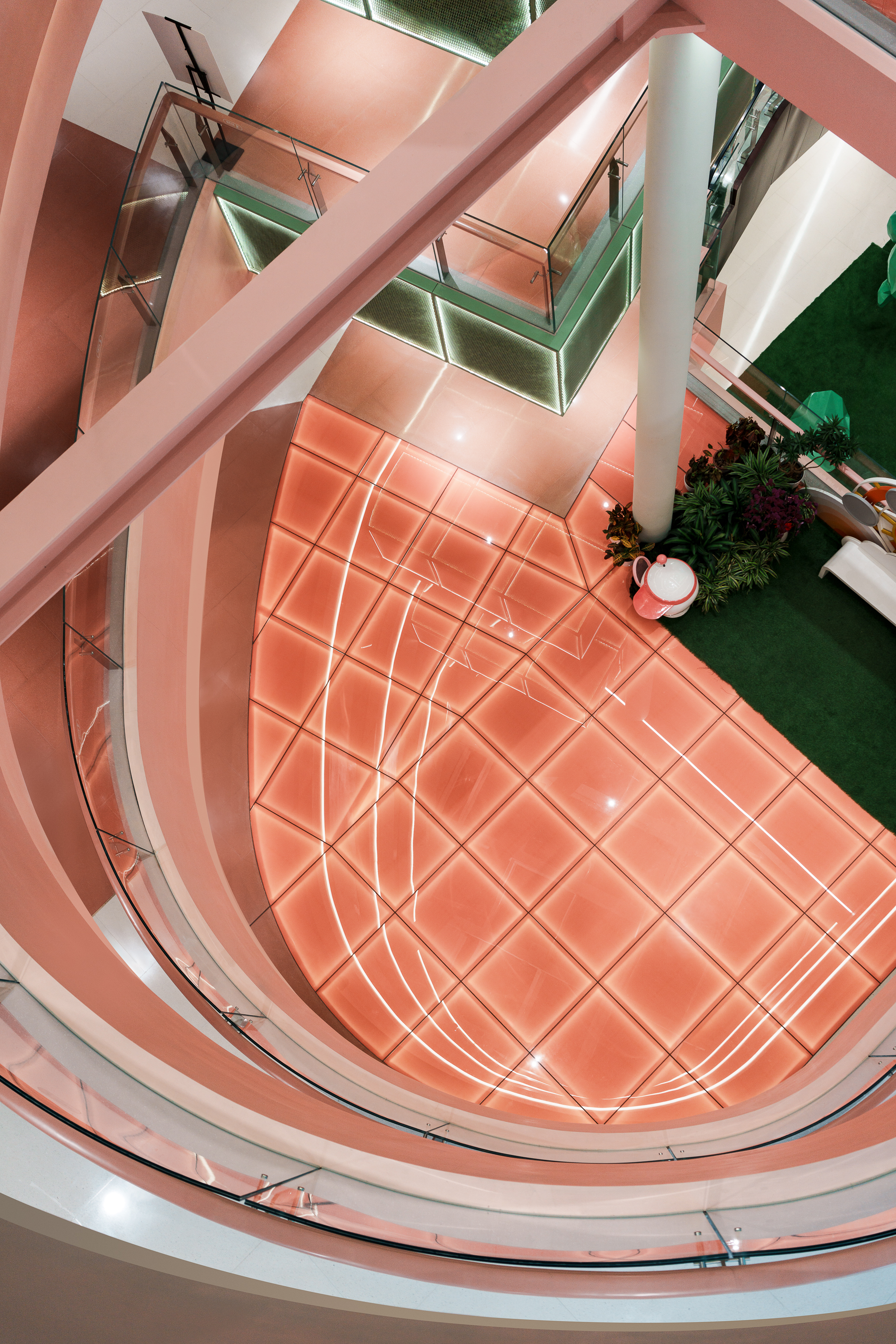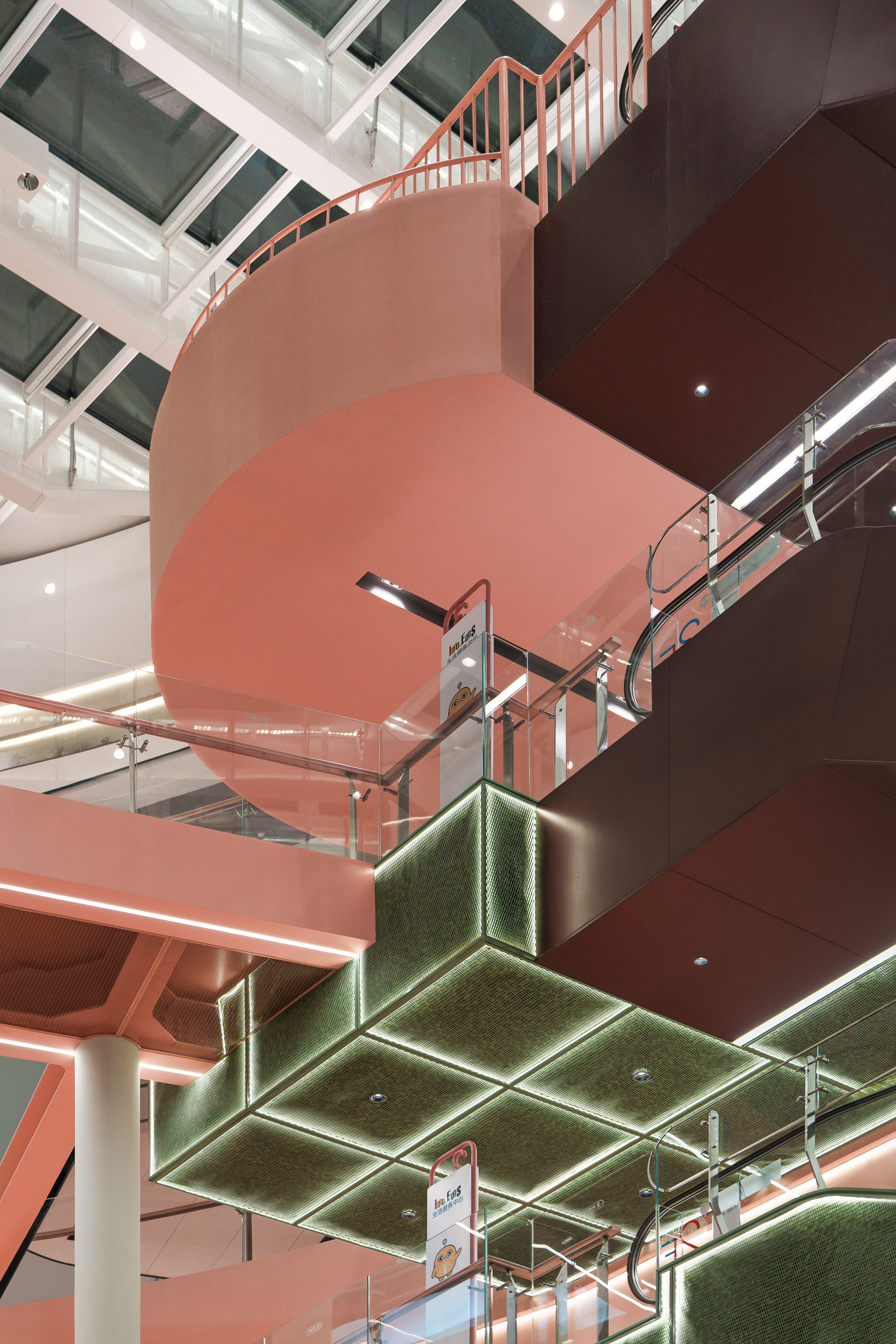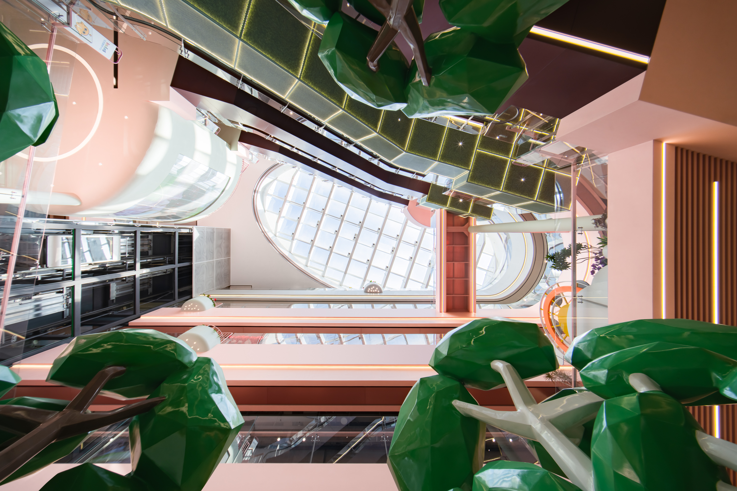 空间布局:走进这片空间,就会被一个圆形的粉色结构所吸引。这不是简单的装饰,而是一个独特的观景台和交通核,仿佛漂浮在空中的梦幻岛屿。中庭是“多巴胺”乐园的核心区域,我们围绕中庭设计了“悬浮绿洲”、“蓝色溶洞”、“粉色梯田”等不同主题的风格休息区。这些区域不仅为顾客提供了多样化的休息空间,还增添了趣味性和互动性,使人们在购物和休闲的过程中感受到更多的乐趣。