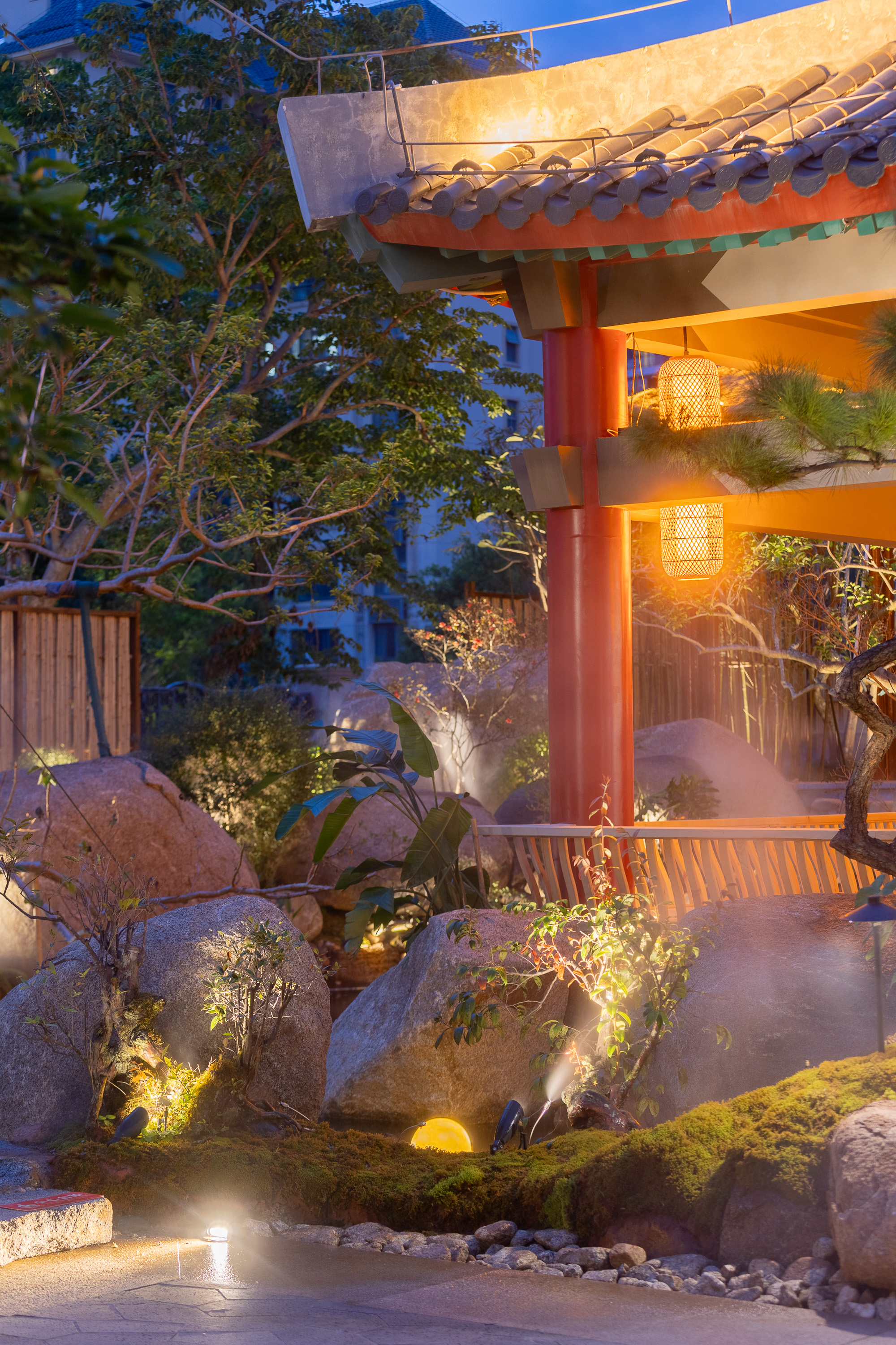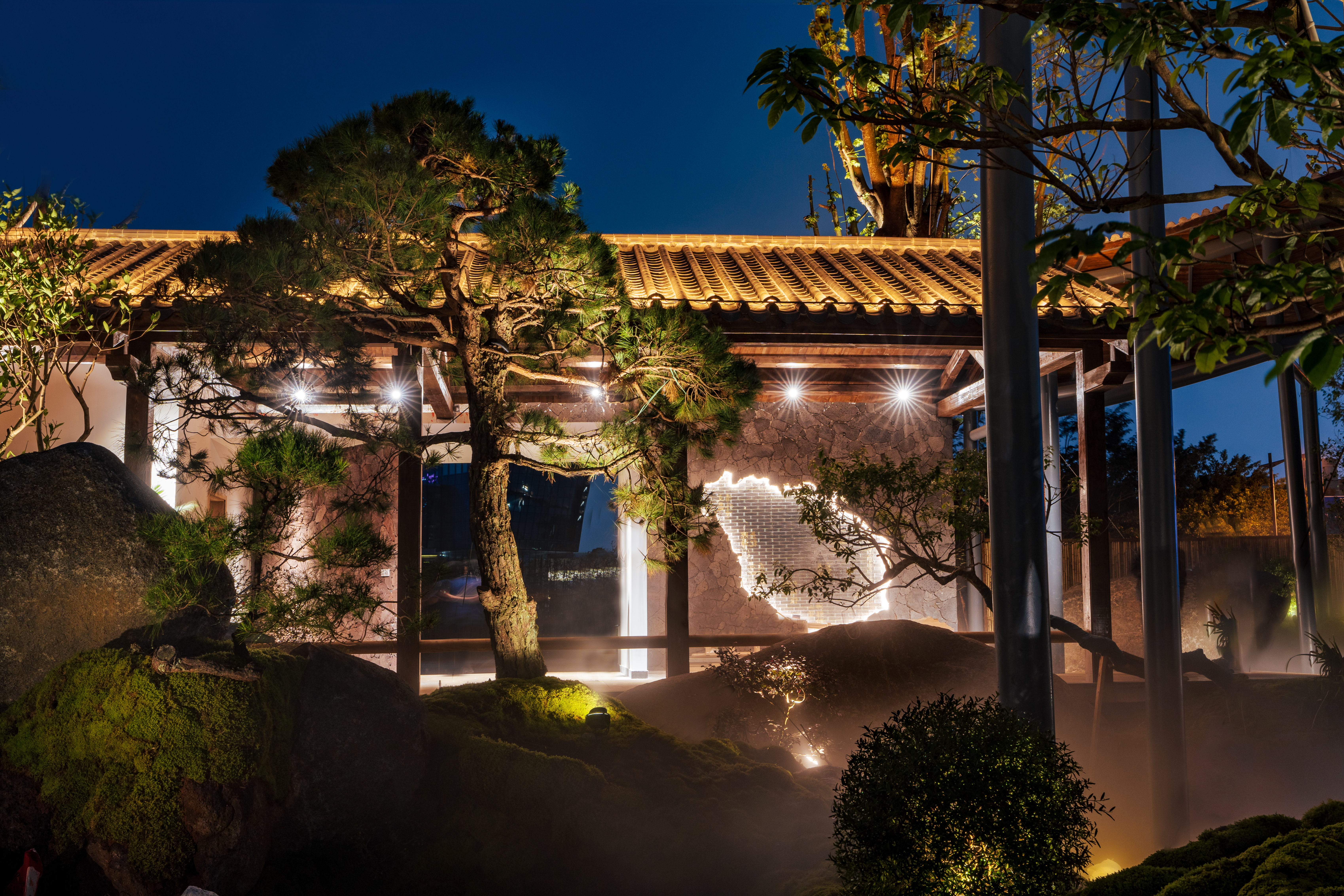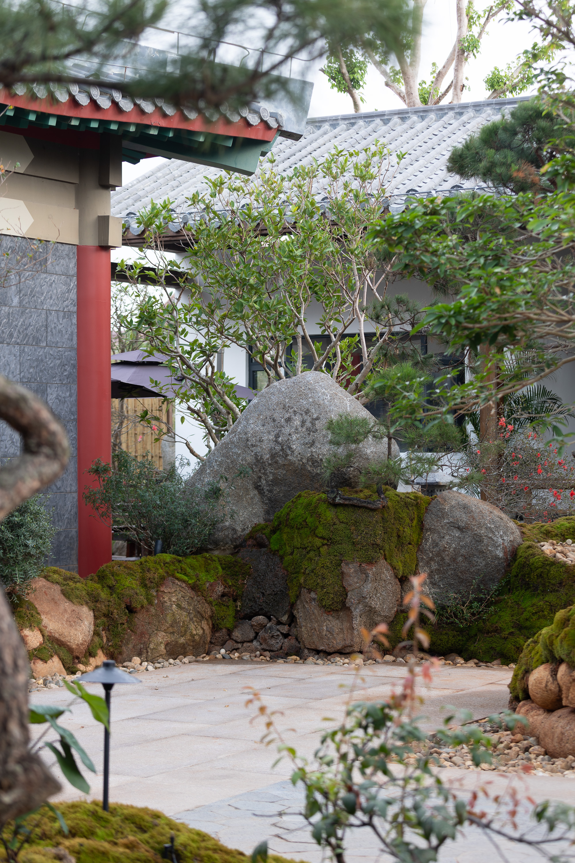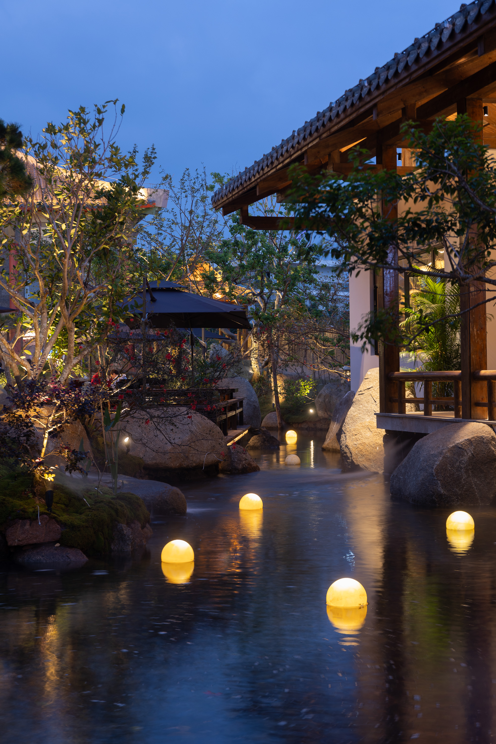 空间布局:以前整个项目是整体平面,都是在一个水平面,我们用园林手法,从进门的位置,我们整体抬高了1米,然后进来以后在慢慢降高度,然后在以园林起伏势的地形,来一步步进入到明档,所以所有消费者进来的时候,是感受很丰富的,也能增加他们在游园或者消费前的这种体验,很多地方我们把石头压在路口的位置,让他进来的时候,要感觉会碰到石头了,身体上面会有扭动的行为,也能让他们直接用身体的触感触摸到,人最直接的感受应该也是触感,有了触感,人的印象就会加深