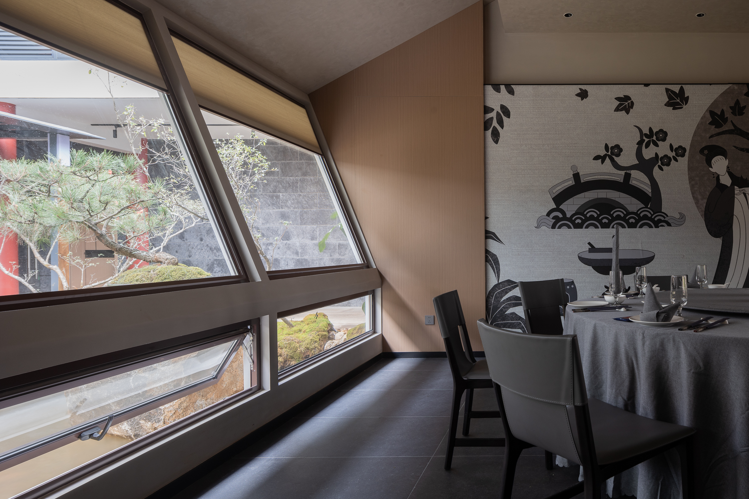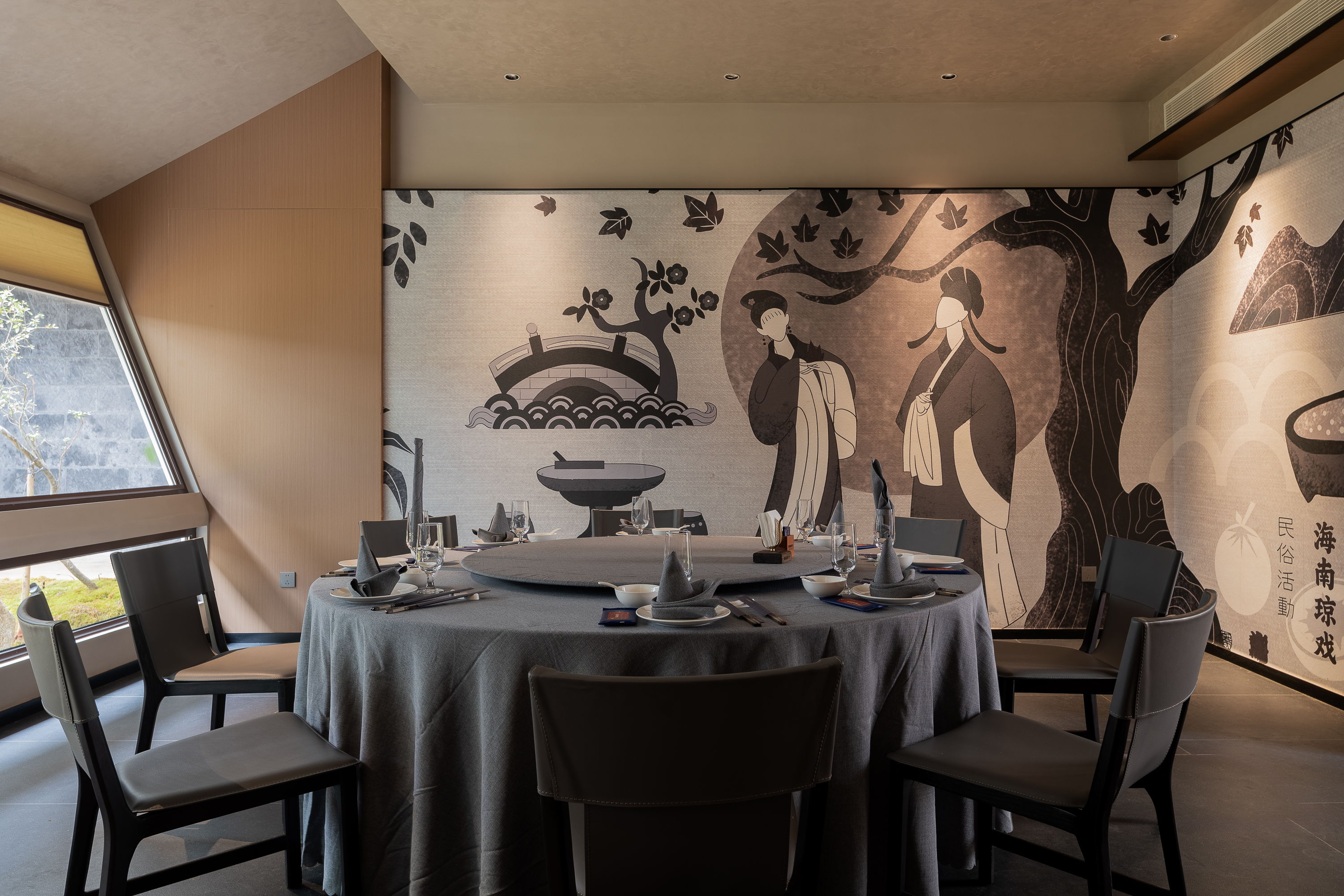 空间意境:整体的建筑形式,因为原本就是中式,有点以前辽代宋初的感受,我们做的时候,第一用了西方的建筑思路,包括采用了 矩形、三角形、圆形的西方建筑思维,来打造整个空间,第二我们加入了园林的手法,以遮、挡、绕、感的园林方式,让客户在有限空间能感知到无限的空间感受