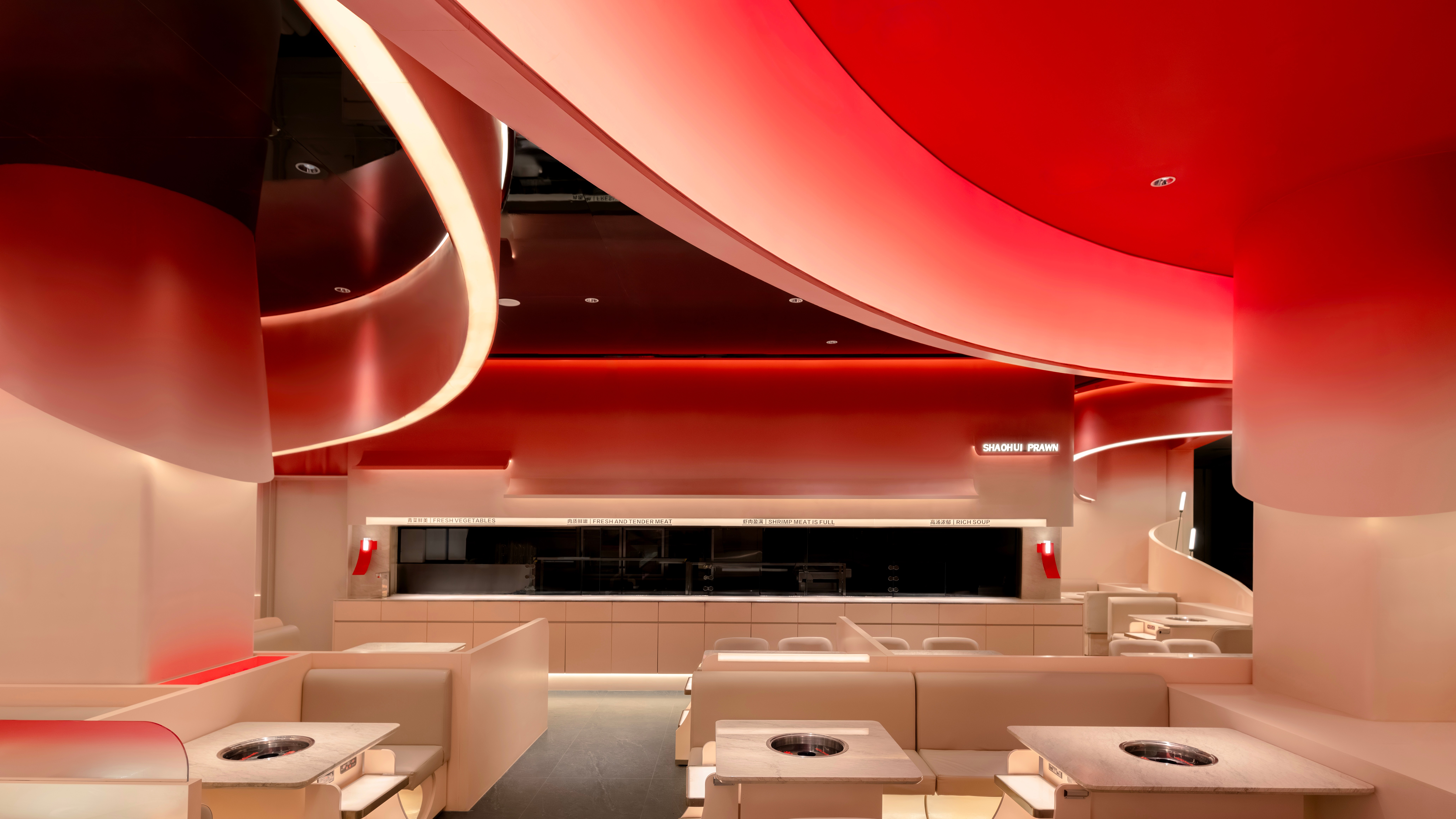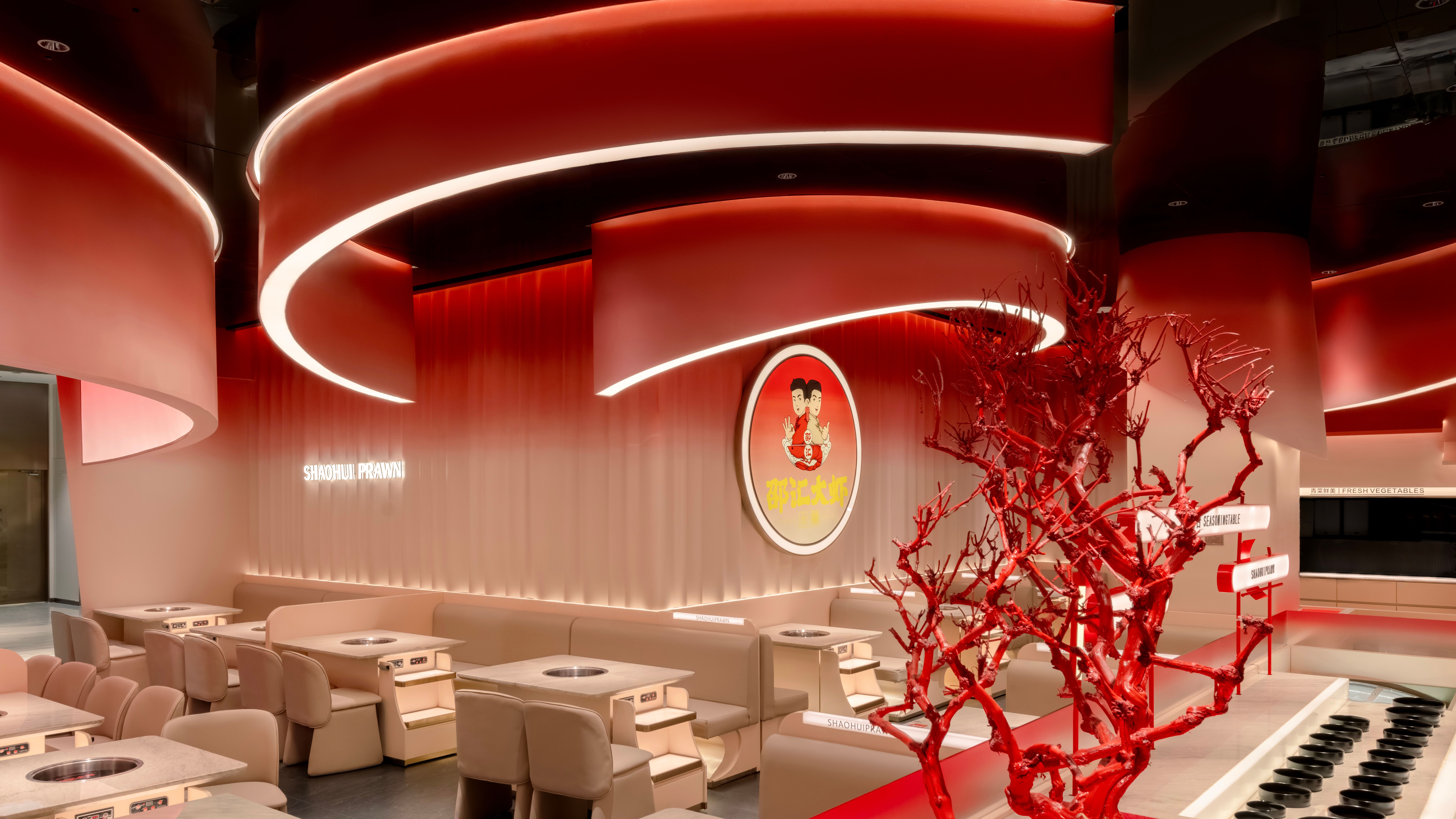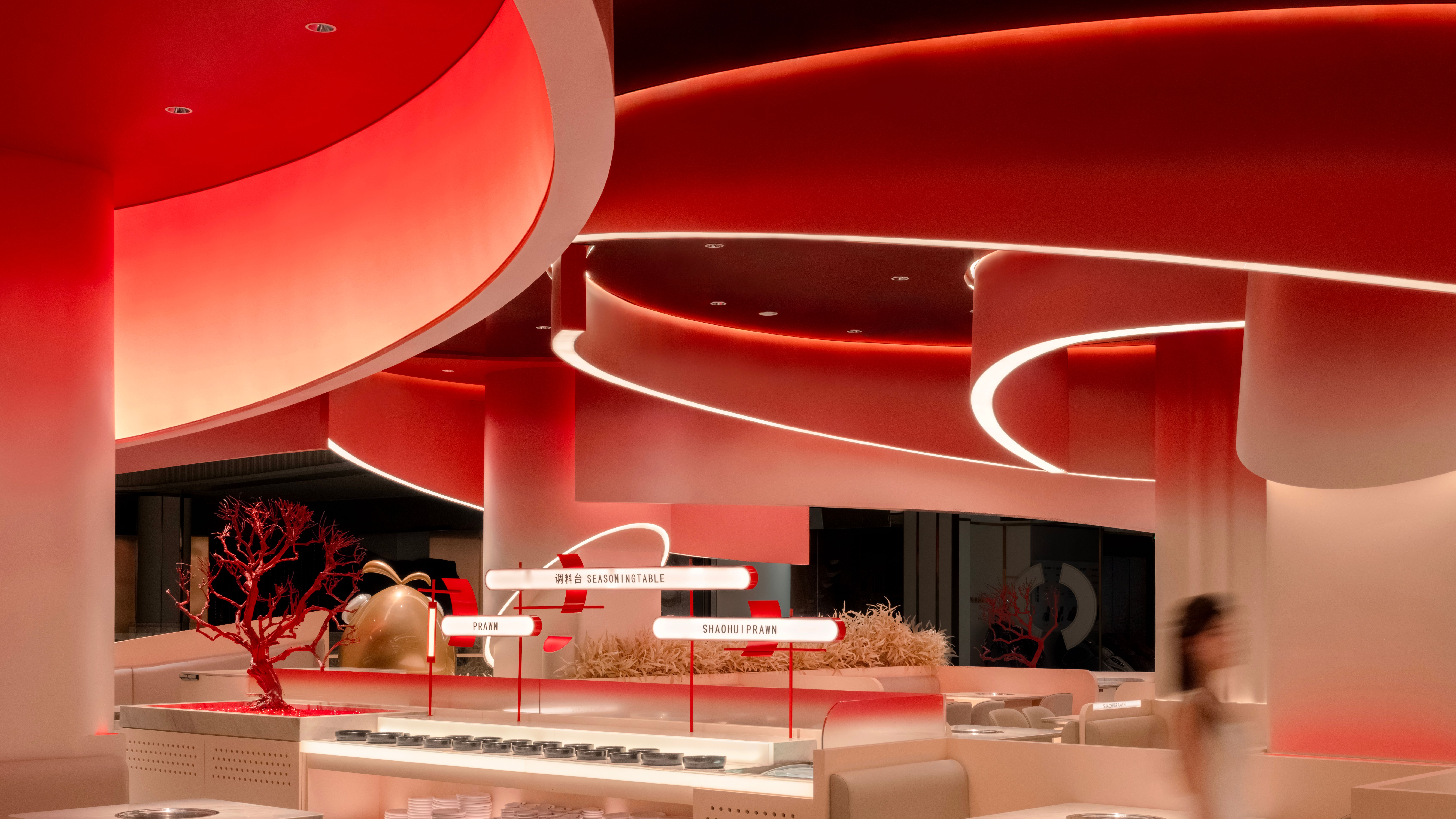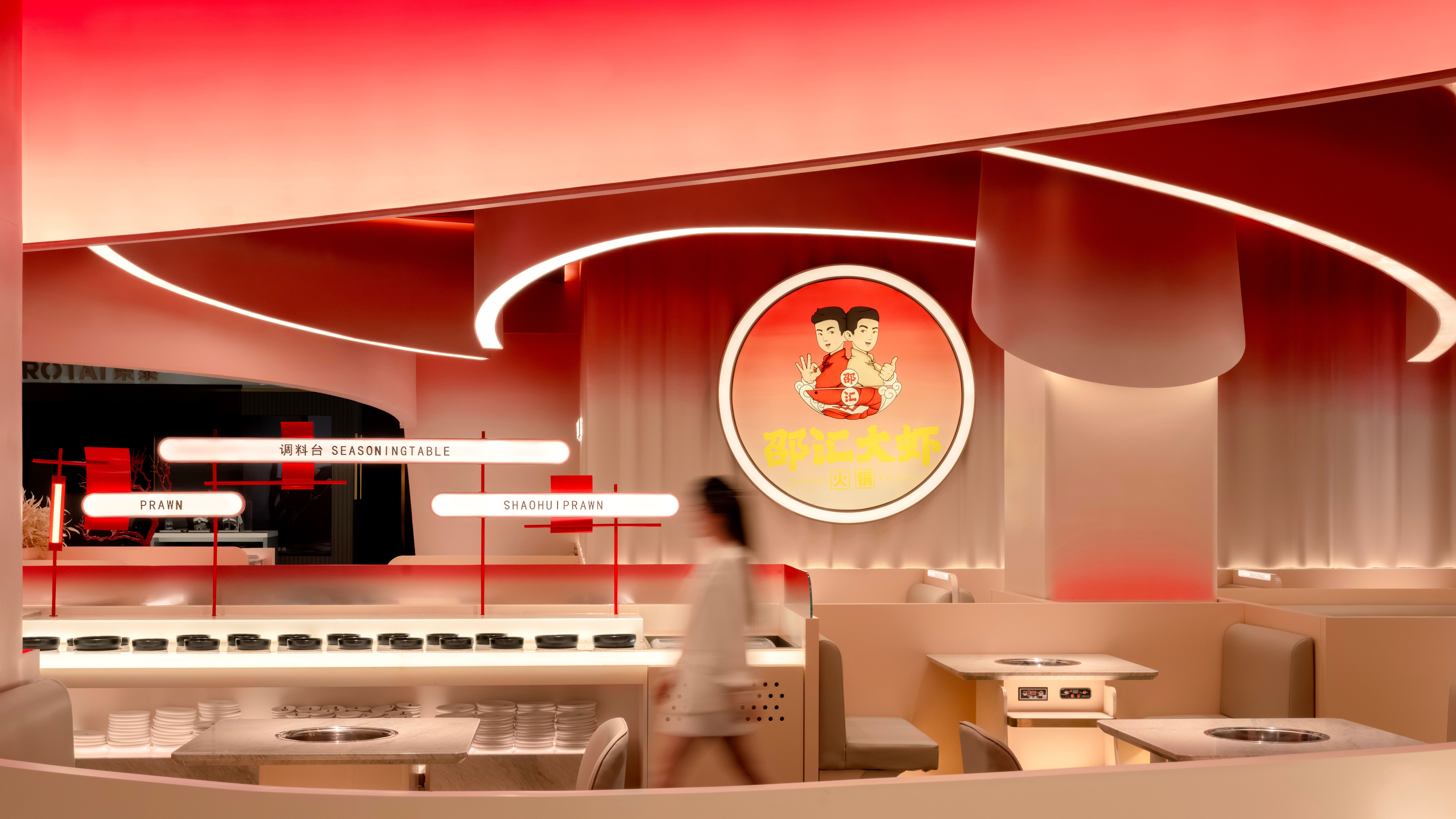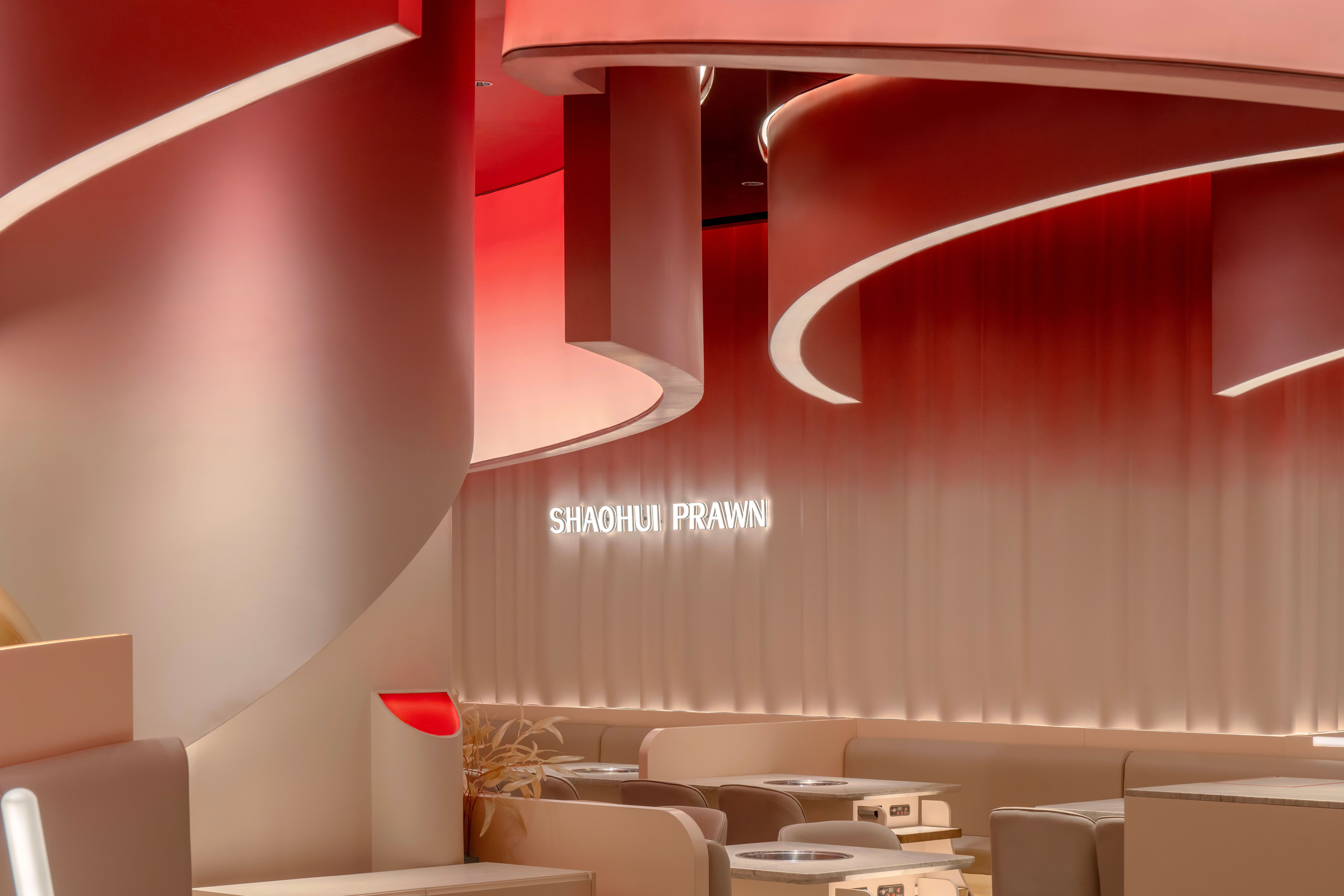 虾红色,是时尚色,是活力与热情,是蛋白质加热后的状态。但是邵汇大虾的红终究不同,来自虾壳透明,由深到浅,渐变的层次感,是虾烹制成熟泛出的诱人色泽,在这里,他注入了满满的食色诱惑,令空间更红。