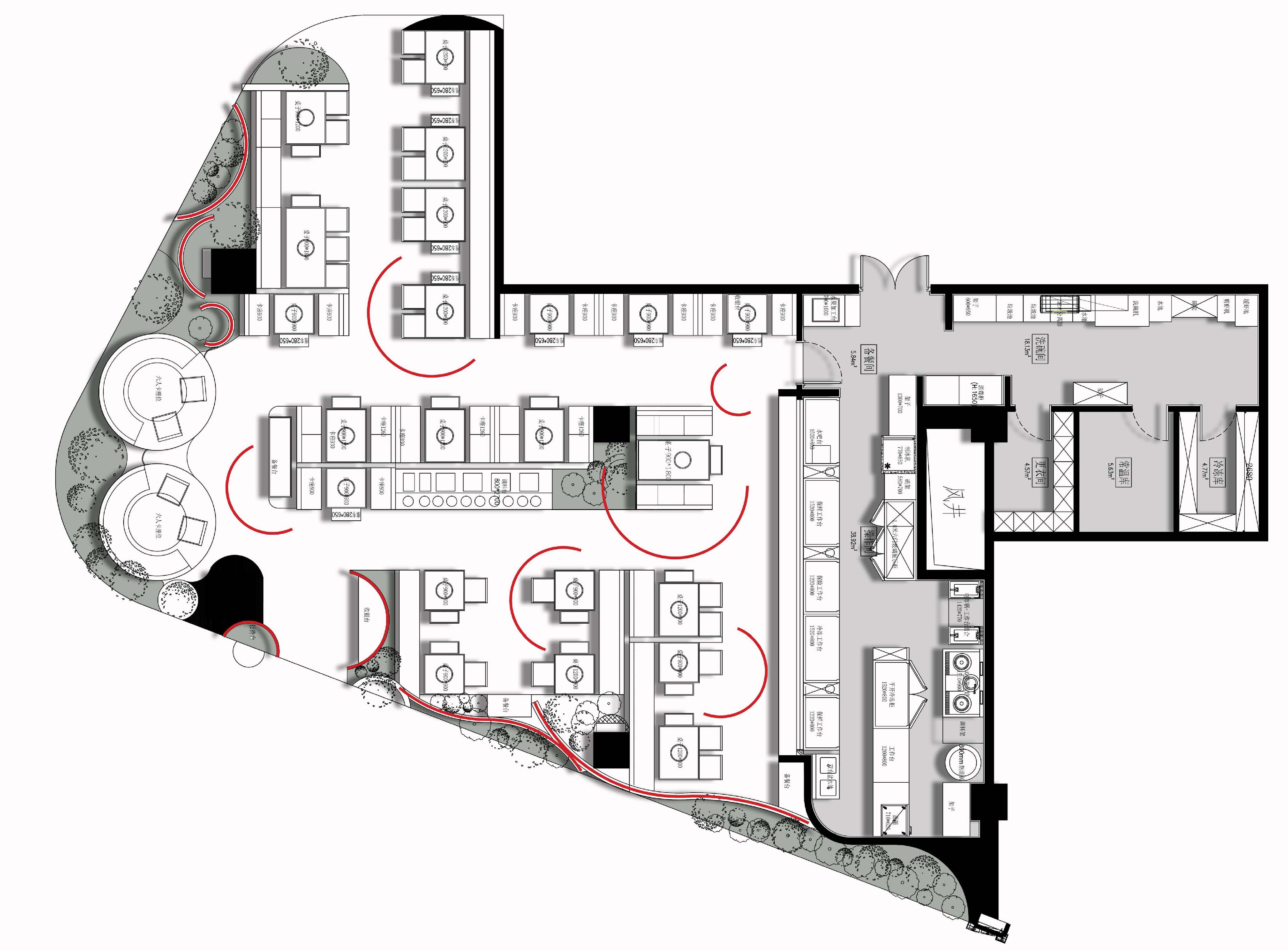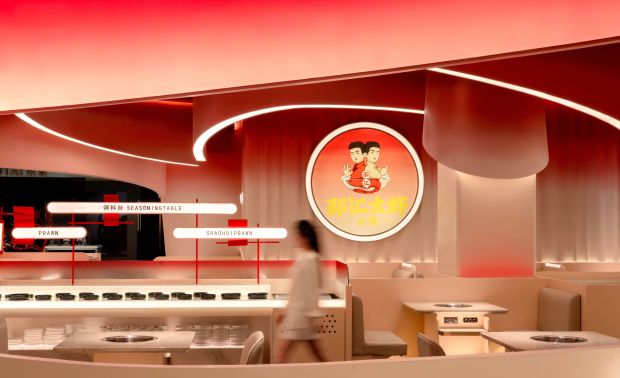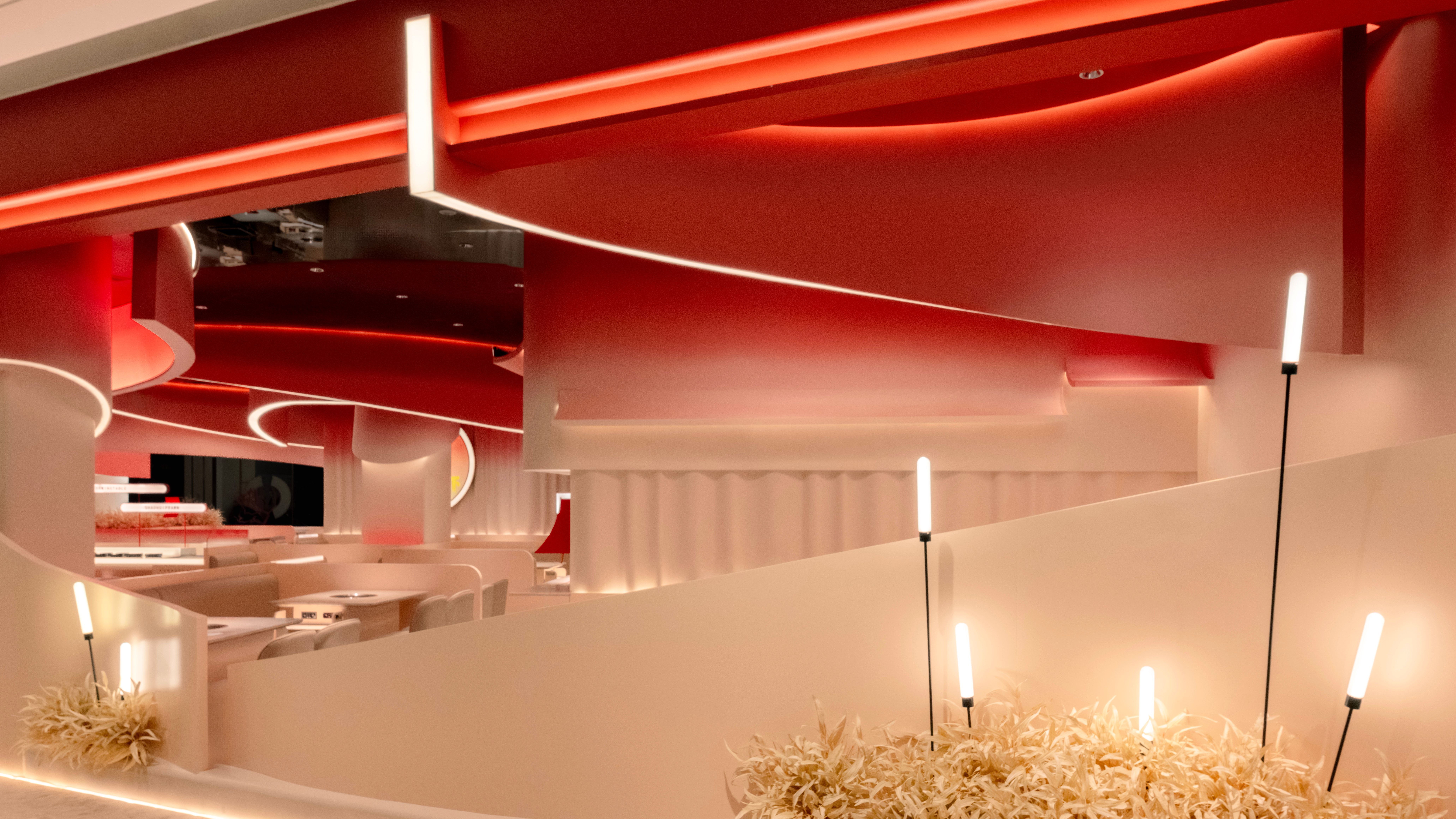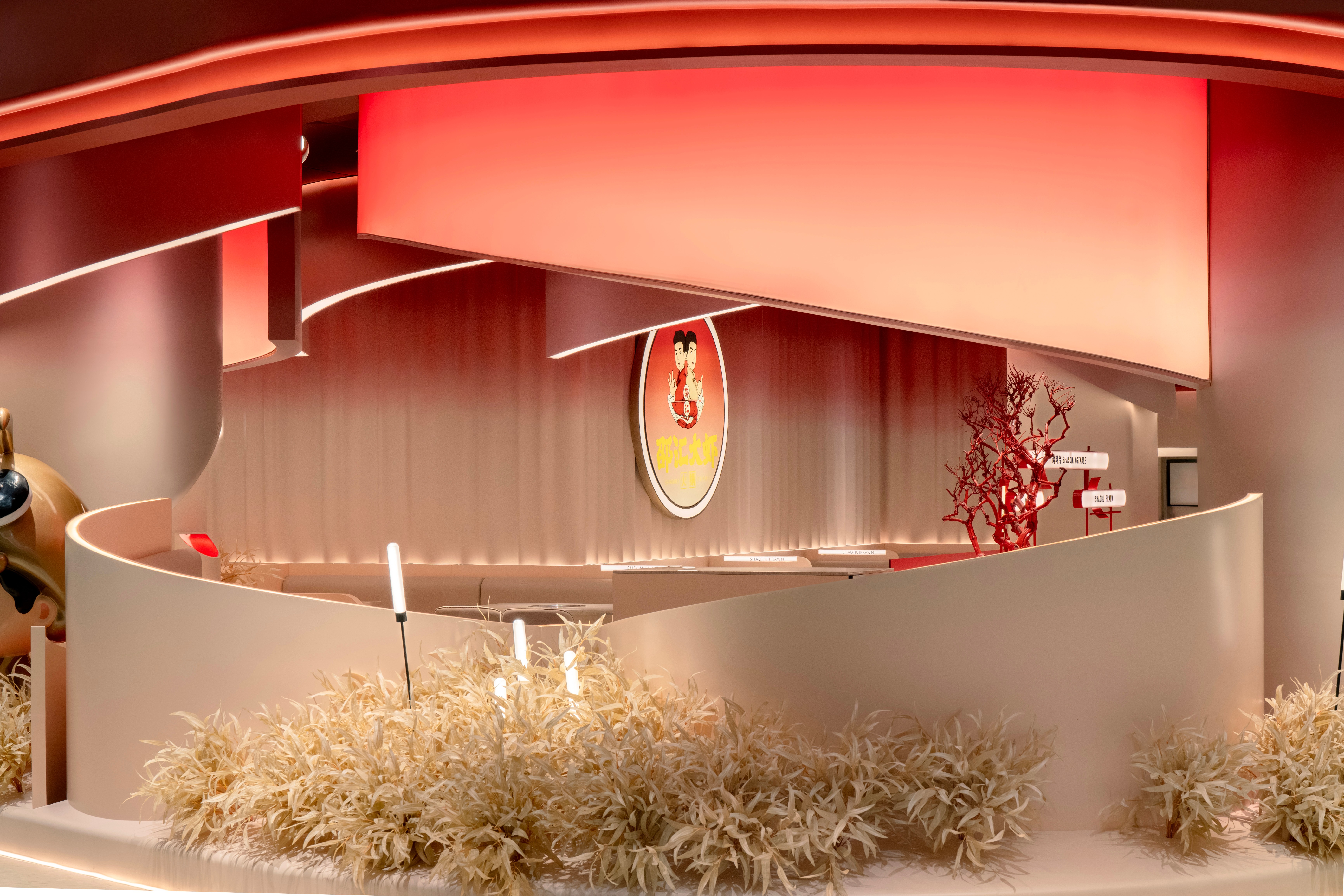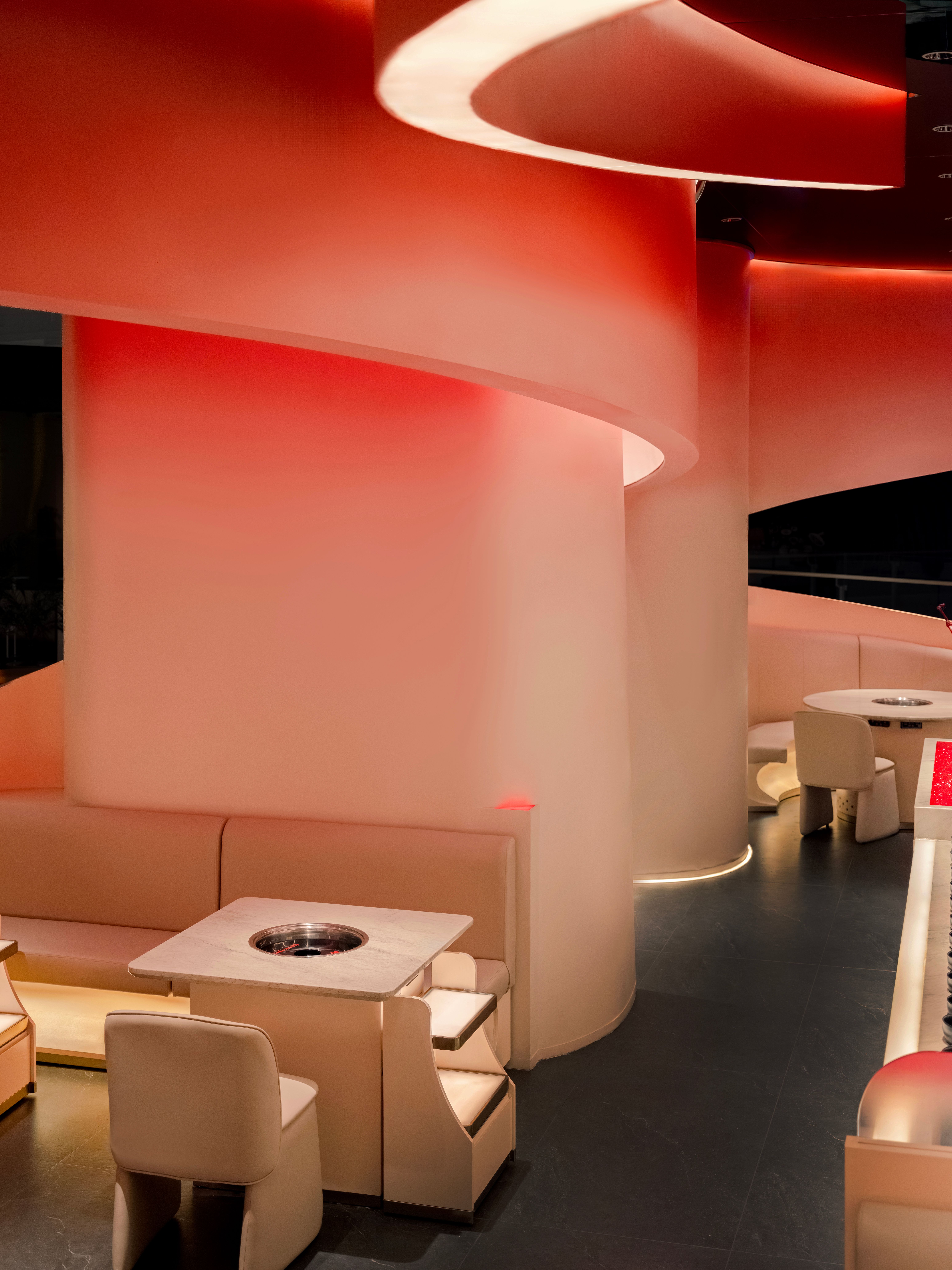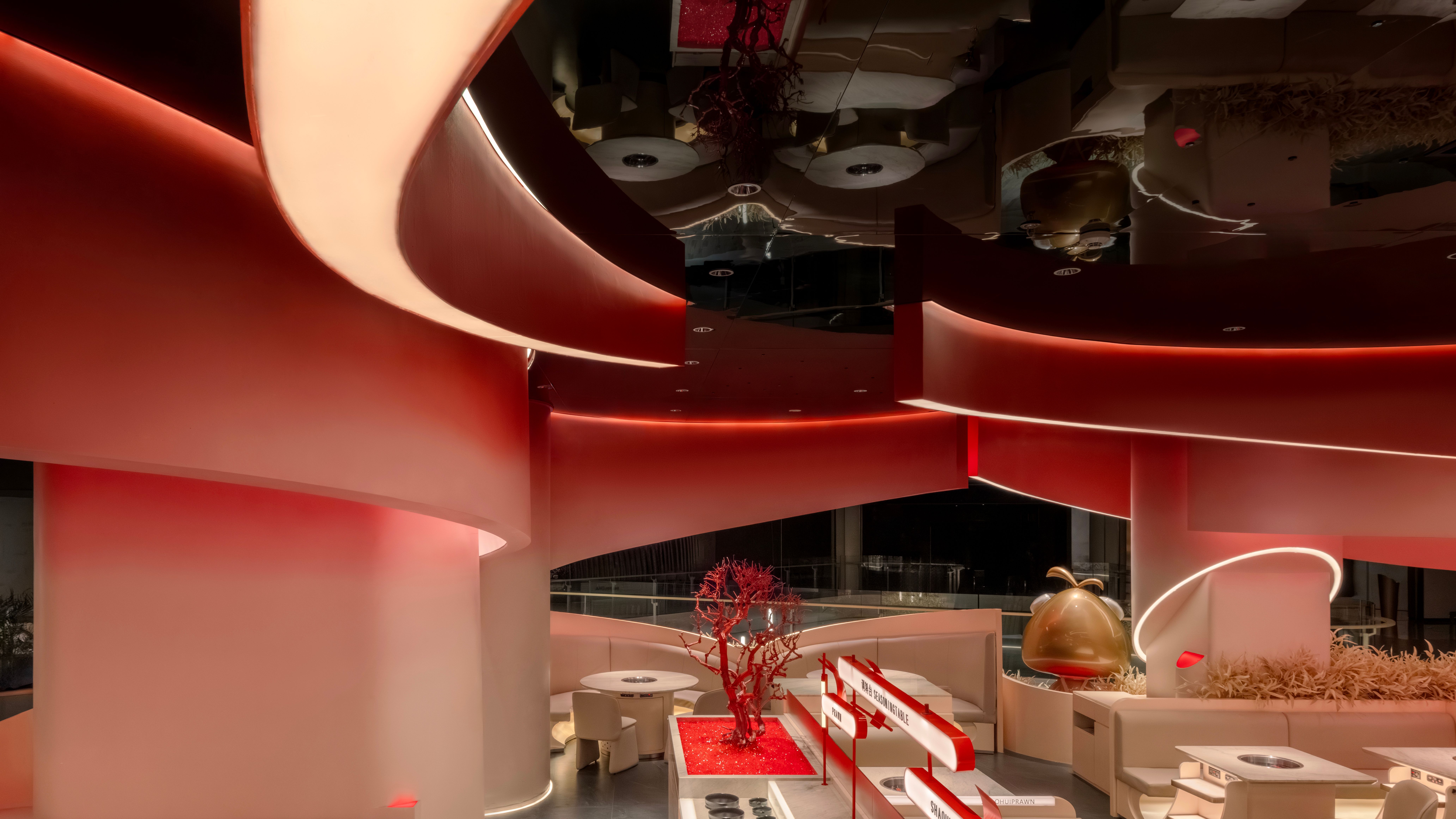 虾红色,是时尚色,是活力与热情,是蛋白质加热后的状态。但是邵汇大虾的红终究不同,来自虾壳透明,由深到浅,渐变的层次感,是虾烹制成熟泛出的诱人色泽,在这里,他注入了满满的食色诱惑,令空间更红。