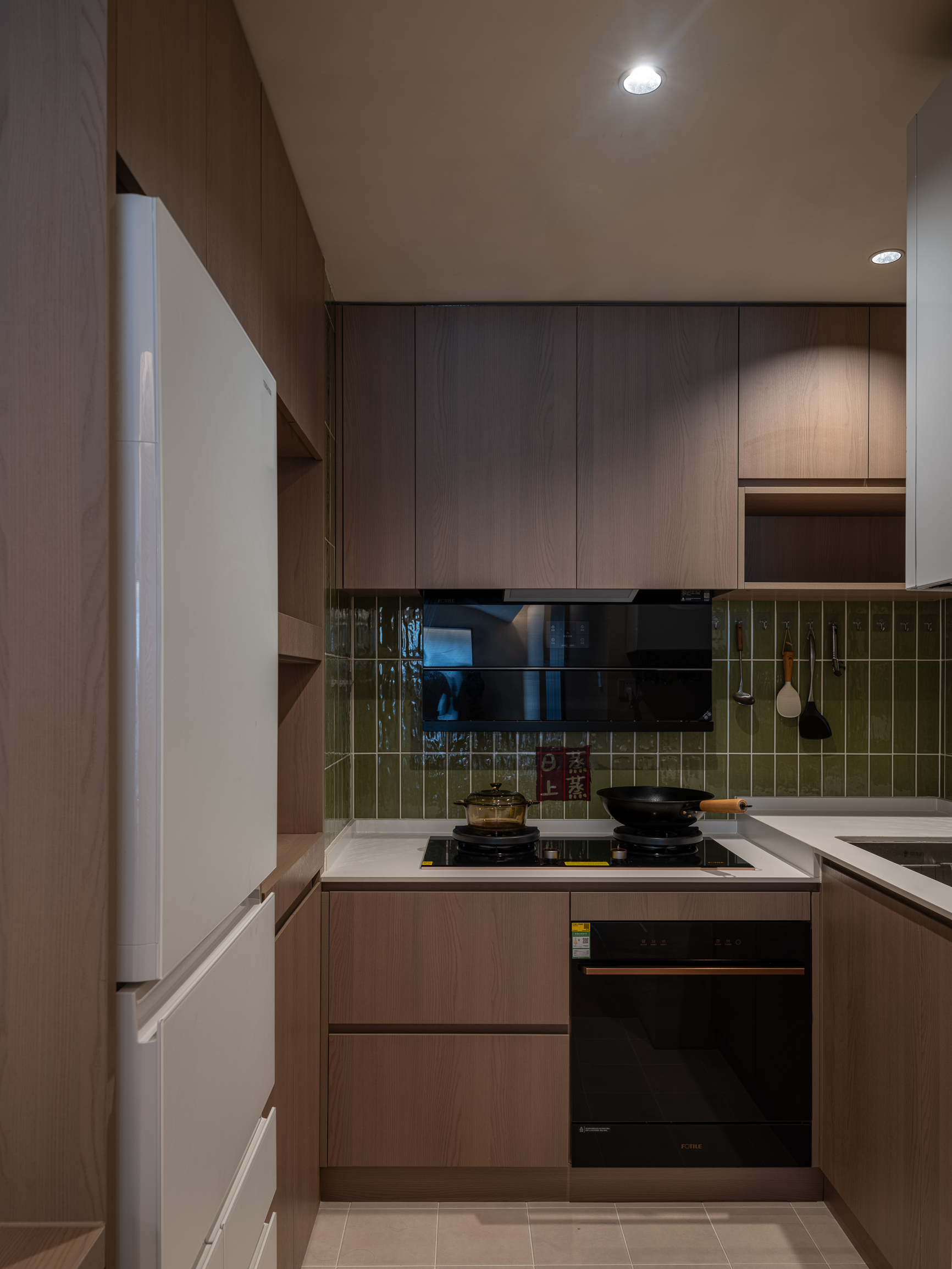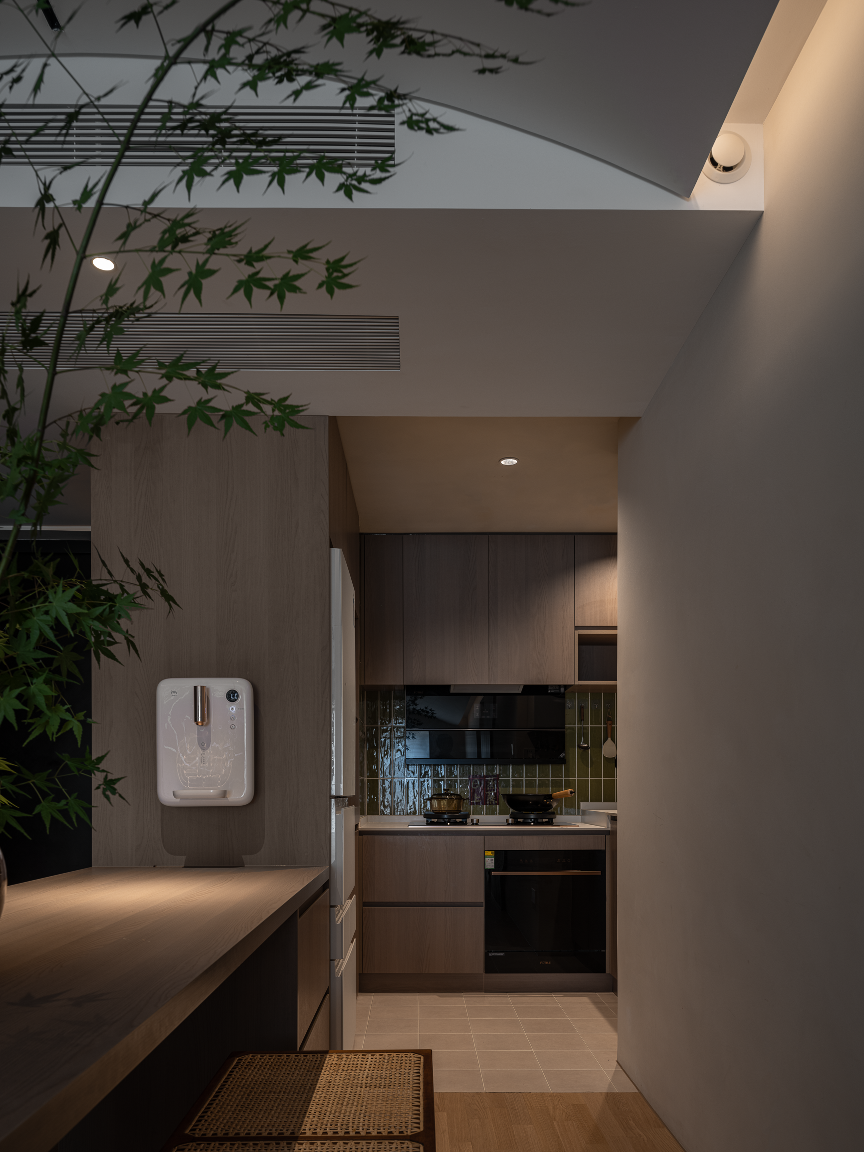 厨房里,墨绿色艺术砖显现出灵动光泽,透露着复古优雅气息,撬动了美学点缀的真趣。开放式设计,让爱与美食的气息自由流淌,家人间的互动更加亲密无间。