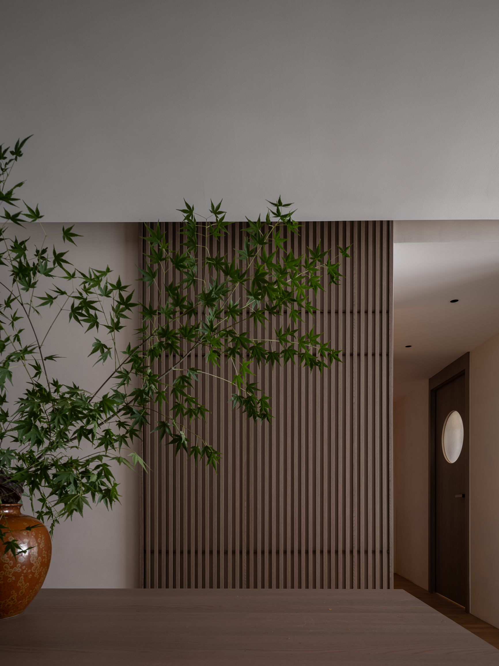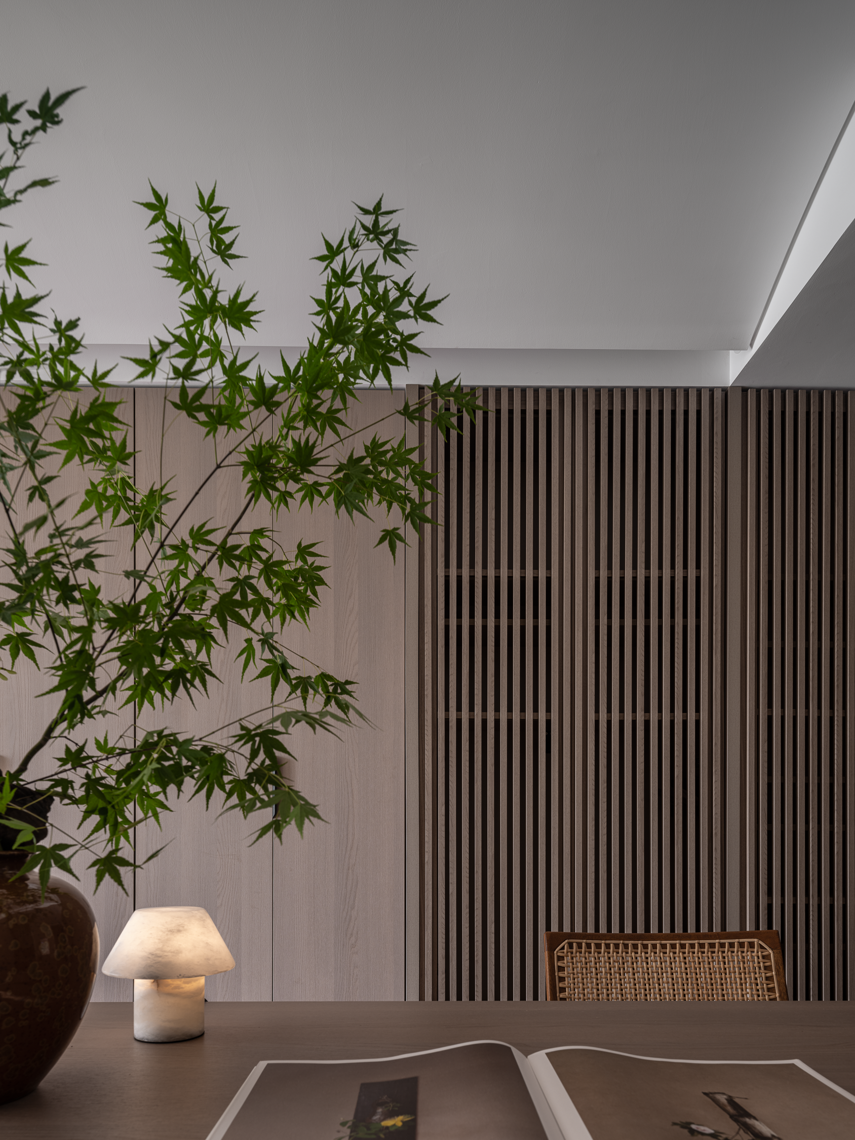 餐厅区域,木格栅柜门以其独特的纹理和光影效果,为用餐时光增添了几分雅致。木纹餐桌与斑驳的枫叶,勾勒出一副自然惬意的景象。