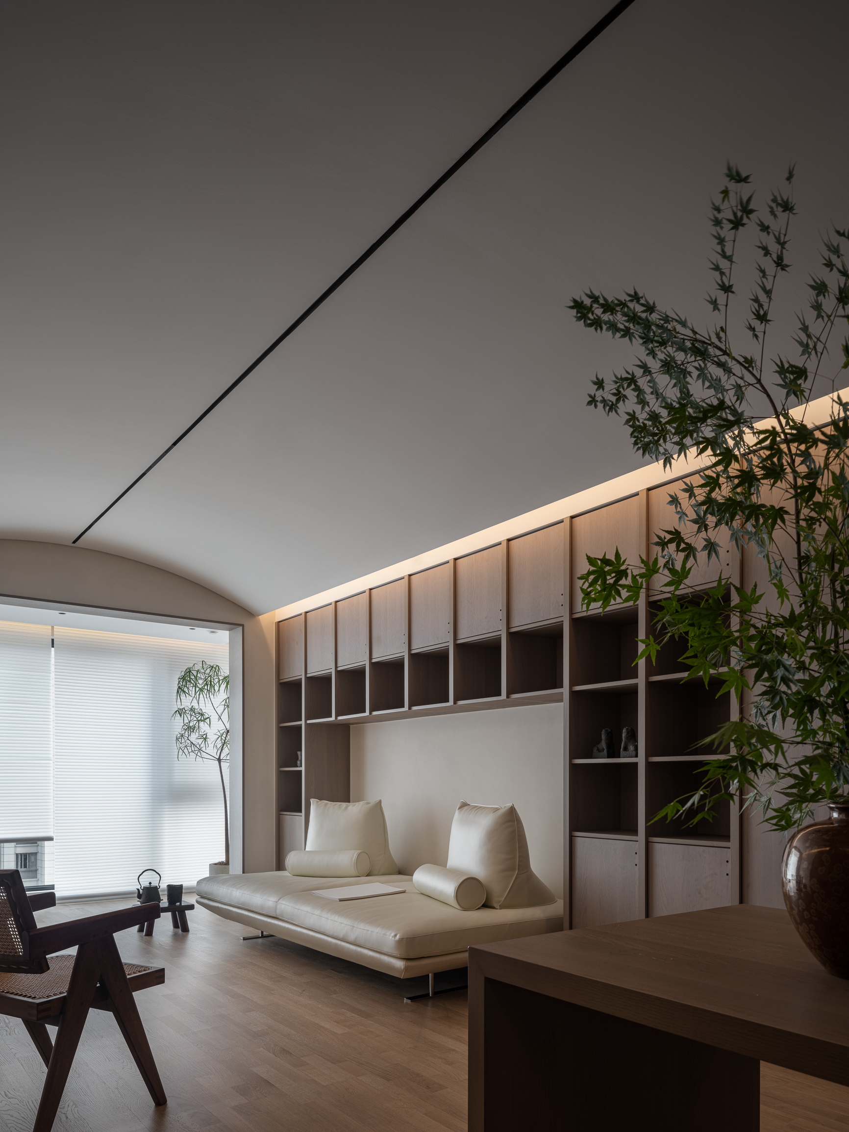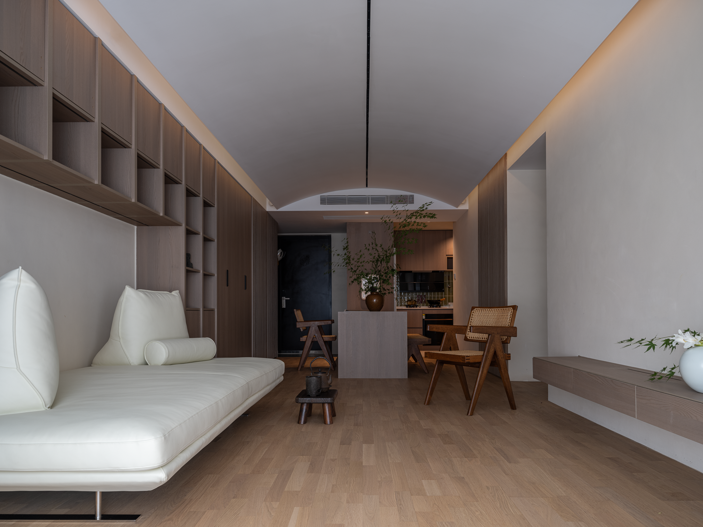 弧形天花板拓宽视觉边界,引领着空间的美学韵律。线条简洁的储物系统,以木质温润的触感,为家增添一抹自然与和谐。而居于中心白色Prado沙发,营造出写意般的舒适氛围,随时可以慵懒地“瘫倒”,悠然小憩,找到最自在的状态。