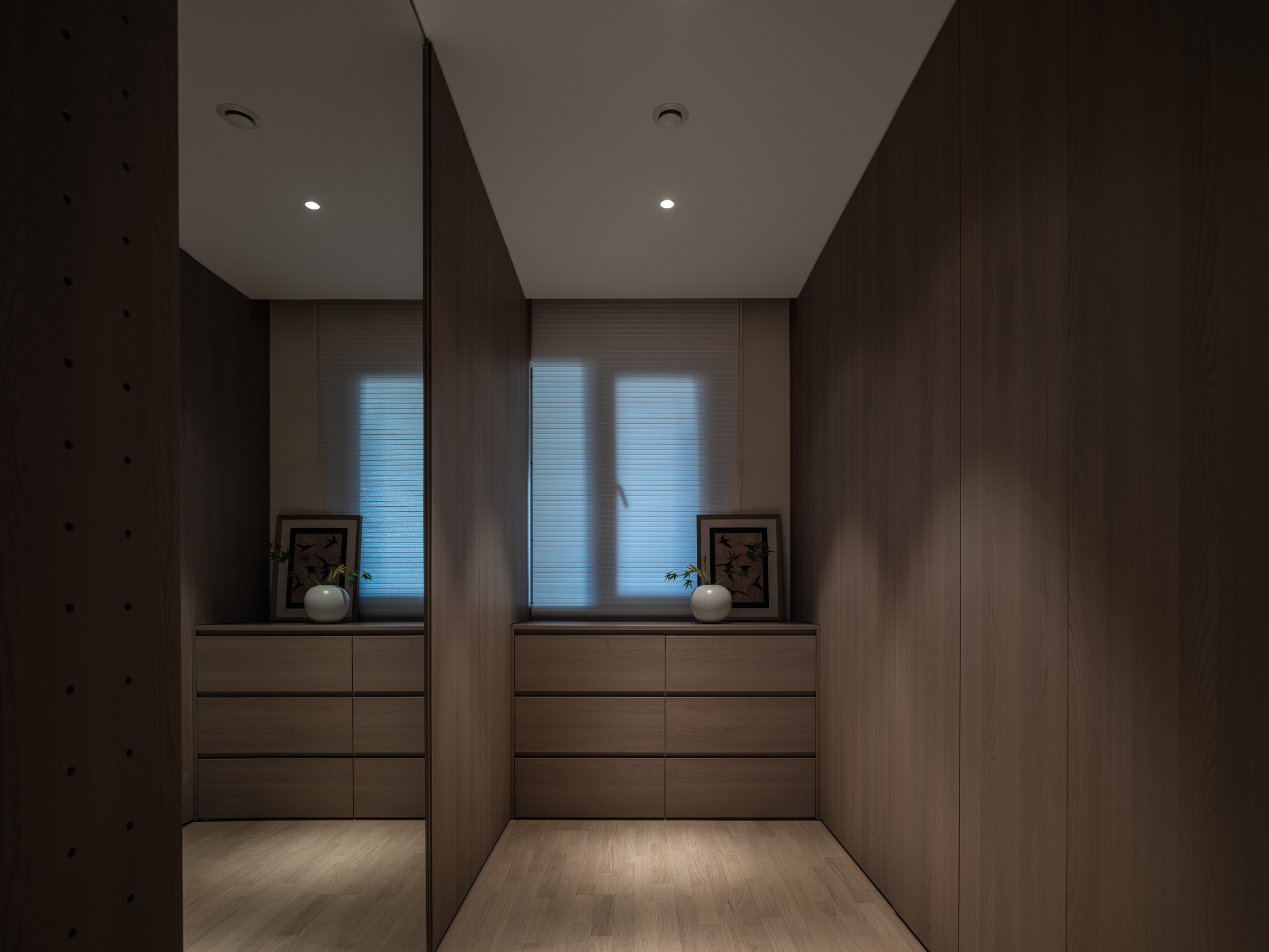 转角处,开放式衣帽间以镜为媒,巧妙放大空间视觉,每一次换装都成为一场自我发现的旅程。开敞的空间便于融入运动功能,让健康与时尚和谐共存,生活因此更加丰富多彩。