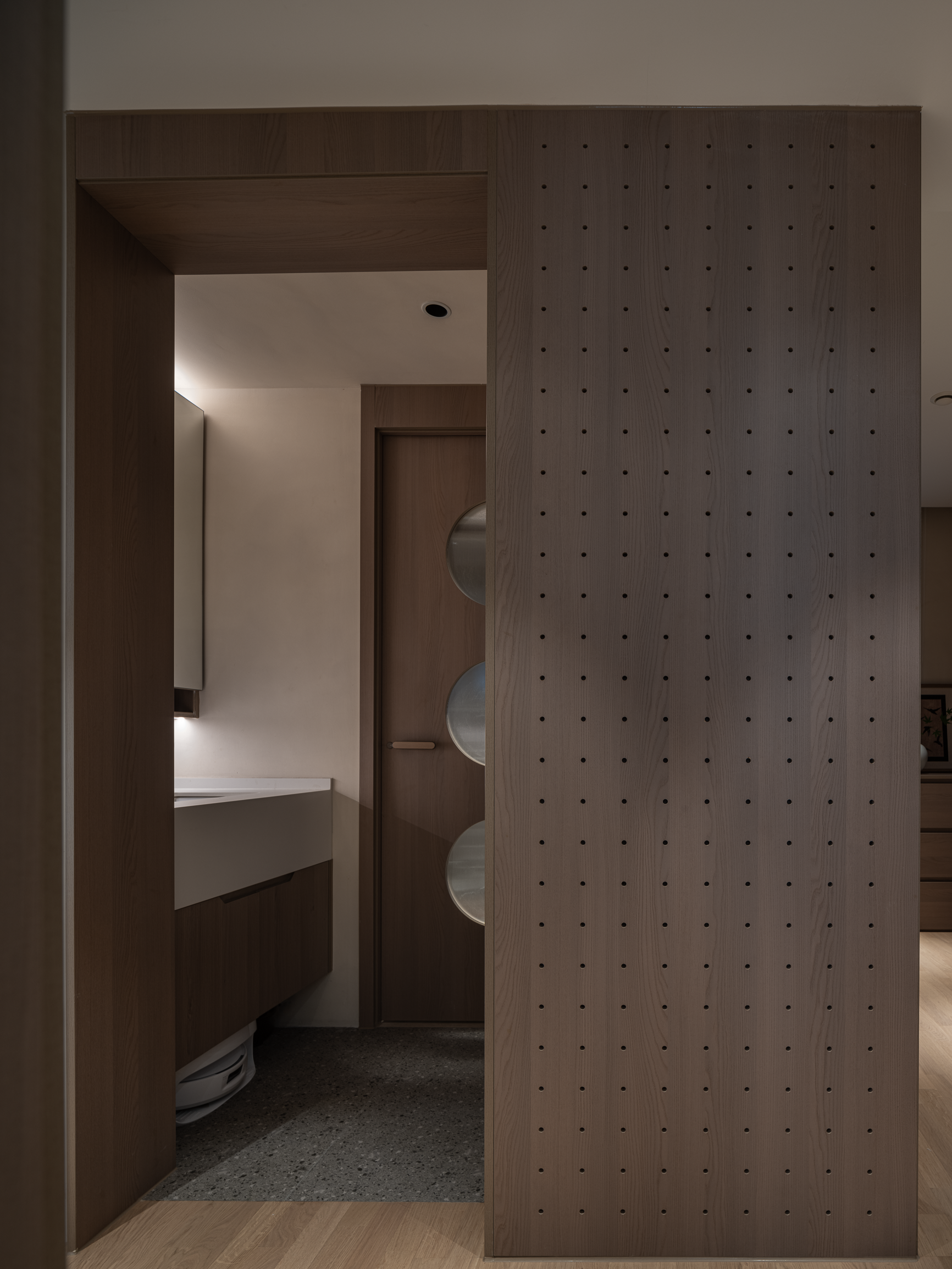 马赛克瓷砖铺就的下沉式“落尘区”,不仅营造出视觉上的层次感,还能温柔地拂去外界尘埃,守护家的每一寸纯净。独具匠心的洞洞板是收纳魔术师,更是展示个性的艺术墙,让归家充满惊喜与温馨。
