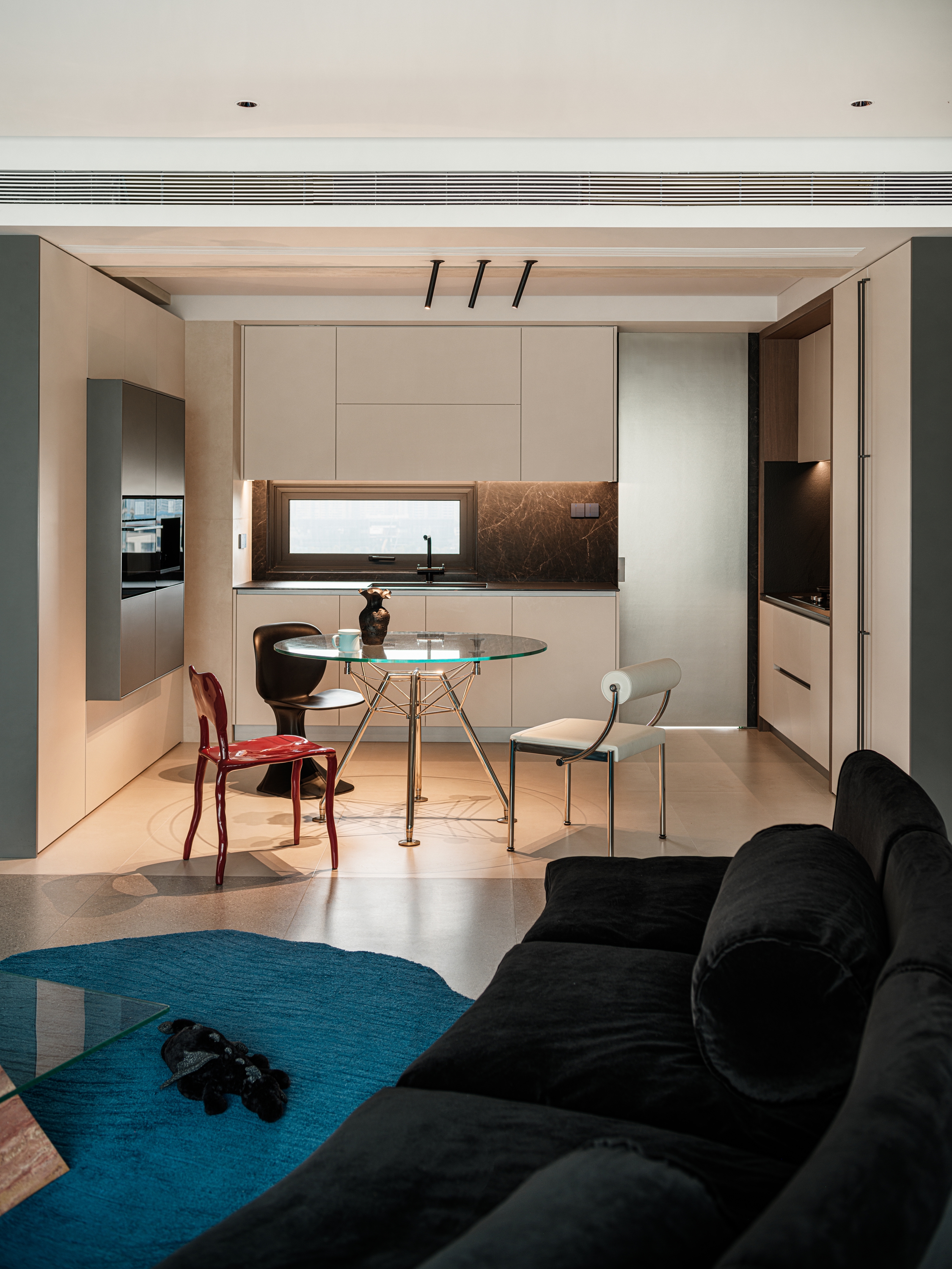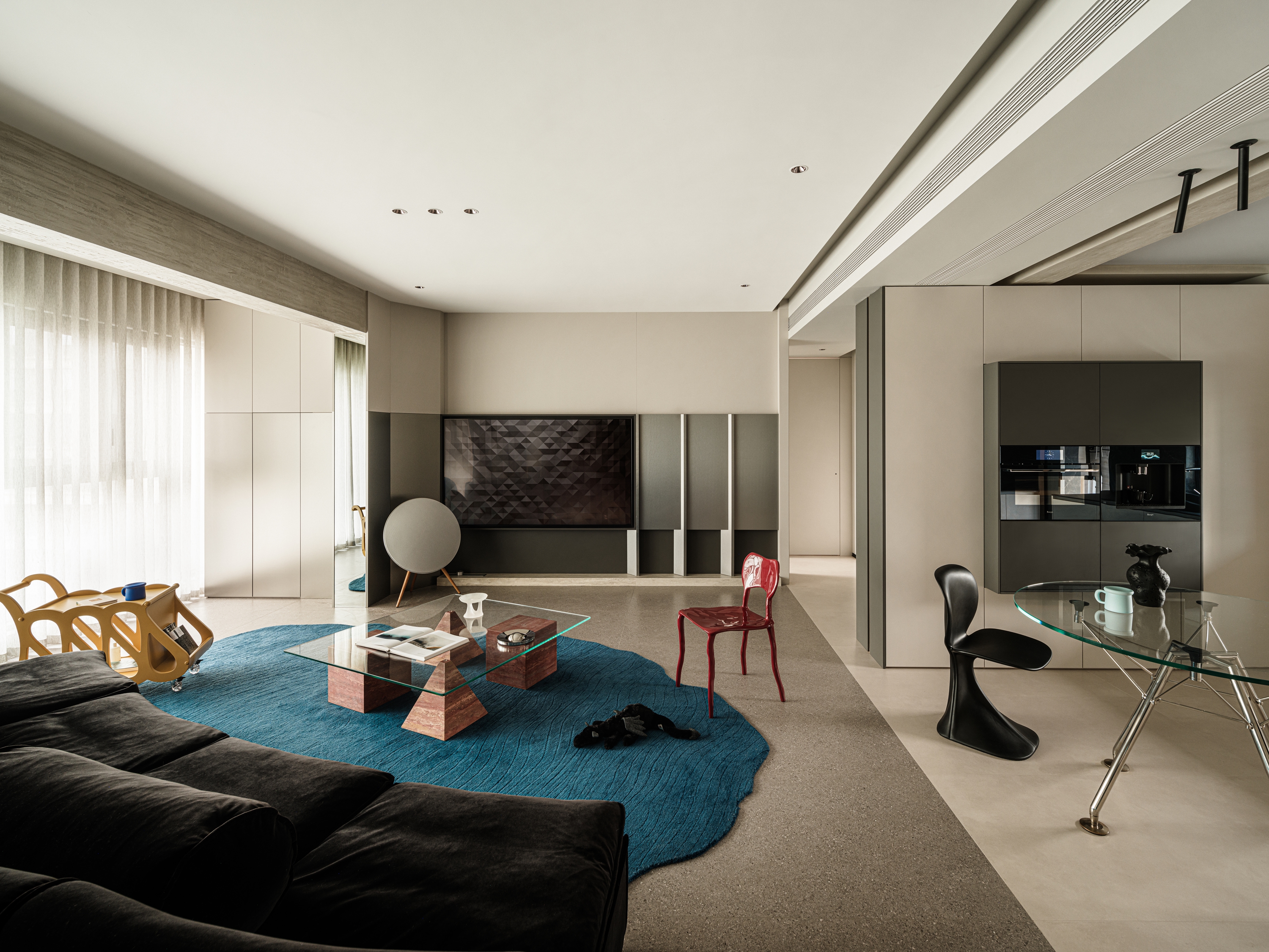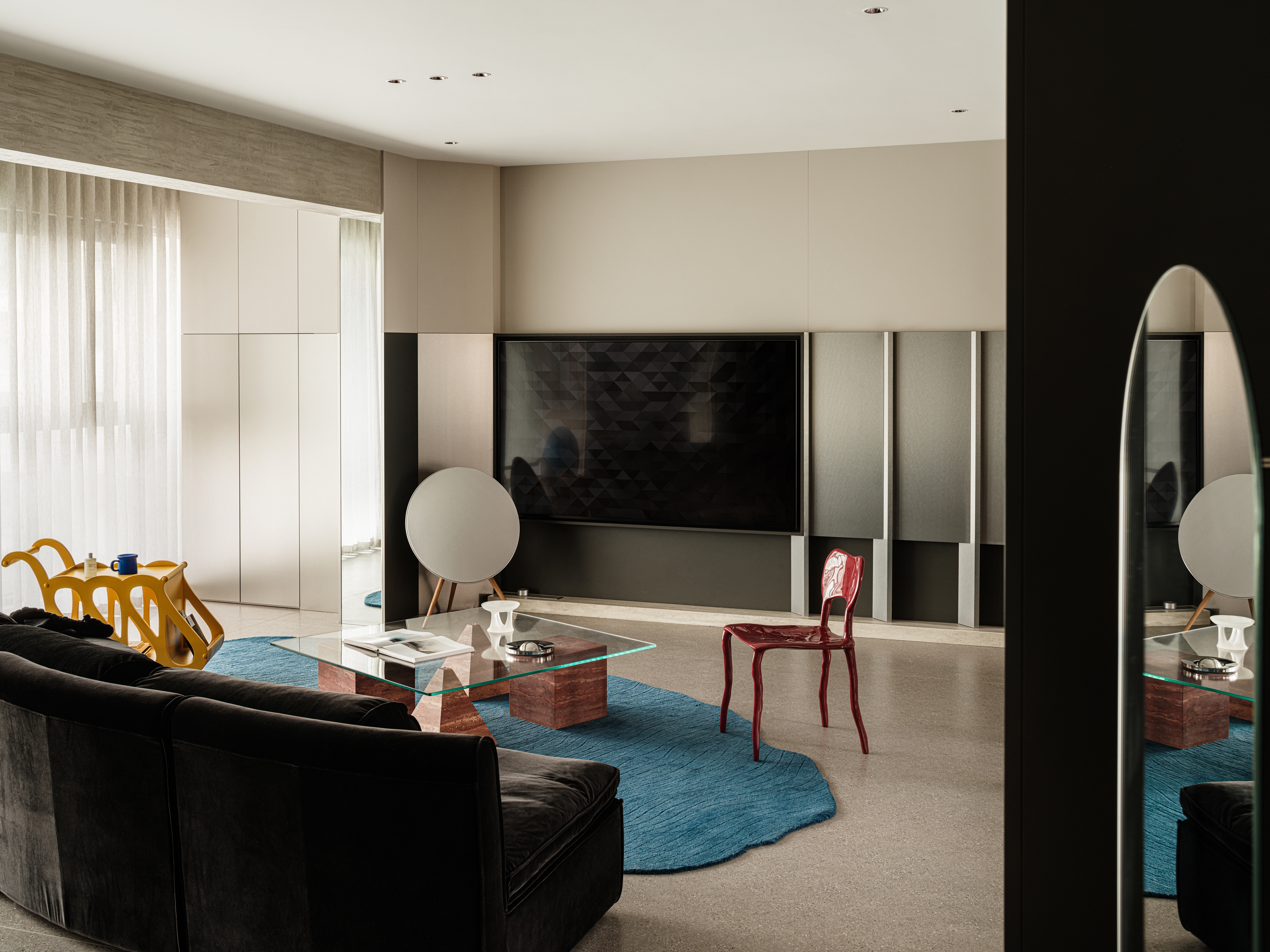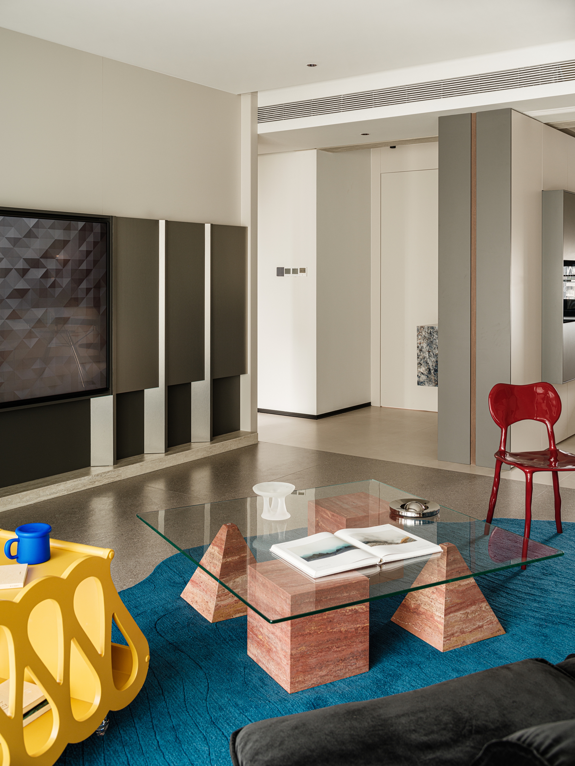 用几何造型构建空间框架,线条简洁利落,借孟菲斯鲜明色彩、怪诞有趣的图案点缀,让跳跃的色块家具、极具视觉冲击的单品为秩序中注入活力,于极简中融入幻想。