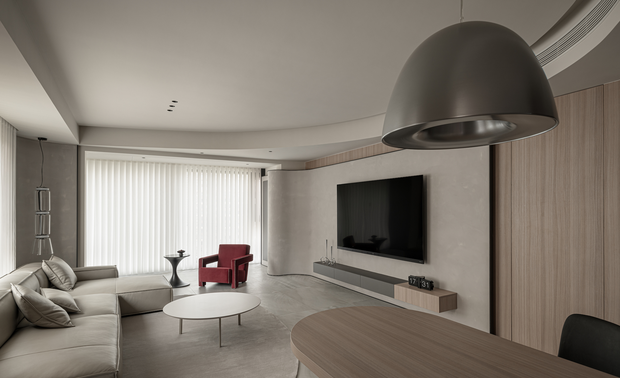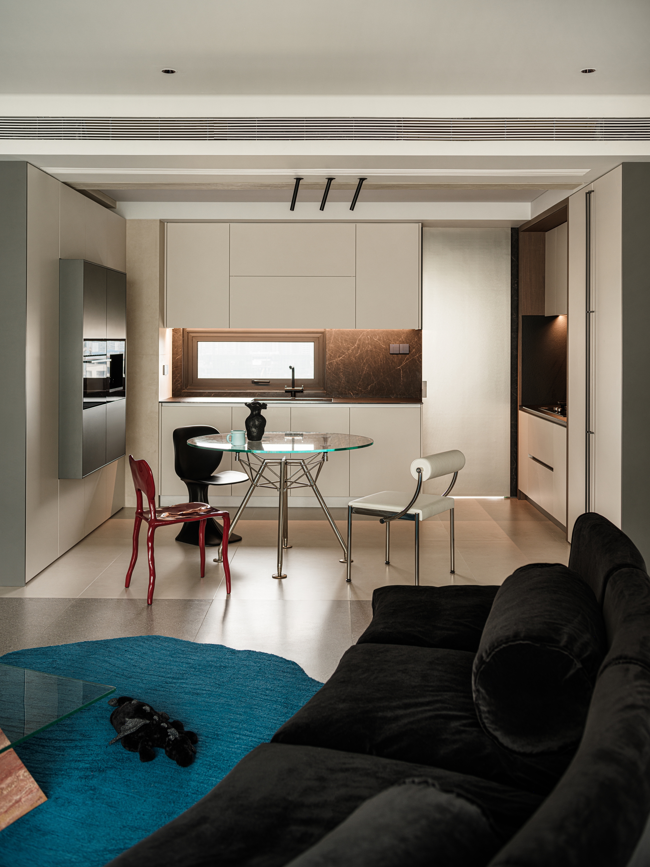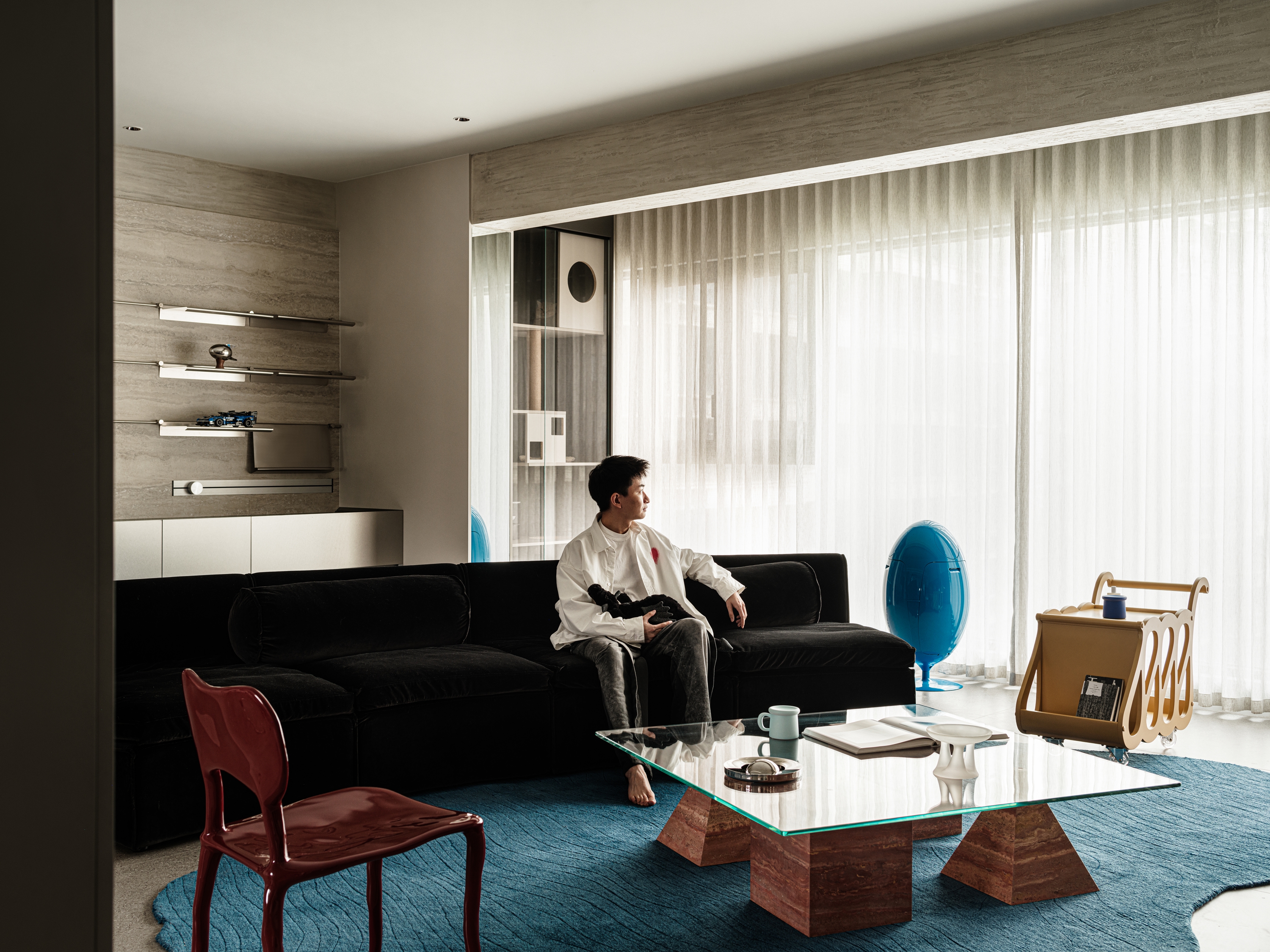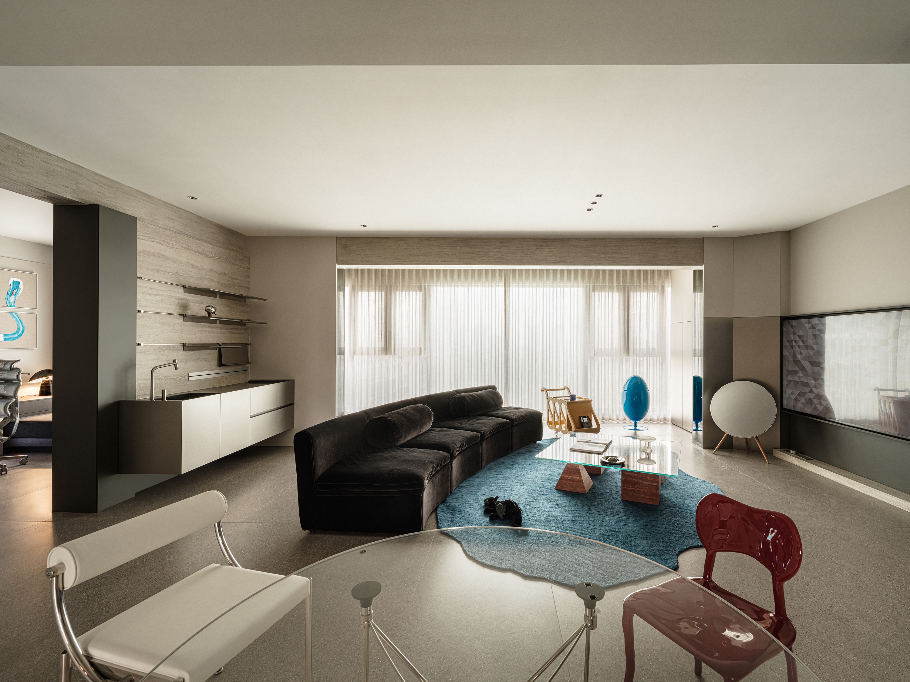 用几何造型构建空间框架,线条简洁利落,借孟菲斯鲜明色彩、怪诞有趣的图案点缀,让跳跃的色块家具、极具视觉冲击的单品为秩序中注入活力,于极简中融入幻想。