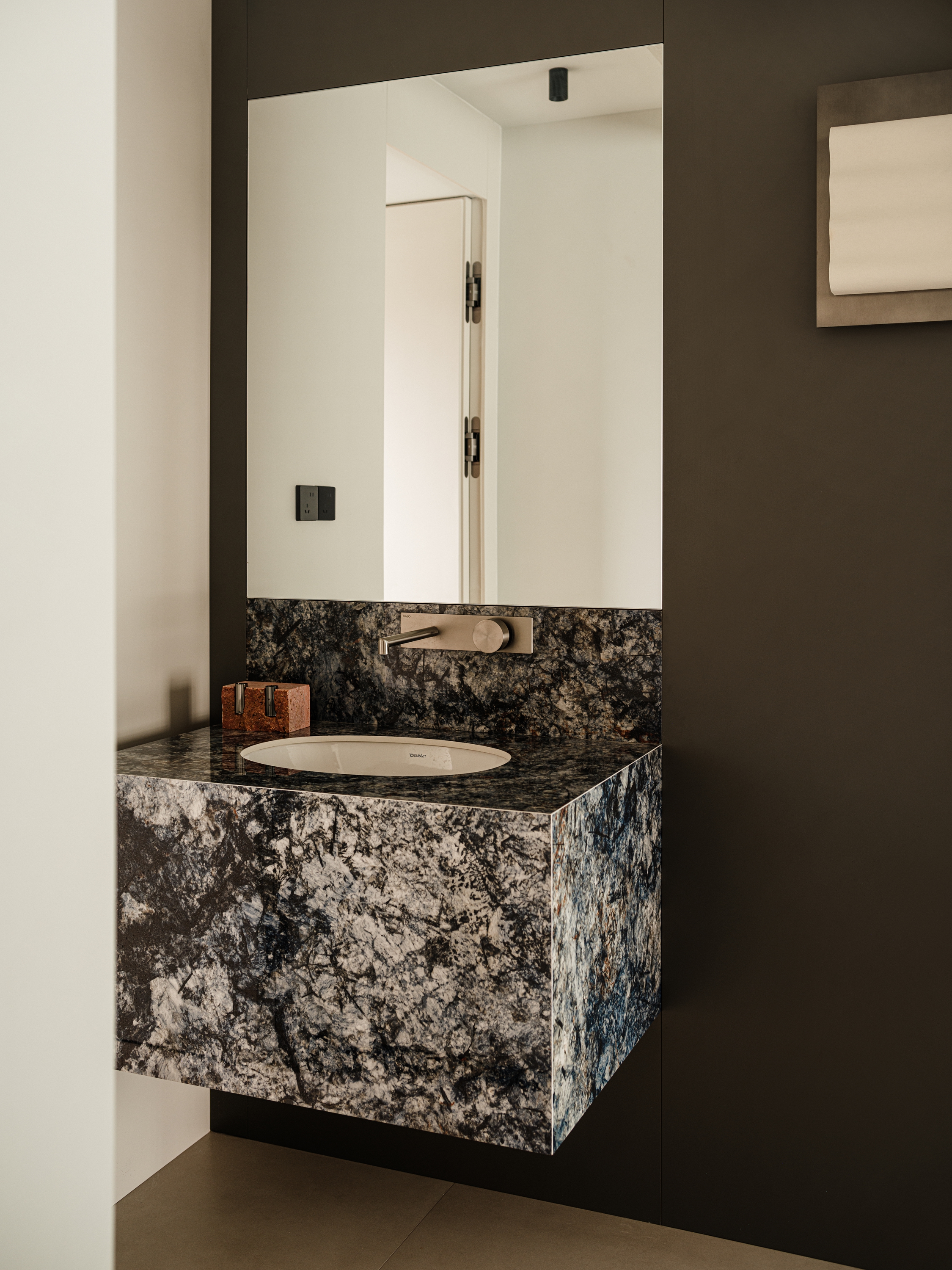 4、客卫洗手台外置,柜体+钢架确保稳定性,全石材上墙与客厅混搭包豪斯风格形成呼应;