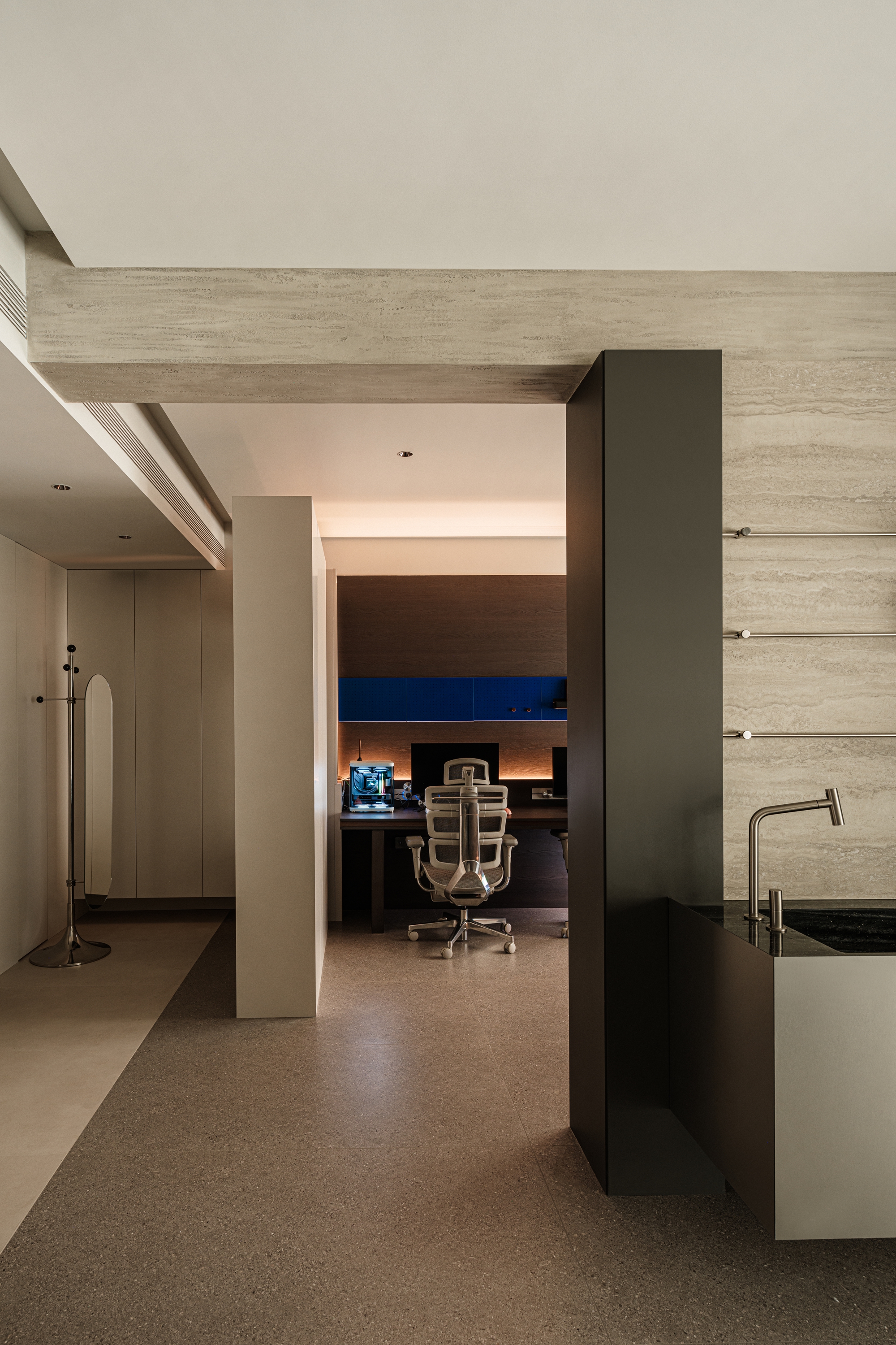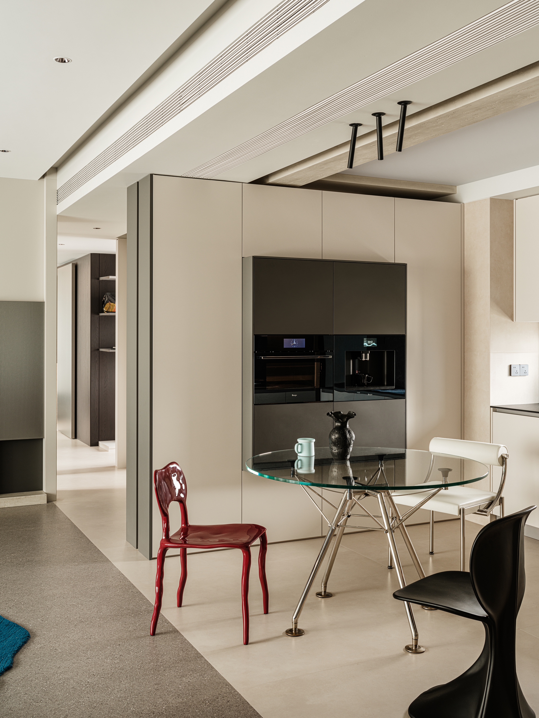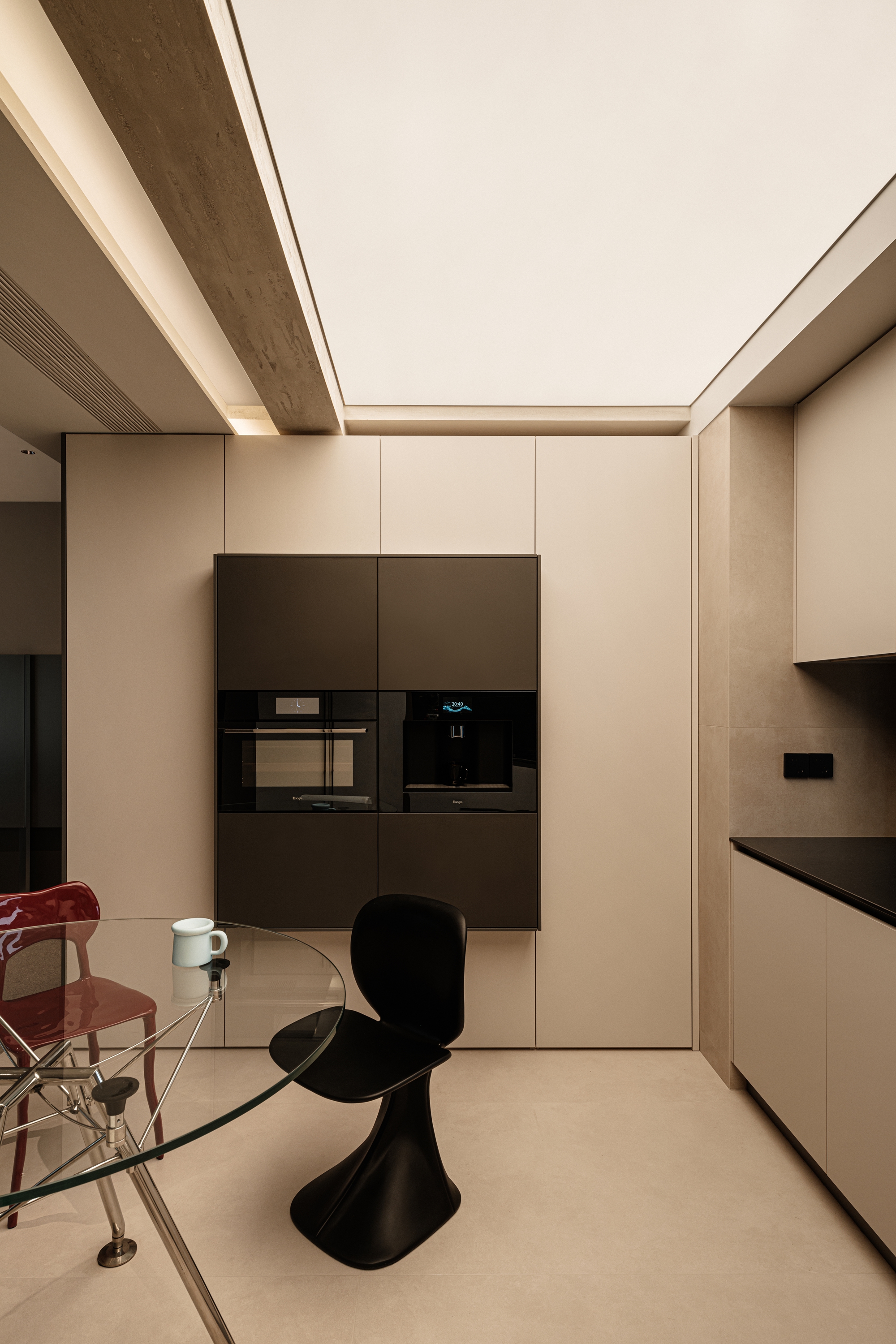 原厨房顶部梁柱较多,通过构建“柱体交错”以及穿插未封顶柜体&双开门冰箱内置等细节设计,刻意做出“隐”和“突”的结构立体感。涂刷“洞石”肌理感的艺术漆,打造出看似简单实则精致的内建筑感。