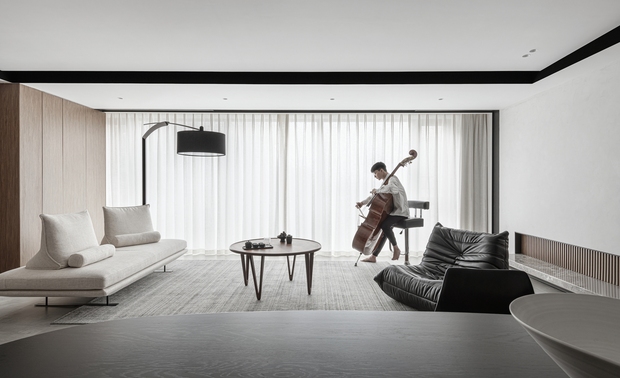客餐厅厨房在同一个空间内,整个空间以气质鲸鱼灰为主色调。