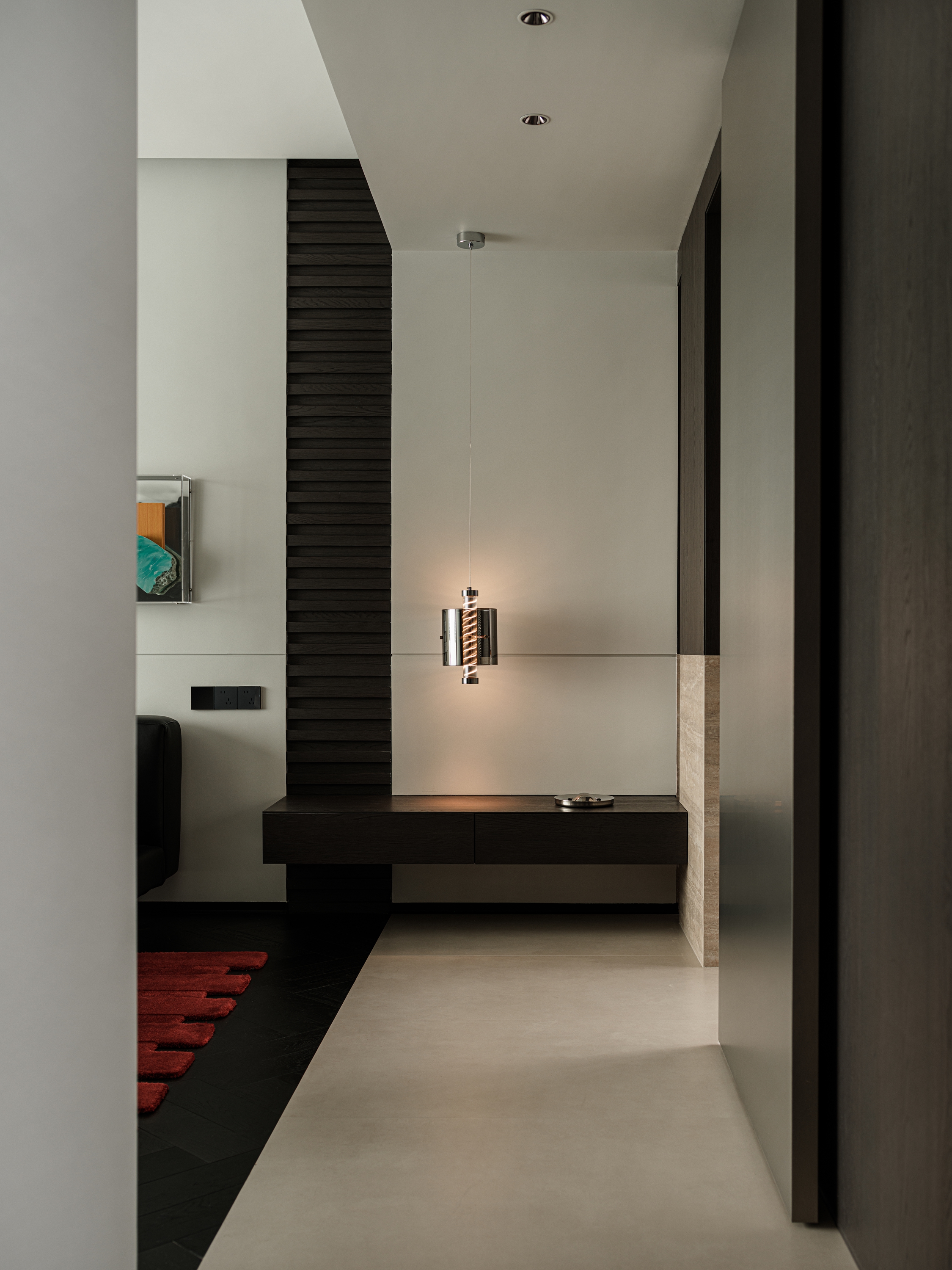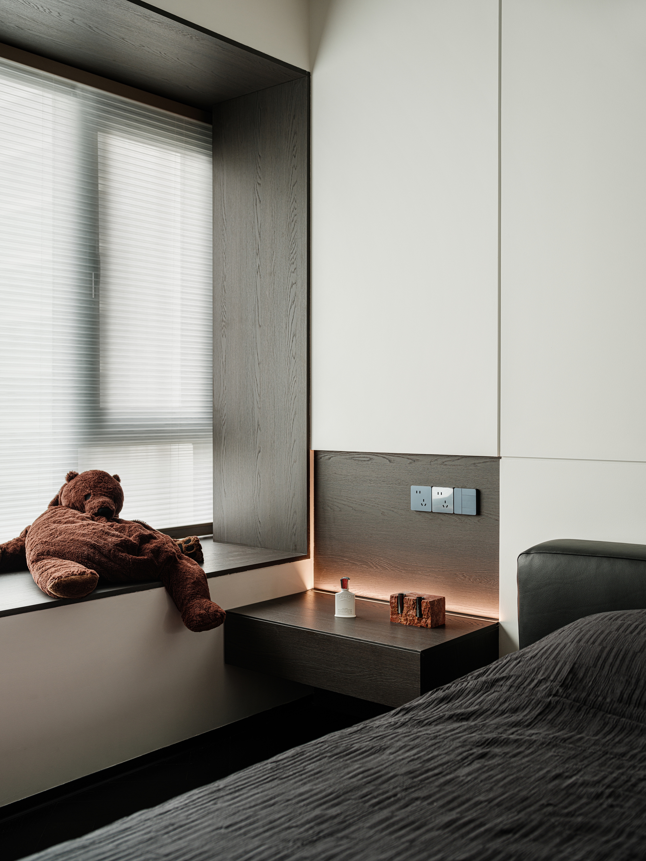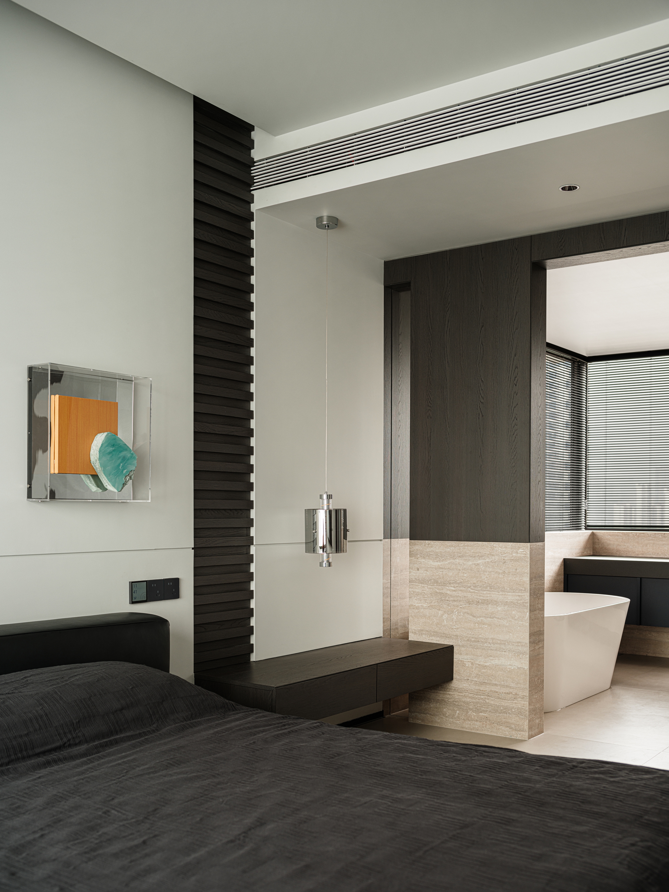 主卧刻意做出“隐”和“突”的结构立体感。涂刷“洞石”肌理感的艺术漆,打造出看似简单实则精致的内建筑感。