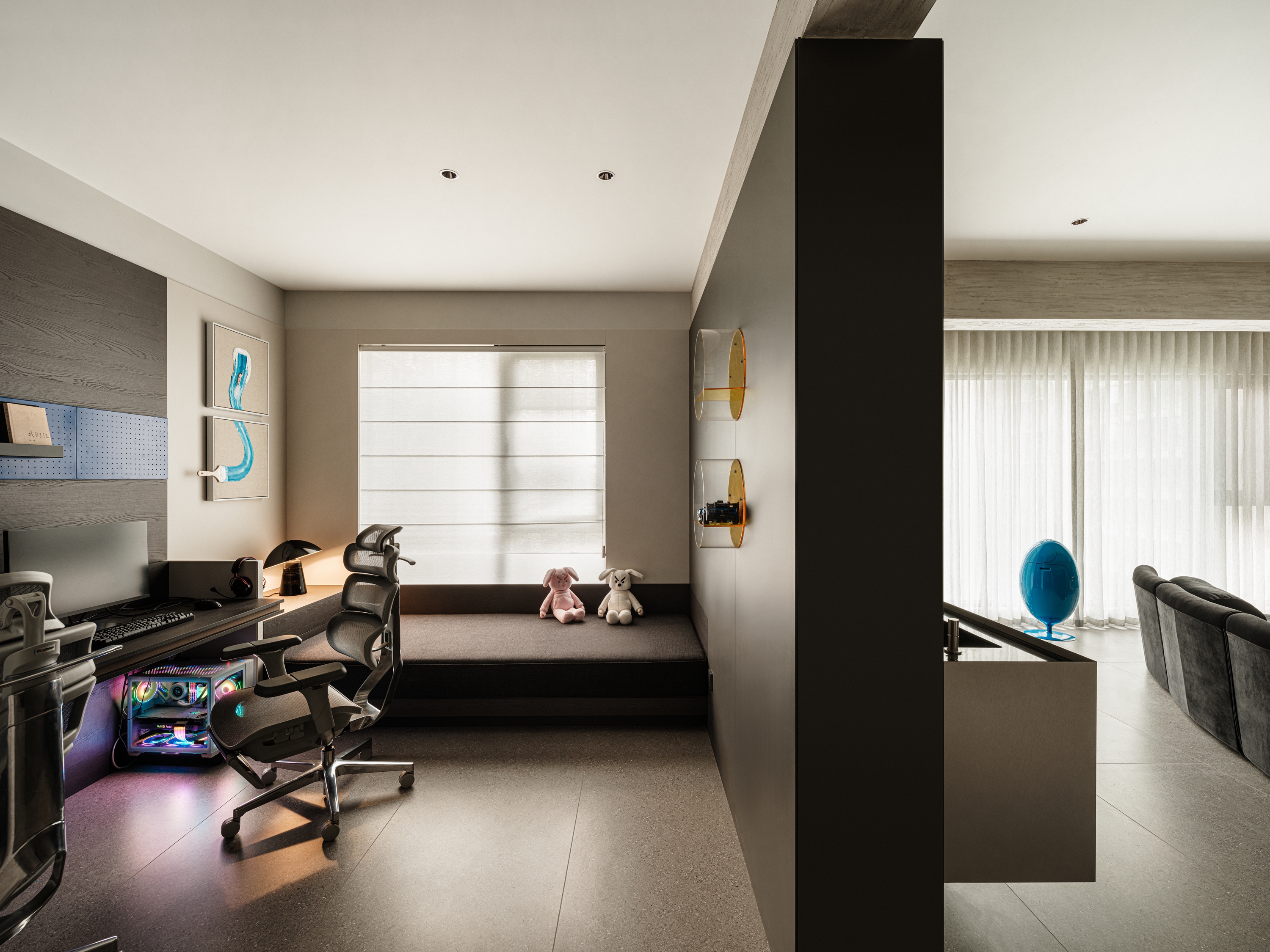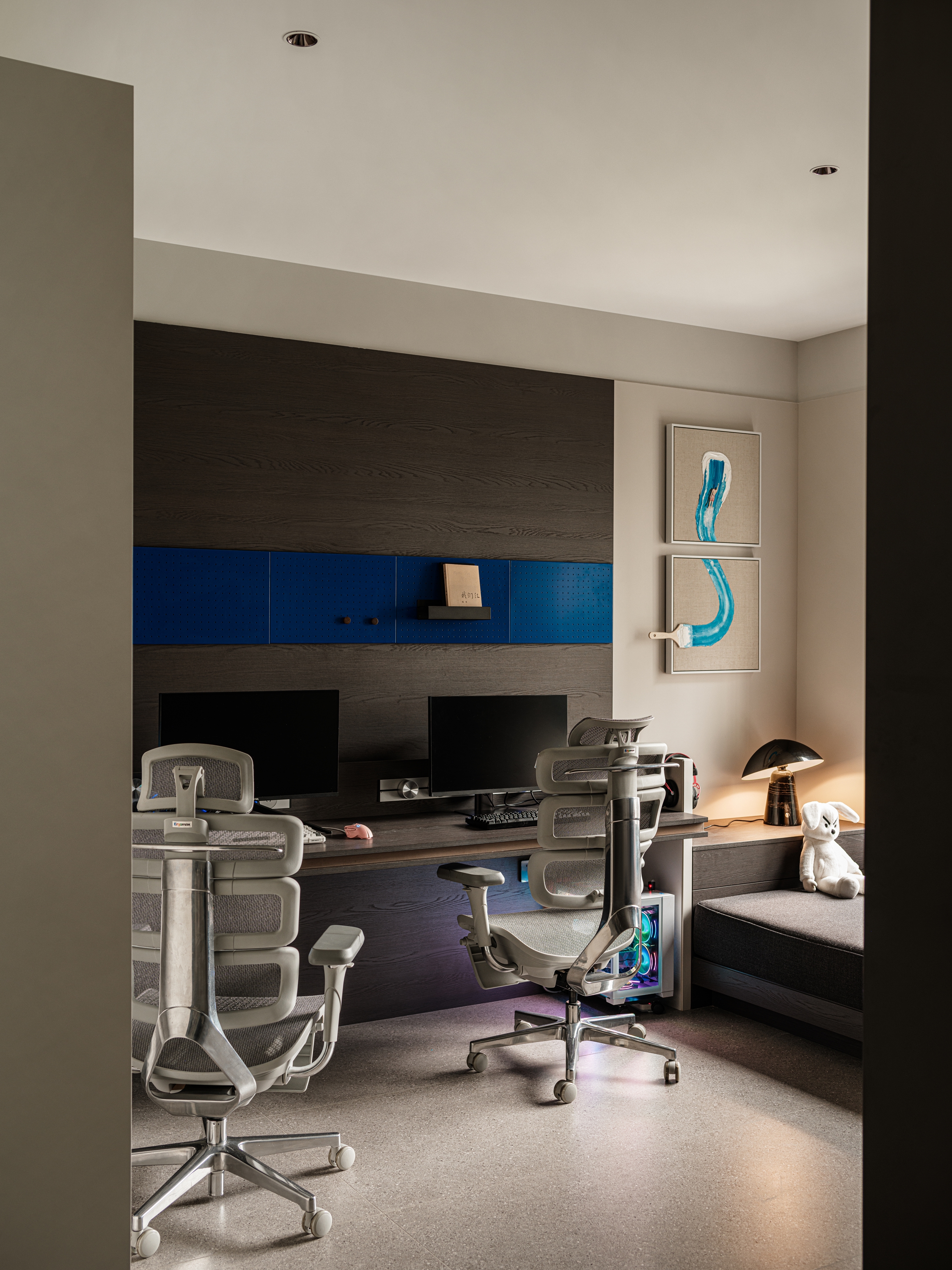 2、客厅相邻封闭房间改开放式电竞书房+榻榻米,游戏之后不用多走一步路就可以转身在榻榻米上小憩,等正式睡觉时再回主卧(直戳熬夜党心趴)