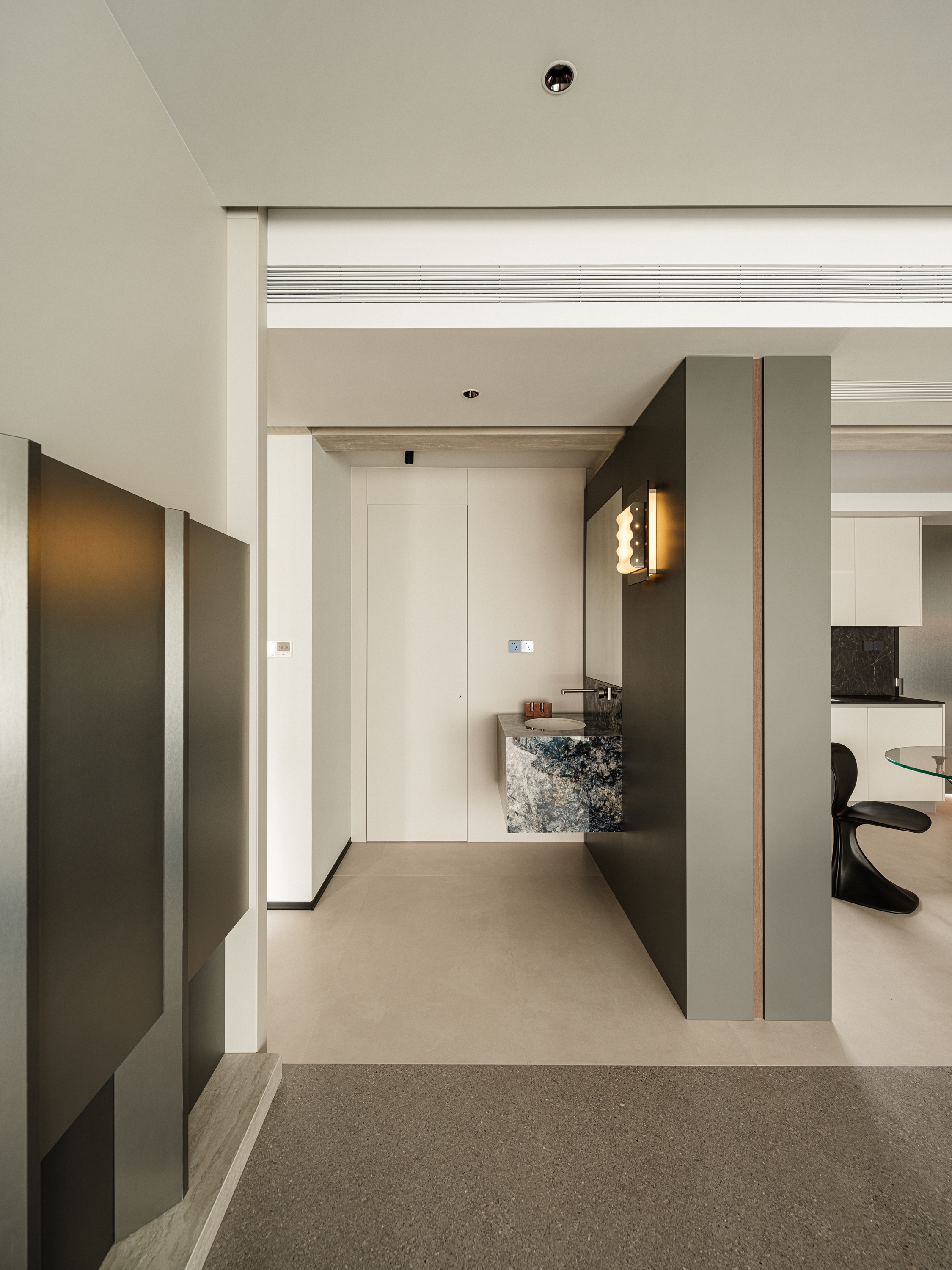 通过艺术涂料、深色地砖、镜面、墙板分色的处理手法,又让客厅西厨区,空间变得更加开阔、通透、有趣。在高柜区和洗漱台中置钢架,进一步一材两用,解决设备和洗漱区不美观的问题又增加了空间尺度。