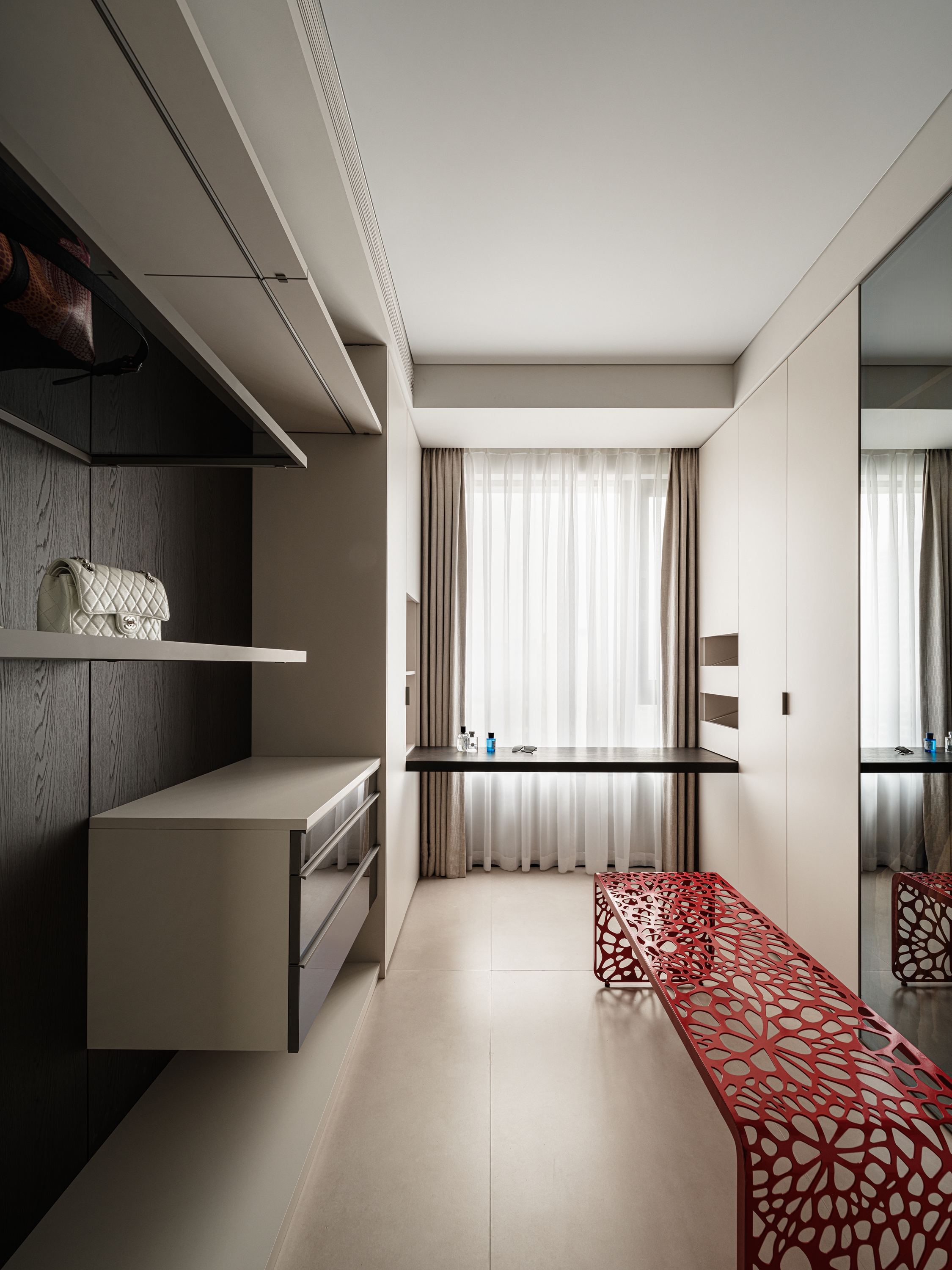 两间房改为主卧套房,带软膜天花顶的秀场级独立衣帽间,金属不锈钢幽灵门。