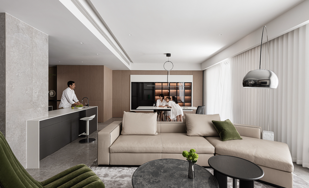 从空间变得更有通透性着手,利用储物、玄关、收纳、功能,把入户房间作为开放式书房,打开第一层视野,通过墙板的延伸,让书房有质感和好打理的同时,又不孤立西厨的设置。扩大厨房使用面积,把餐厨融为一体,利用原有的梁位,同时从纬度的尺寸,巧妙的设置,让厨房和餐厅又有明显的划分。