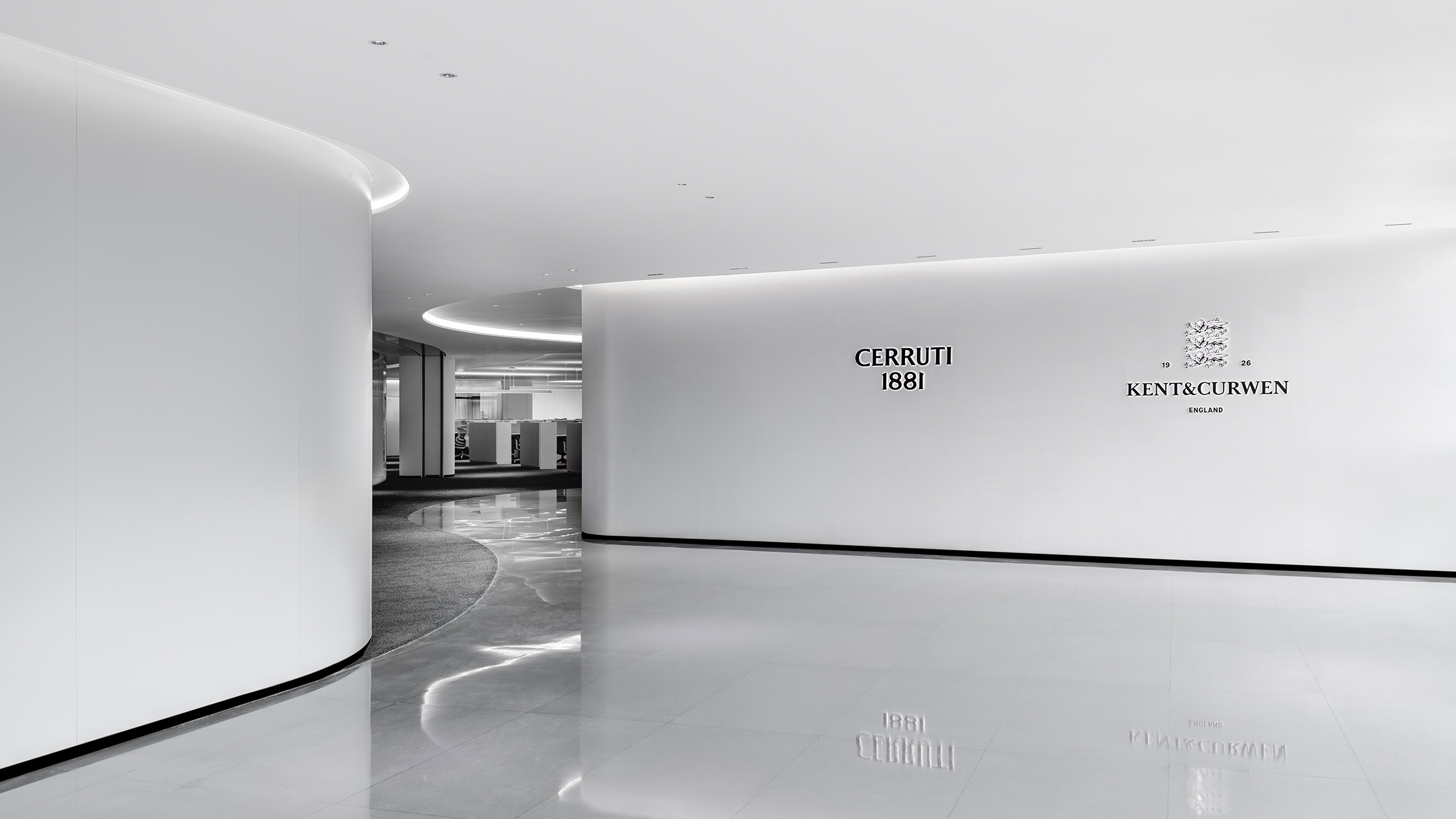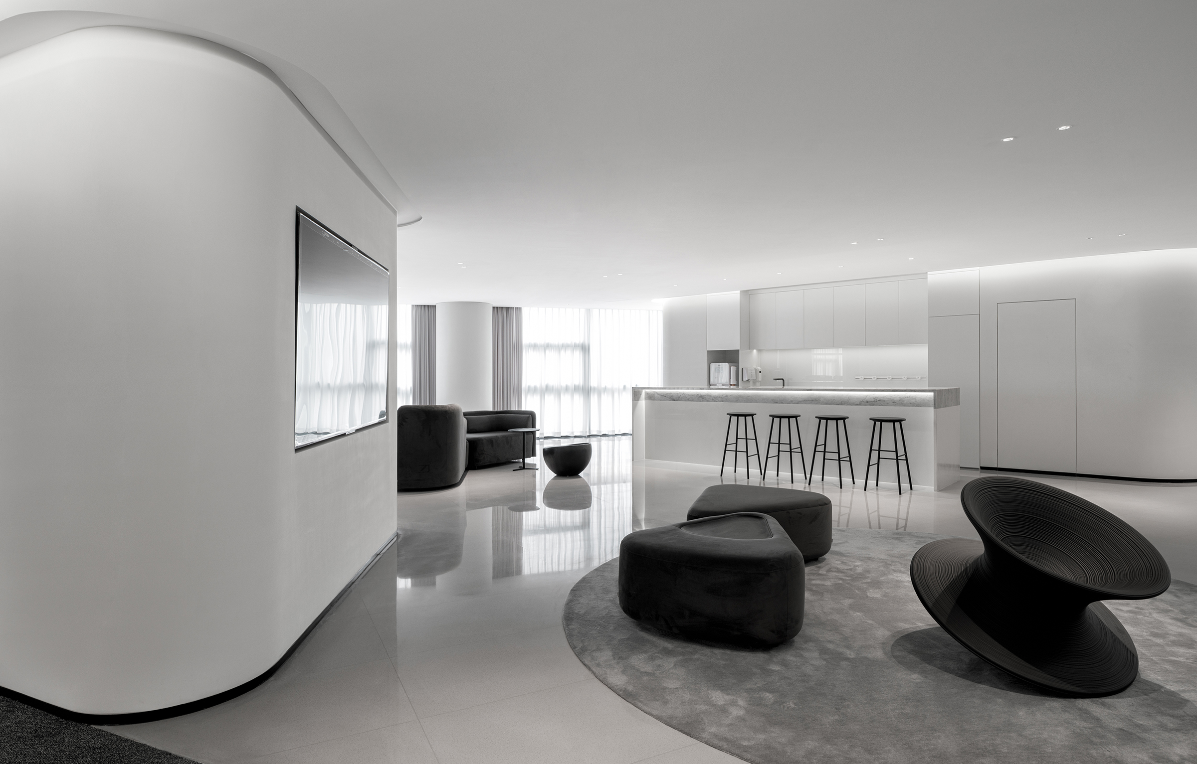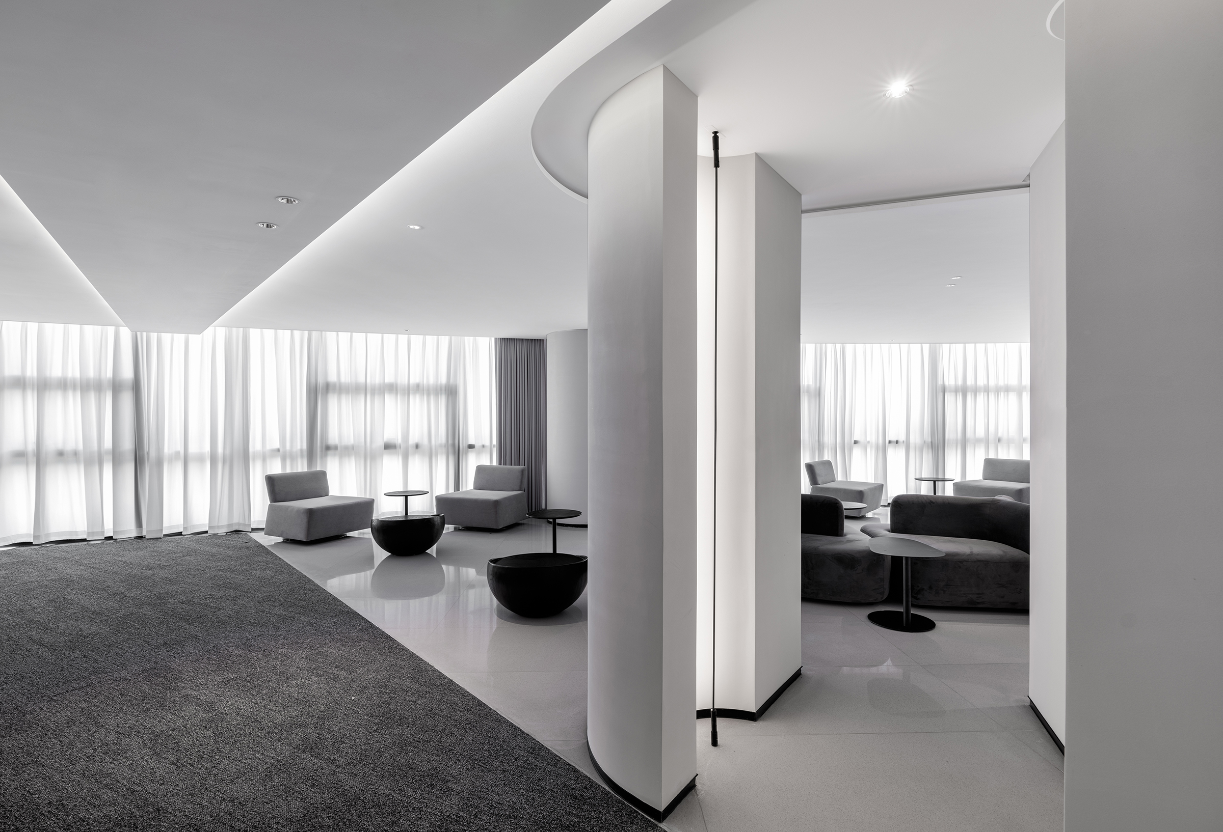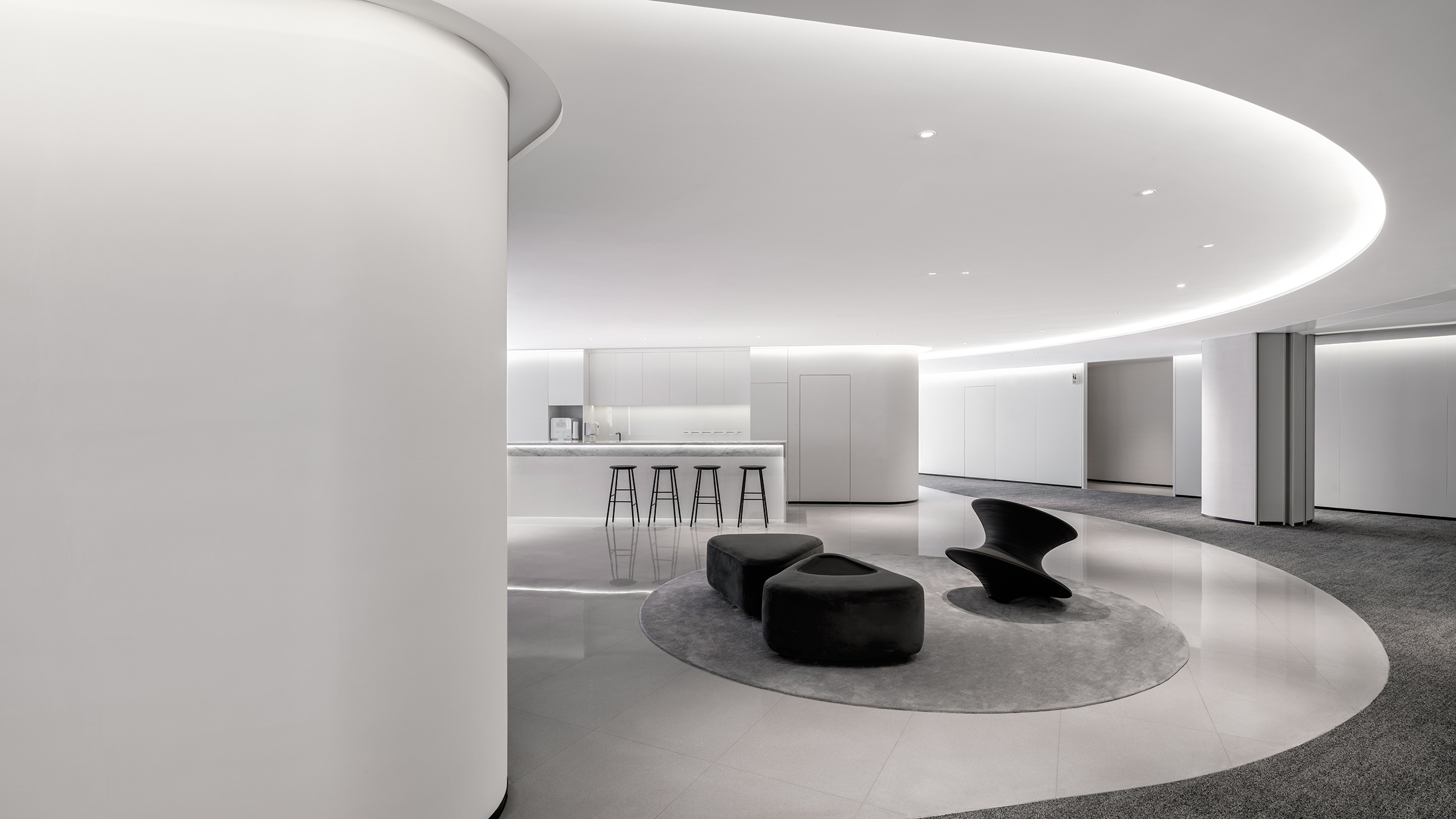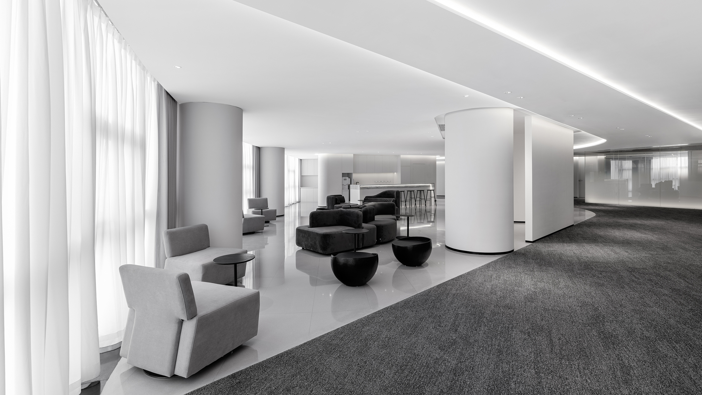 空间意境:作品在环境风格上的创新点主要体现在空间的流动感和动感设计。通过建筑形态的呼应,采用弧线设计将空间划分得既独立又融合,特别是通过橄榄型中庭和抽象破冰船身的设计寓意品牌在国际市场的突破与航行。此外,渐变玻璃的运用加强了虚实对比,并与服装发布场的动态感结合,使员工在工作中也能感受到动力与自信。空间整体保持简洁和高级感,赋予每个细节以现代感和精致感。