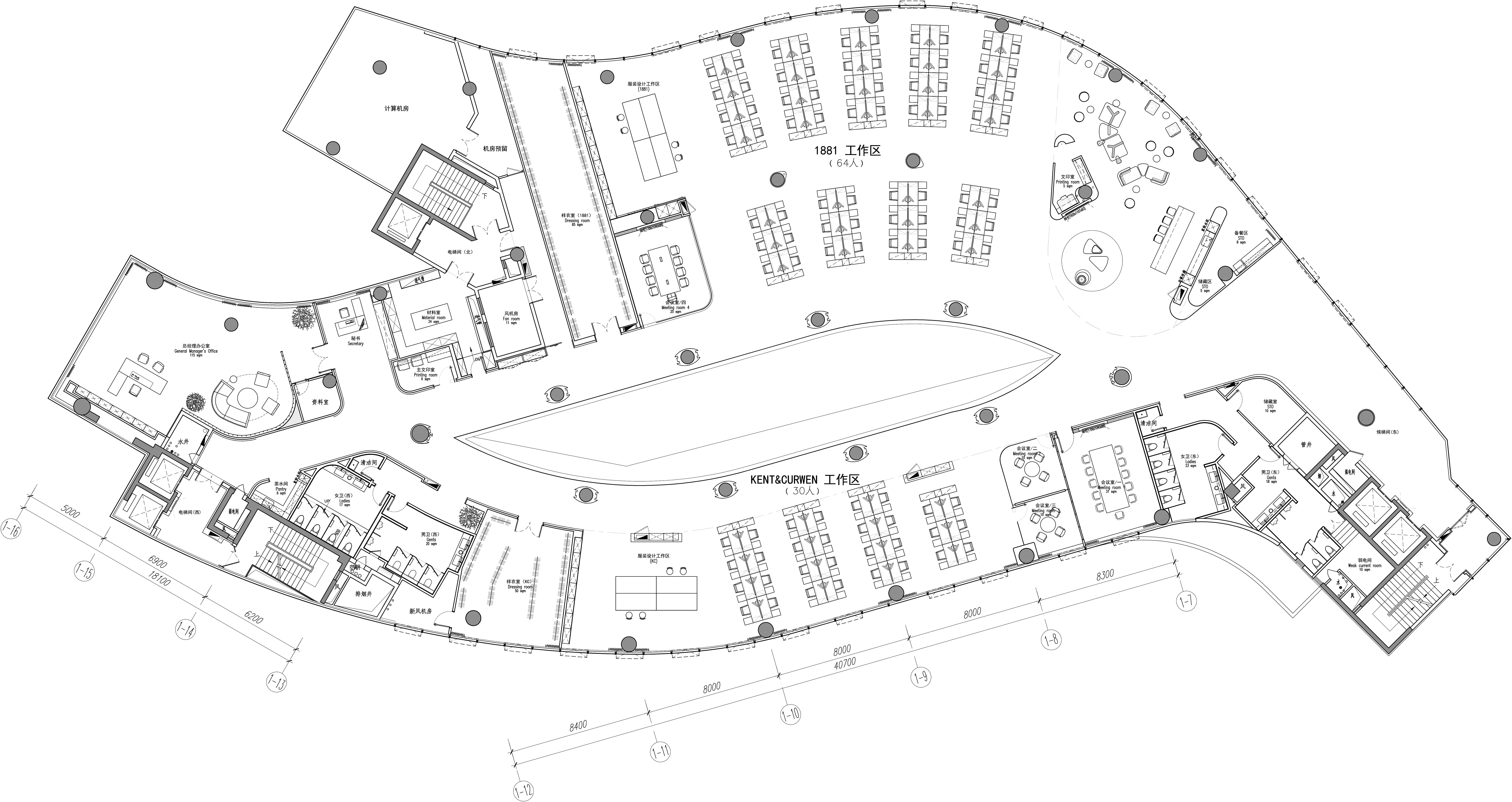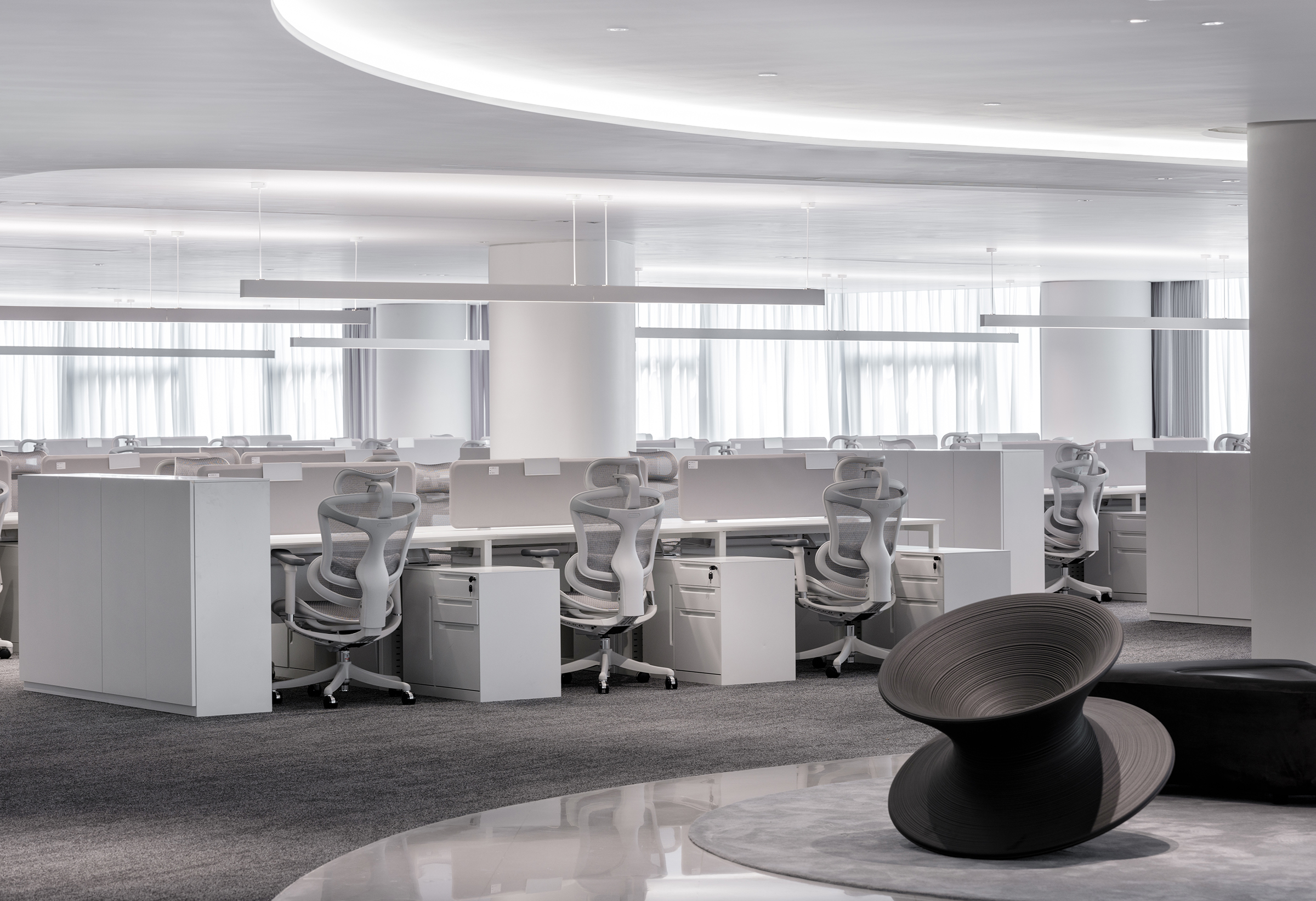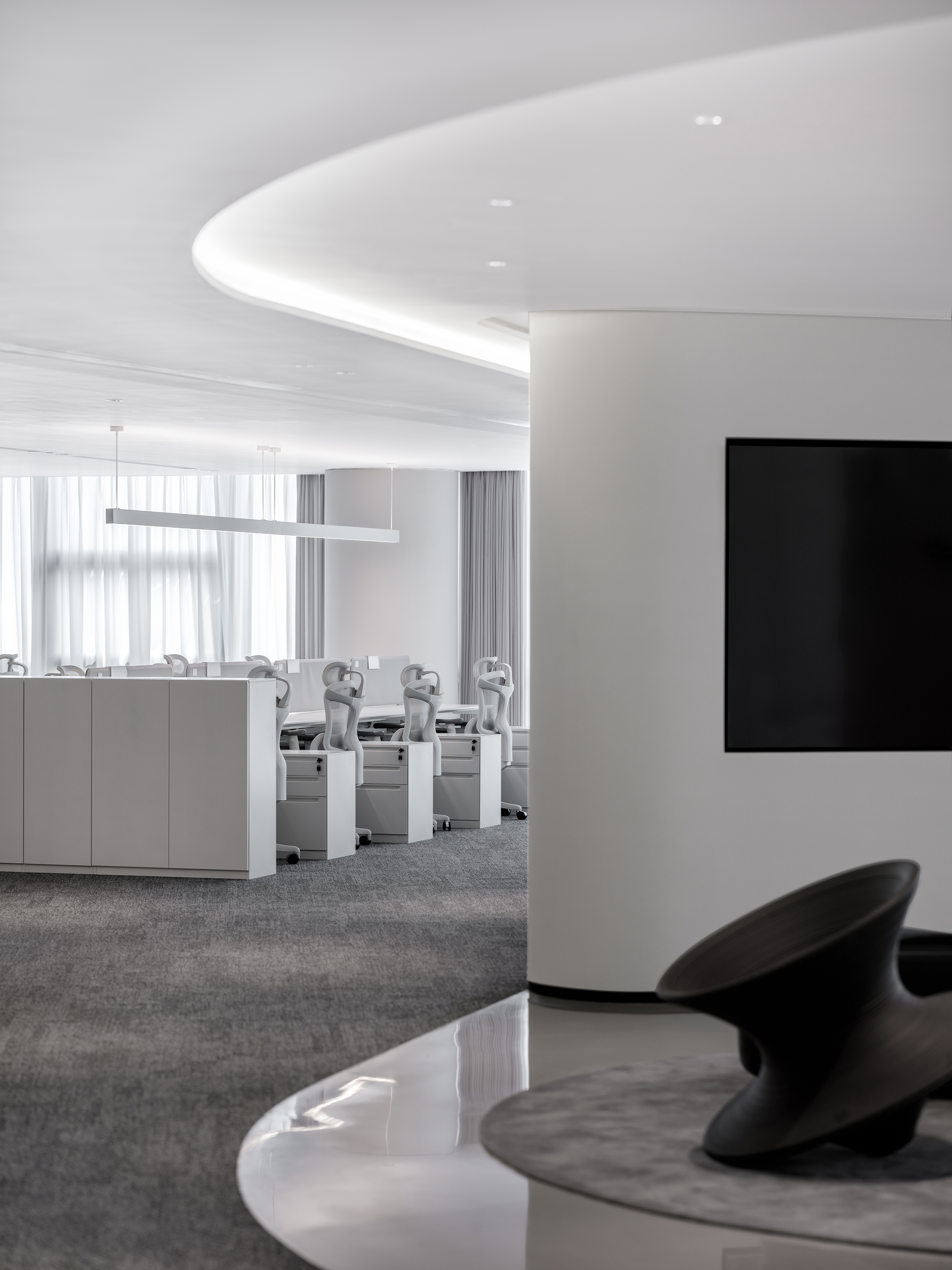 空间布局:空间布局的创新点体现在动线流畅、视觉丝滑的设计上。由于建筑本身为异型橄榄型,传统的横平竖直布局无法适用,因此采用了扇形放射线布局,以保证空间的顺畅流动,同时满足不同部门和小组的空间需求。琴键式扇形摆位方式有效解决了员工位通道宽窄不一的问题,确保空间利用率的最大化。通过核心交流空间的设计,连接了品牌宣传、员工交流以及客户接待等多个功能,创造了一个既独立又融合的空间结构。