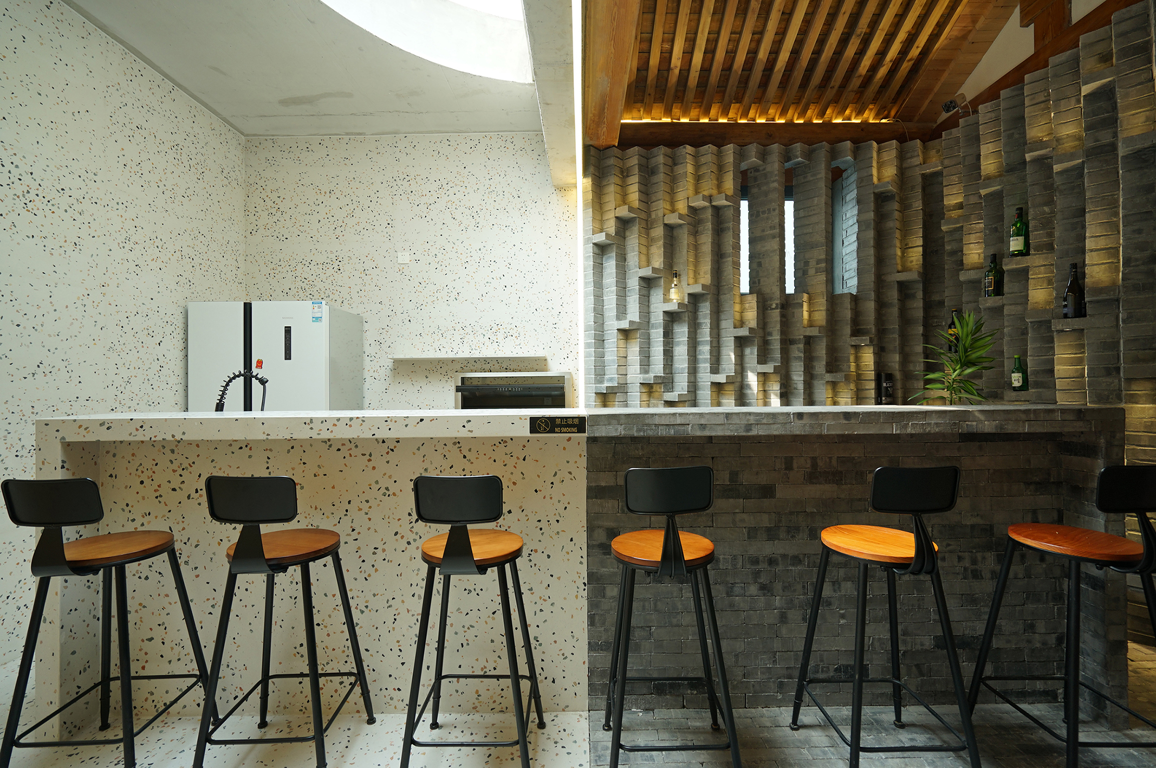 设计选材:新建的“鸽子笼”用纯粹的几何形体架于屋顶。与原有的屋顶在视觉上形成了形体的穿插,青砖山墙及瓦当被包裹进室内。屋顶的采光玻璃面加上了半透遮光帘,将日光过滤成更加柔和的光线。这一系列的处理,将室内与室外空间的模糊,现代与传统建筑的对比与相同,明快与温馨氛围的营造,新与旧的关系变得暧昧。悬浮的“鸽子笼”由钢结构搭建,从结构上与砖木结构的建筑主体脱开。 清晰的结构关系让原有的木结构也得以暴露出来。餐厅吧台的位置横跨了正方西侧一间和西耳房两个空间。 设计将新建的耳房和现状正方通过材料进行了视觉上的区分。白色水磨石和青砖将空间一分为二,黑与白,光滑与粗糙,简单与复杂从高度,肌理、立面材质、空间差异化几个不同的方面产生了对比。在餐厅墙面我们设计原创了一种青砖墙体的砌筑方式,45度的排列方式让整个墙体更有质感,同时长短砖体的交错自然形成了酒架。在耳房屋顶开设的半圆形天窗自然的引入光线,同时也让山墙和屋顶暴露在视野之下。餐厅作为项目第二个公共空间我们希望通过不同材质的对比表达出改造建筑新老结构和空间的项目迭代与融合。