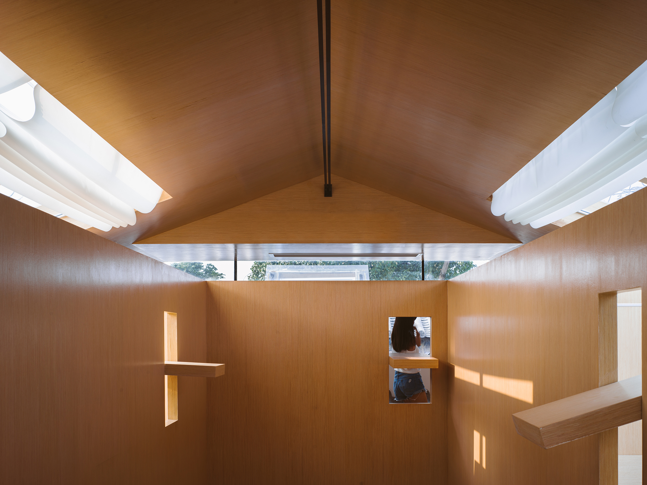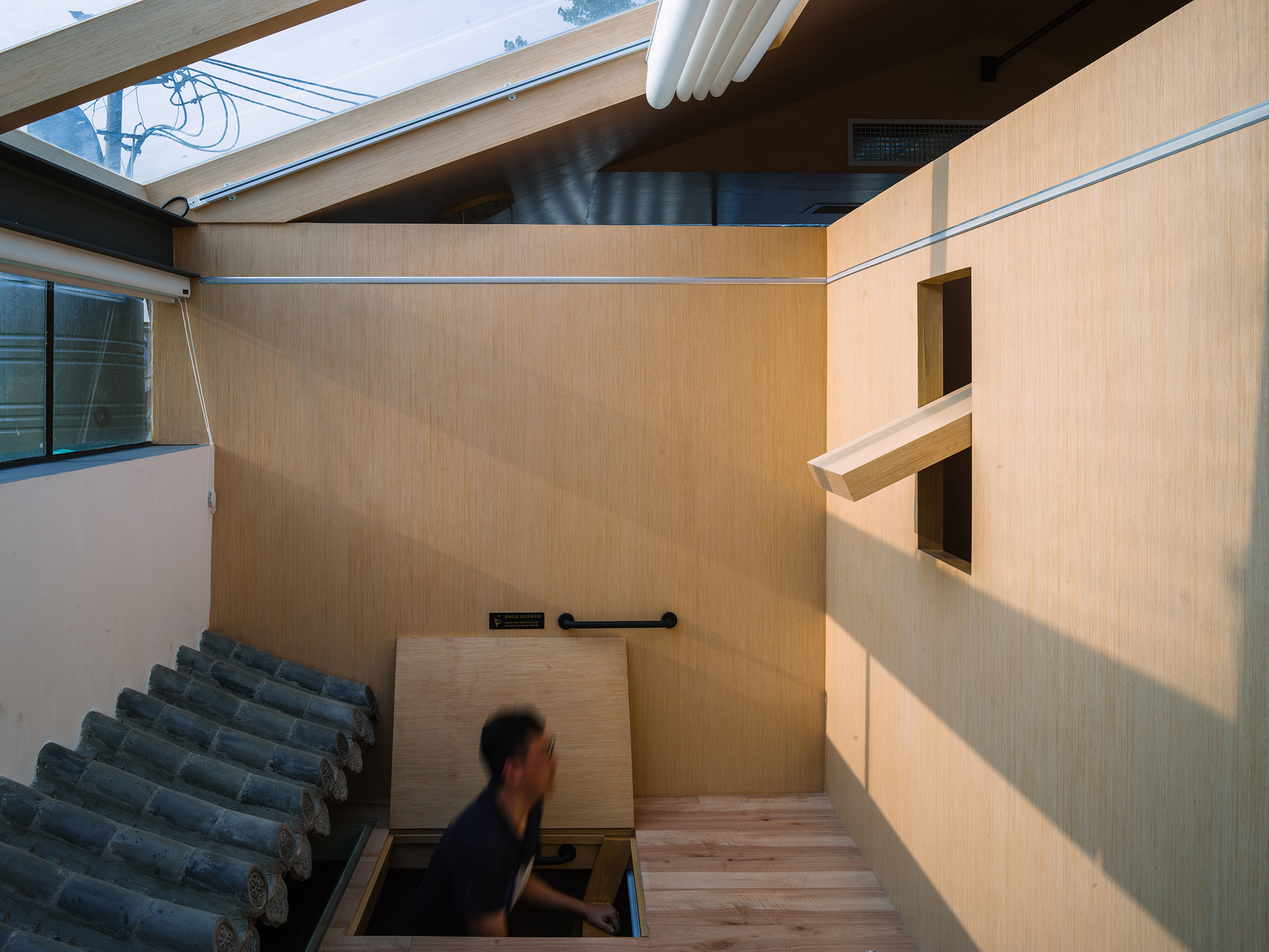 空间意境:设计目标希望在仅仅二百平米的四合院内完成入口玄关,餐厅,和6个独立居住单元。 这是新老建筑的共存,不同的时代,不同的结构被用来满足人们不同的需求。让游客在享有现代居住环境的同时更能近距离的,解剖性的感受体验四合院建筑传统的构造形式。天井向上看去,翻转的窗户好像好像不知去向的通道,阳光透过窗户的形状打在木板上,增加了很多趣味。设计将原本的庭院空间分割并架起,从屋檐长出了“鸽子笼”,冲出了原有的屋顶,架设在这片“瓦海”之上的新空间是完全摆脱掉社会属性,属于个人的对话自然的独立空间。北京的传统四合院建筑布局虽然受等级森严的空间秩序影响,但在四合院的屋顶上却是一片完全不一样的天地。像是久久憋住的一口气突然呼吸到了自由的空气,越过屋顶你会发现包围你的不再是墙砖灰瓦而是葱葱的古树,北京的高楼都被推到了远处二环之外,连成片的屋顶起伏的屋顶构了瓦片的海浪,让人难得能有机会享受这没有高楼遮挡的天空。就像是《邪不压正》中李天然和关巧红碰面的地方,北京四合院的屋顶是这城墙内少有的自由,浪漫,能放空一切的场所。于是这里成了这片胡同离天最近的地方,阳光空气水和胡同中的古树都比以往来的更近更直接。整个架空空间就像是吸收阳光的容器,阳光被吸收进来,经过反射、柔化、扩散到整个房子。新合院延续了杂院的群居属性,但设计注重空间公共性和私密性的边界与过度。中央庭院既原四合院院落虽然变成了室内空间,但仍作为各居住单元的公共客厅使用,是各居住者的社交场所。