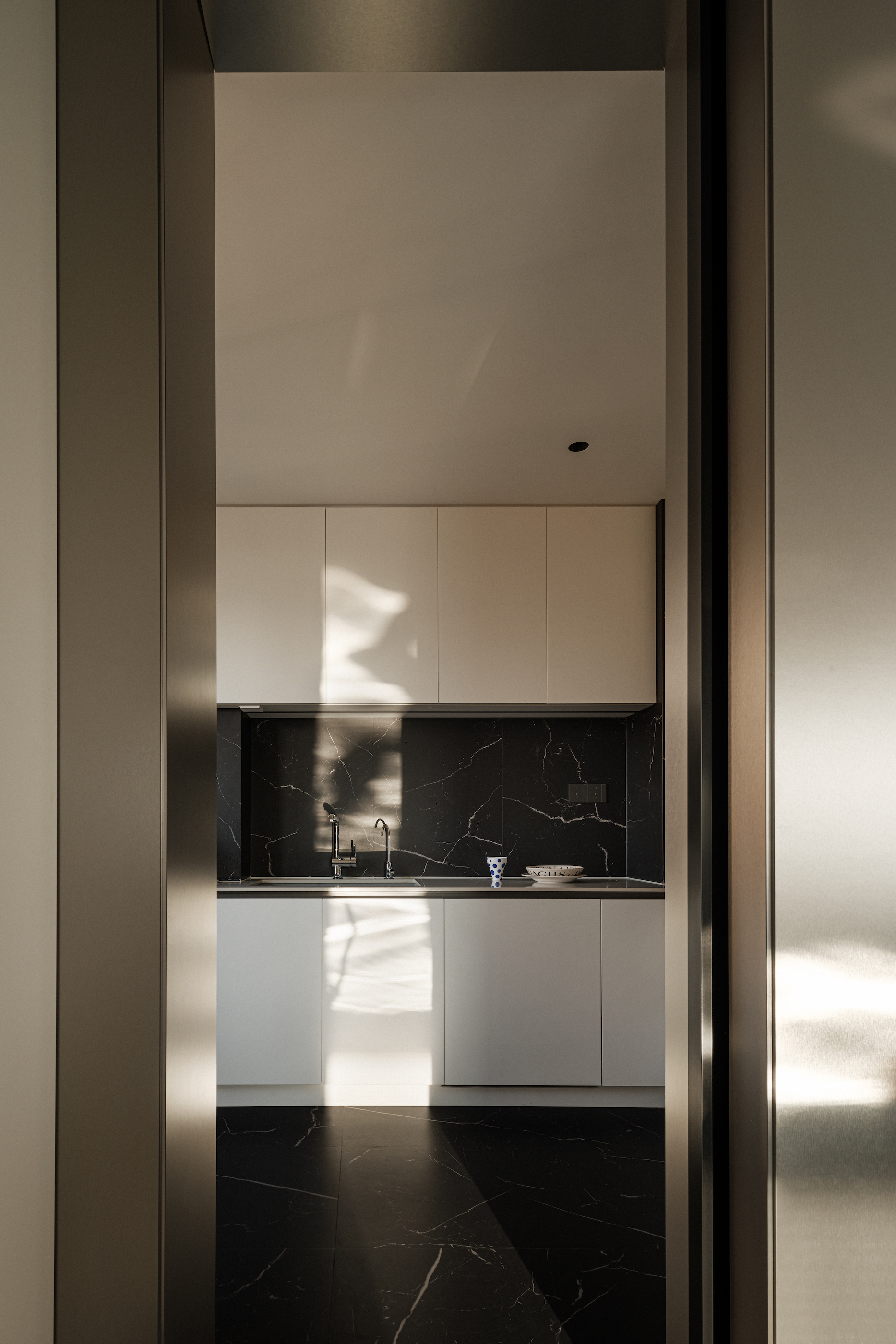 本案主要采用大量天然石材、金属拉丝门板、岩板等材质,整体提倡质感轻奢、但线条极简,强调功能实用主义的前提,呈现出别具个性的美学状态。