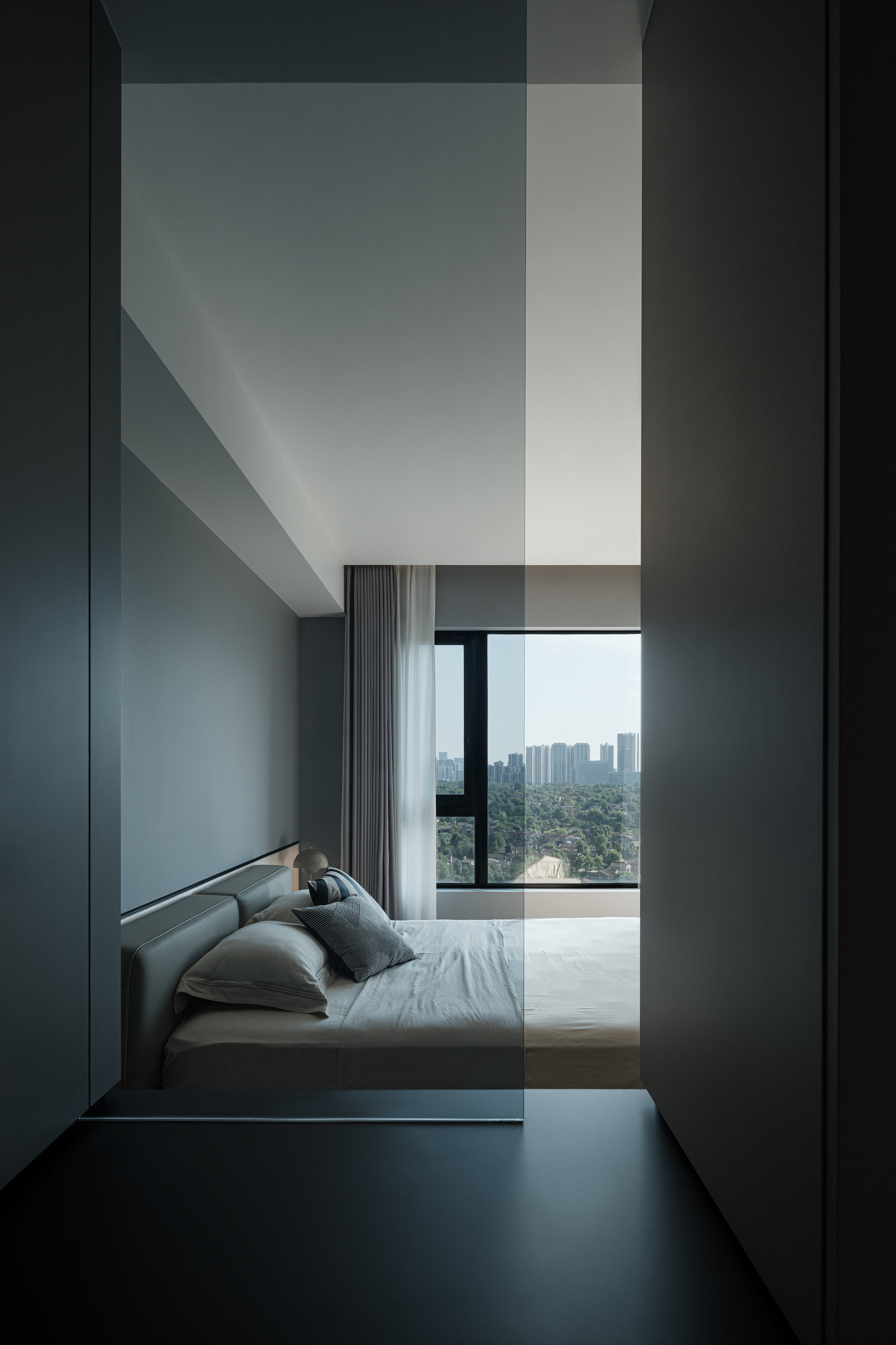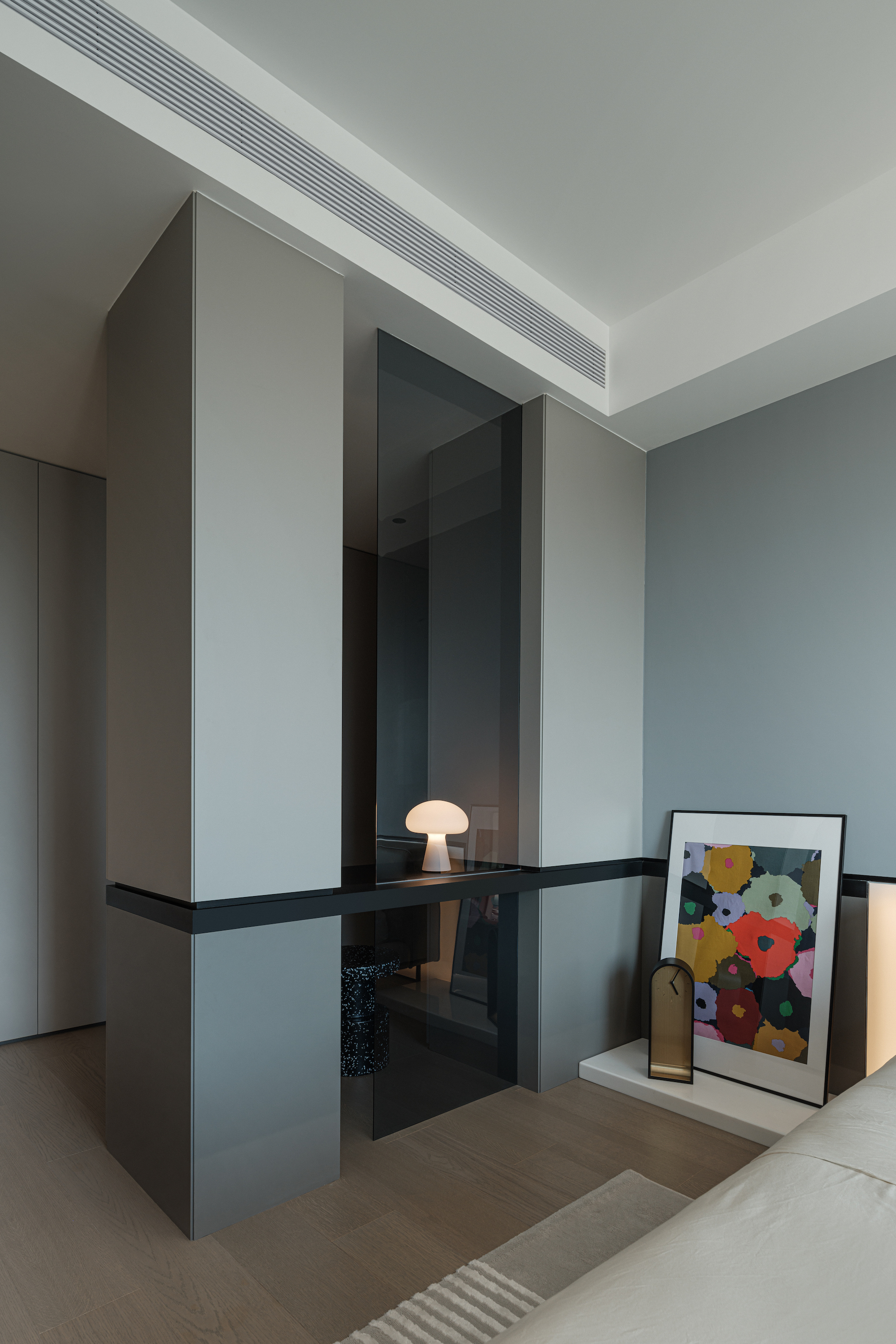 同时蒋地面材质延伸至就寝区,巧妙的解决了干湿分区,功能分区的刻意化,僵硬化。