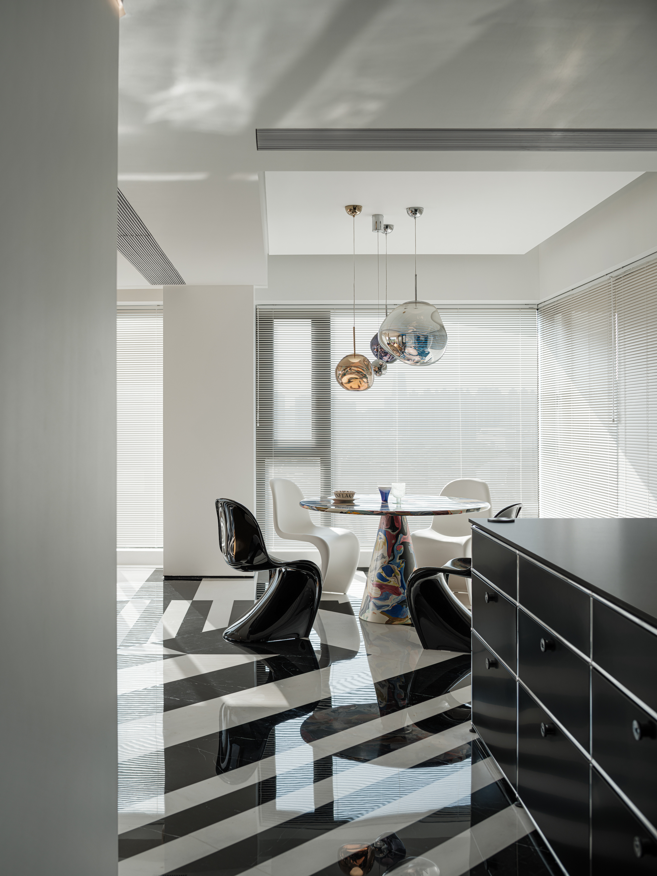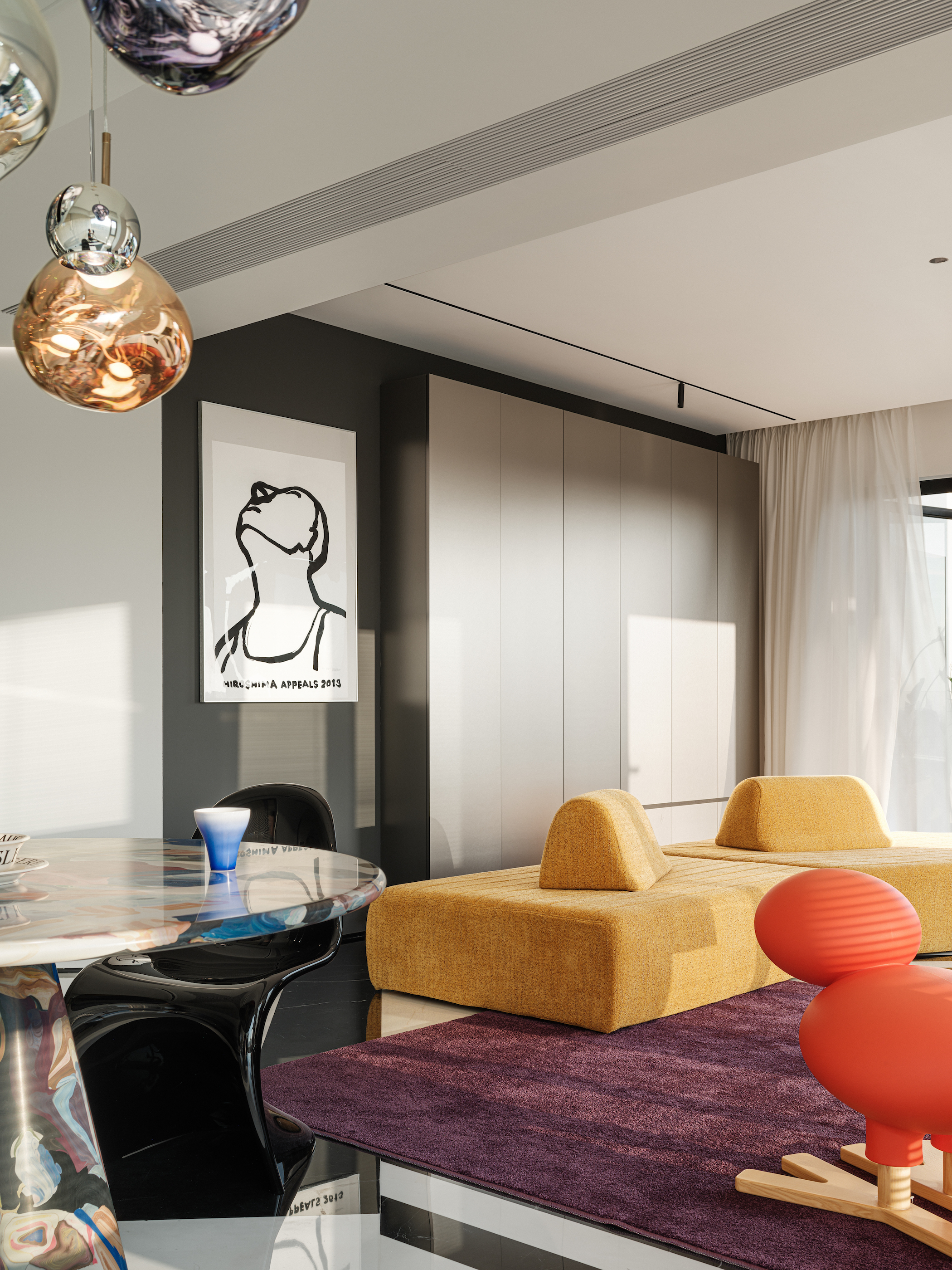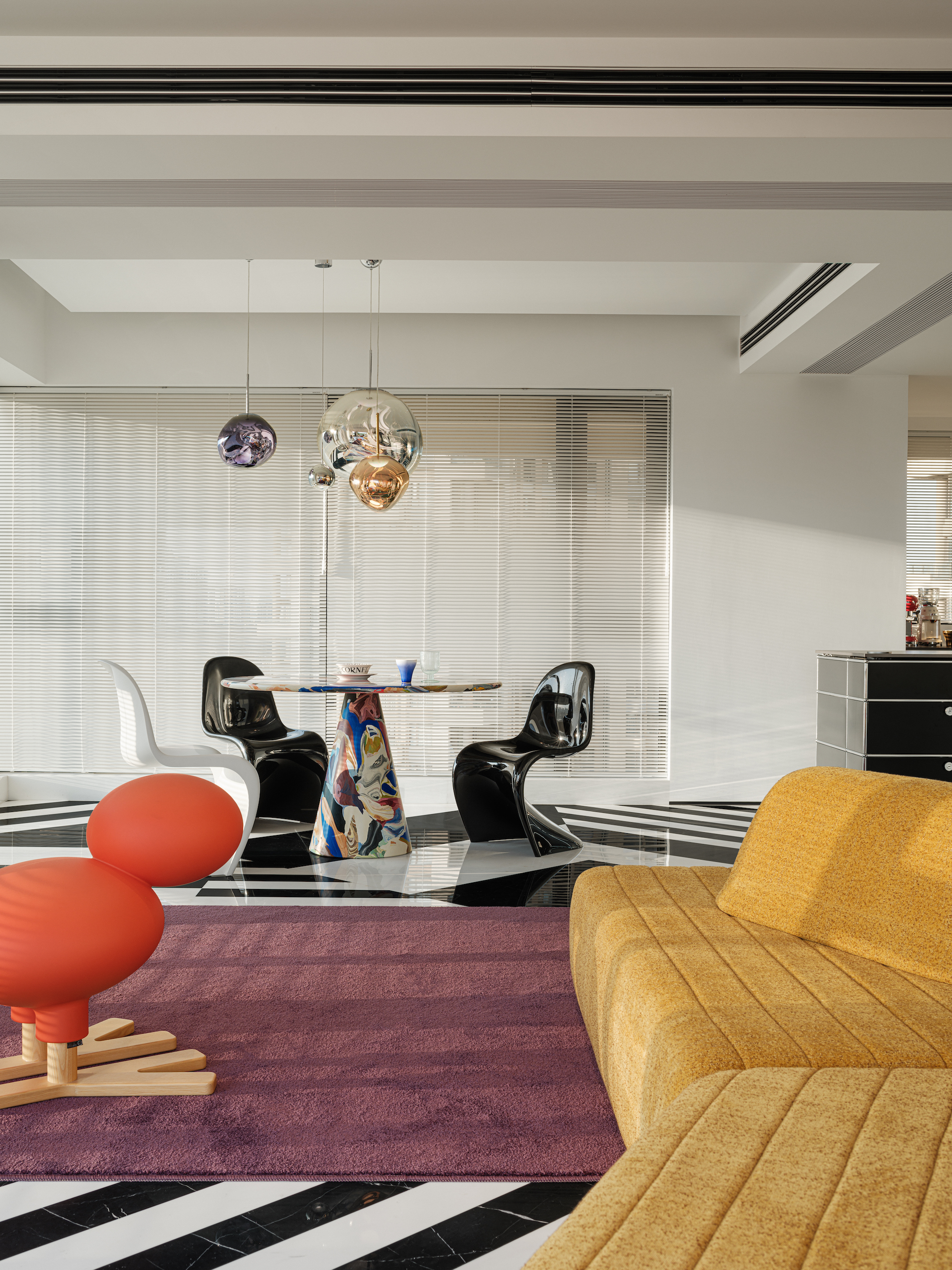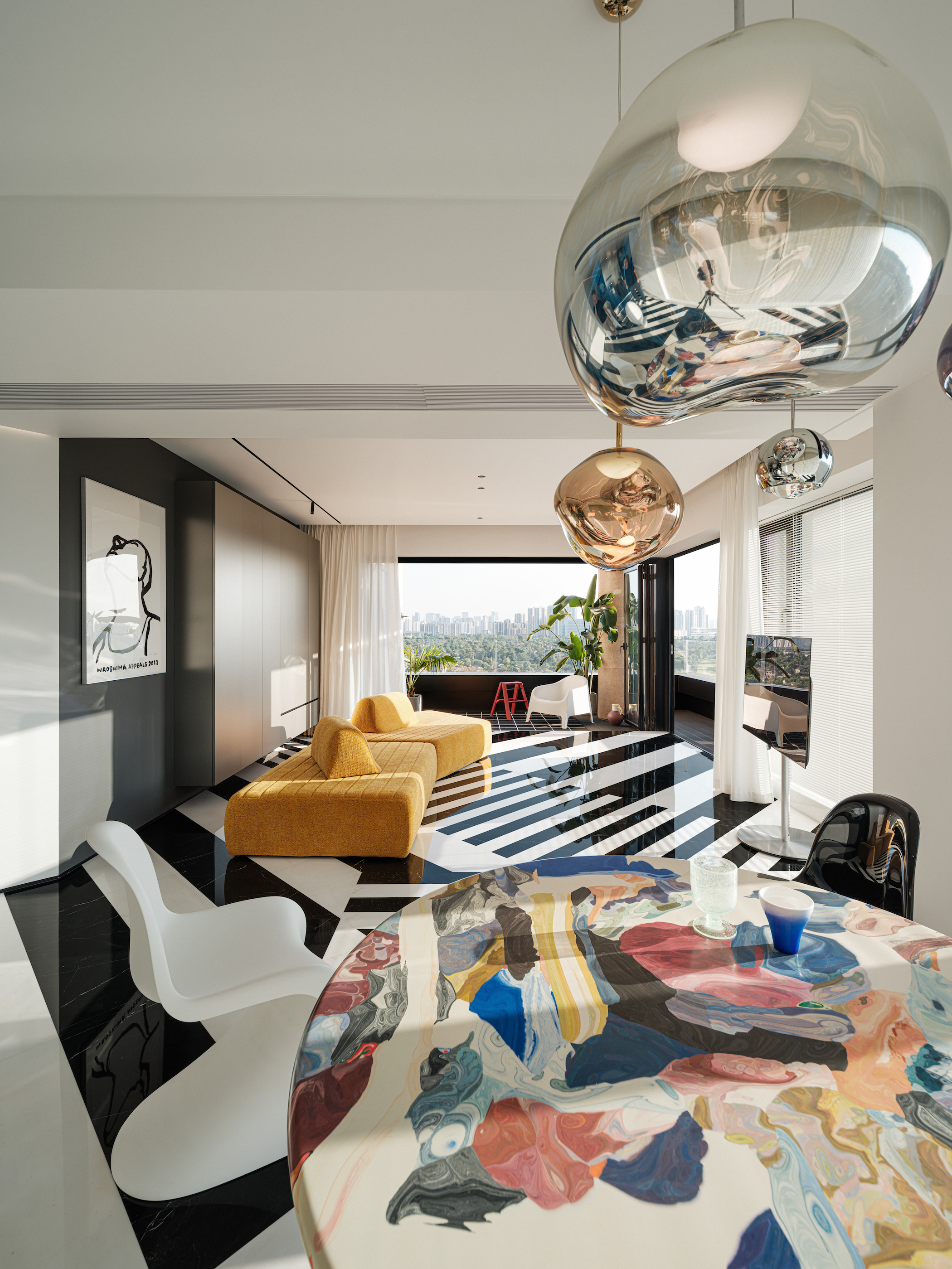 不同区域中的艺术单品皆可根据生活状态进行换移陈设,各角落位置均能感受不一样的景致风景。白条纹的延伸视觉将餐厅融合囊括,让公共区域之间存在于整体关系之中。看得到风景的餐厅已经足够让人沉浸其中、无为而治。再经过Kooij Meltingpottable 3d熔炉餐桌、TomDixon熔岩吊灯、VitraPantonchair潘通椅搭配后的氛围加持,丰盈立体的形态中仿佛被注入完整的生命活力,为生活构建出一段置身于彩色盛会中的浪漫对话。