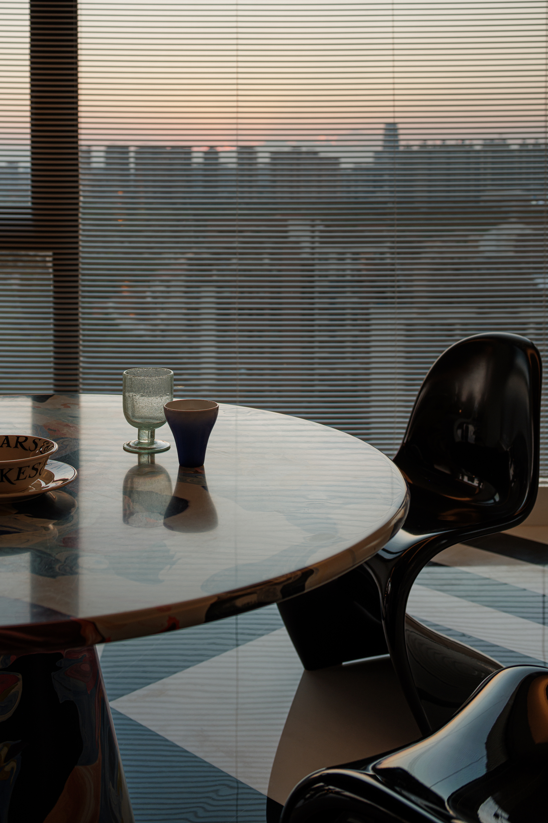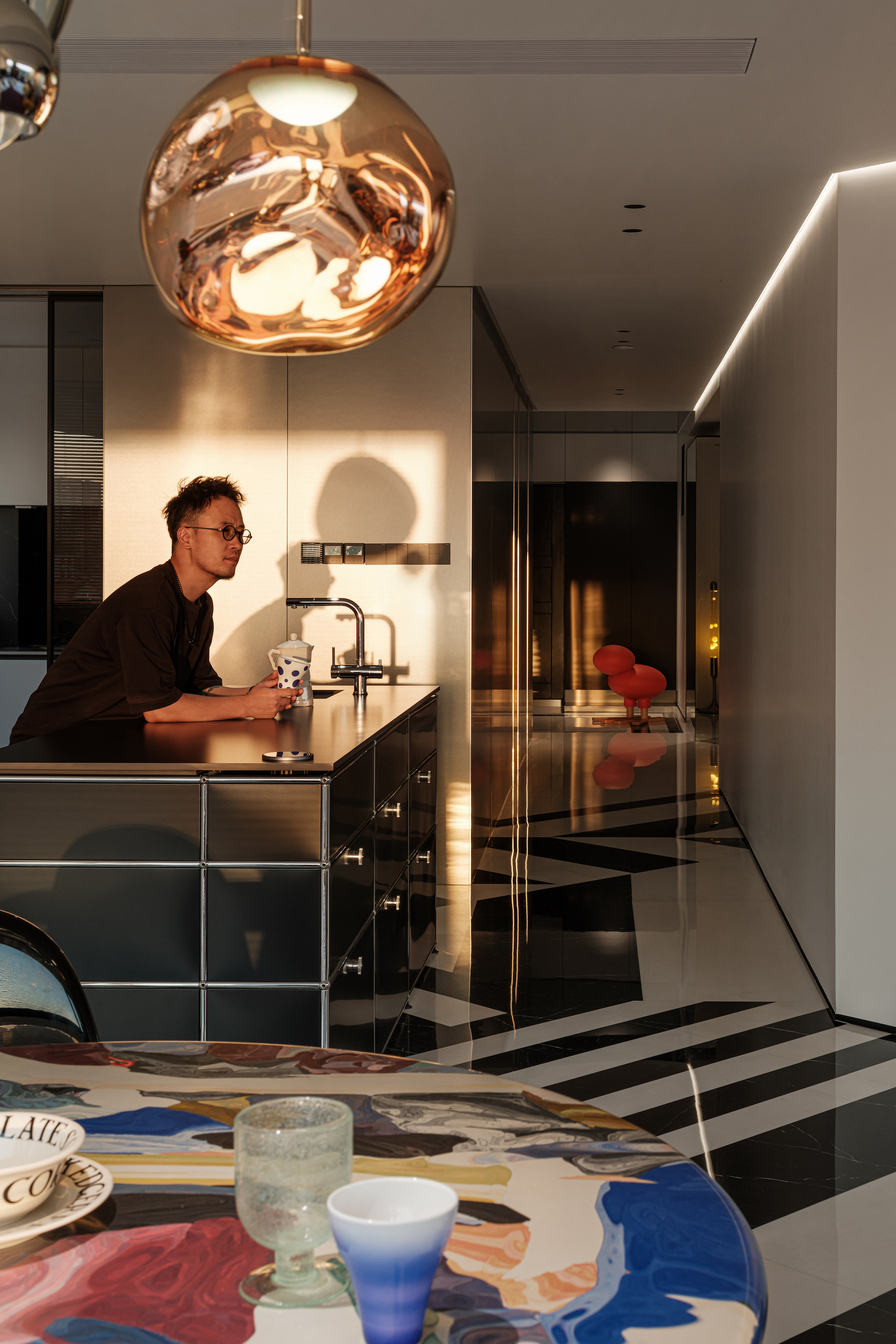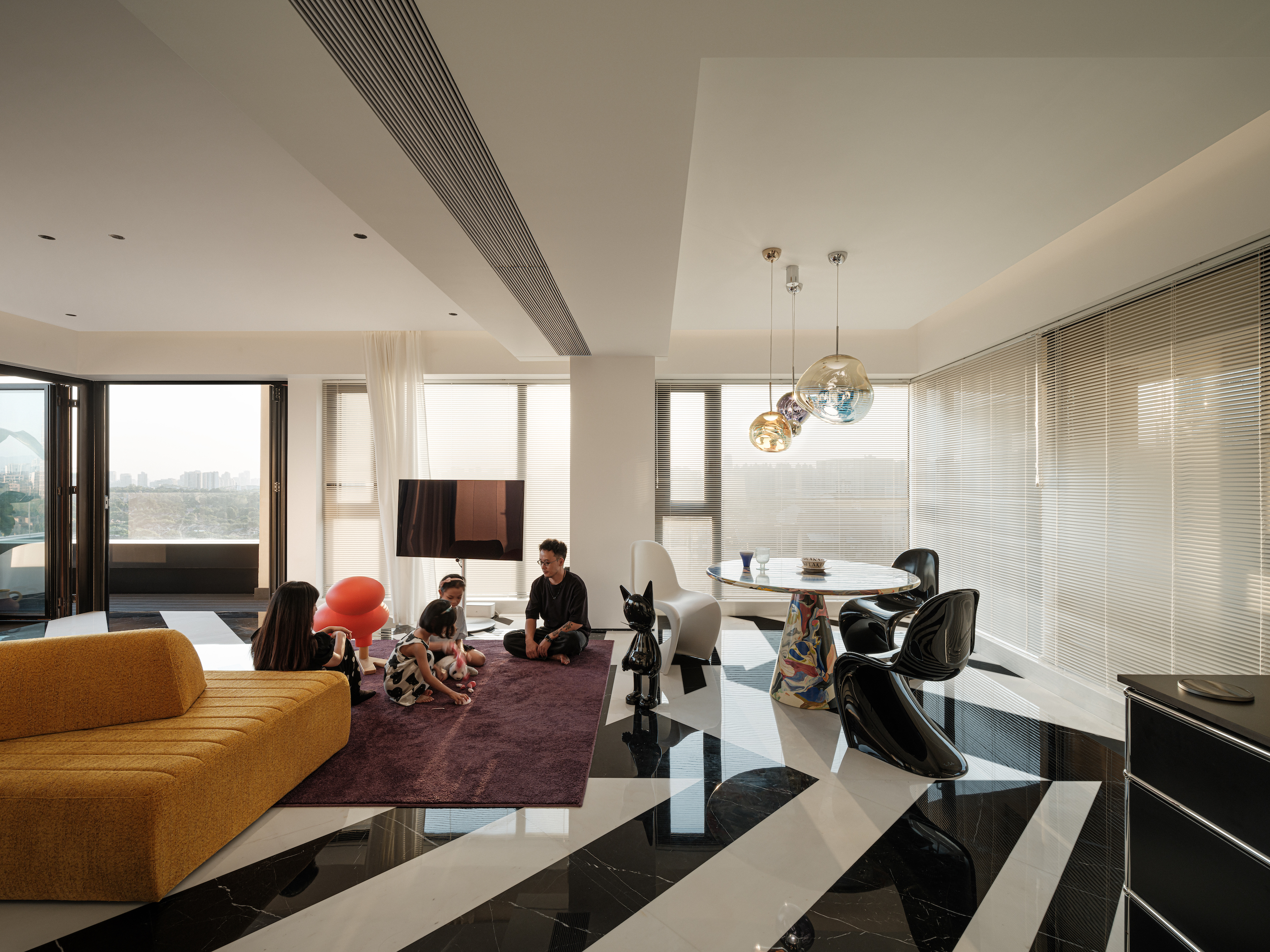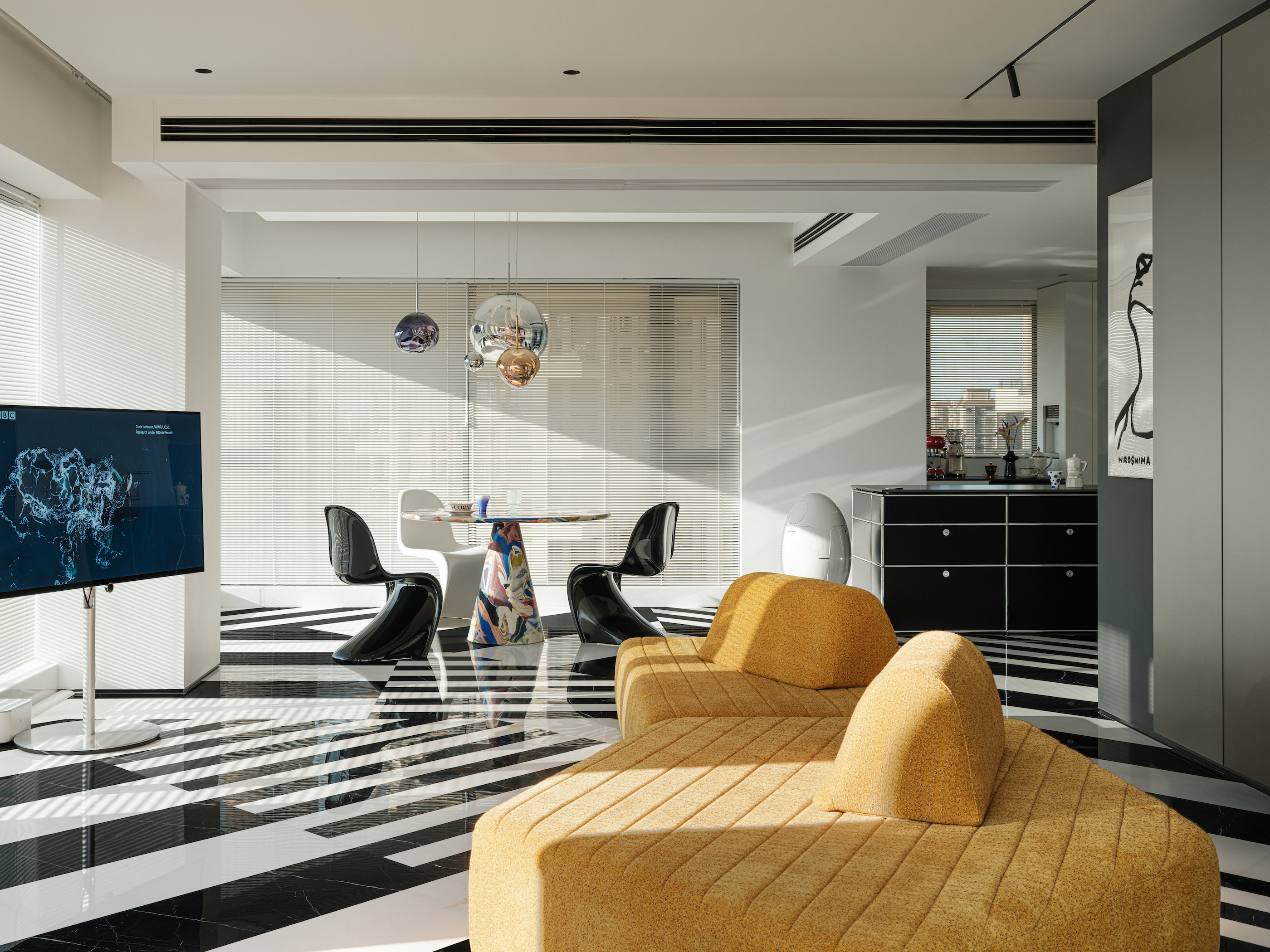 不同区域中的艺术单品皆可根据生活状态进行换移陈设,各角落位置均能感受不一样的景致风景。白条纹的延伸视觉将餐厅融合囊括,让公共区域之间存在于整体关系之中。看得到风景的餐厅已经足够让人沉浸其中、无为而治。再经过Kooij Meltingpottable 3d熔炉餐桌、TomDixon熔岩吊灯、VitraPantonchair潘通椅搭配后的氛围加持,丰盈立体的形态中仿佛被注入完整的生命活力,为生活构建出一段置身于彩色盛会中的浪漫对话。