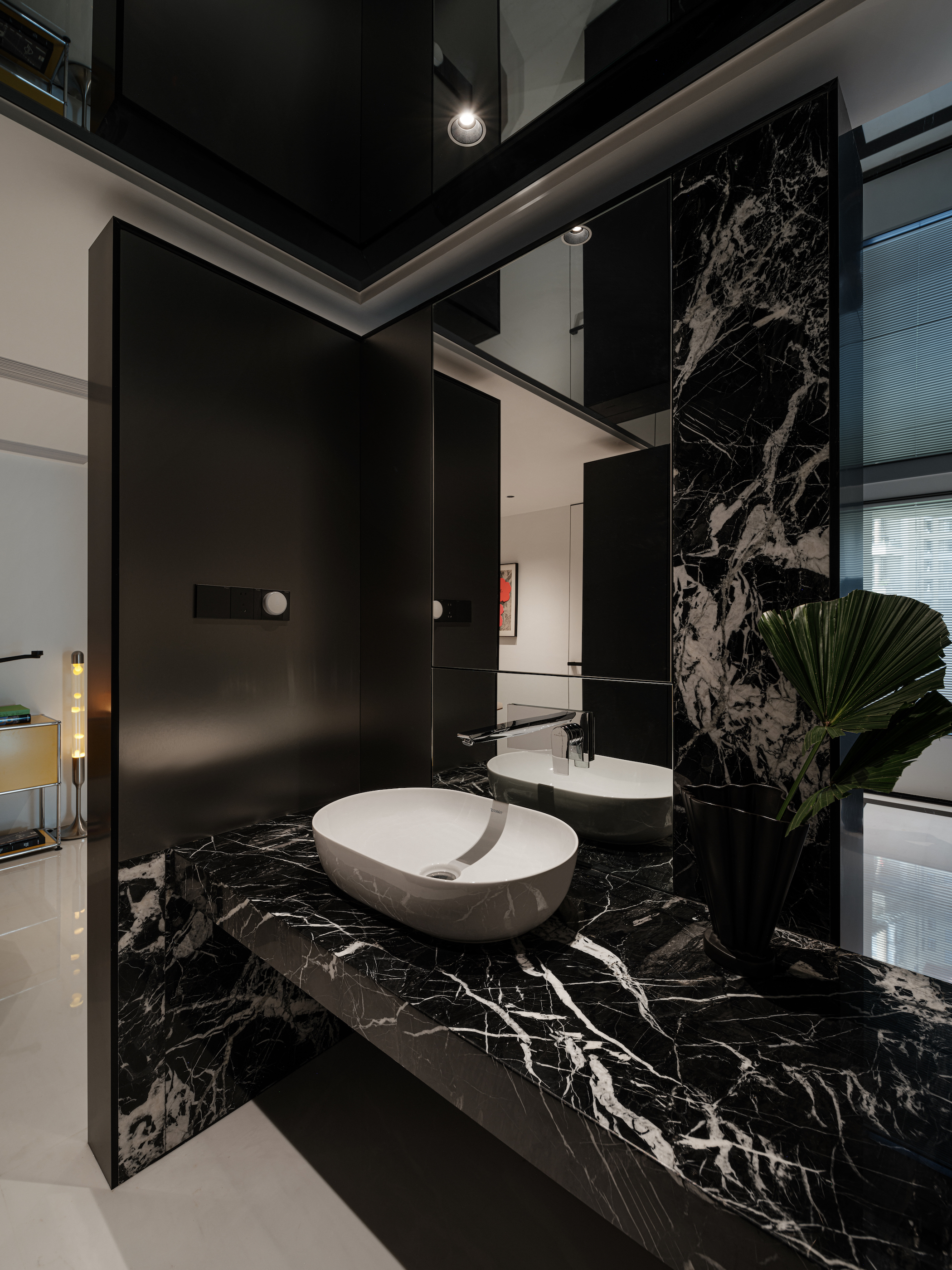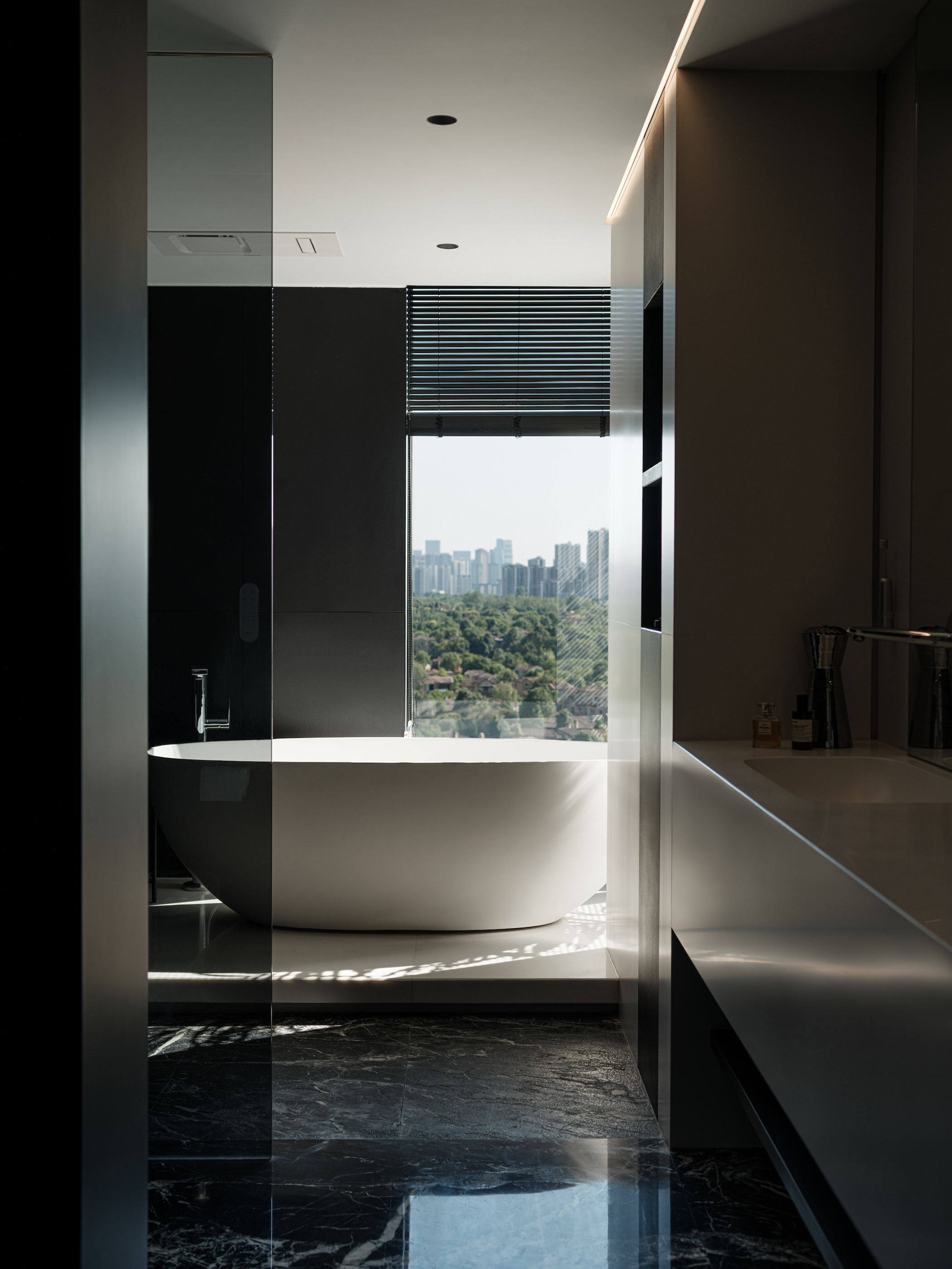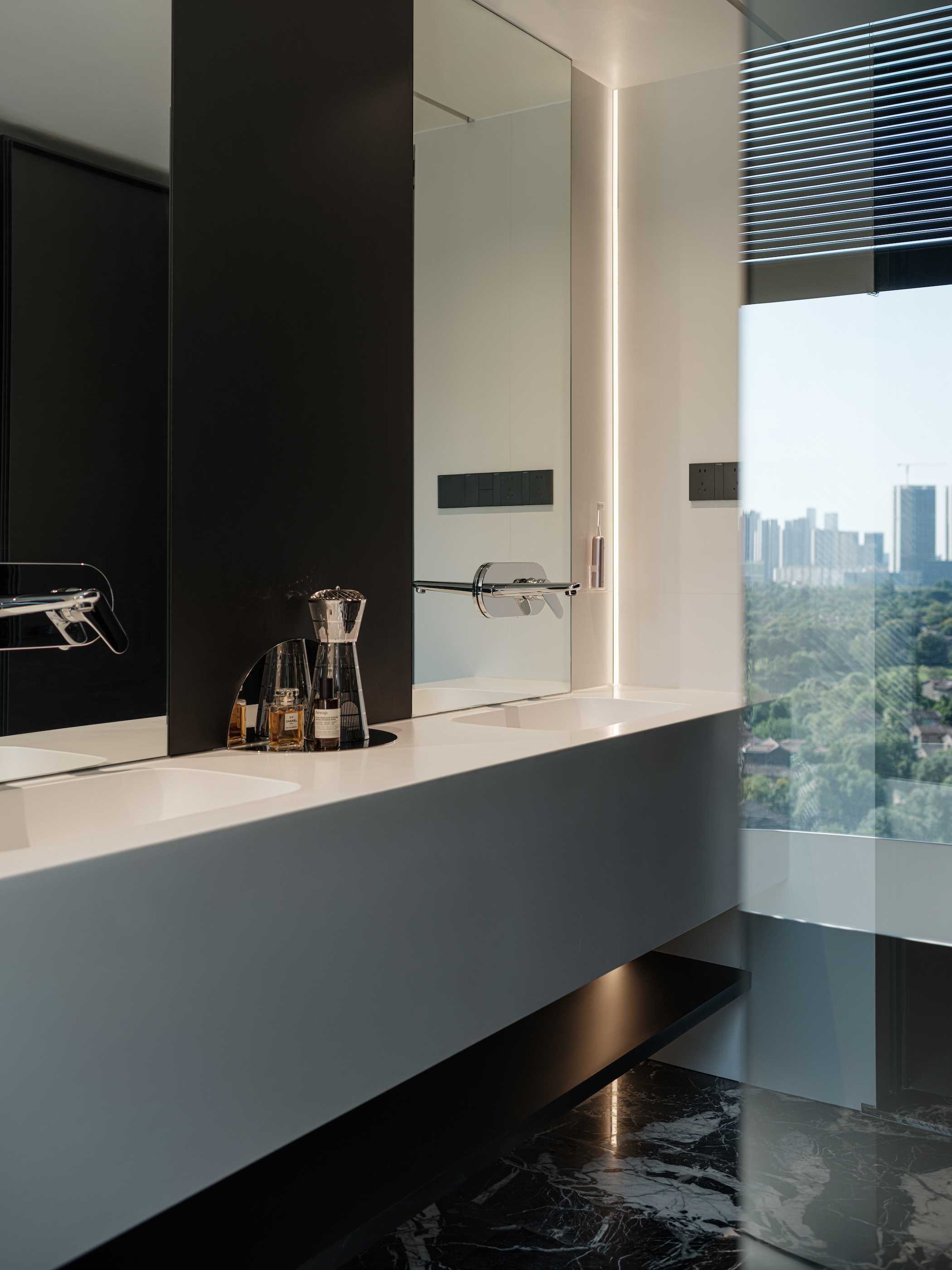 重新整合次卫生间与两间次卧的布局关系,重构出一个全新的公共活动区域,放大空间视觉,优化生活动线。干区释放于外部,通过离缝设计与四周功能区域进行衔接。纹路纯粹灵动的宝格丽黑岩板搭配镜面材质,进一步增强空间的超现代氛围,彰显出精致的审美品位与格调。