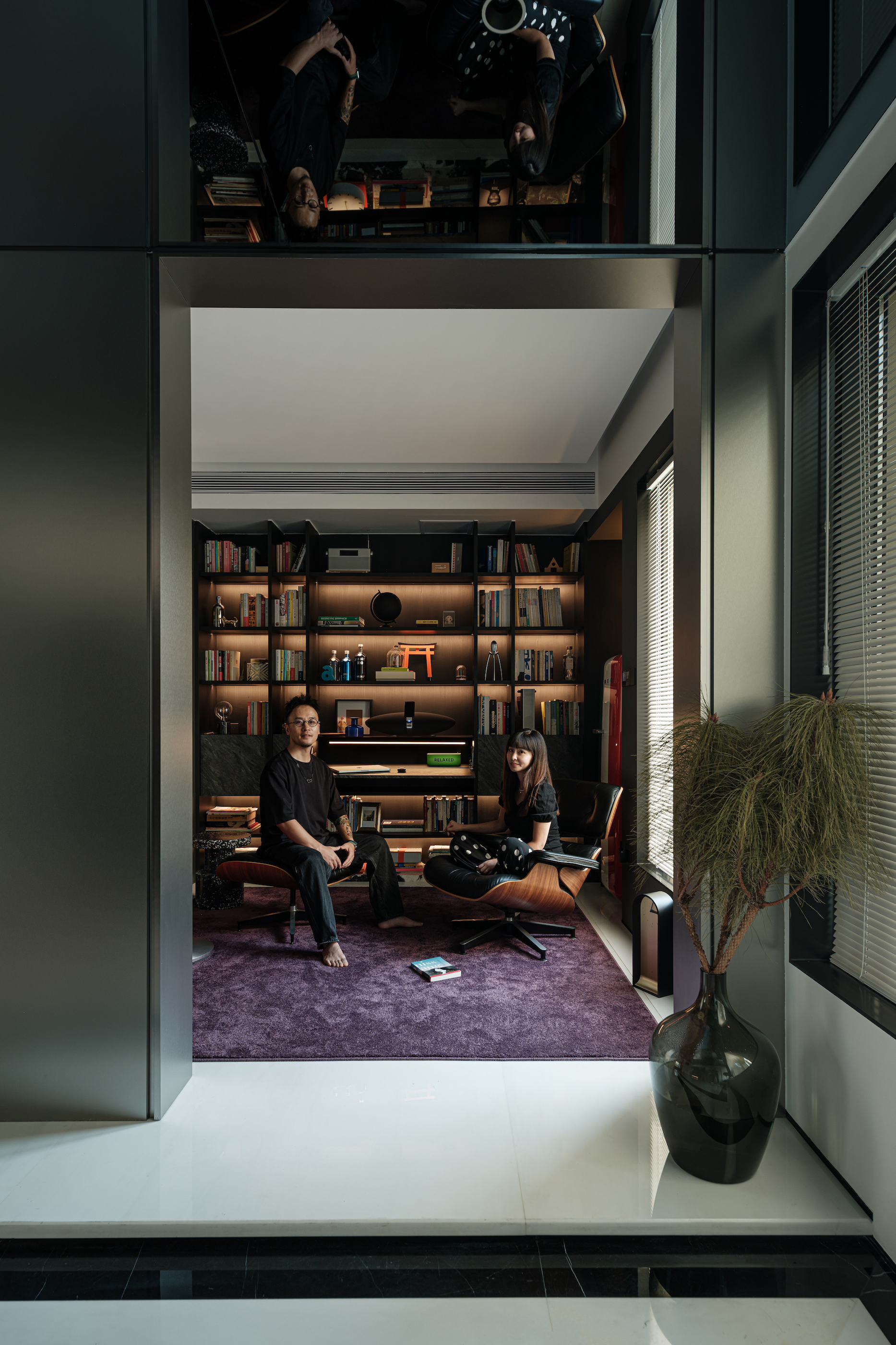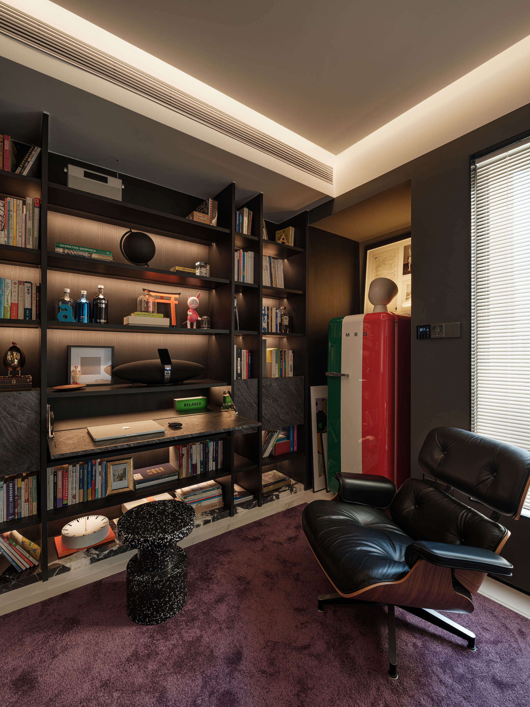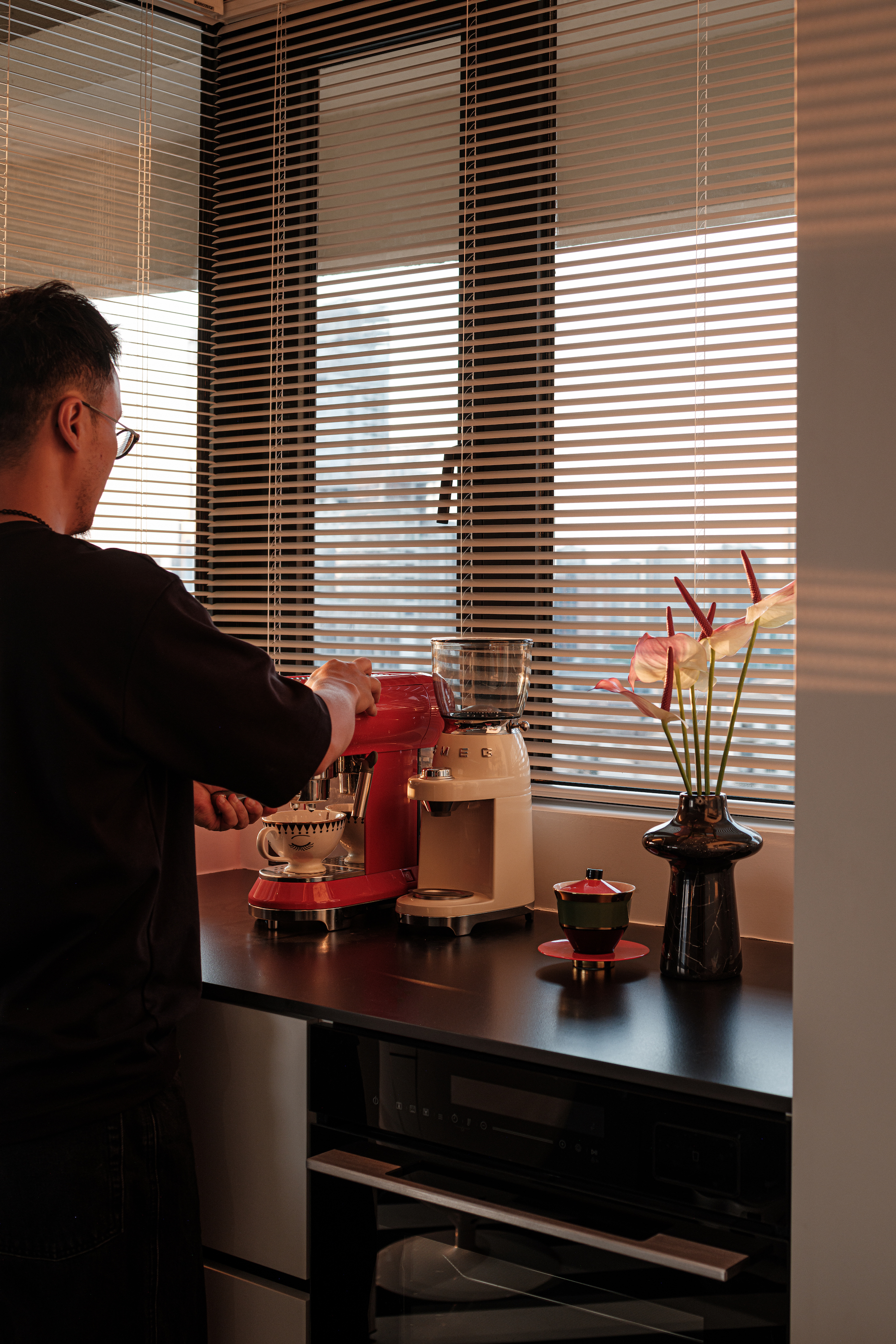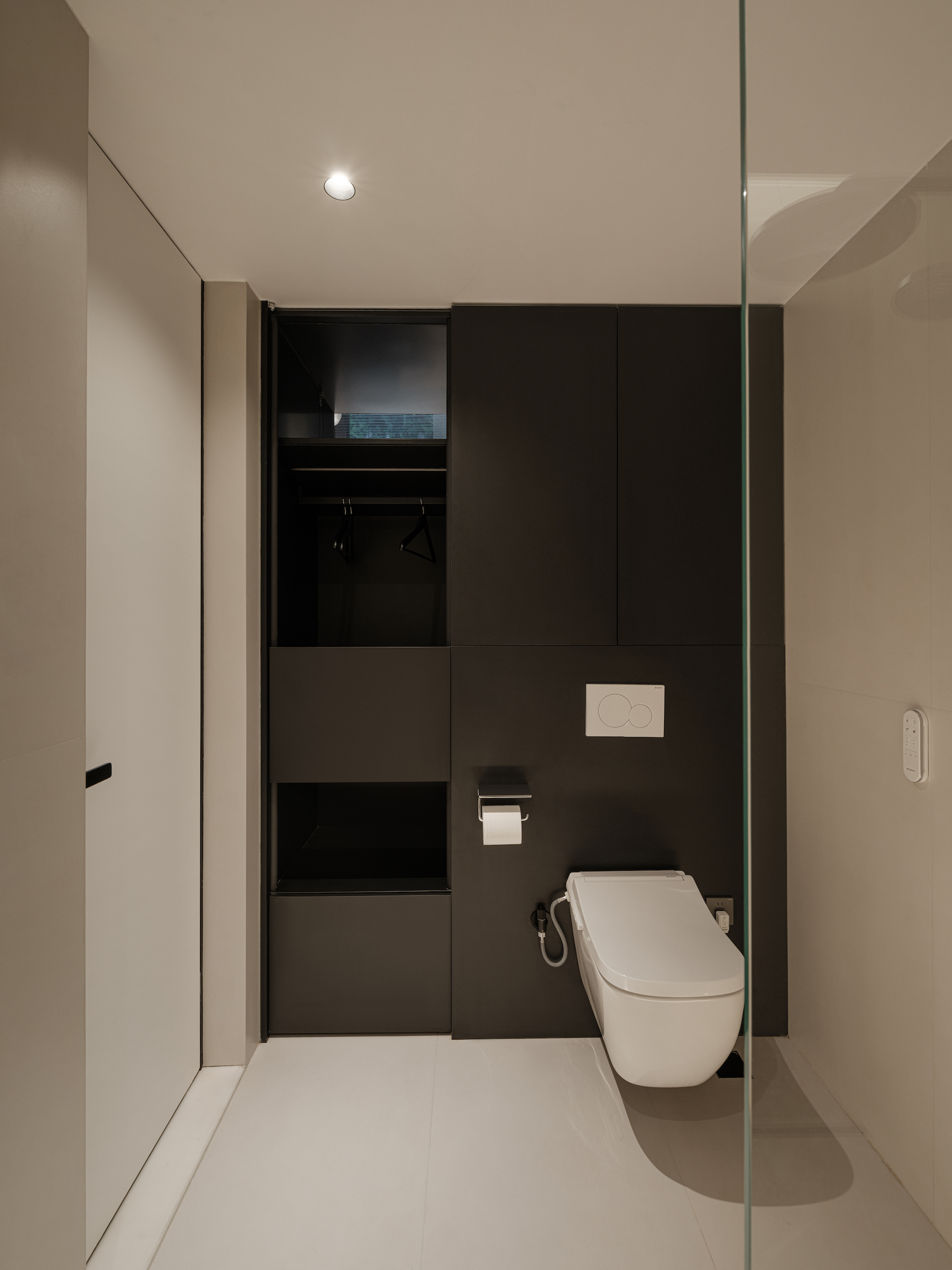 重新整合次卫生间与两间次卧的布局关系,重构出一个全新的公共活动区域,放大空间视觉,优化生活动线。干区释放于外部,通过离缝设计与四周功能区域进行衔接。纹路纯粹灵动的宝格丽黑岩板搭配镜面材质,进一步增强空间的超现代氛围,彰显出精致的审美品位与格调。