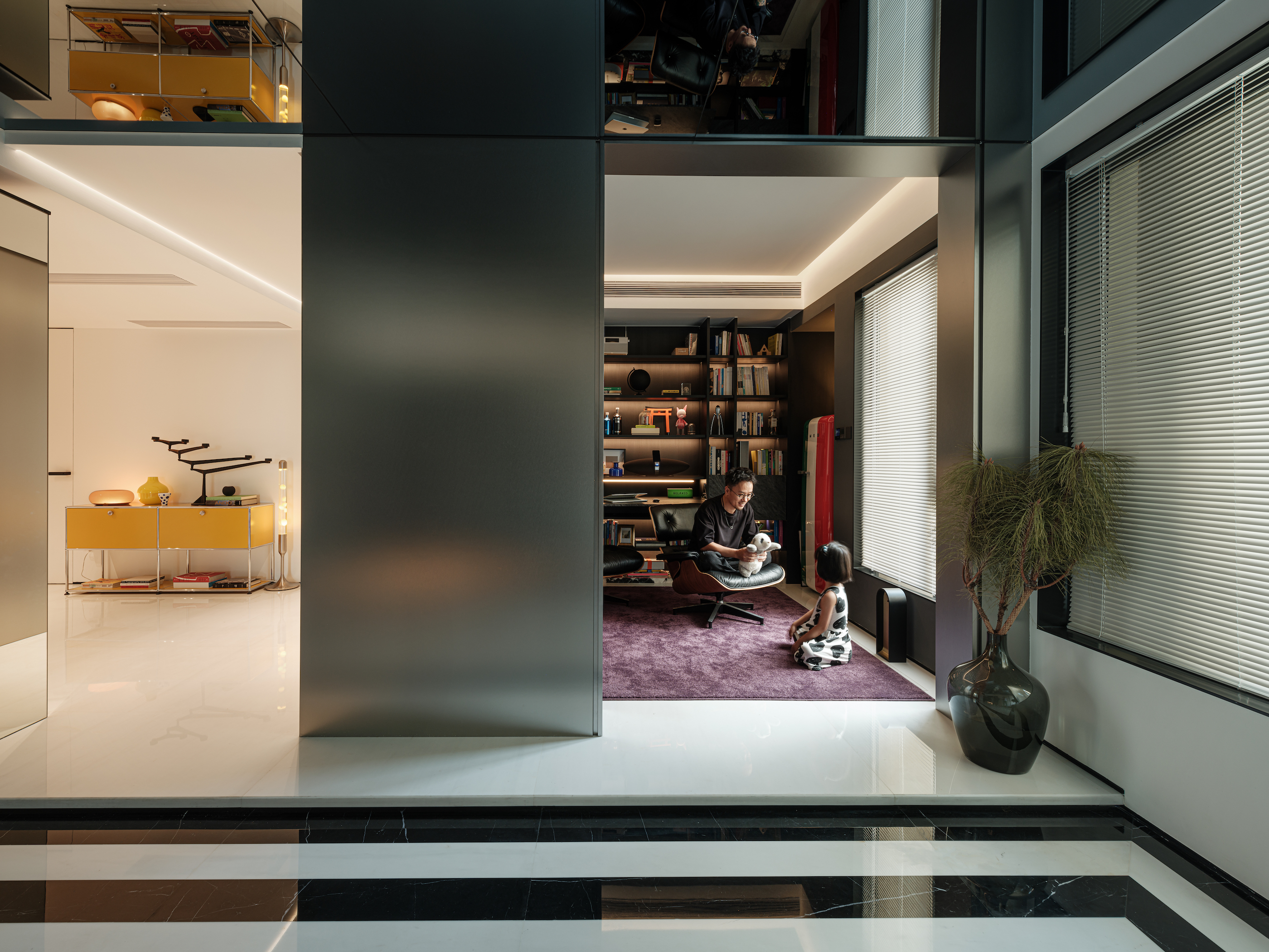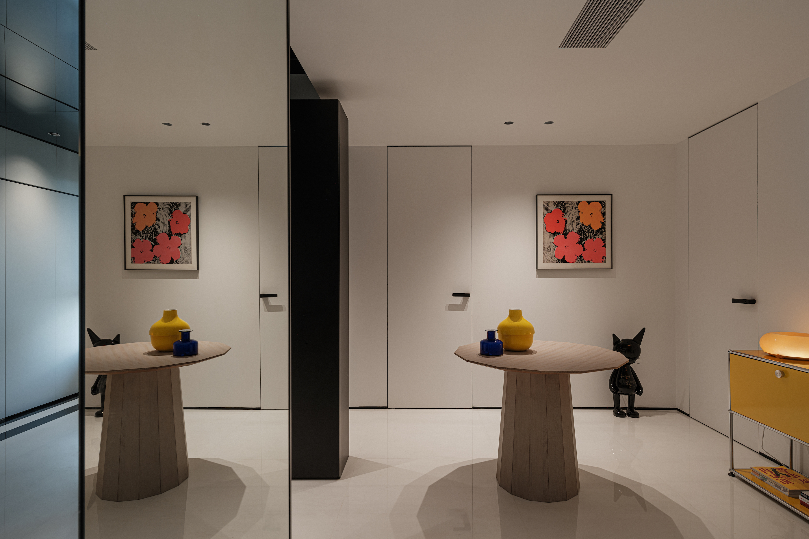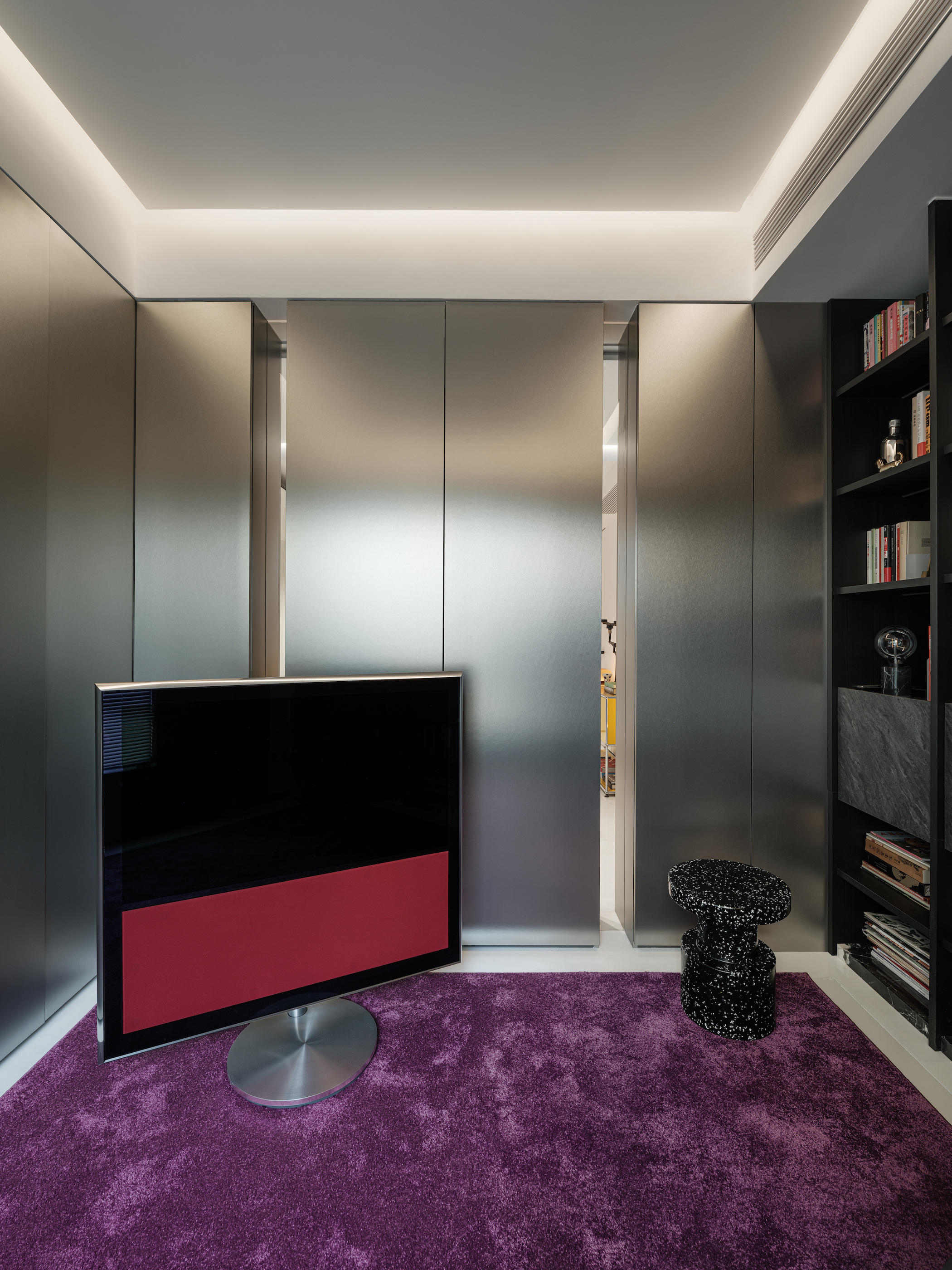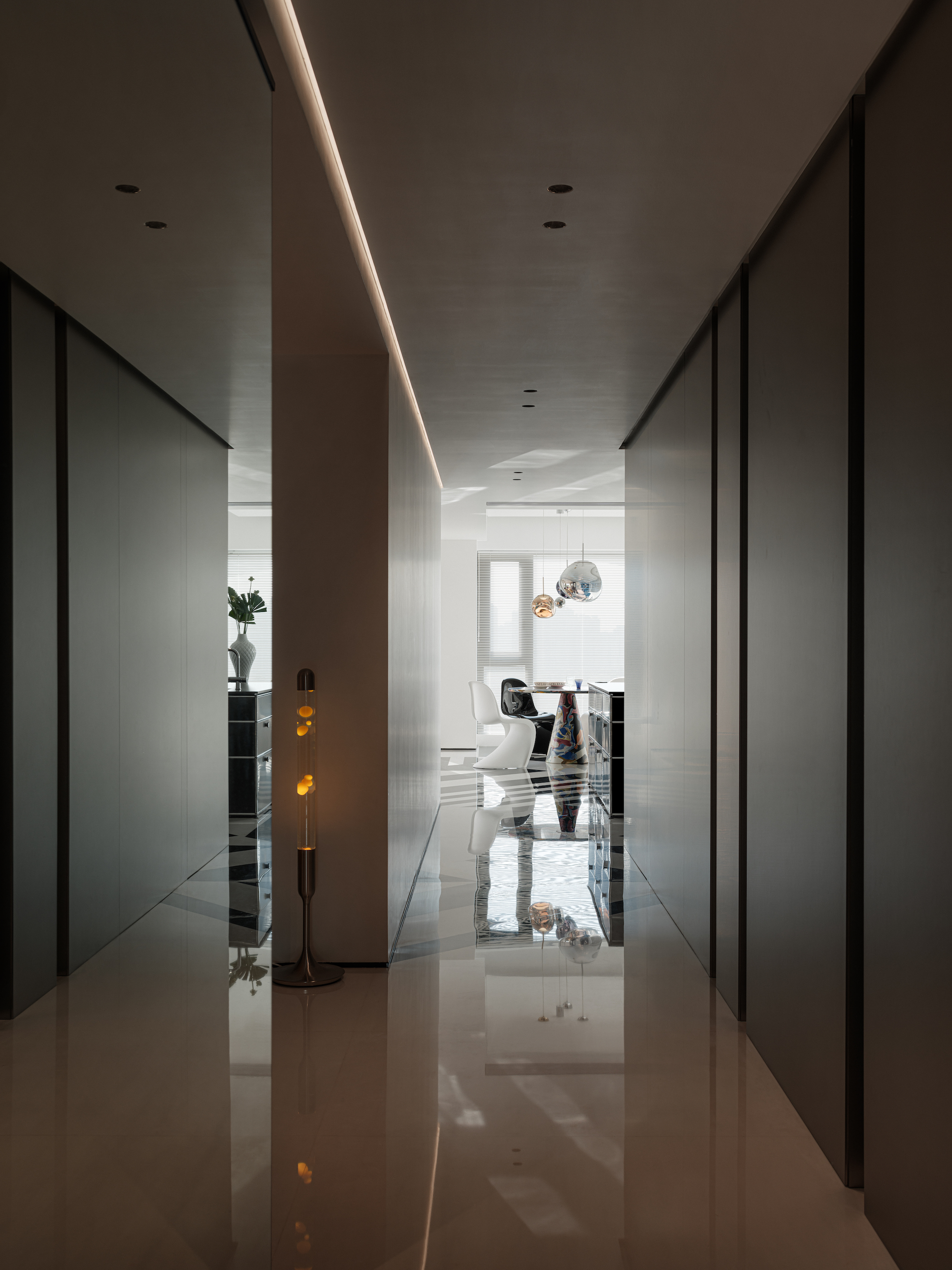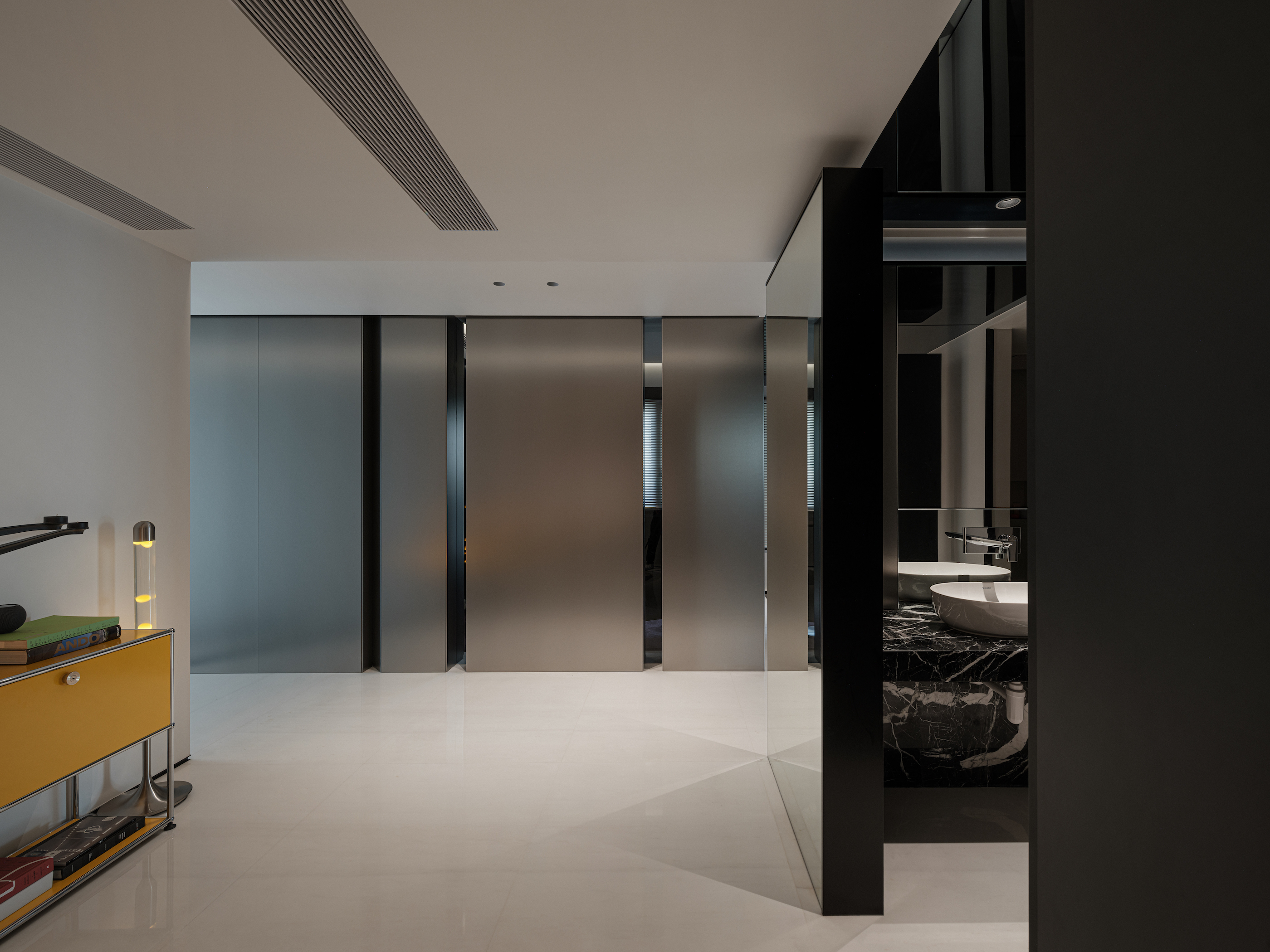 以L型银色金属储物柜离缝连接的形式作为与走廊、入户区域分隔的介质,既隐形储物又散发出一种超越现实的未来感气氛。