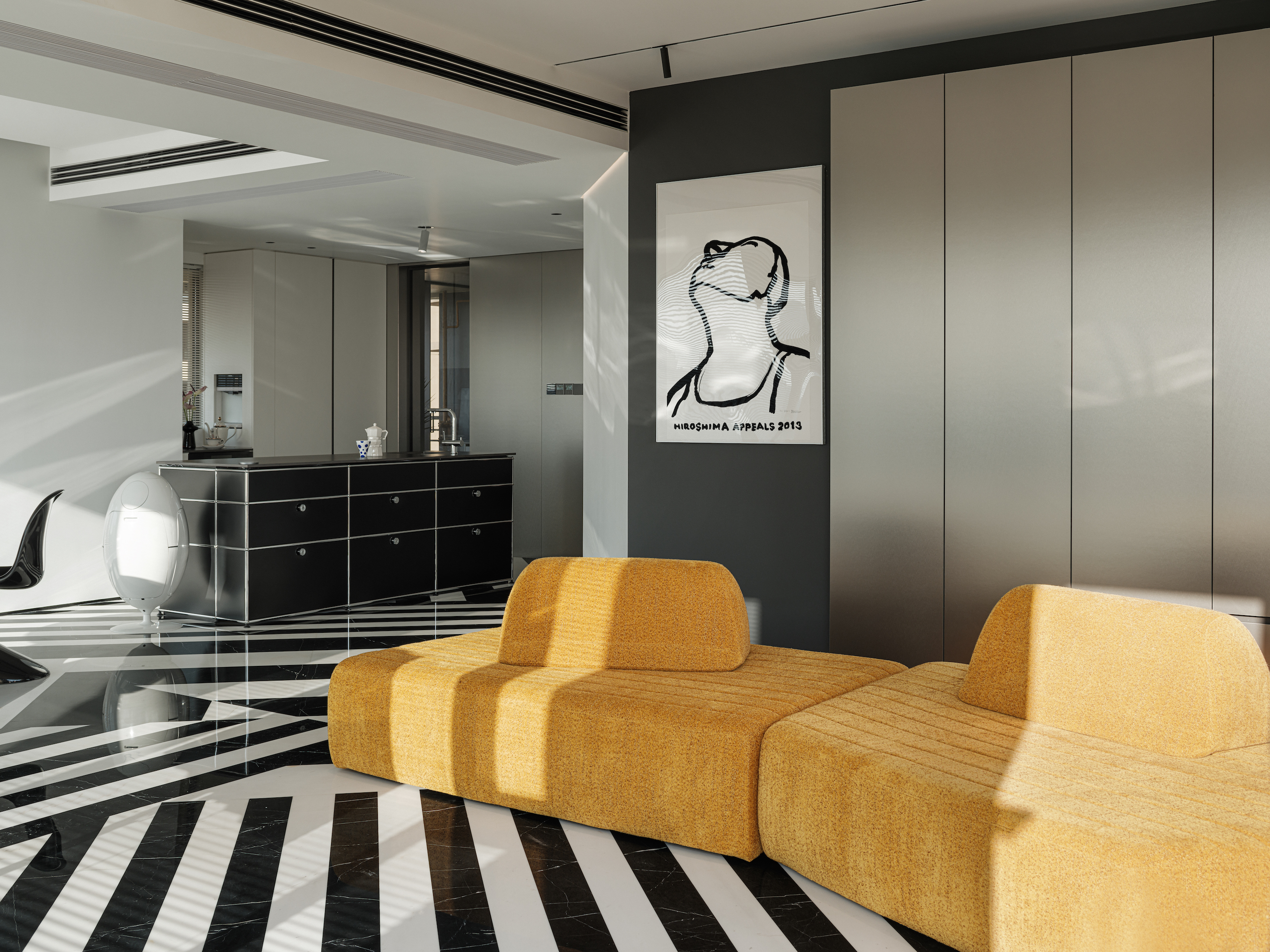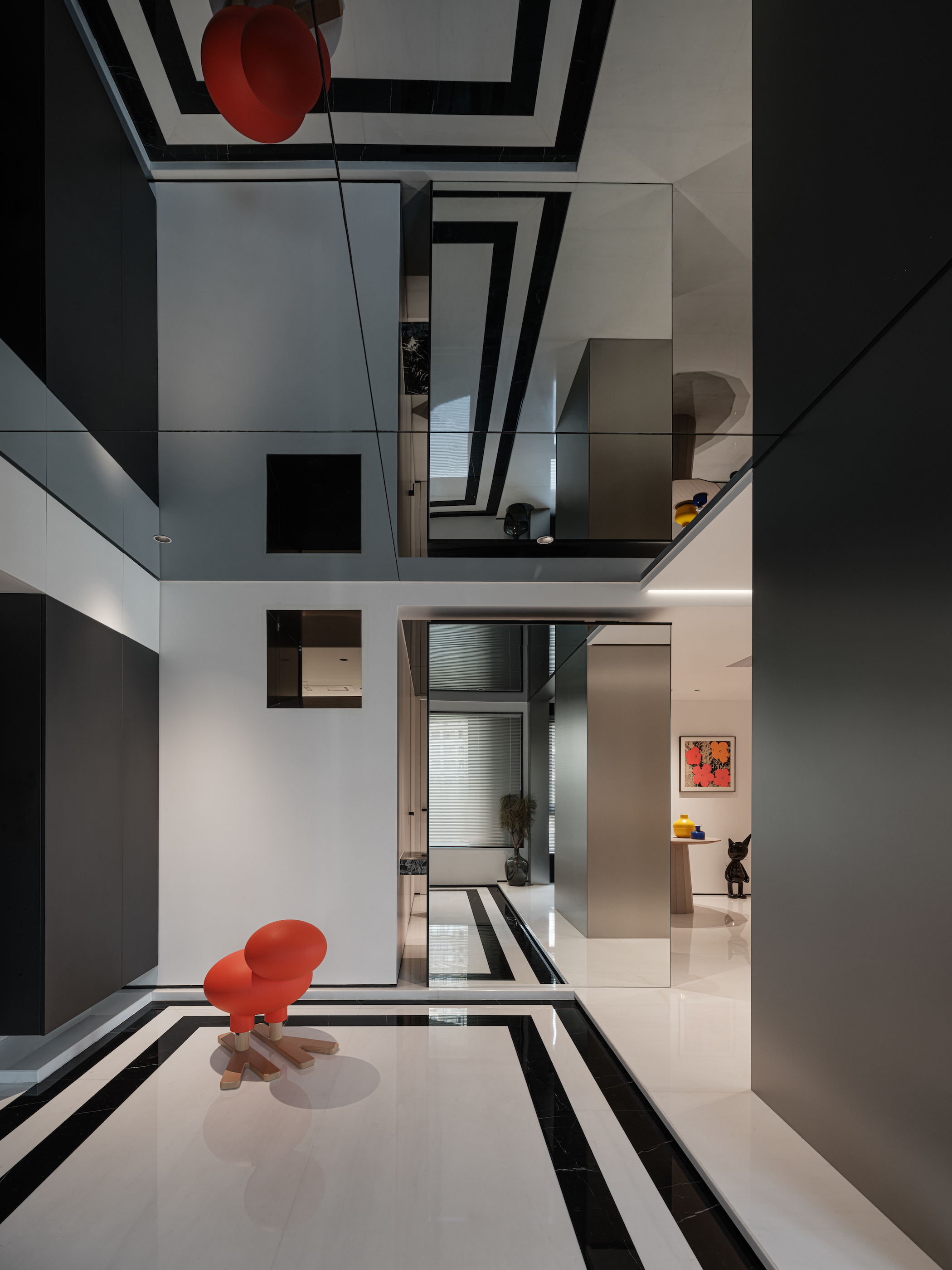 从玄关入户开始黑白条纹石材经过切割再拼接为不同的视觉形状,形成独特的装饰效果,营造出极富有张力的延伸质感。
