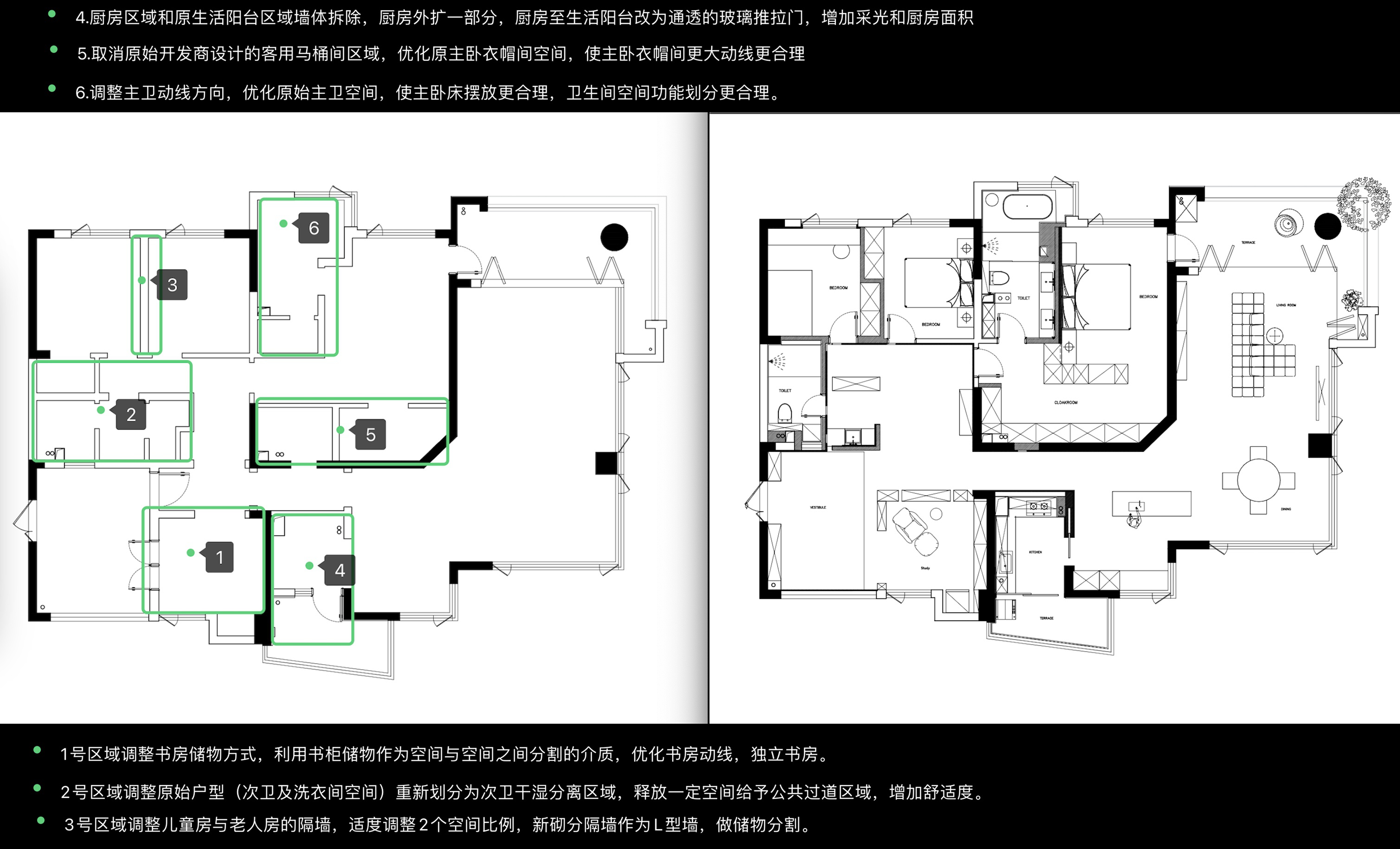 1.进门正对玄关房间【1号区域】改为书房储物方式,利用书柜储物作为空间与空间之间分割的介质,优化书房动线,独立书房。