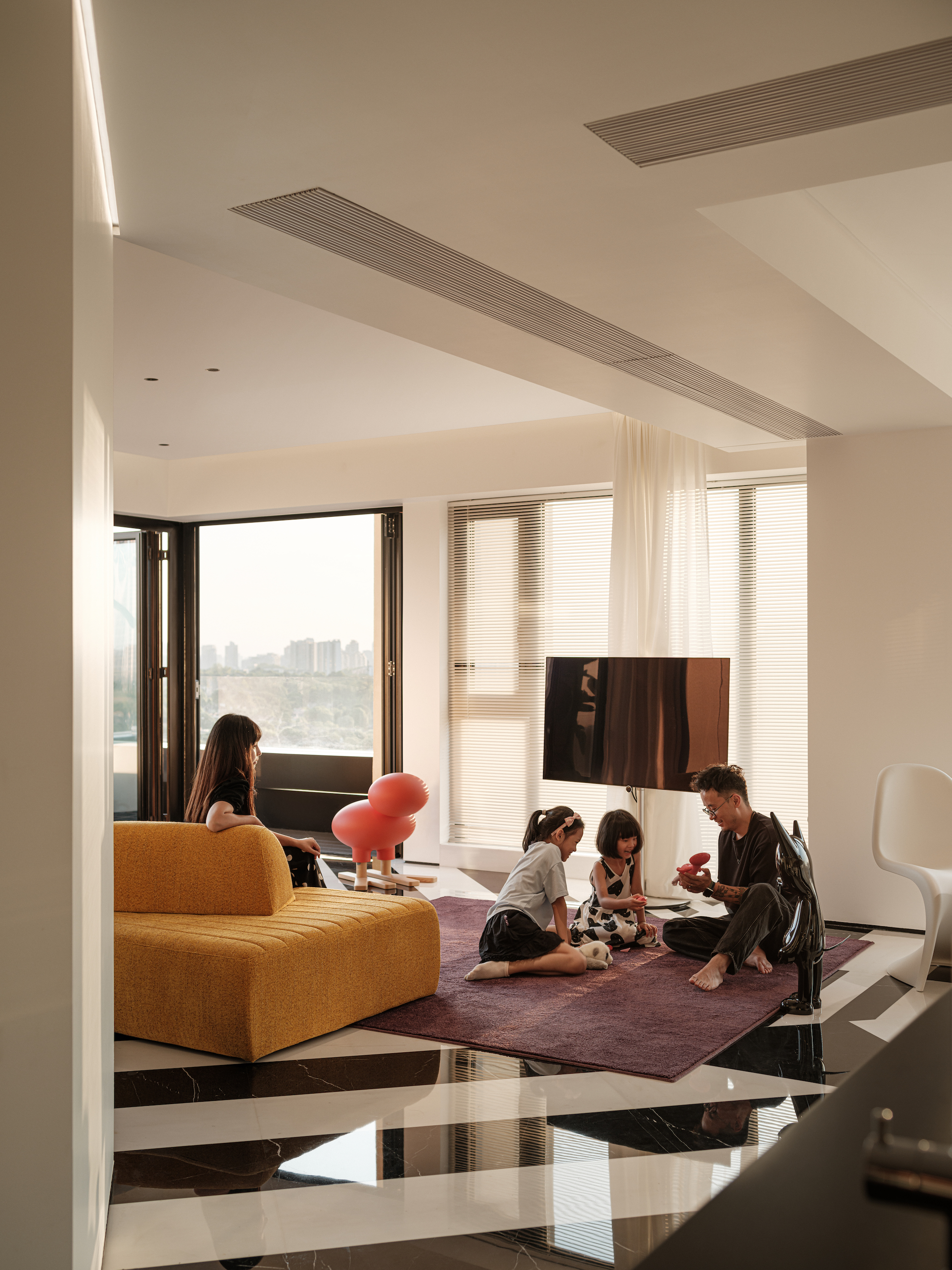 在奠定整体色调属性后,空间点缀金属储物柜、落地电视、玳瑁黄模块沙发,细腻的材质与自然光线牵引变幻,冷暖适中。沙发的设计灵感来自四面环海的岛屿,低矮可变化的功能,以此实现自由组合的开放式交互生活。