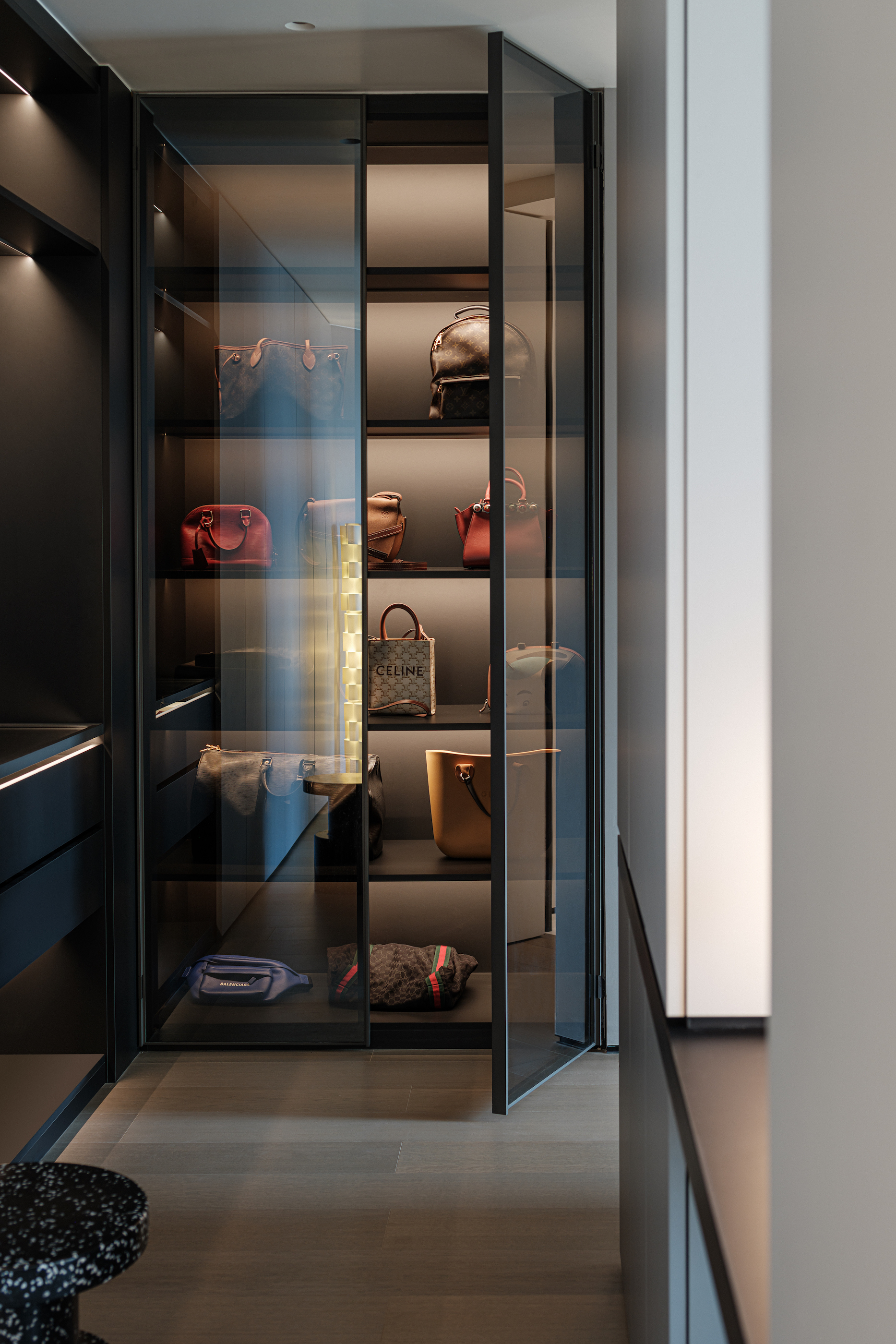 本案中多处采用离缝设计,充分释放各角度视角。需要提前考虑柱体的稳定性、贴皮后的厚度对视觉的影响以及玻璃内夹等细节收口。尺寸上反复与工程团队及定制团队确认磨合,确保贴面齐整,让立面及顶部融入镜面、金属,可替代全身镜功能的同时,其反光效果能够增强室内光线,让空间更加开阔通透。不同的材质形成蜿蜒动态的流动美学,游走于其间,如梦似幻。