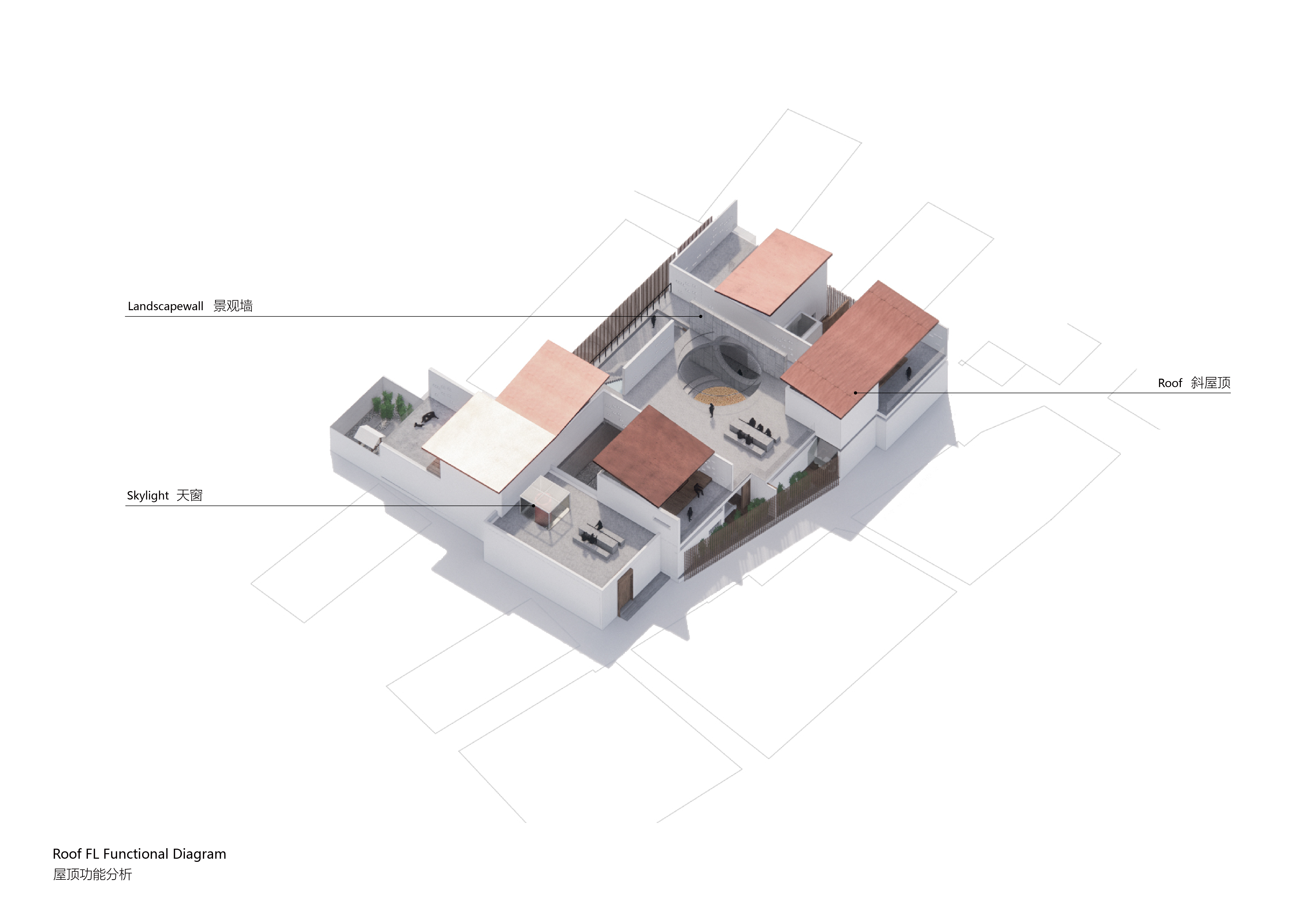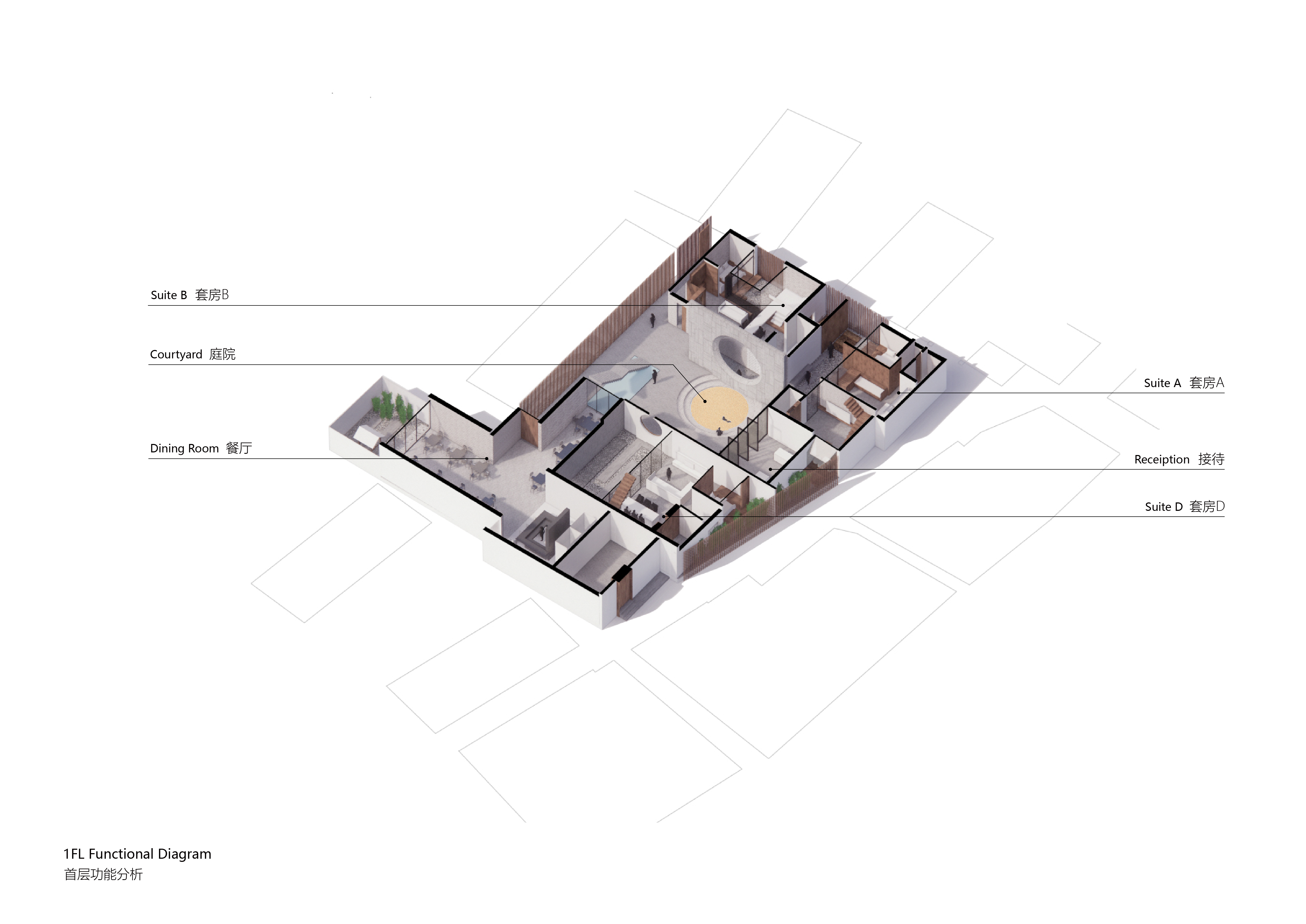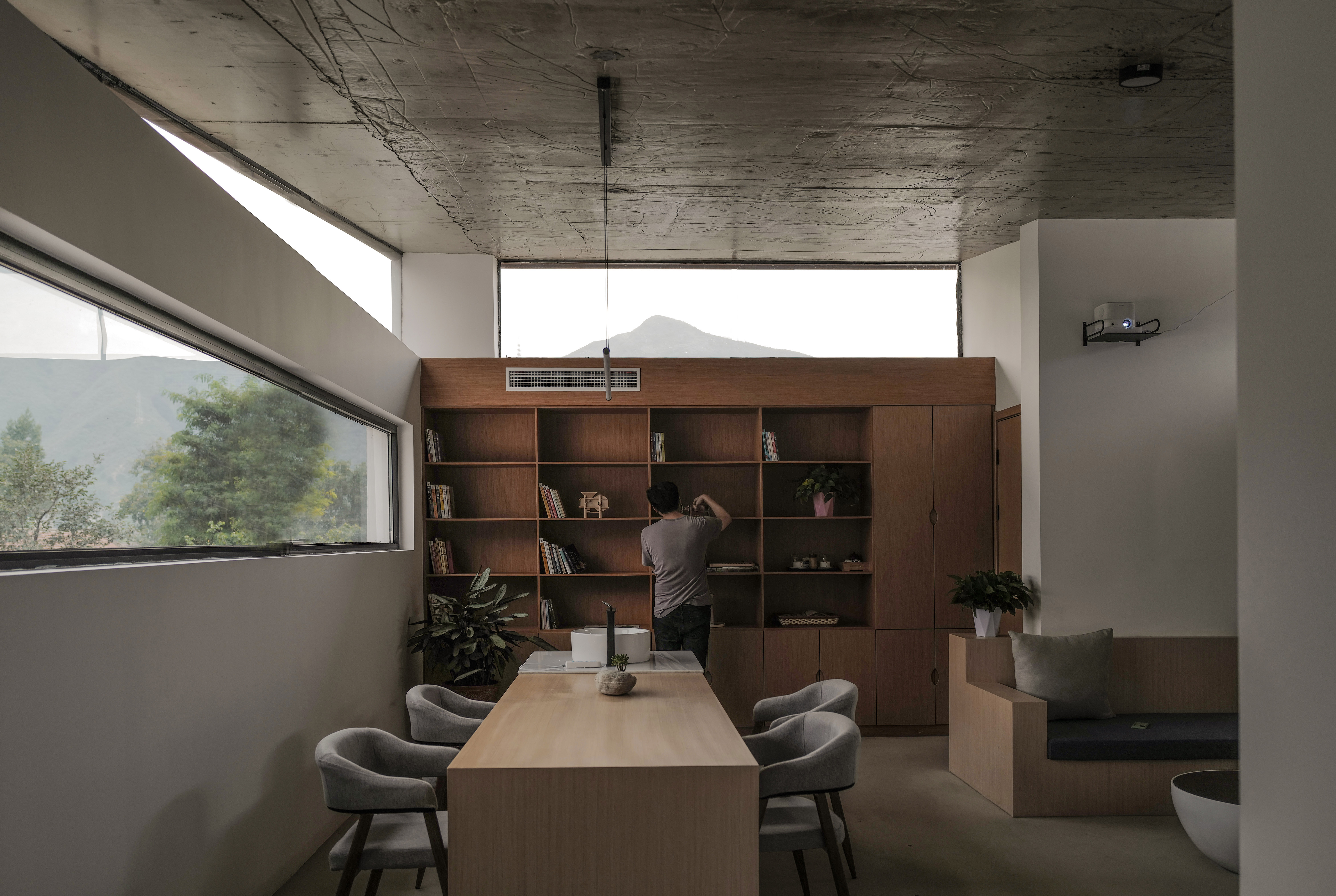 空间意境:设计在四个相对独立的体块上进行了削切,形成了各自独享小庭院以及露台,露台的高度在普遍是一层的村落中拥有很好的视野。 四个露台设计上面向东南西北四个不同的方向,望向包围村落的山体。而中间共享平台则享有360度的环绕景观。在传统的中国乡村机理中,存在着一种即单调又杂乱矛盾特性,在设计与施工能力和预算限制下的民居几乎是用着一种同样的建造方式,形成了单调近乎压抑的村落空间。 但同时由于土地,规划和私搭乱建的问题,在单调的机理上又形成了杂乱无章的排布与质感。忘山云舍希望能在传统的乡建模式上探索出一种新的设计施工体系以及能运营生存的生态系统。宋代禅宗大师青原行思提出参禅的三重境界:看山是山 看山不是山 看山仍是山,而逐渐被后人理解成为人生的三重境界。而忘山云舍不仅仅是一间民宿客栈,我们更希望他成为人生修炼的道场,透过建筑能多理解多喜爱自然一点。