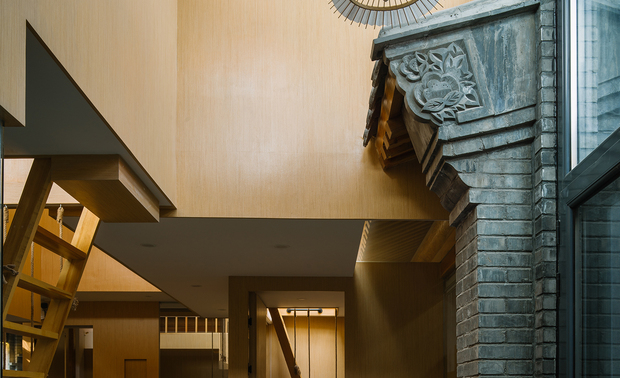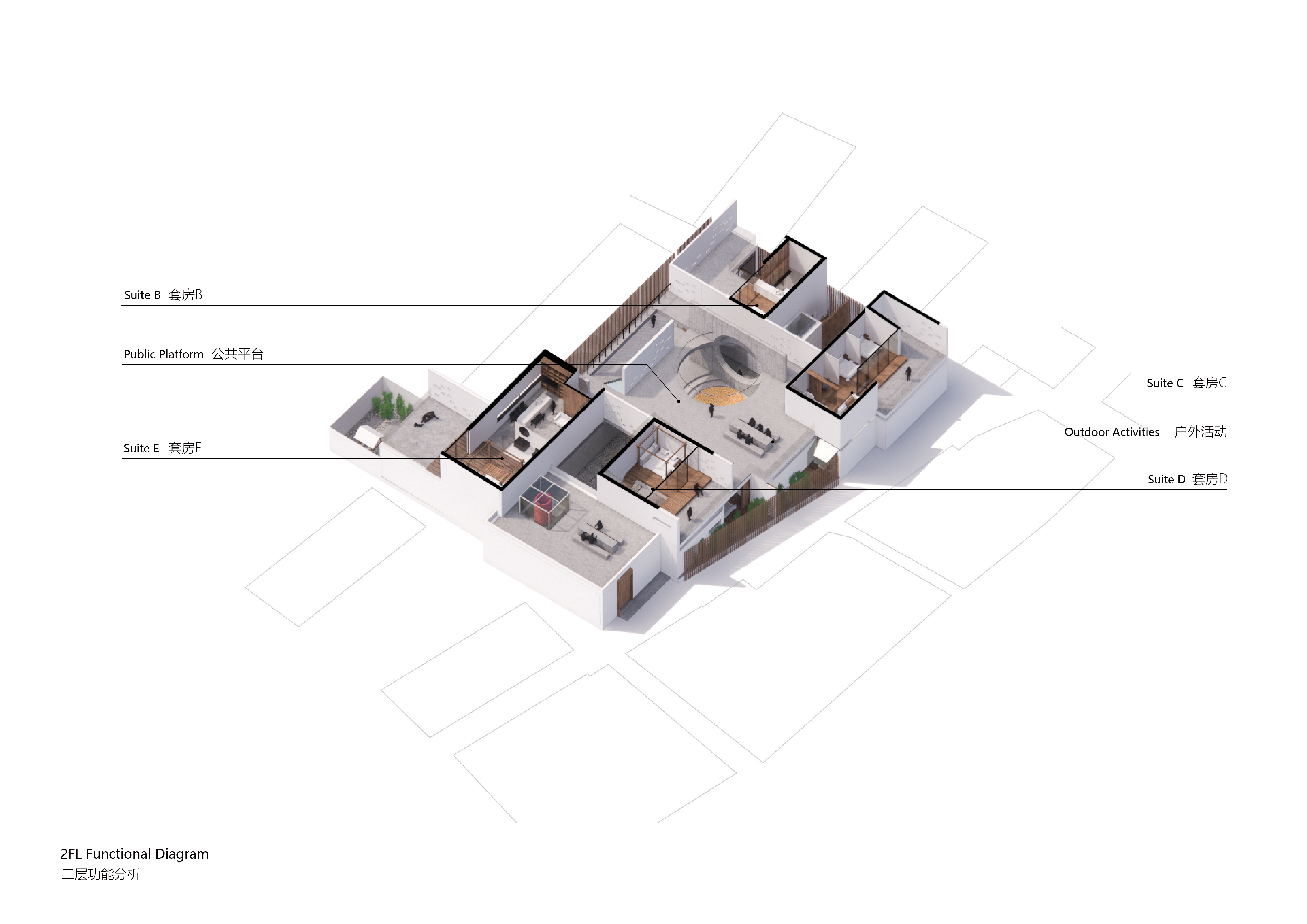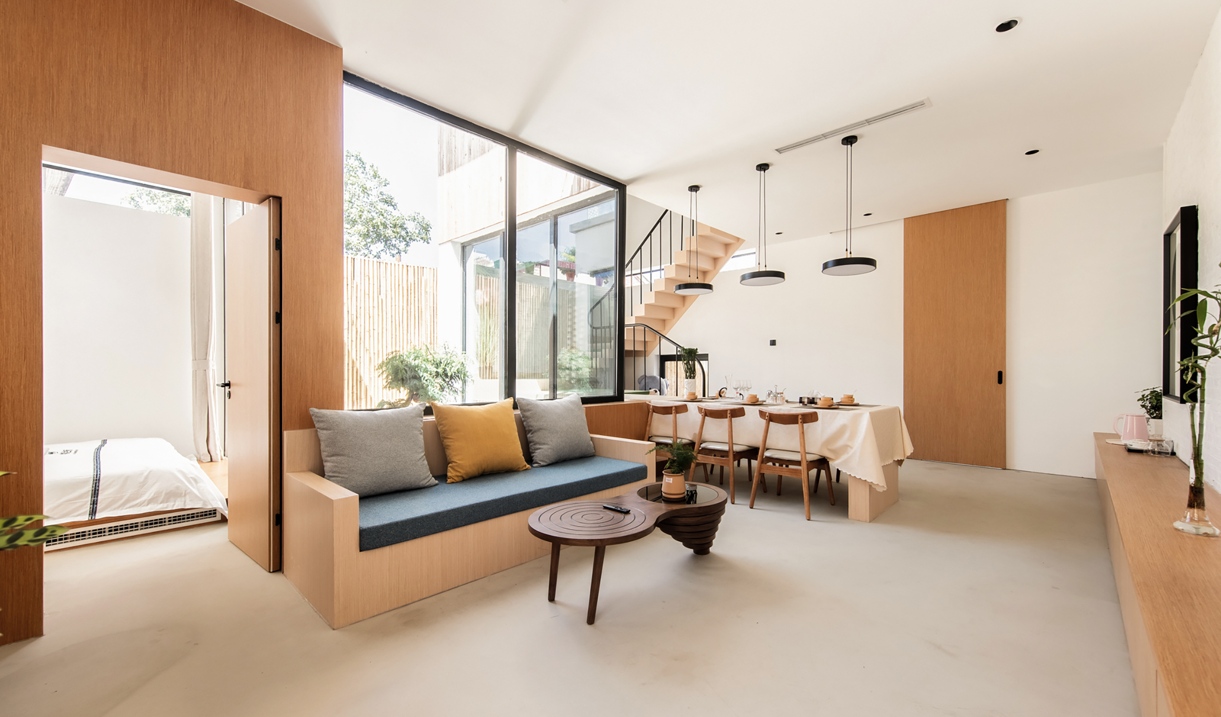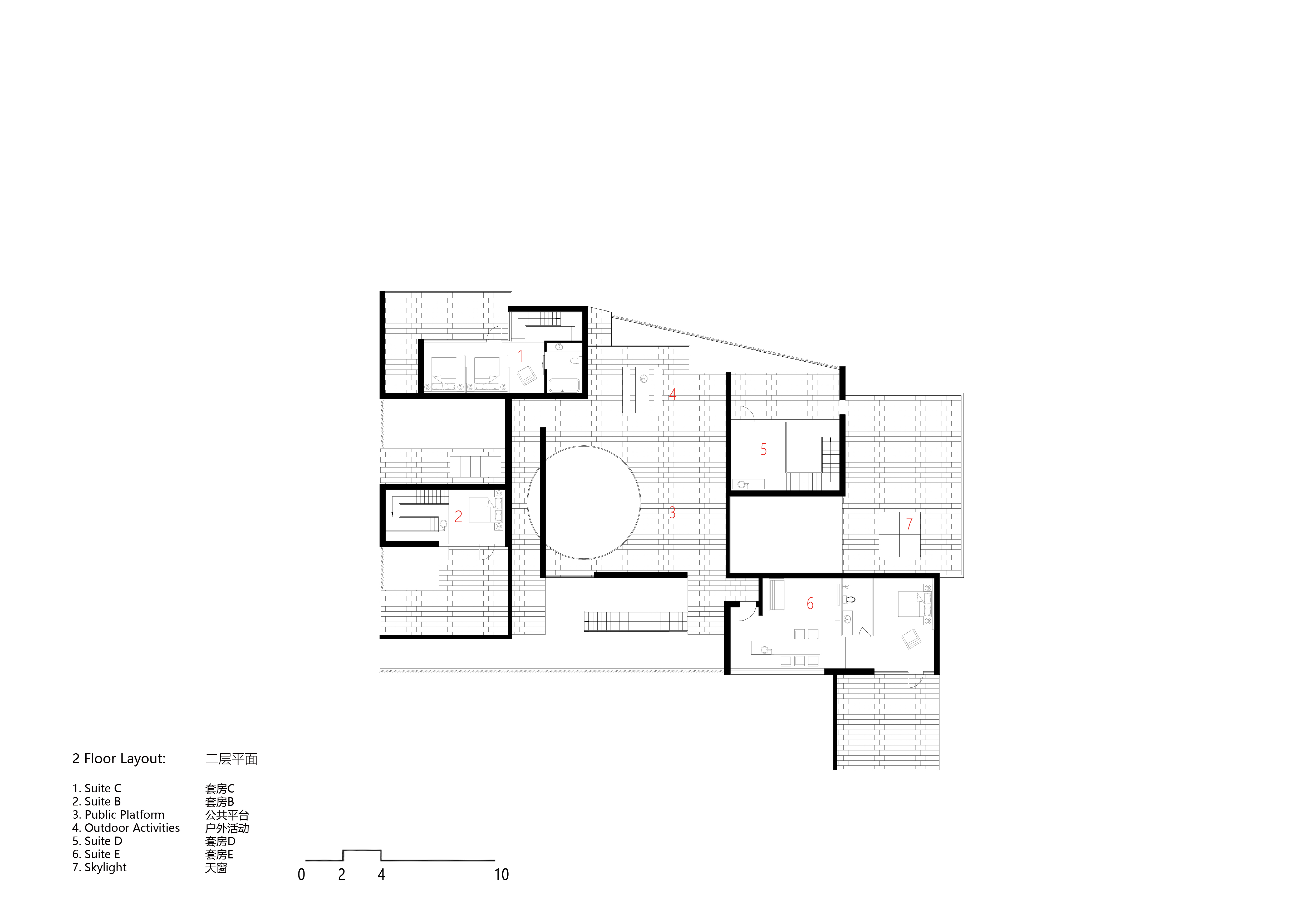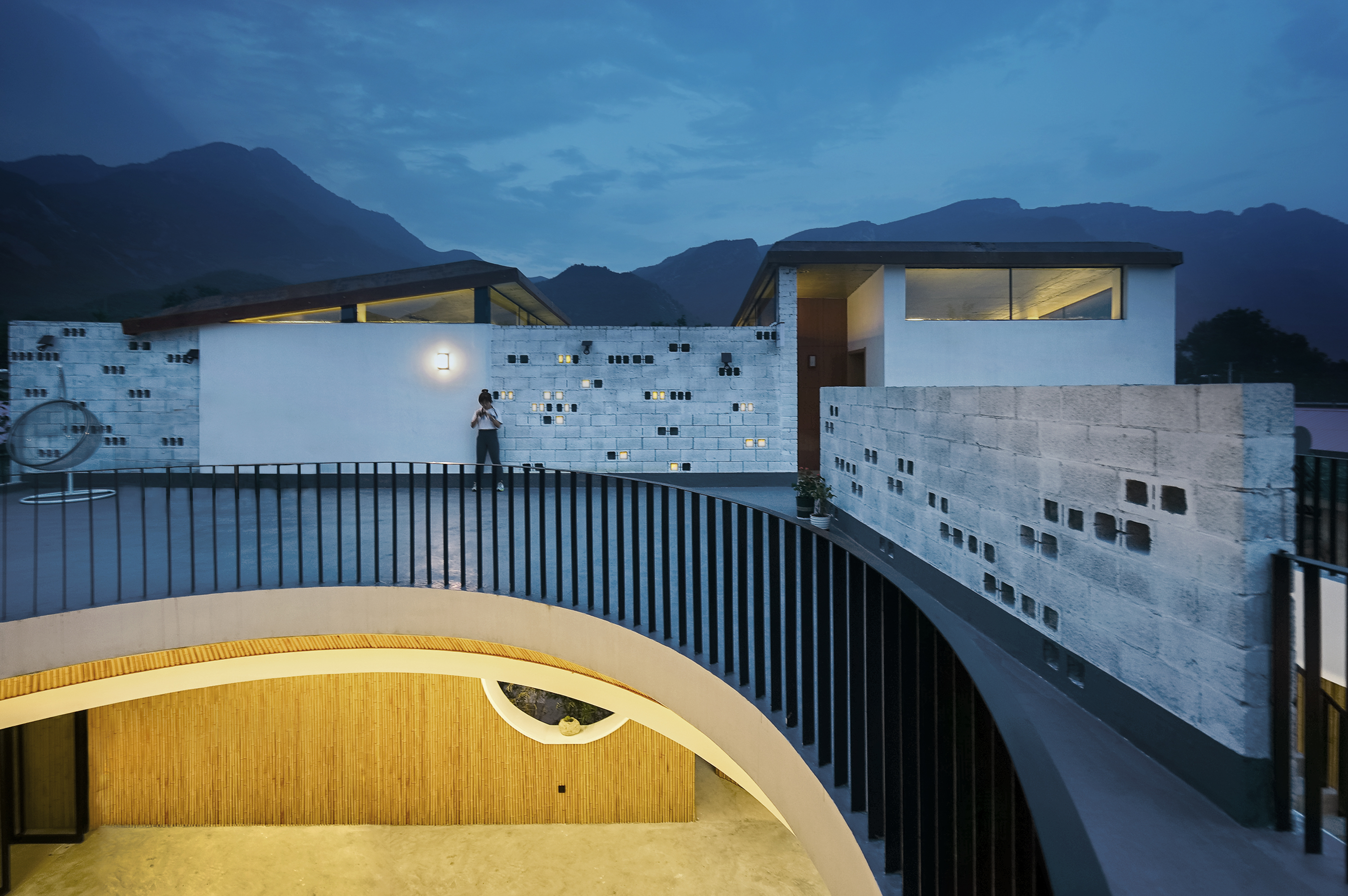空间布局:忘山云舍坐落在太行山和燕山山脉交汇的小山村中,设计在原有场地内划分了4个独立的院子,同时又围合成了一个公共的大中庭。在享受首层私密小庭院的同时,每套户型都享有一个二层相互独立的平台,平台分别望向东西南北四个不同方向的山脉。这也是民宿“望山”的含义。 除了能真实的看到山,民宿本身更想传达的是一种“山下”的生活方式。设计风格以极简为主,材料上辅用了大量的木材和竹子,希望能用自然的材质增加一点温暖的情感。 在建筑的首层设计的圆形沙坑是小朋友的最爱,和几个墙面和楼板上的圆洞相互嵌套形成了丰富有趣的空间效果。